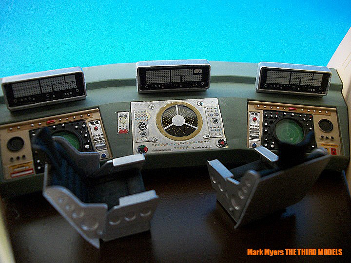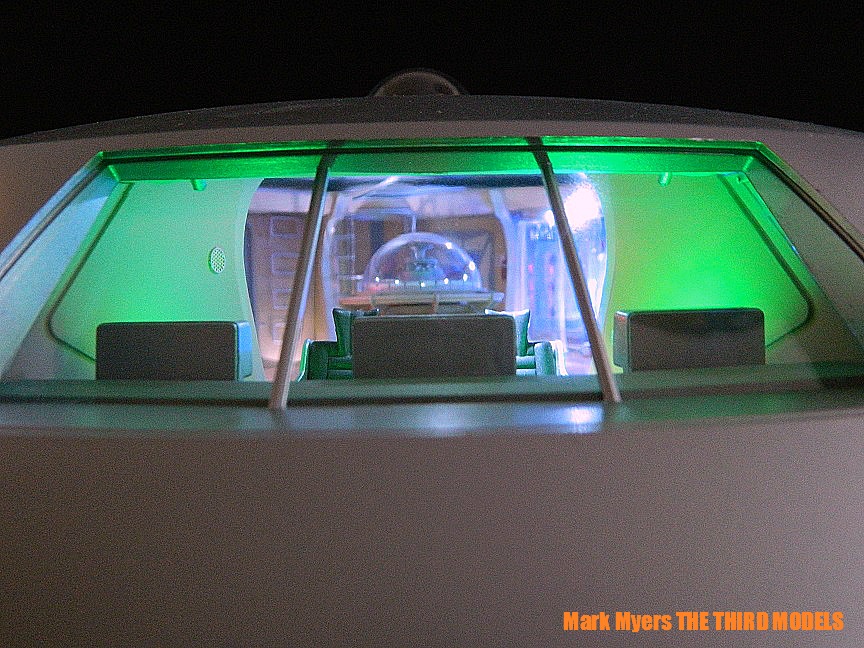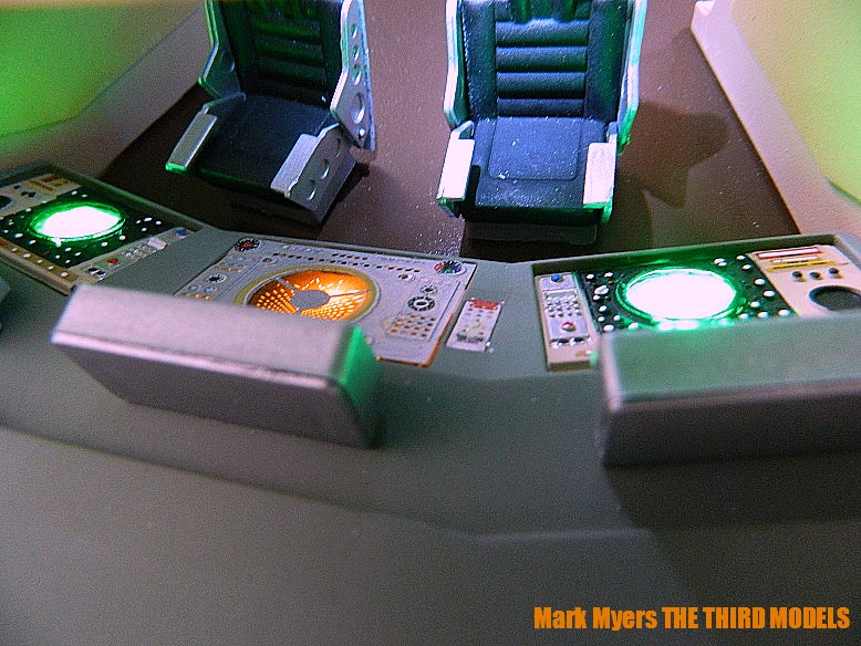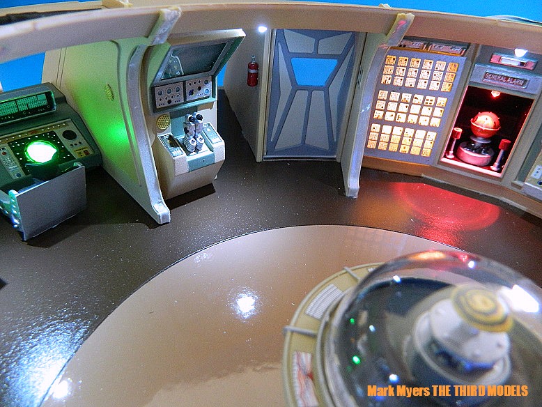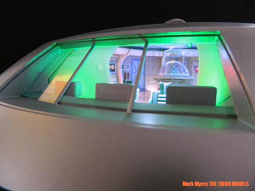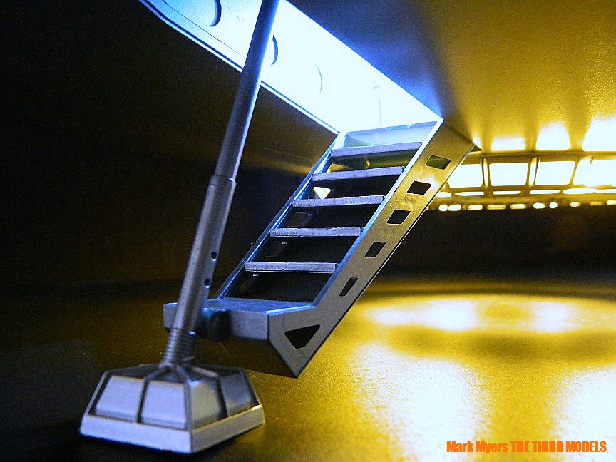 Here are Pictures of another Client build up of the Moebius 1/35 Jupiter 2. On this one the client wanted it per season three. I airbrushed the entire model with accurate coloring based on my library of reference material. I also outfitted the model with my working hatches, scratch built parts, Photo etch and Decals. I used the Moebius Lighting kit to illuminate the model.