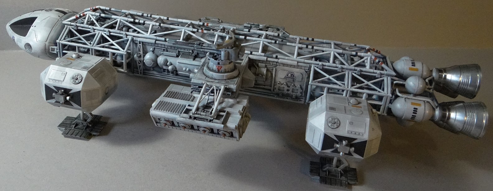 This is the MPC/Round-2 Eagle with a combat pod I designed. The idea was that it was developed to better protect Moonbase Alpha from increasingly dangerous enemies. The pod is equipped with a heavy railgun and a twin laser turret, as well as a mine layer. Some shots also taken with my old 1/48 Mk.9 Hawk kit.