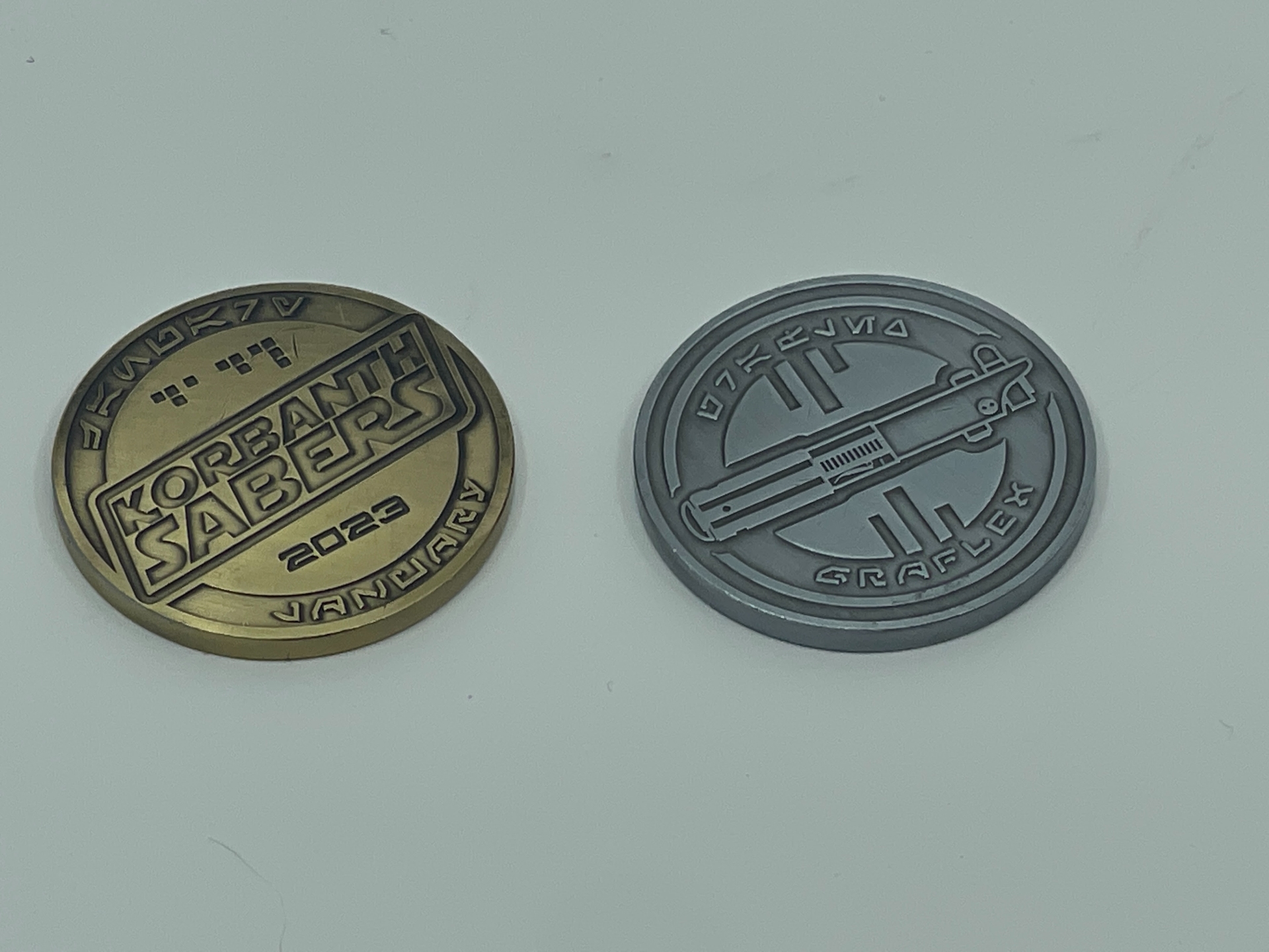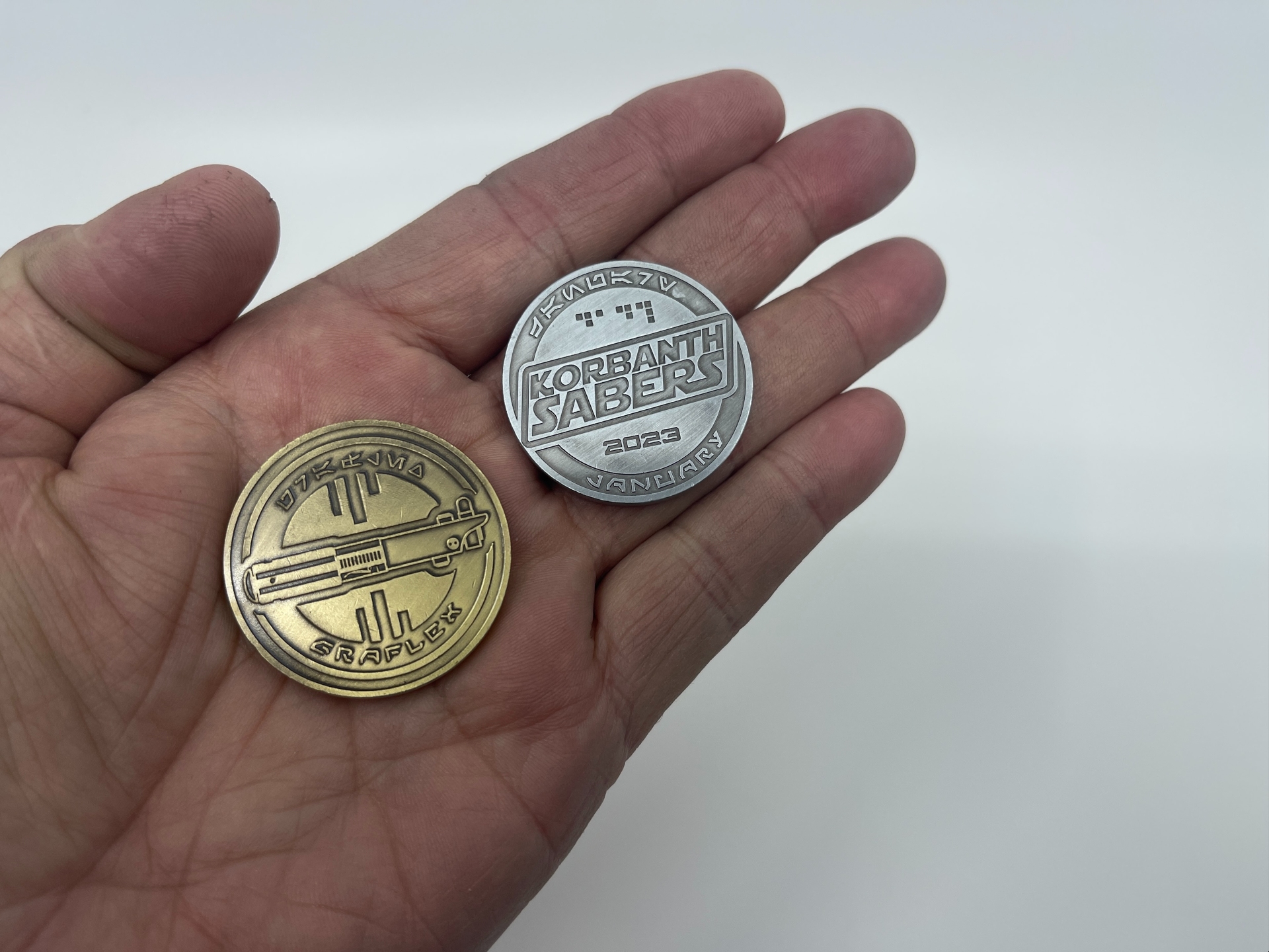 Also, now available – for 2023 – saber coins are now included in every empty or installed lightsaber order – there will be a different coin each month – collect all 12 silver or gold coins – Silver coins in empty hilts and gold coins in installed hilts – collect 12 silver coins over the course of 2023, and get a $500 korbanth Giftcard, and collect 12 gold coins over 2023 and get a $1000 korbanth Gift card good towards anything we offer