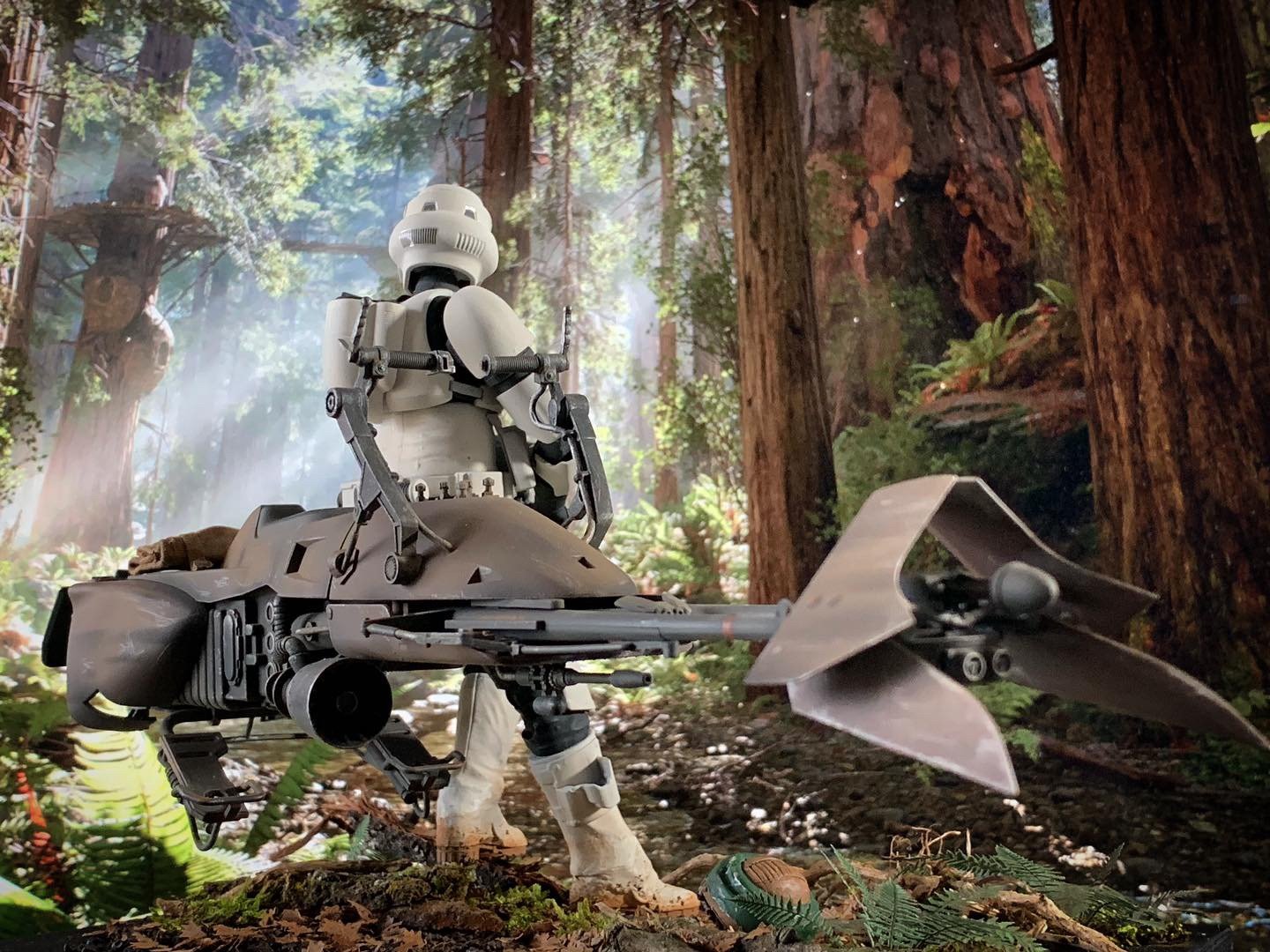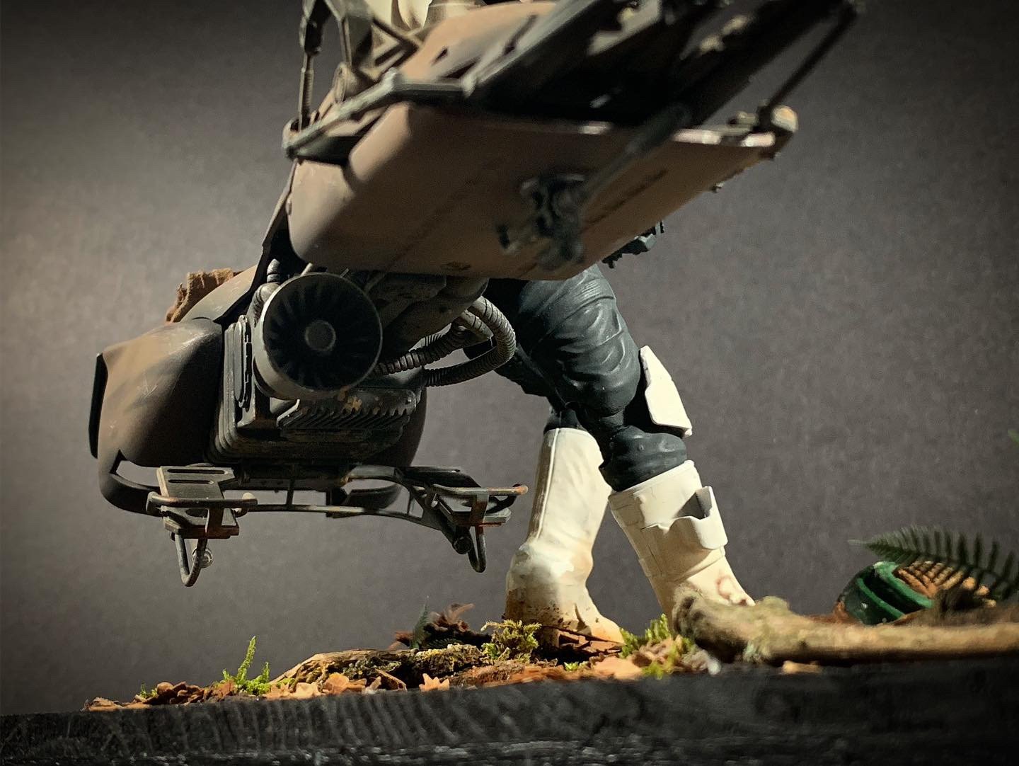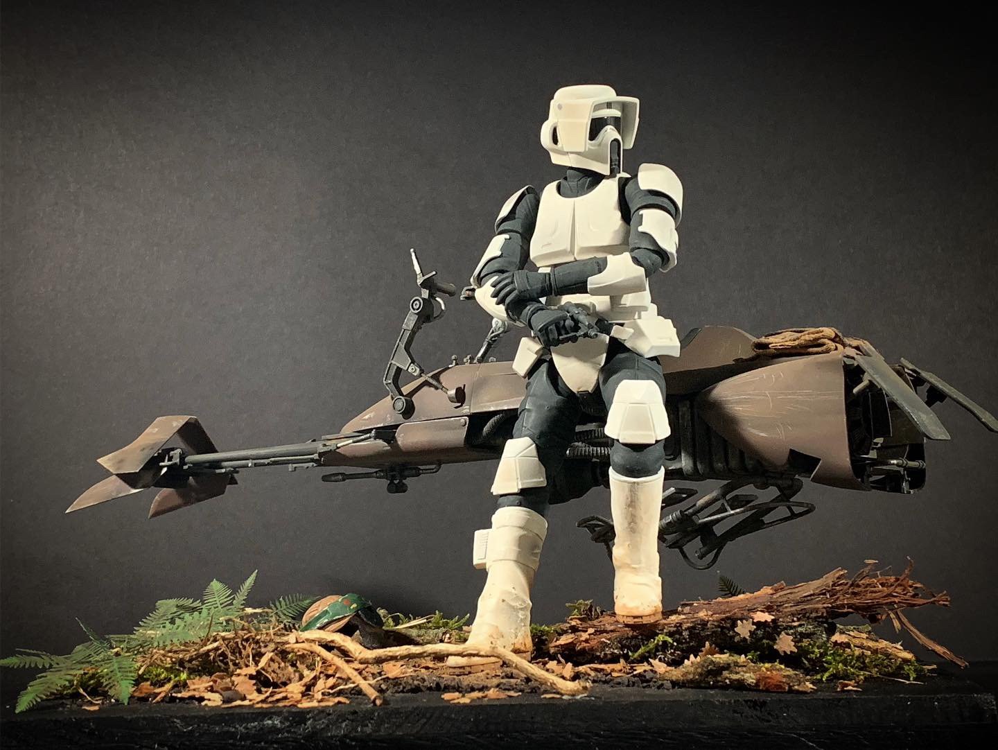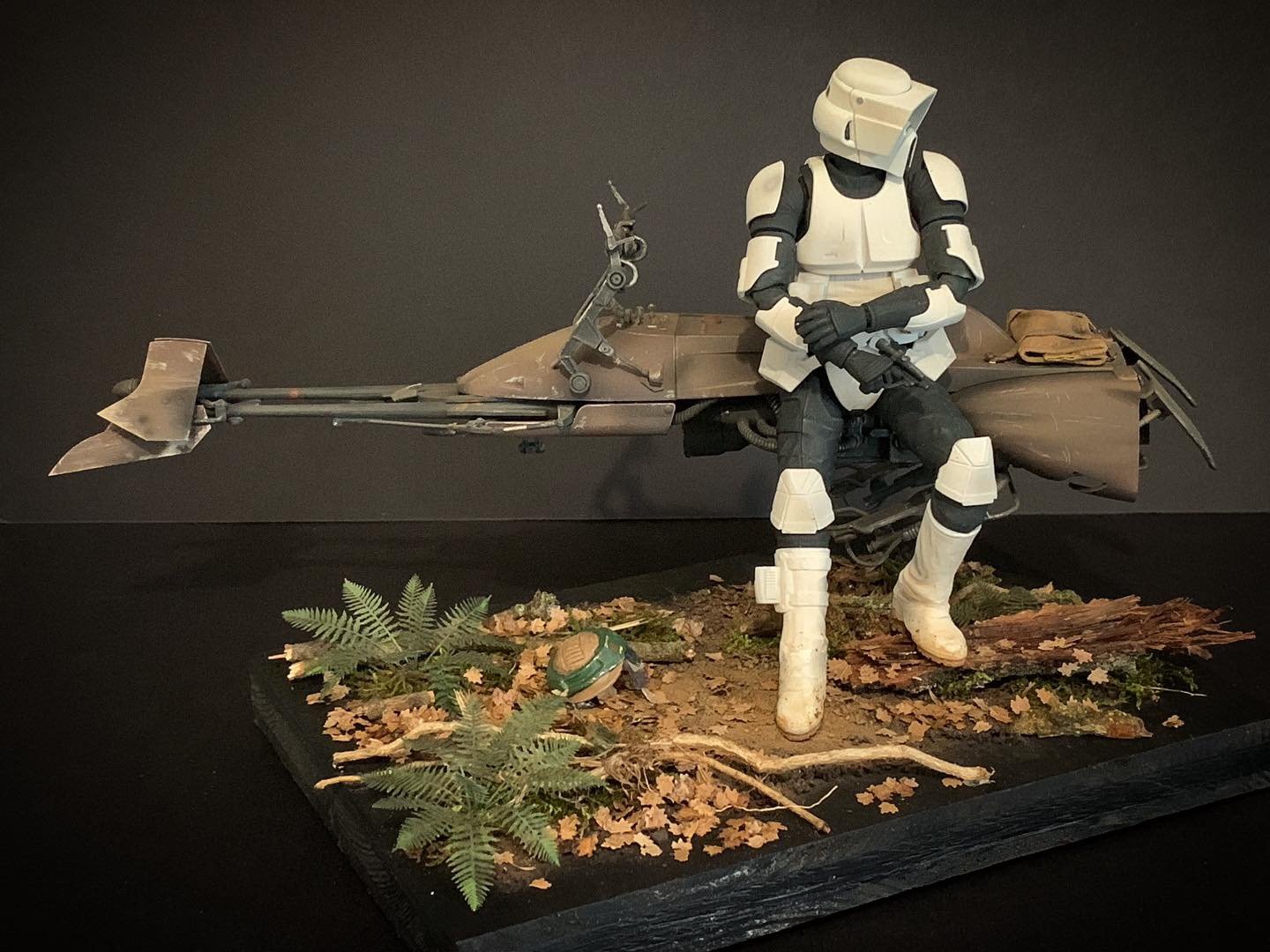 Here’s my BanDai model SpeederBike in 1/12. I used the Archive-X paintings. The trooper is held on the ground with 2 metal rods in the feet, and the speeder with 2 metal rods in the lower back. The dead leaves are cut from real tree leaves and the wood and moss are 100% natural. The Rebel helmet is made of scratch.