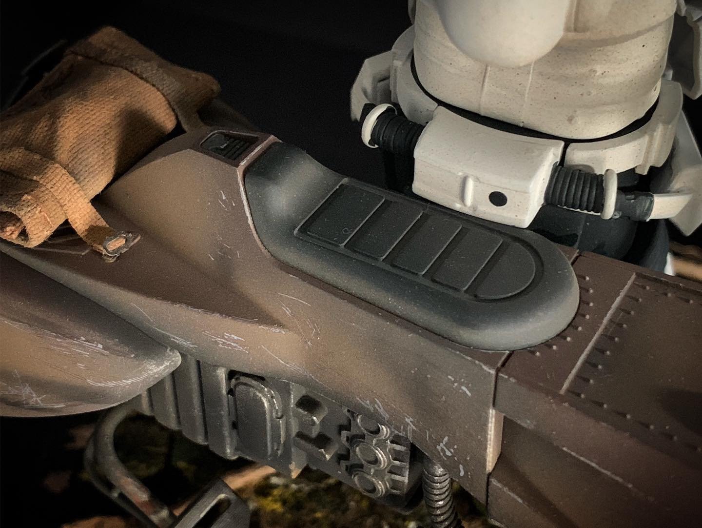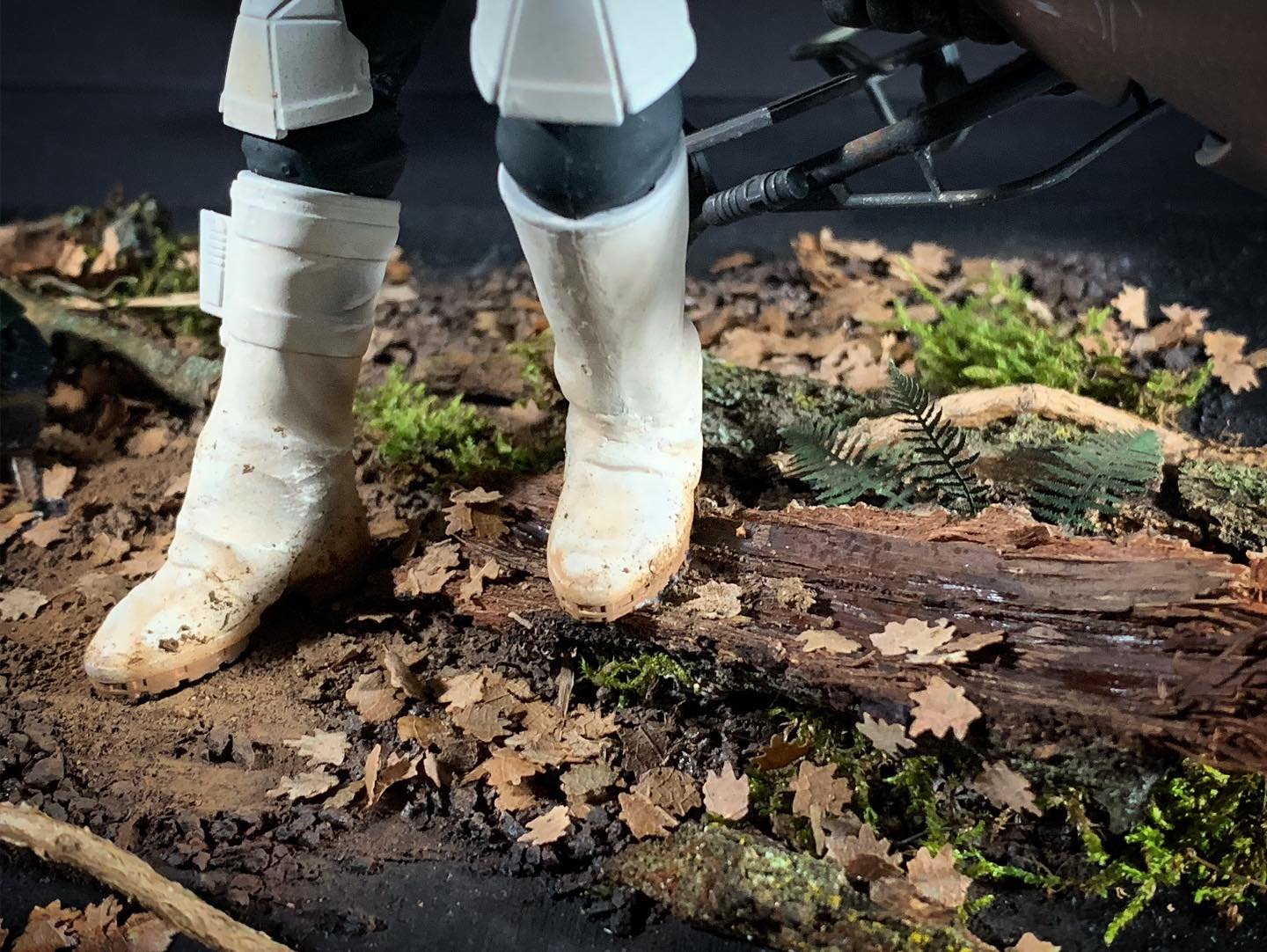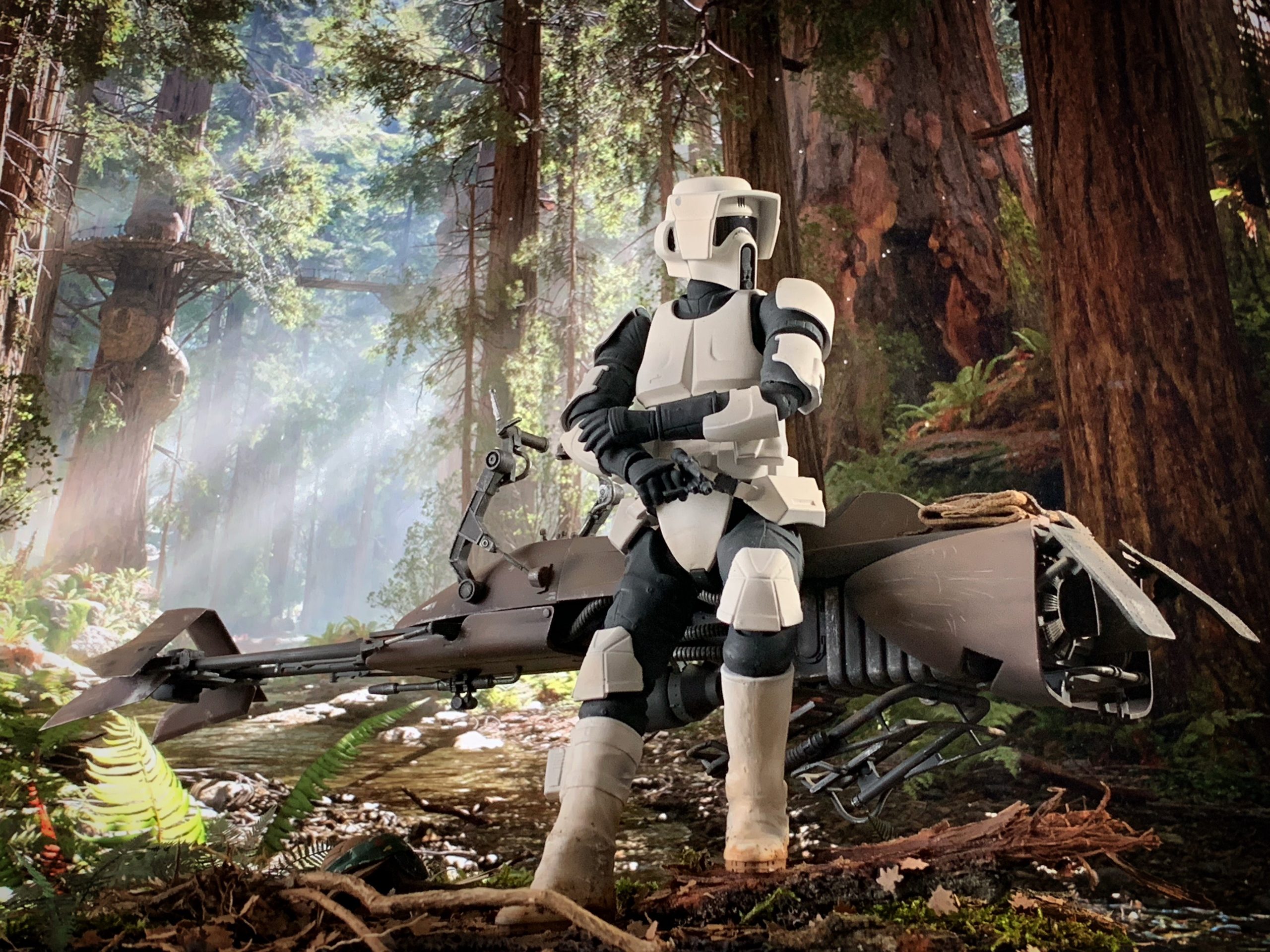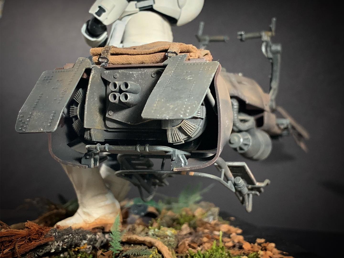 Here’s my BanDai model SpeederBike in 1/12. I used the Archive-X paintings. The trooper is held on the ground with 2 metal rods in the feet, and the speeder with 2 metal rods in the lower back. The dead leaves are cut from real tree leaves and the wood and moss are 100% natural. The Rebel helmet is made of scratch.