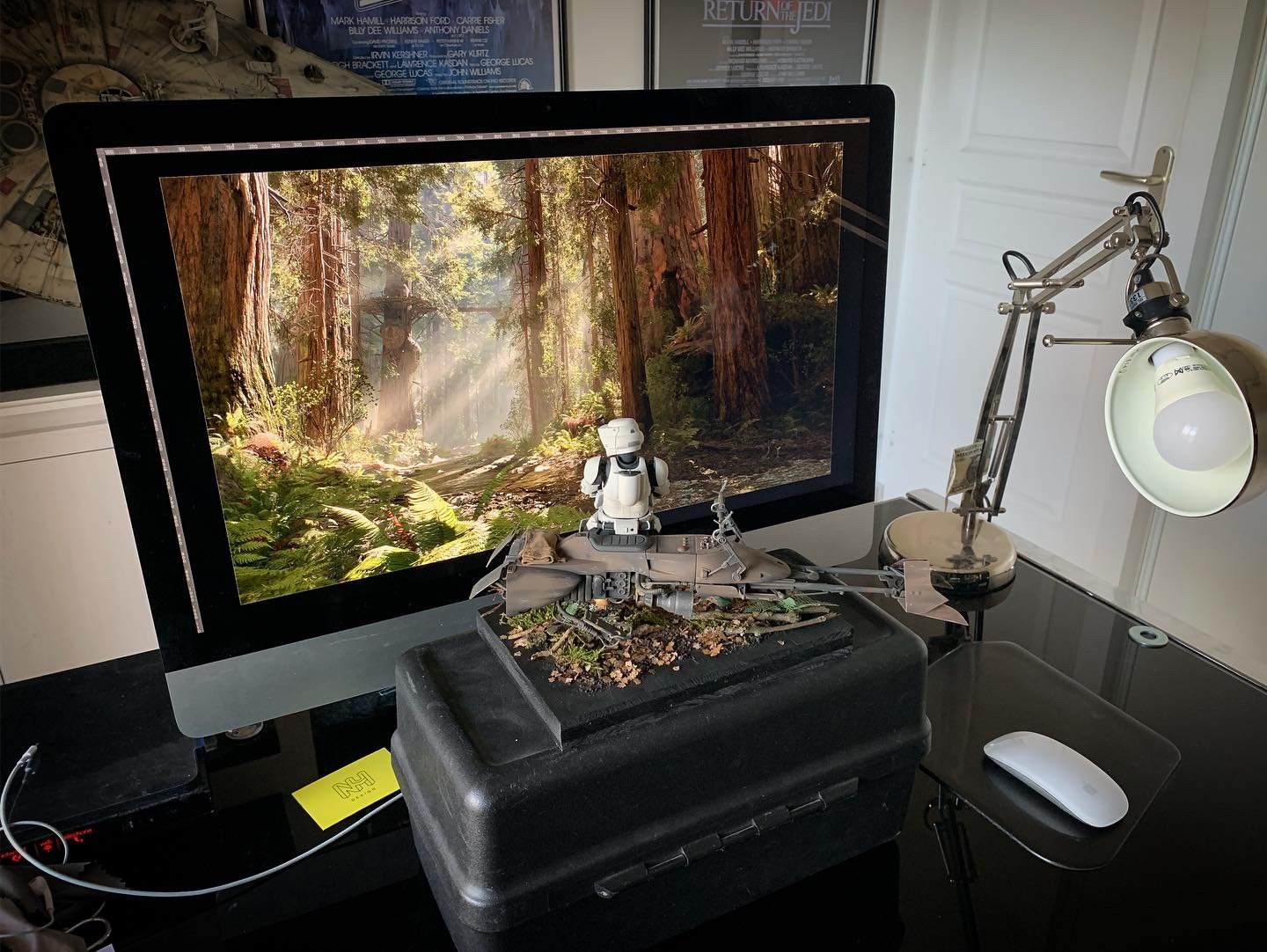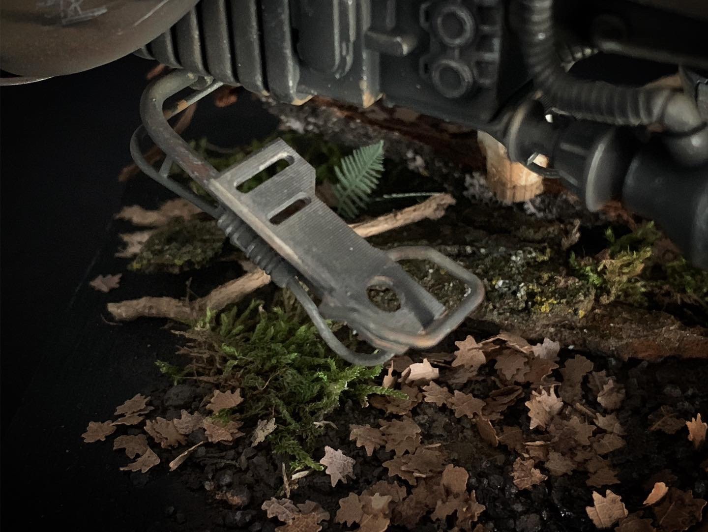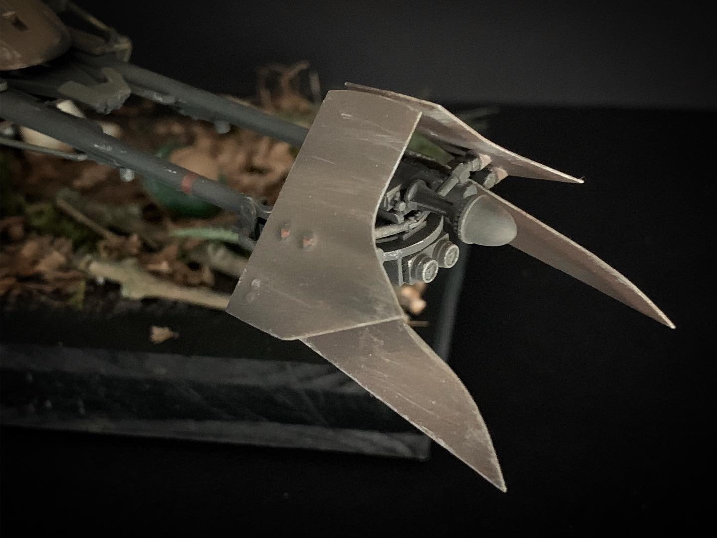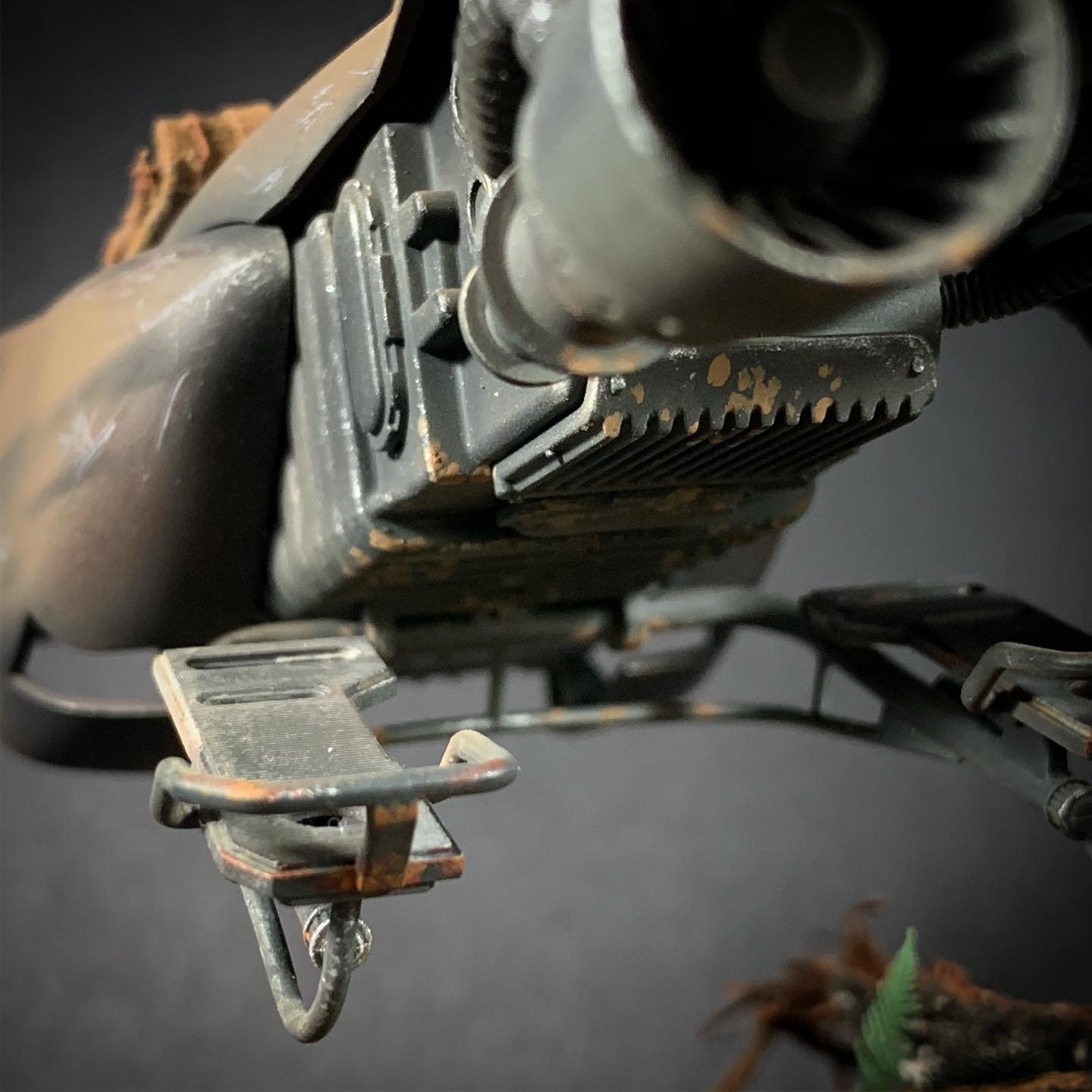Here’s my BanDai model SpeederBike in 1/12. I used the Archive-X paintings. The trooper is held on the ground with 2 metal rods in the feet, and the speeder with 2 metal rods in the lower back. The dead leaves are cut from real tree leaves and the wood and moss are 100% natural. The Rebel helmet is made of scratch.