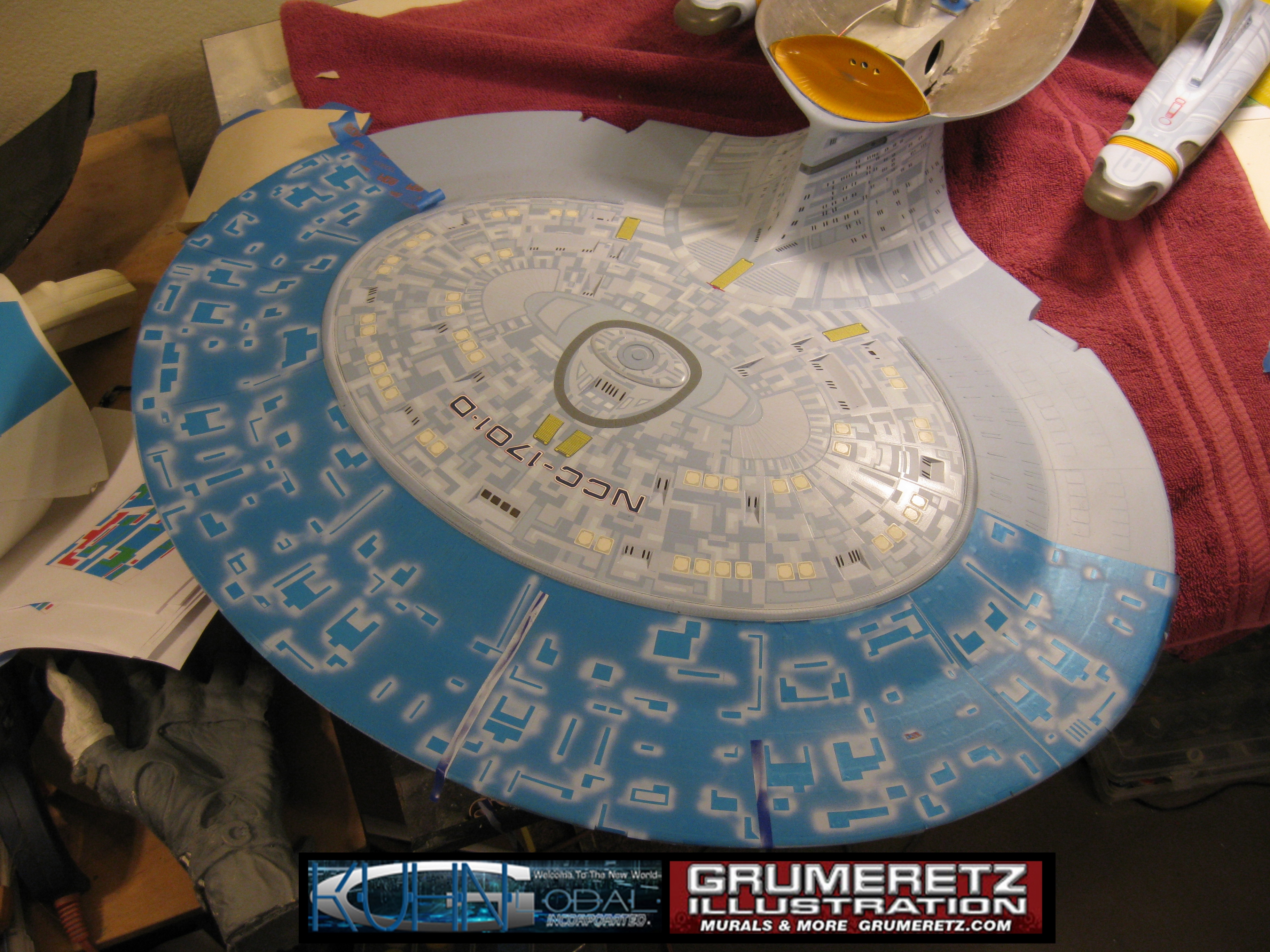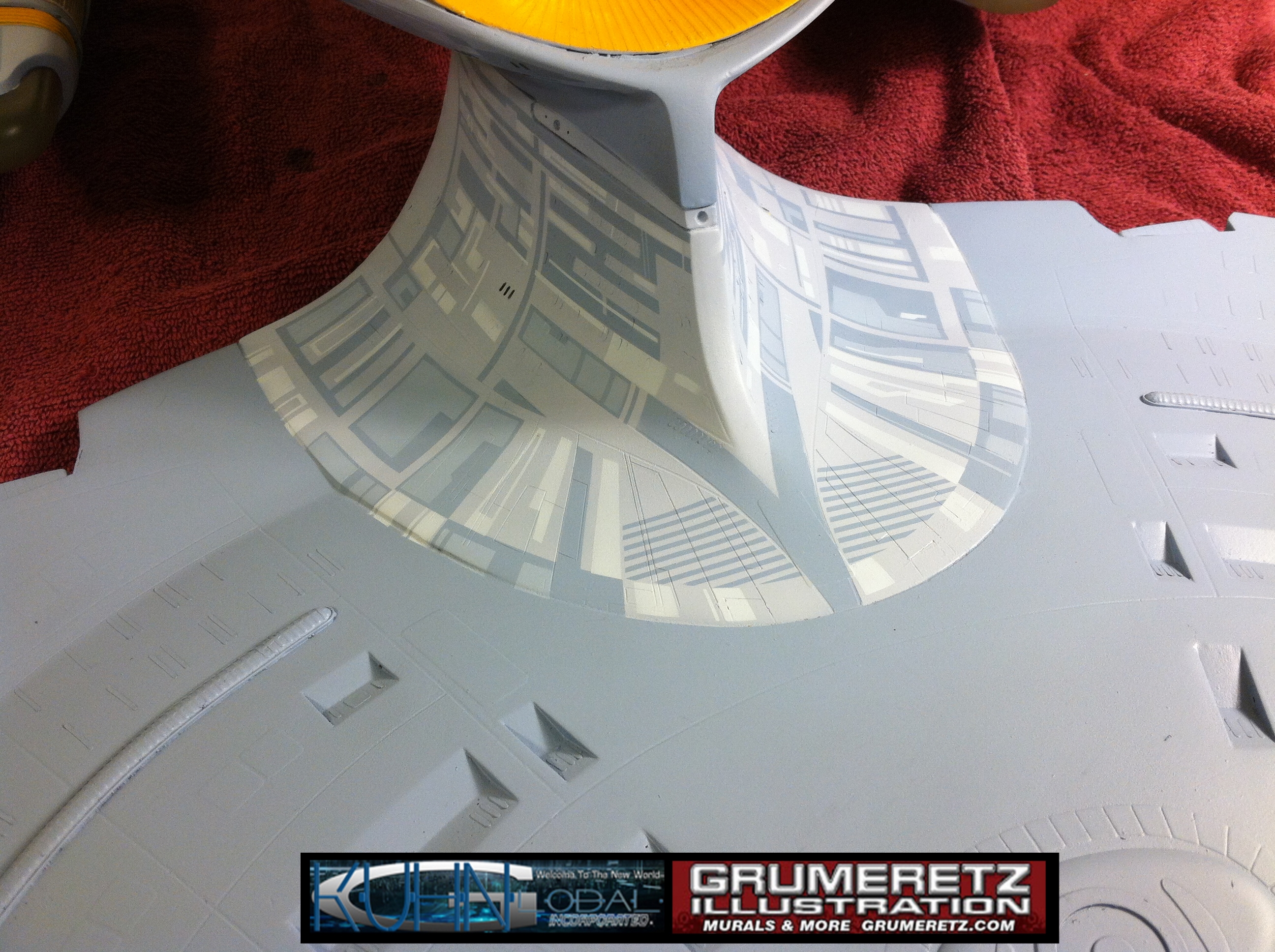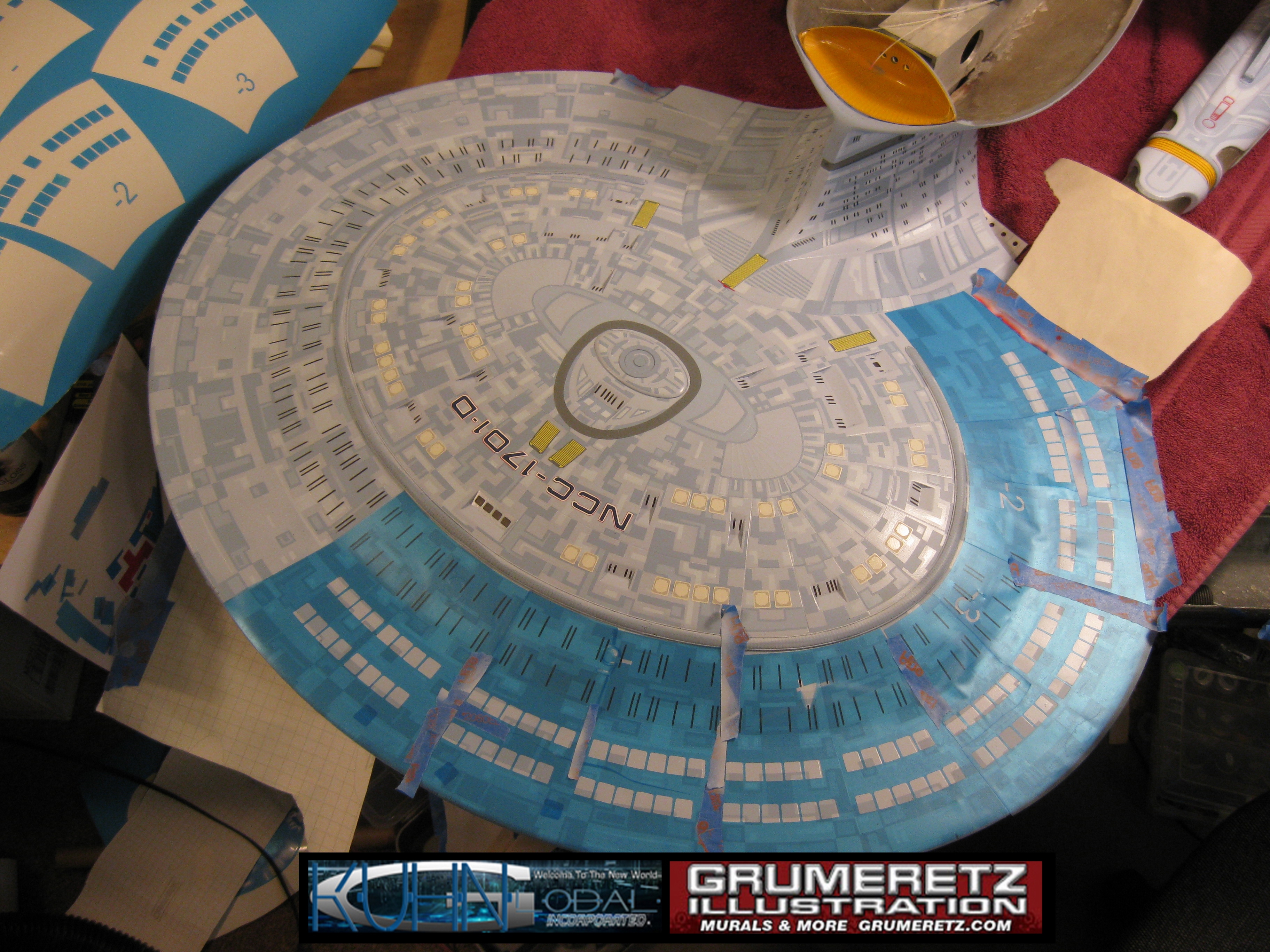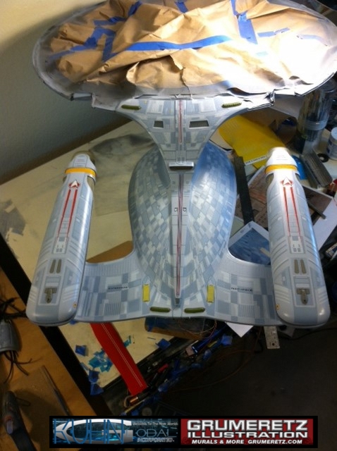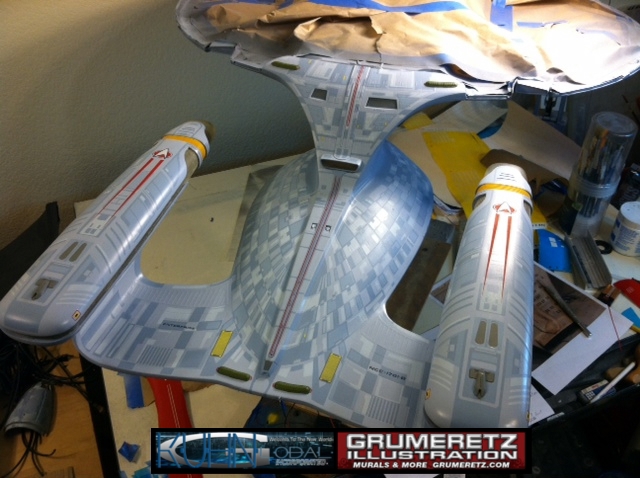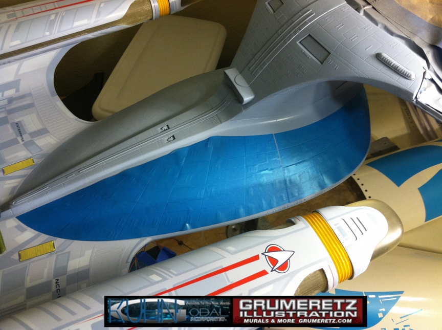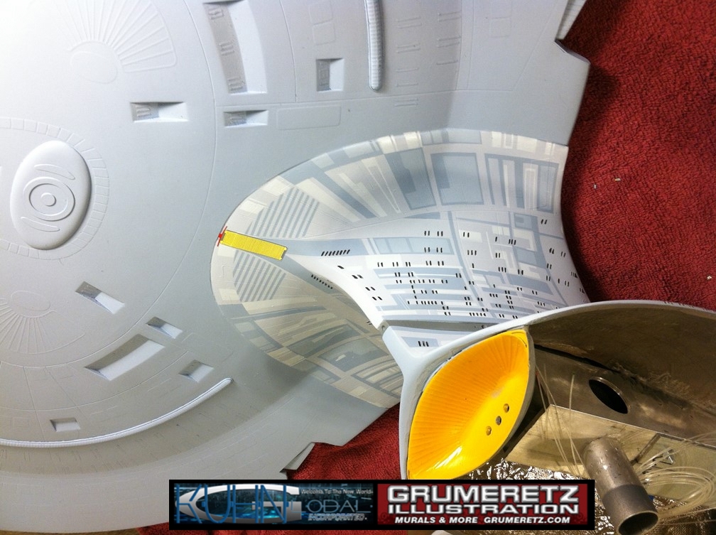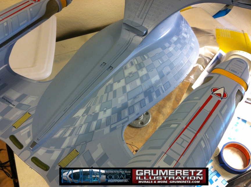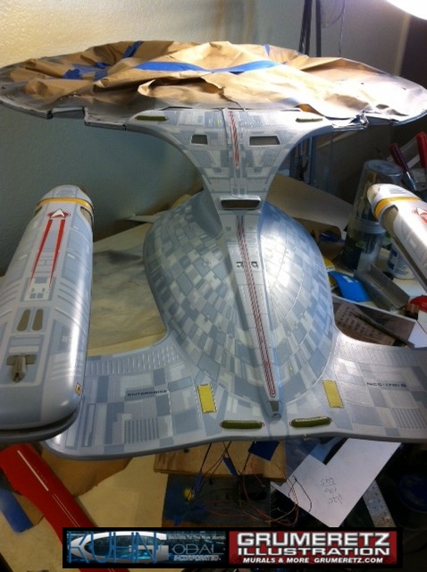 Artist Dan Grumeretz is doing magnificent work on recreating the TNG 6 foot studio model paint job on this 40 inch Enterprise 1701-D. There were differences in this cast from the actual 6 foot studio model of which he worked well with, changing a few cast details, then incorporating the FOUR levels of paint paneling to fit this cast. Dan studied the 6 foot model paint scheme very closely to get these patterns correct. Like I stated, there were minor differences in this cast from the cast configuration of the 6 foot studio model, so he fit it as well as possible to recreate the 6 foot beast in this just under four foot version. Other than the twin red vinyl stripes going down the spine, all you see on this is paint, even the lettered markings…. NO DECALS were used. The paint colors themselves came direct from Rick Sternback. I had purchased the one and only DeAgostini 1:900 (QMX Size) Enterprise 1701-D from him that included the same paint colors as was used on the 6 foot model. So we utilized those same colors for this 40 inch build. That stated, the camera Dan is using to photograph this progress really shows high contrast between the colors used. In person, they are not so pronounced and look much like the 6 foot studio model. With the custom studio stand now at Dan’s shop, still remaining to complete this build is minor clean up, fill in, nacelle ribs, and final lighting test. Once again, Dan is doing amazing work. This project has been a long time coming and I am pleased to see it coming to a close for final display in the collection here. There will be Blue Screen photos when it arrives. We hope you like it!