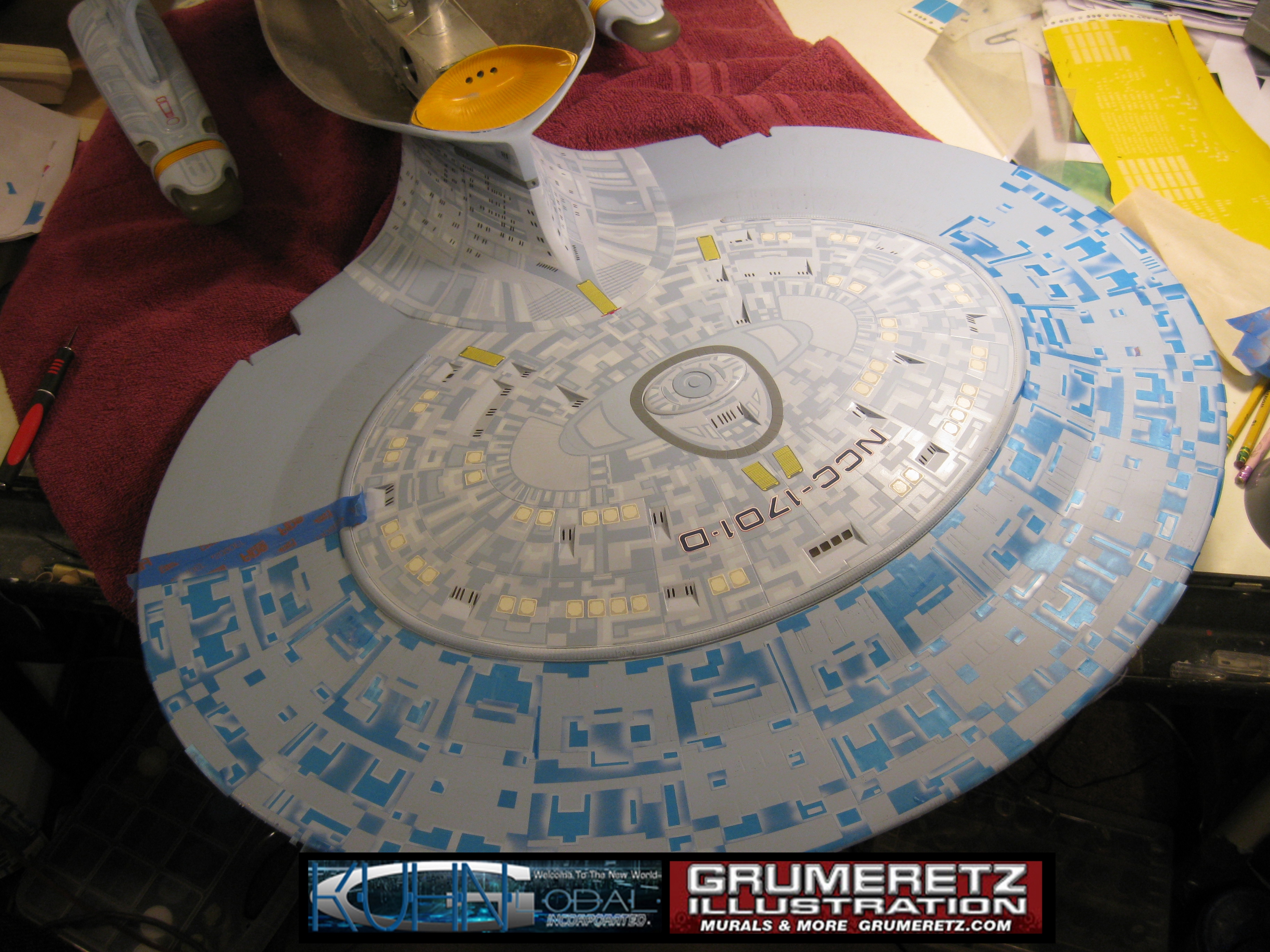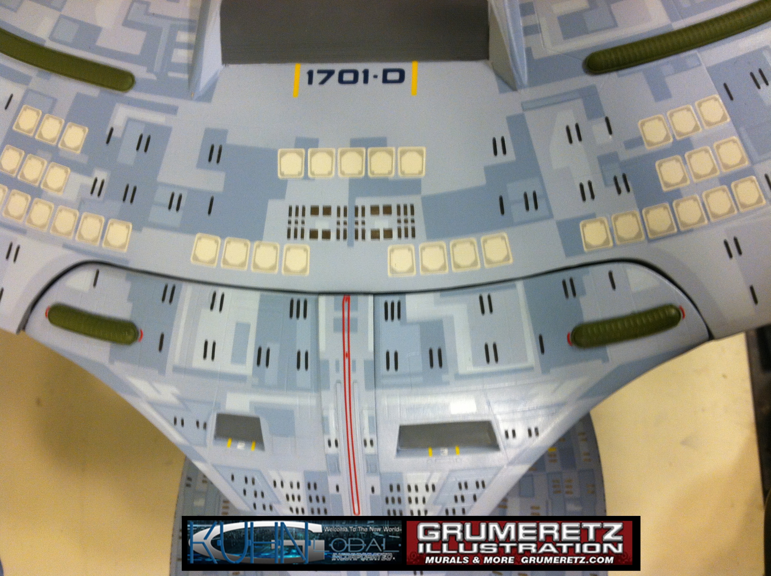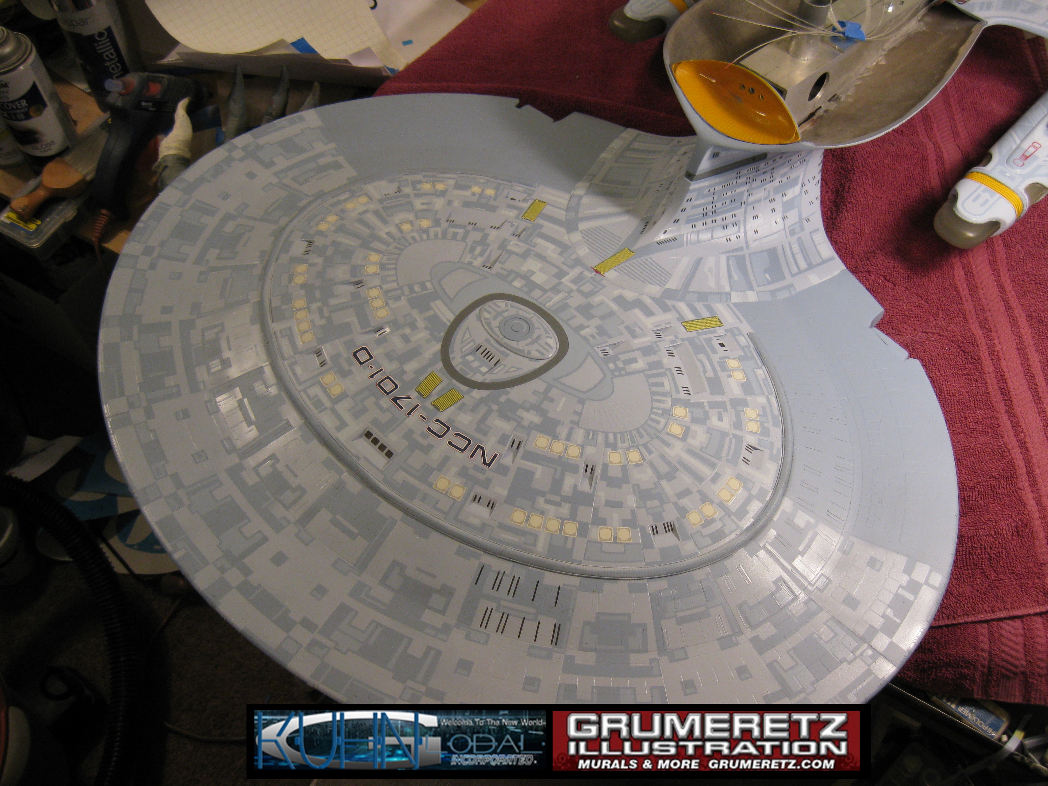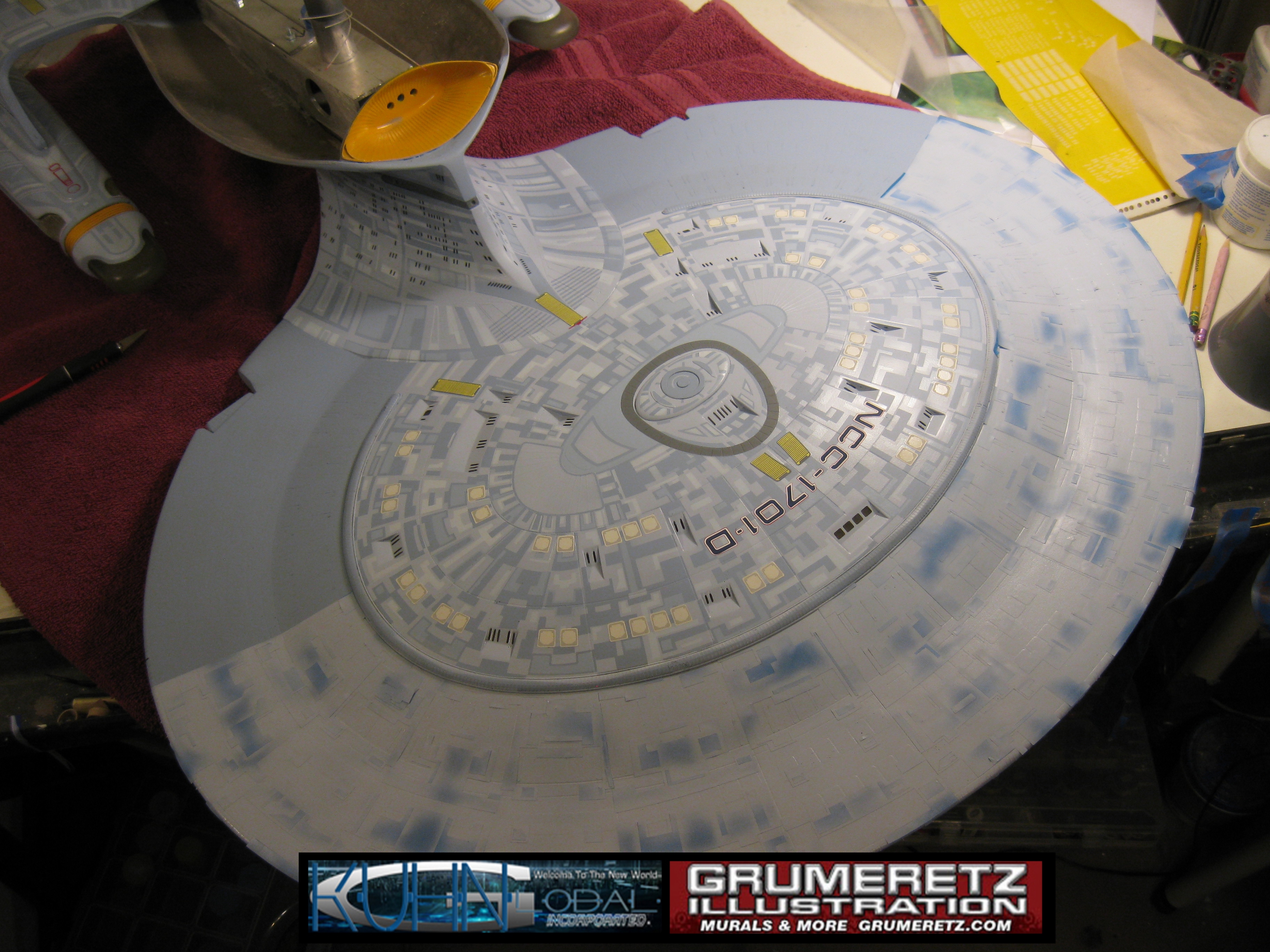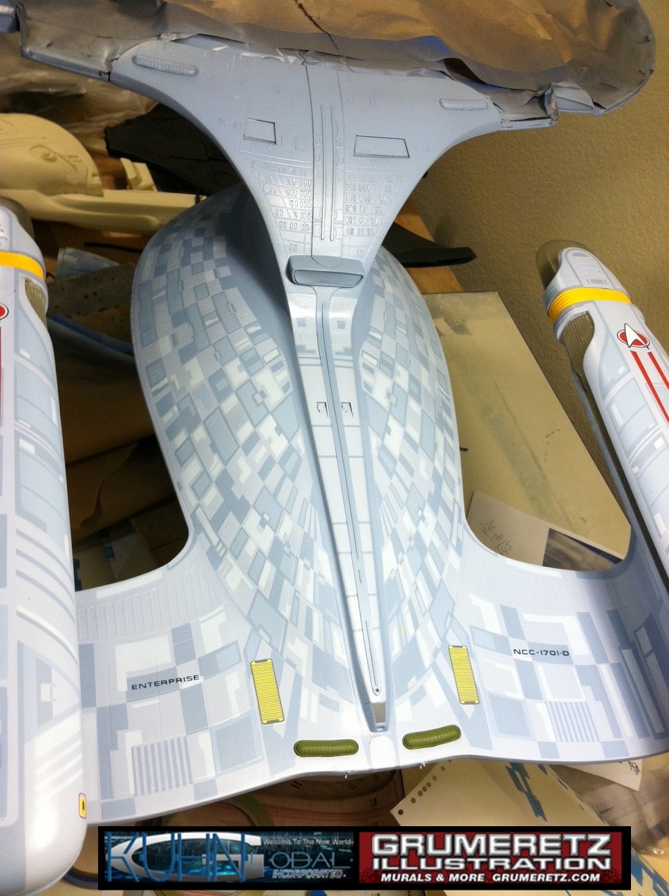 Artist Dan Grumeretz is doing magnificent work on recreating the TNG 6 foot studio model paint job on this 40 inch Enterprise 1701-D. There were differences in this cast from the actual 6 foot studio model of which he worked well with, changing a few cast details, then incorporating the FOUR levels of paint paneling to fit this cast. Dan studied the 6 foot model paint scheme very closely to get these patterns correct. Like I stated, there were minor differences in this cast from the cast configuration of the 6 foot studio model, so he fit it as well as possible to recreate the 6 foot beast in this just under four foot version. Other than the twin red vinyl stripes going down the spine, all you see on this is paint, even the lettered markings…. NO DECALS were used. The paint colors themselves came direct from Rick Sternback. I had purchased the one and only DeAgostini 1:900 (QMX Size) Enterprise 1701-D from him that included the same paint colors as was used on the 6 foot model. So we utilized those same colors for this 40 inch build. That stated, the camera Dan is using to photograph this progress really shows high contrast between the colors used. In person, they are not so pronounced and look much like the 6 foot studio model. With the custom studio stand now at Dan’s shop, still remaining to complete this build is minor clean up, fill in, nacelle ribs, and final lighting test. Once again, Dan is doing amazing work. This project has been a long time coming and I am pleased to see it coming to a close for final display in the collection here. There will be Blue Screen photos when it arrives. We hope you like it!