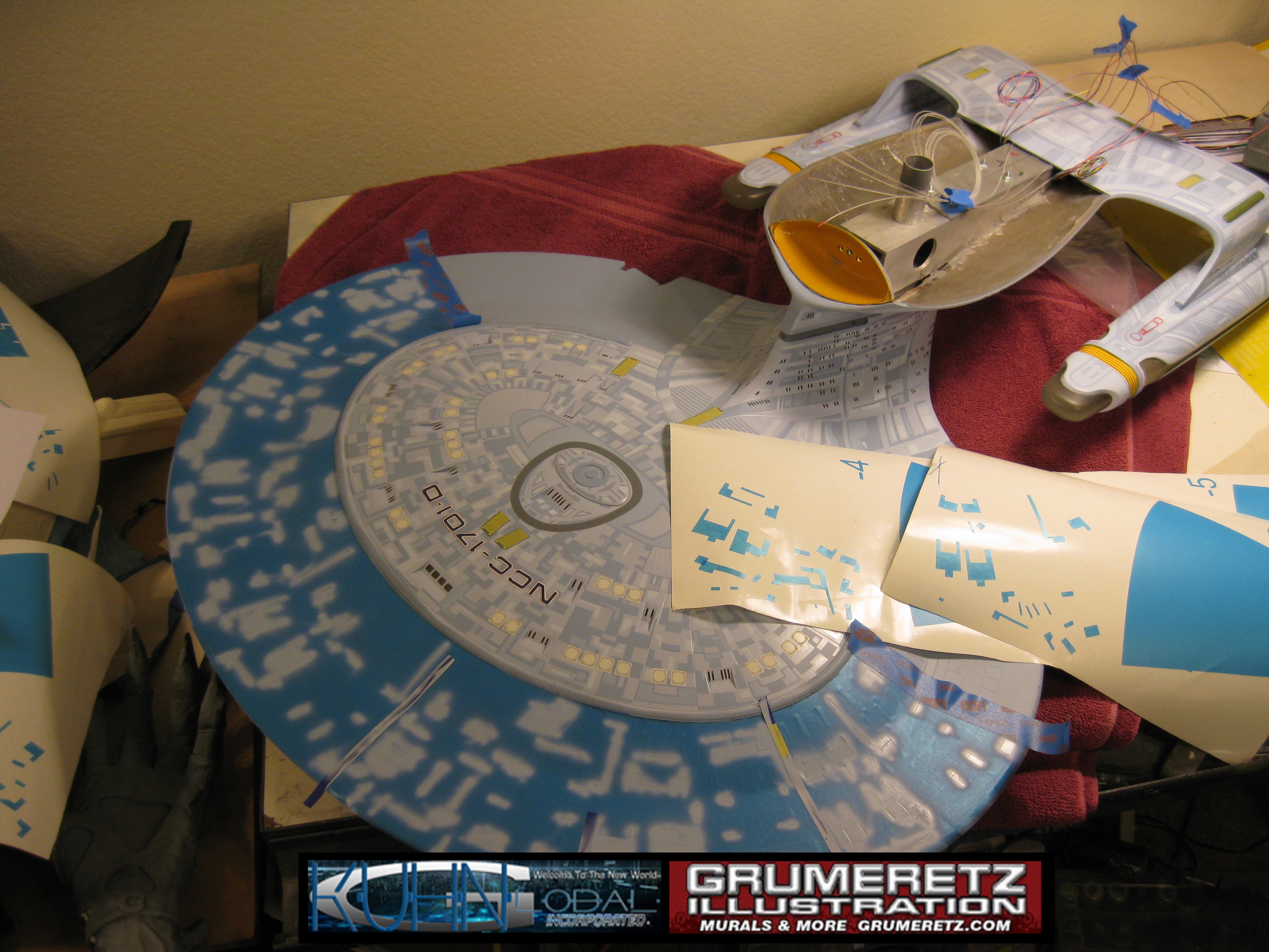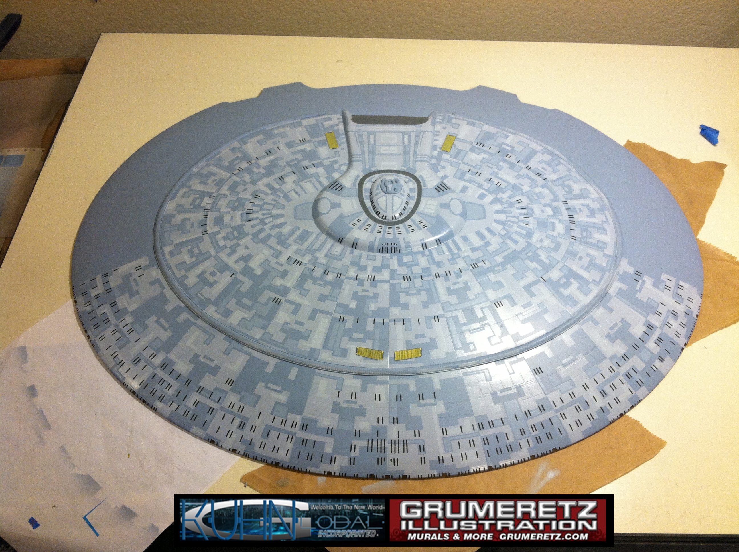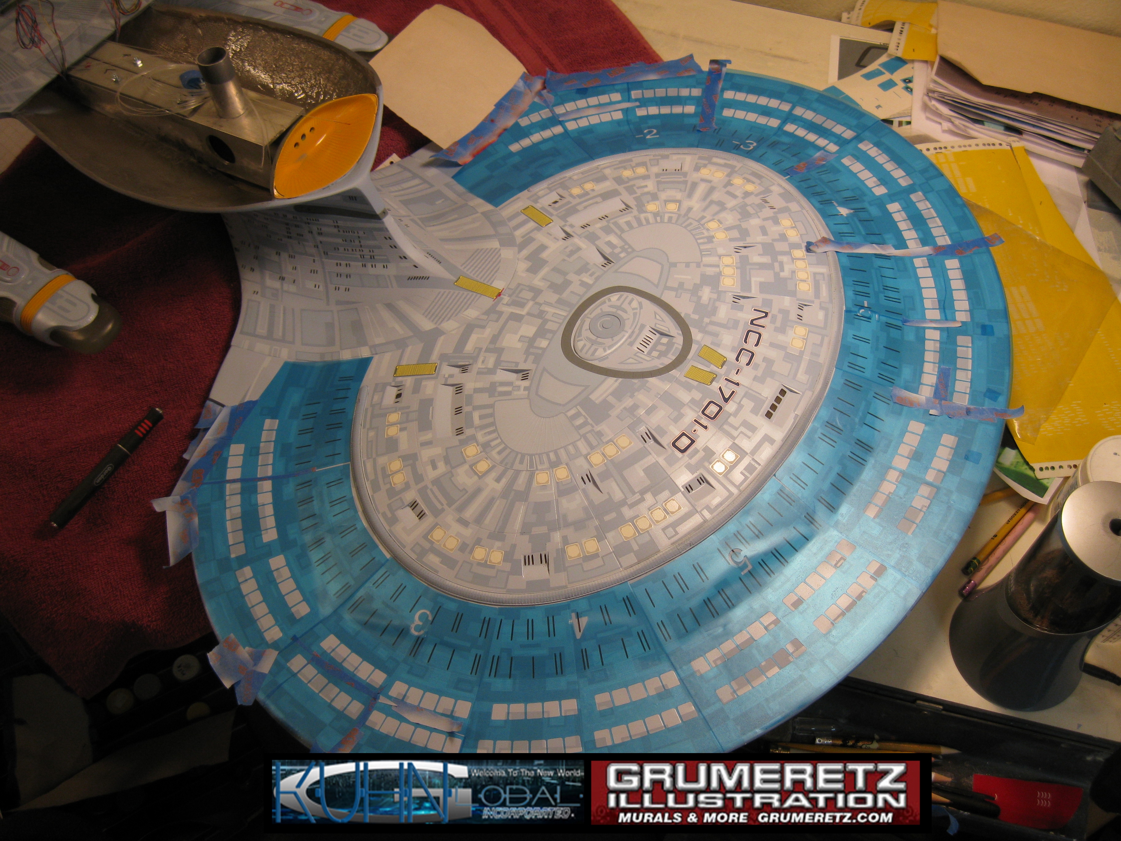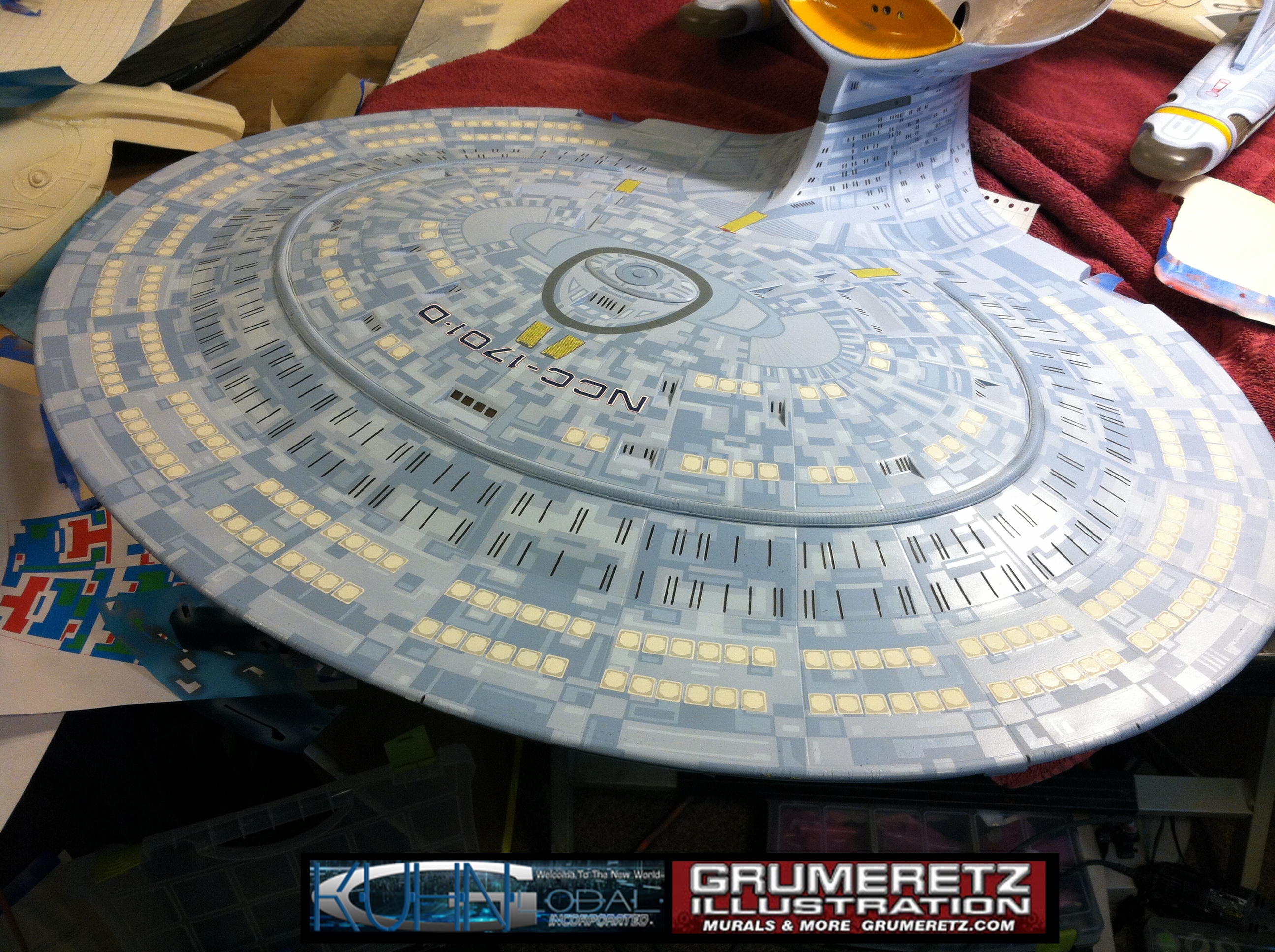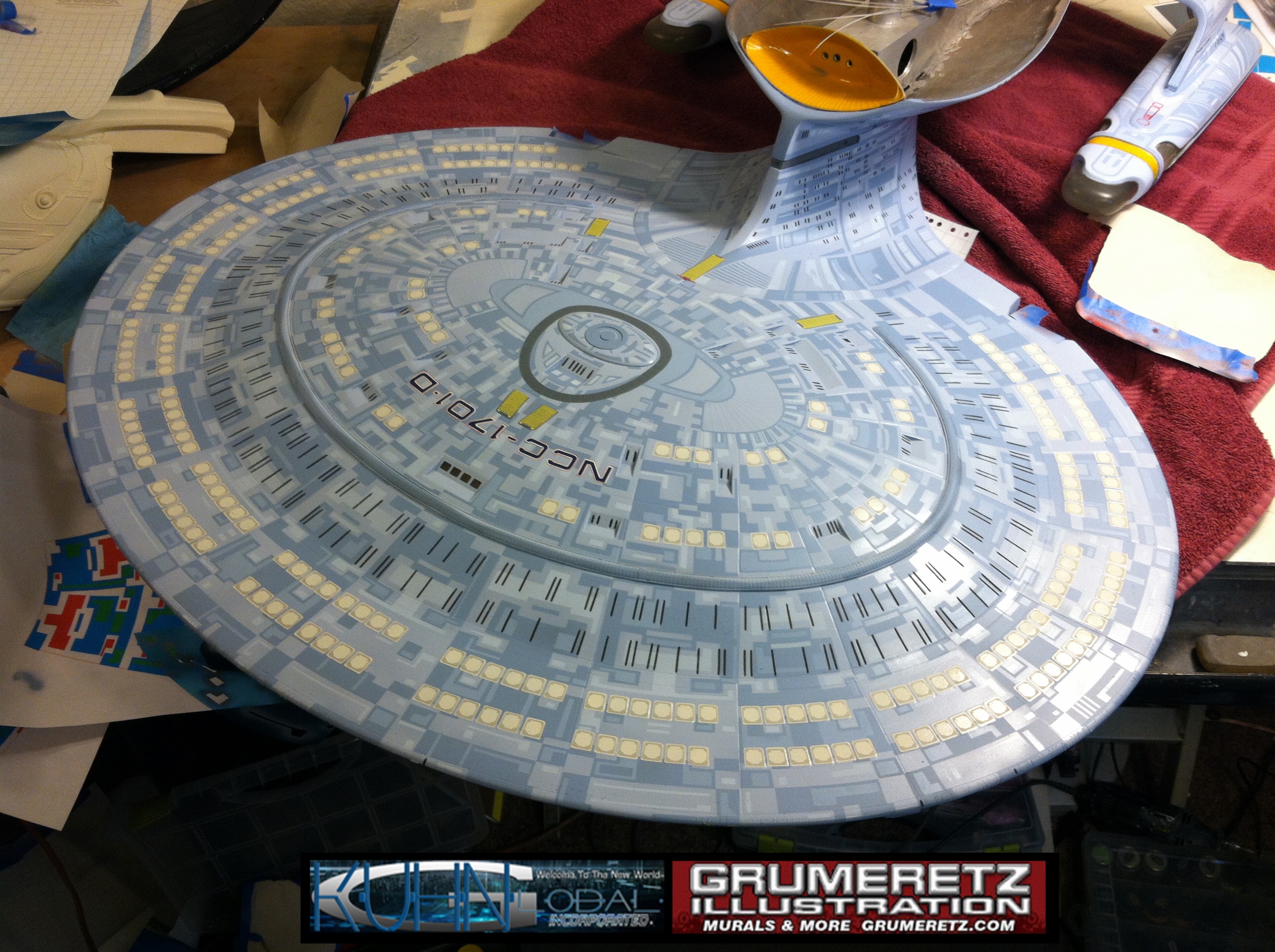 Artist Dan Grumeretz is doing magnificent work on recreating the TNG 6 foot studio model paint job on this 40 inch Enterprise 1701-D. There were differences in this cast from the actual 6 foot studio model of which he worked well with, changing a few cast details, then incorporating the FOUR levels of paint paneling to fit this cast. Dan studied the 6 foot model paint scheme very closely to get these patterns correct. Like I stated, there were minor differences in this cast from the cast configuration of the 6 foot studio model, so he fit it as well as possible to recreate the 6 foot beast in this just under four foot version. Other than the twin red vinyl stripes going down the spine, all you see on this is paint, even the lettered markings…. NO DECALS were used. The paint colors themselves came direct from Rick Sternback. I had purchased the one and only DeAgostini 1:900 (QMX Size) Enterprise 1701-D from him that included the same paint colors as was used on the 6 foot model. So we utilized those same colors for this 40 inch build. That stated, the camera Dan is using to photograph this progress really shows high contrast between the colors used. In person, they are not so pronounced and look much like the 6 foot studio model. With the custom studio stand now at Dan’s shop, still remaining to complete this build is minor clean up, fill in, nacelle ribs, and final lighting test. Once again, Dan is doing amazing work. This project has been a long time coming and I am pleased to see it coming to a close for final display in the collection here. There will be Blue Screen photos when it arrives. We hope you like it!