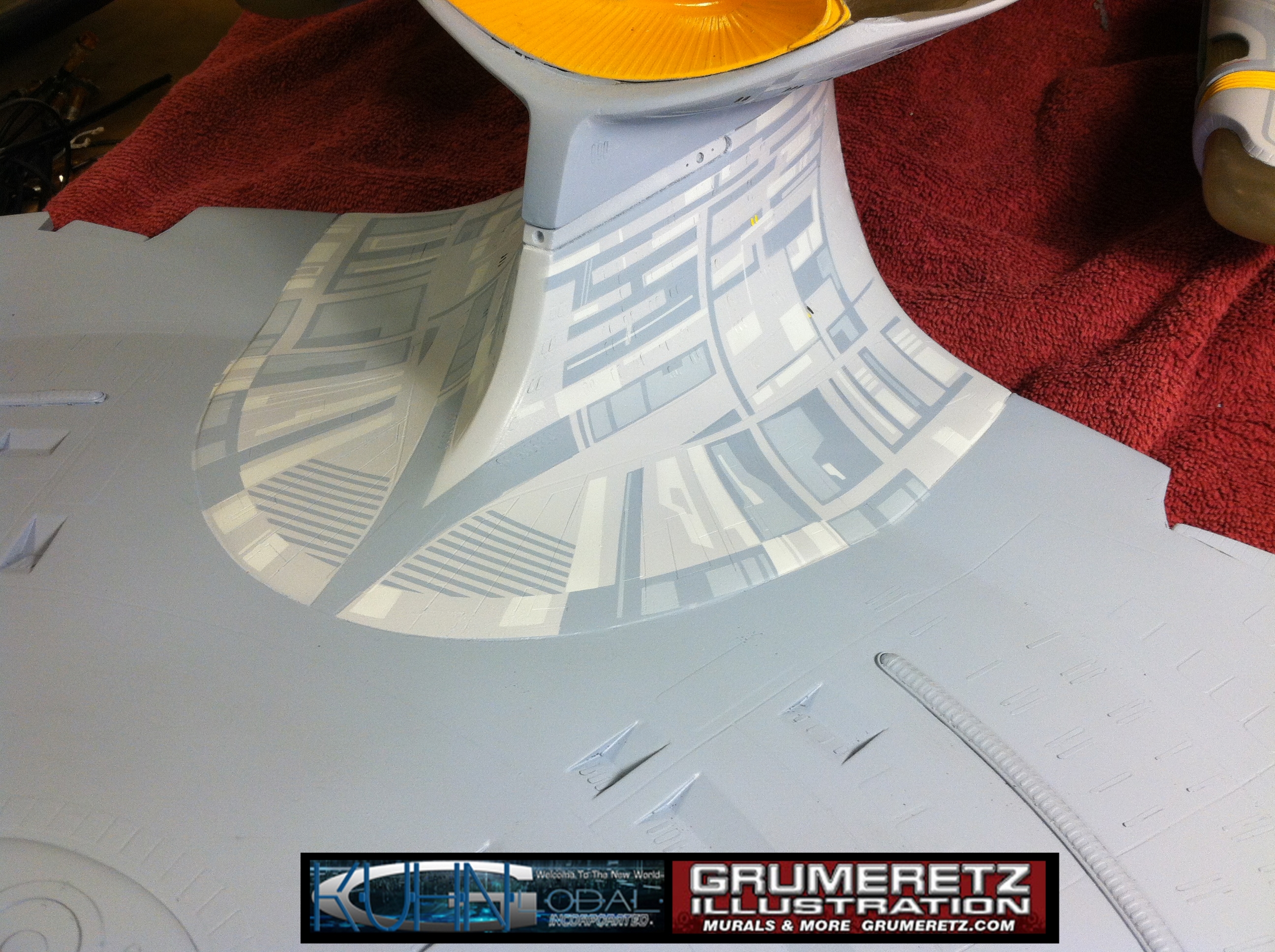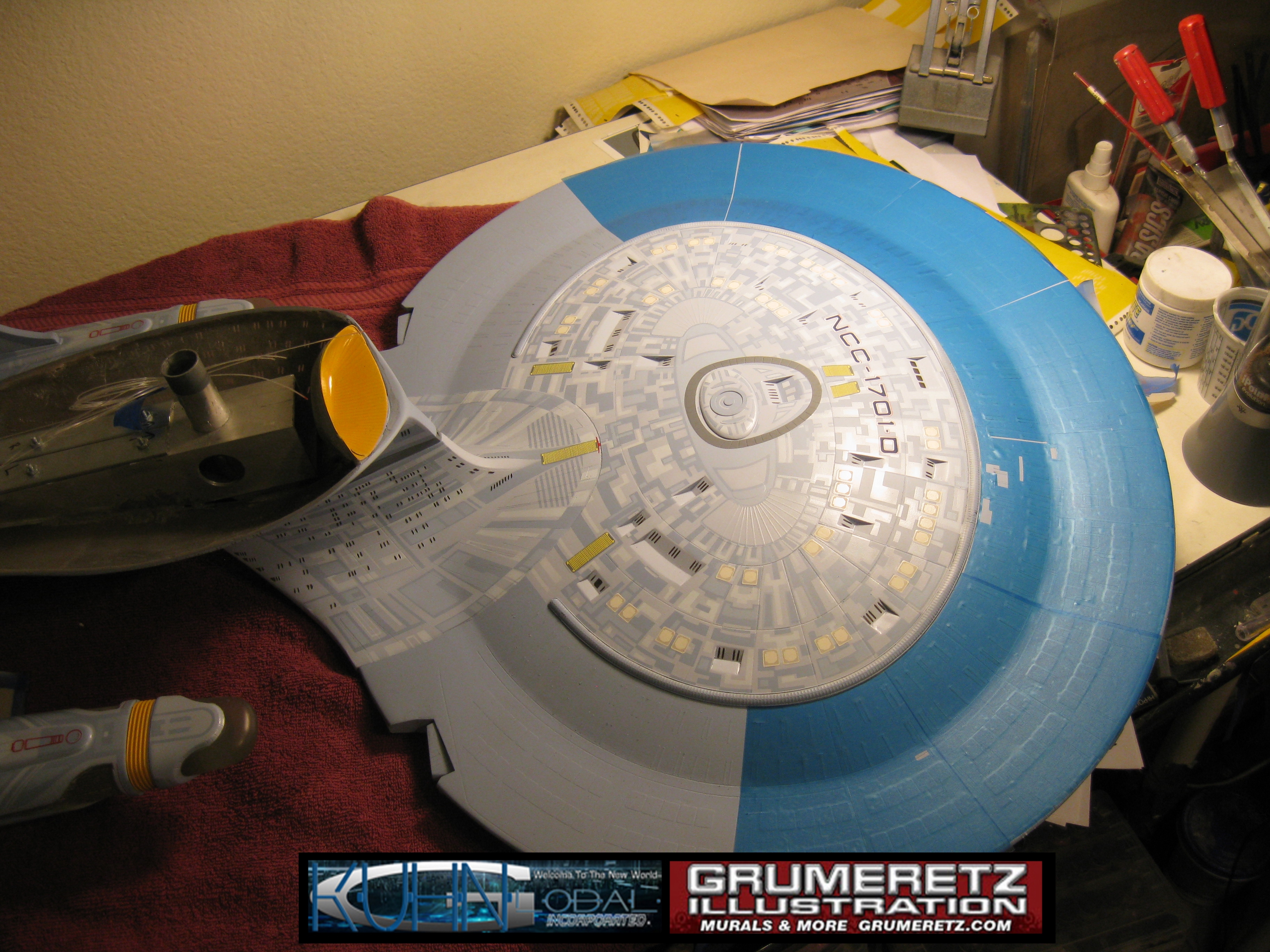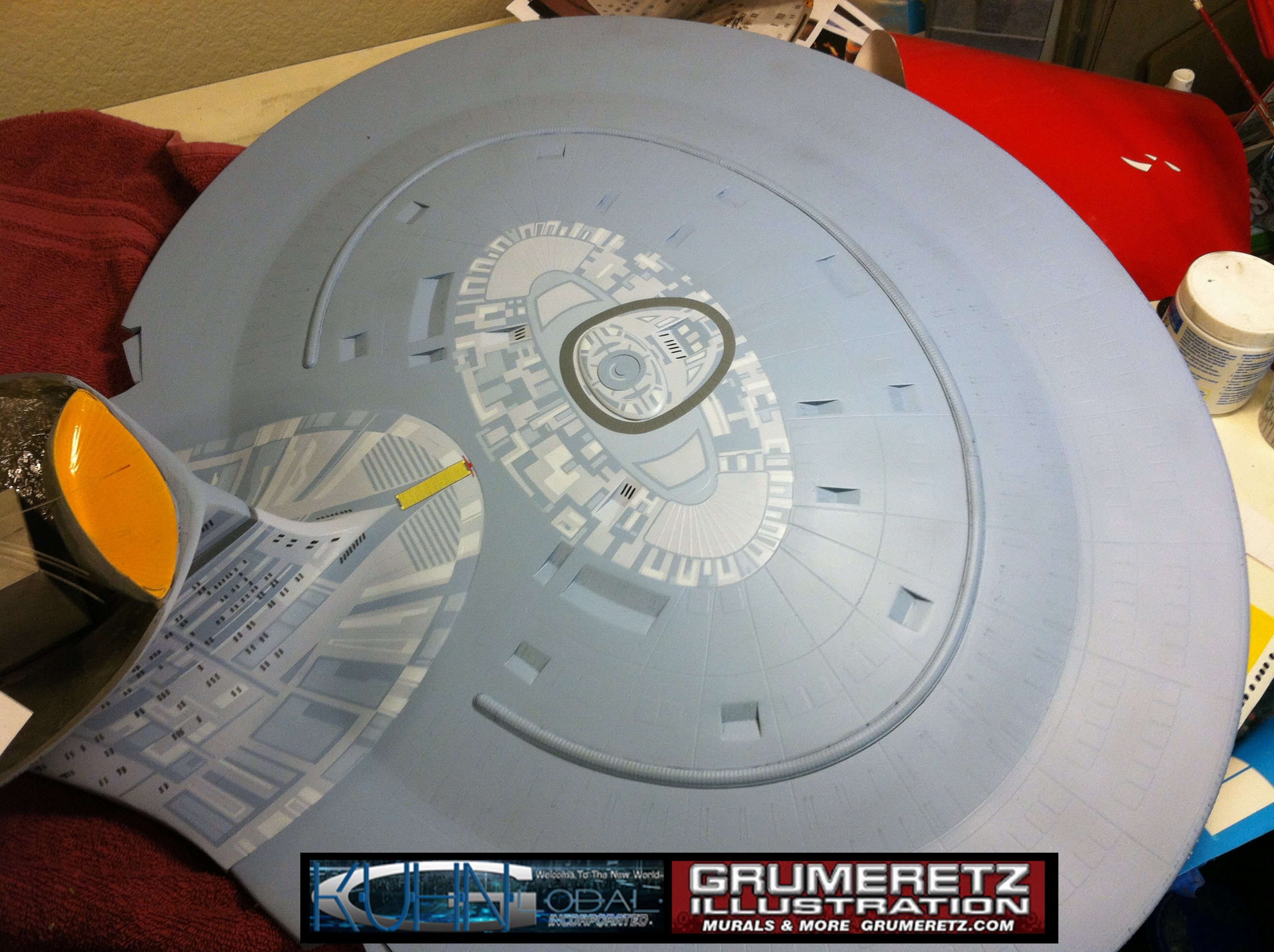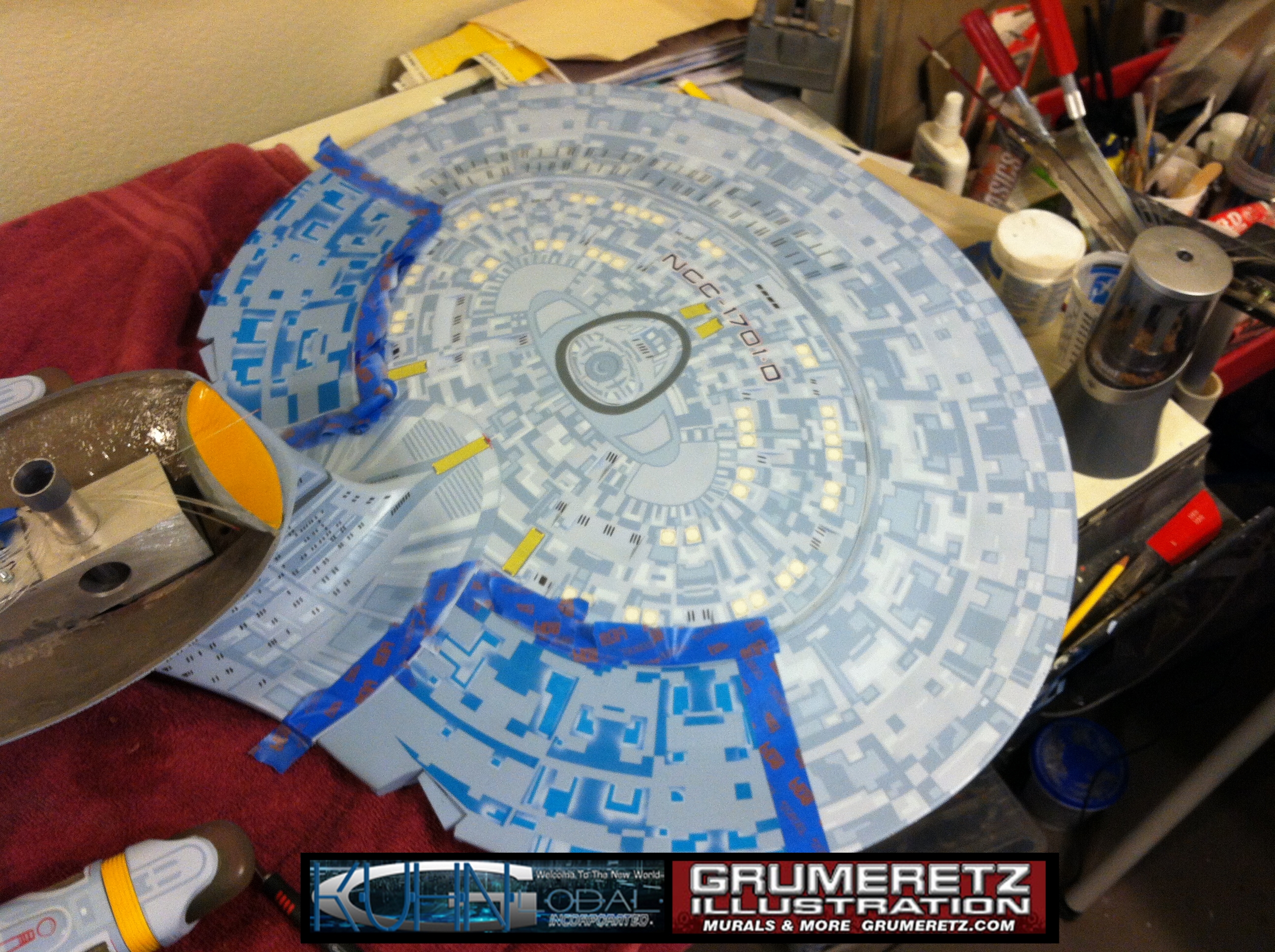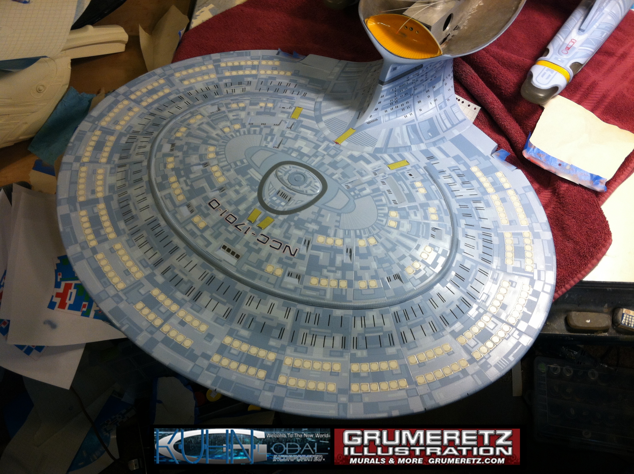 Artist Dan Grumeretz is doing magnificent work on recreating the TNG 6 foot studio model paint job on this 40 inch Enterprise 1701-D. There were differences in this cast from the actual 6 foot studio model of which he worked well with, changing a few cast details, then incorporating the FOUR levels of paint paneling to fit this cast. Dan studied the 6 foot model paint scheme very closely to get these patterns correct. Like I stated, there were minor differences in this cast from the cast configuration of the 6 foot studio model, so he fit it as well as possible to recreate the 6 foot beast in this just under four foot version. Other than the twin red vinyl stripes going down the spine, all you see on this is paint, even the lettered markings…. NO DECALS were used. The paint colors themselves came direct from Rick Sternback. I had purchased the one and only DeAgostini 1:900 (QMX Size) Enterprise 1701-D from him that included the same paint colors as was used on the 6 foot model. So we utilized those same colors for this 40 inch build. That stated, the camera Dan is using to photograph this progress really shows high contrast between the colors used. In person, they are not so pronounced and look much like the 6 foot studio model. With the custom studio stand now at Dan’s shop, still remaining to complete this build is minor clean up, fill in, nacelle ribs, and final lighting test. Once again, Dan is doing amazing work. This project has been a long time coming and I am pleased to see it coming to a close for final display in the collection here. There will be Blue Screen photos when it arrives. We hope you like it!
