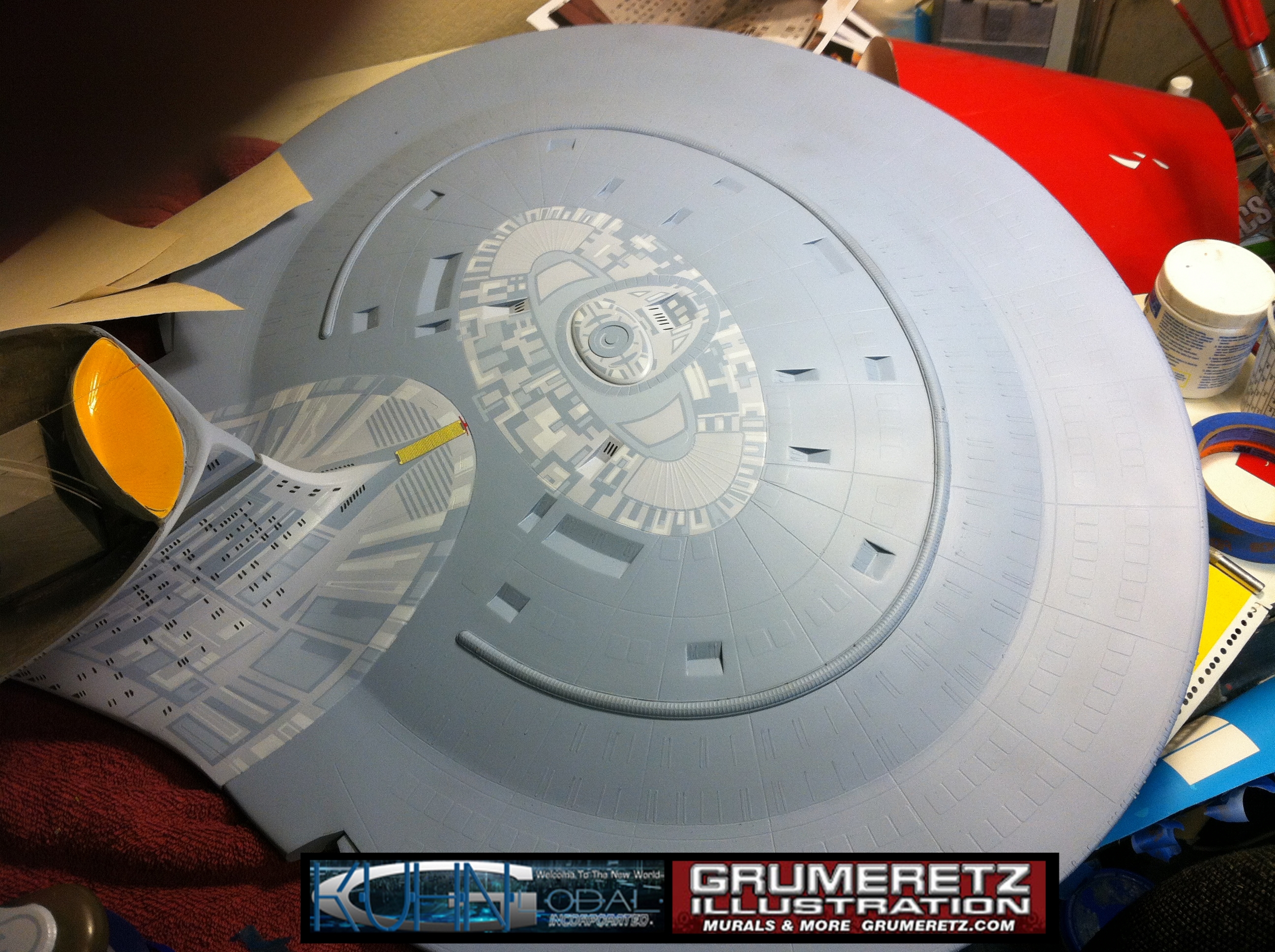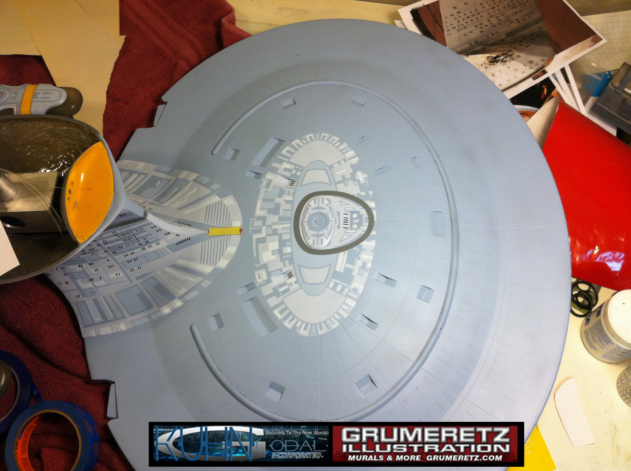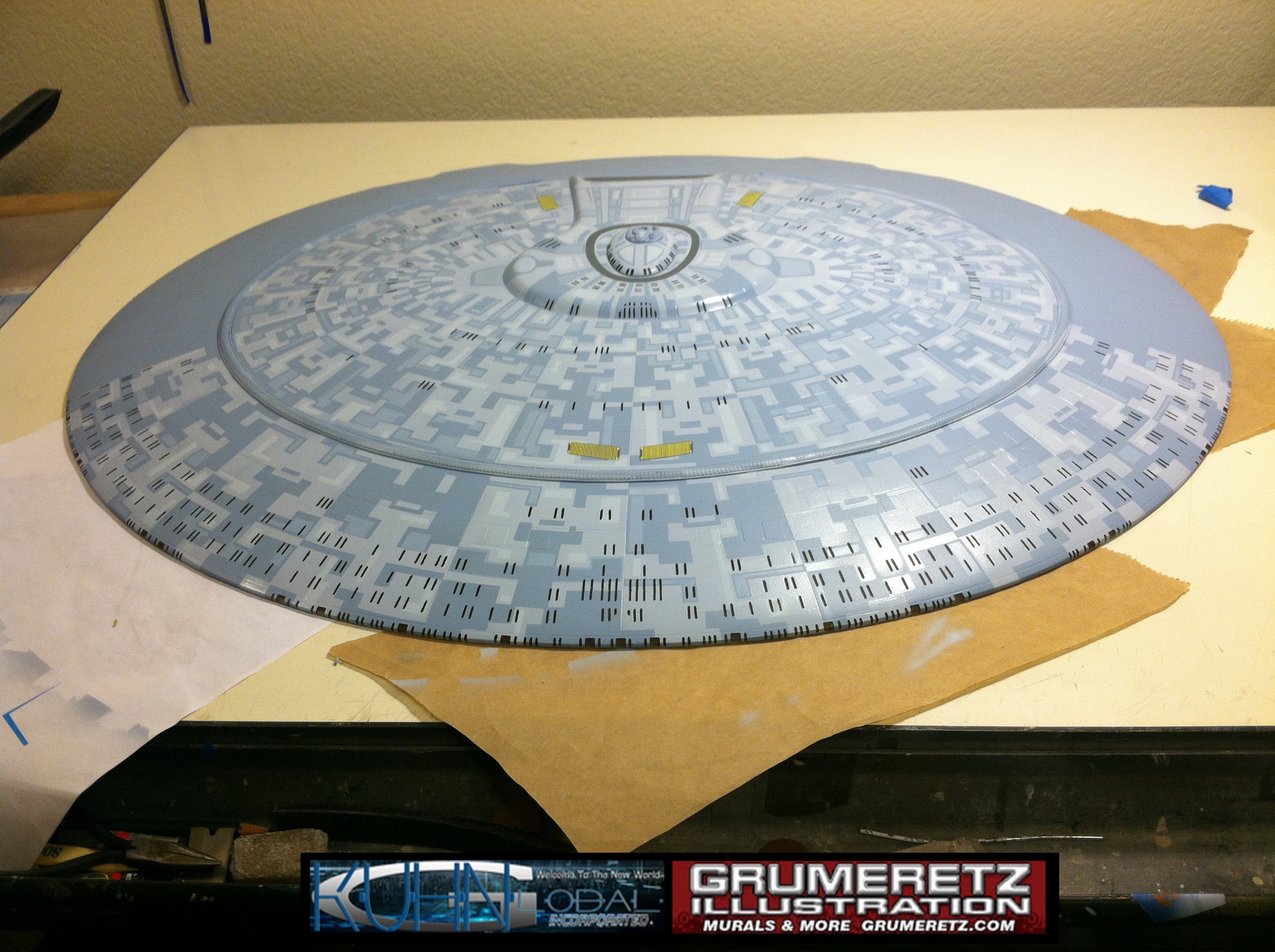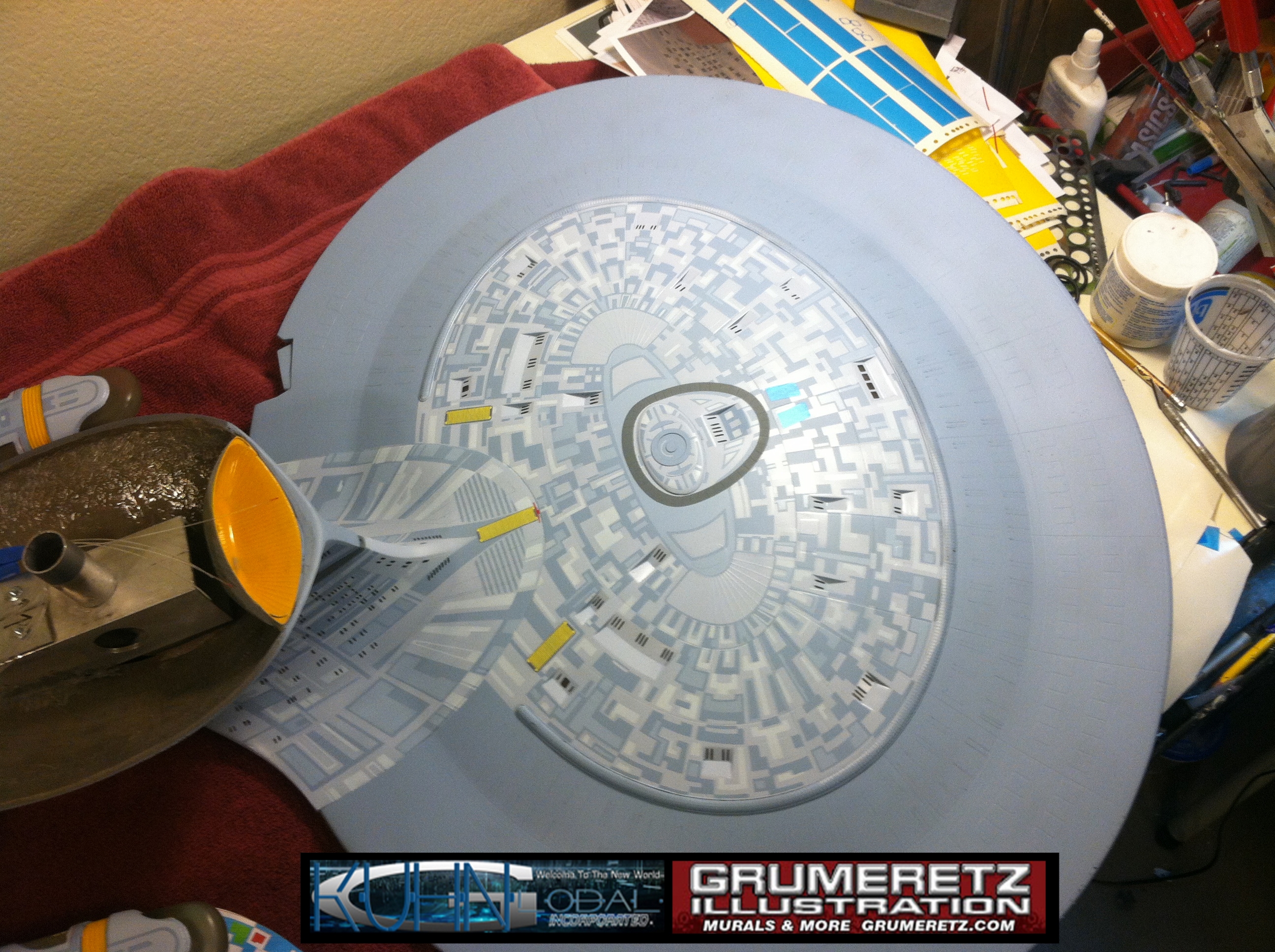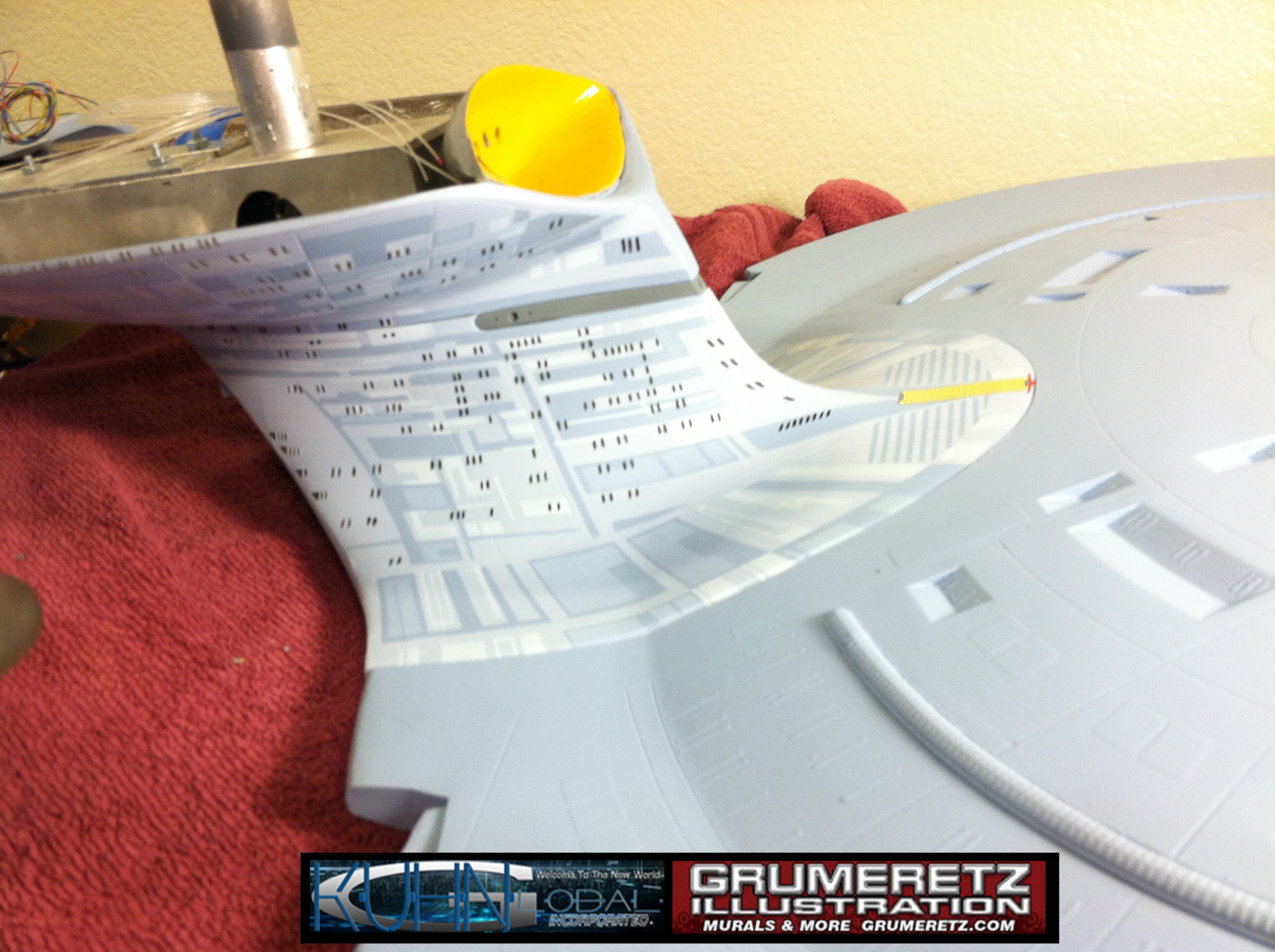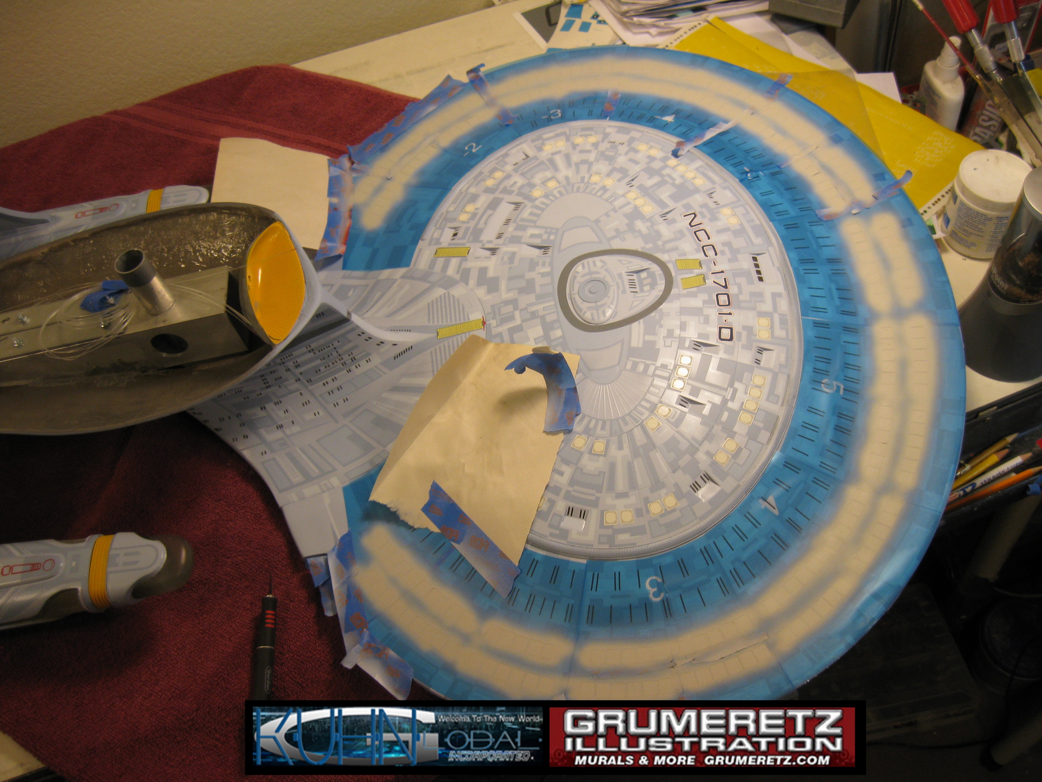 Artist Dan Grumeretz is doing magnificent work on recreating the TNG 6 foot studio model paint job on this 40 inch Enterprise 1701-D. There were differences in this cast from the actual 6 foot studio model of which he worked well with, changing a few cast details, then incorporating the FOUR levels of paint paneling to fit this cast. Dan studied the 6 foot model paint scheme very closely to get these patterns correct. Like I stated, there were minor differences in this cast from the cast configuration of the 6 foot studio model, so he fit it as well as possible to recreate the 6 foot beast in this just under four foot version. Other than the twin red vinyl stripes going down the spine, all you see on this is paint, even the lettered markings…. NO DECALS were used. The paint colors themselves came direct from Rick Sternback. I had purchased the one and only DeAgostini 1:900 (QMX Size) Enterprise 1701-D from him that included the same paint colors as was used on the 6 foot model. So we utilized those same colors for this 40 inch build. That stated, the camera Dan is using to photograph this progress really shows high contrast between the colors used. In person, they are not so pronounced and look much like the 6 foot studio model. With the custom studio stand now at Dan’s shop, still remaining to complete this build is minor clean up, fill in, nacelle ribs, and final lighting test. Once again, Dan is doing amazing work. This project has been a long time coming and I am pleased to see it coming to a close for final display in the collection here. There will be Blue Screen photos when it arrives. We hope you like it!