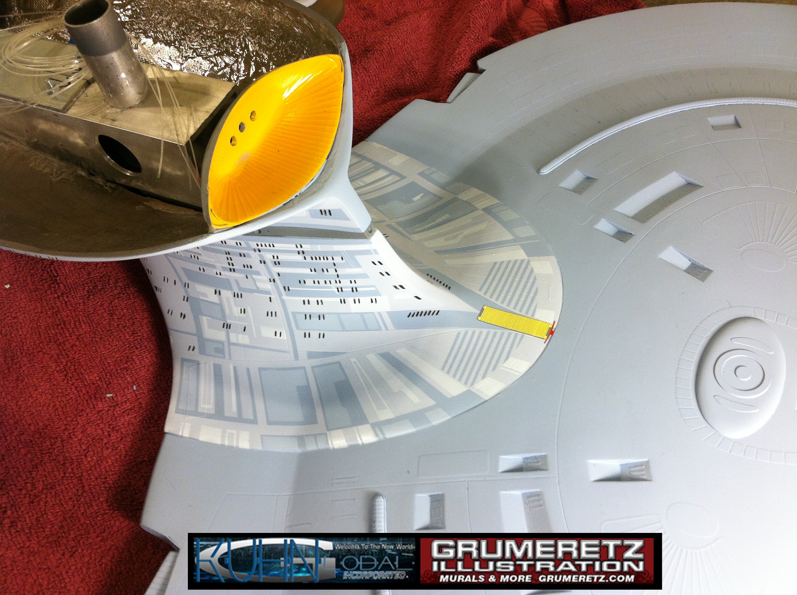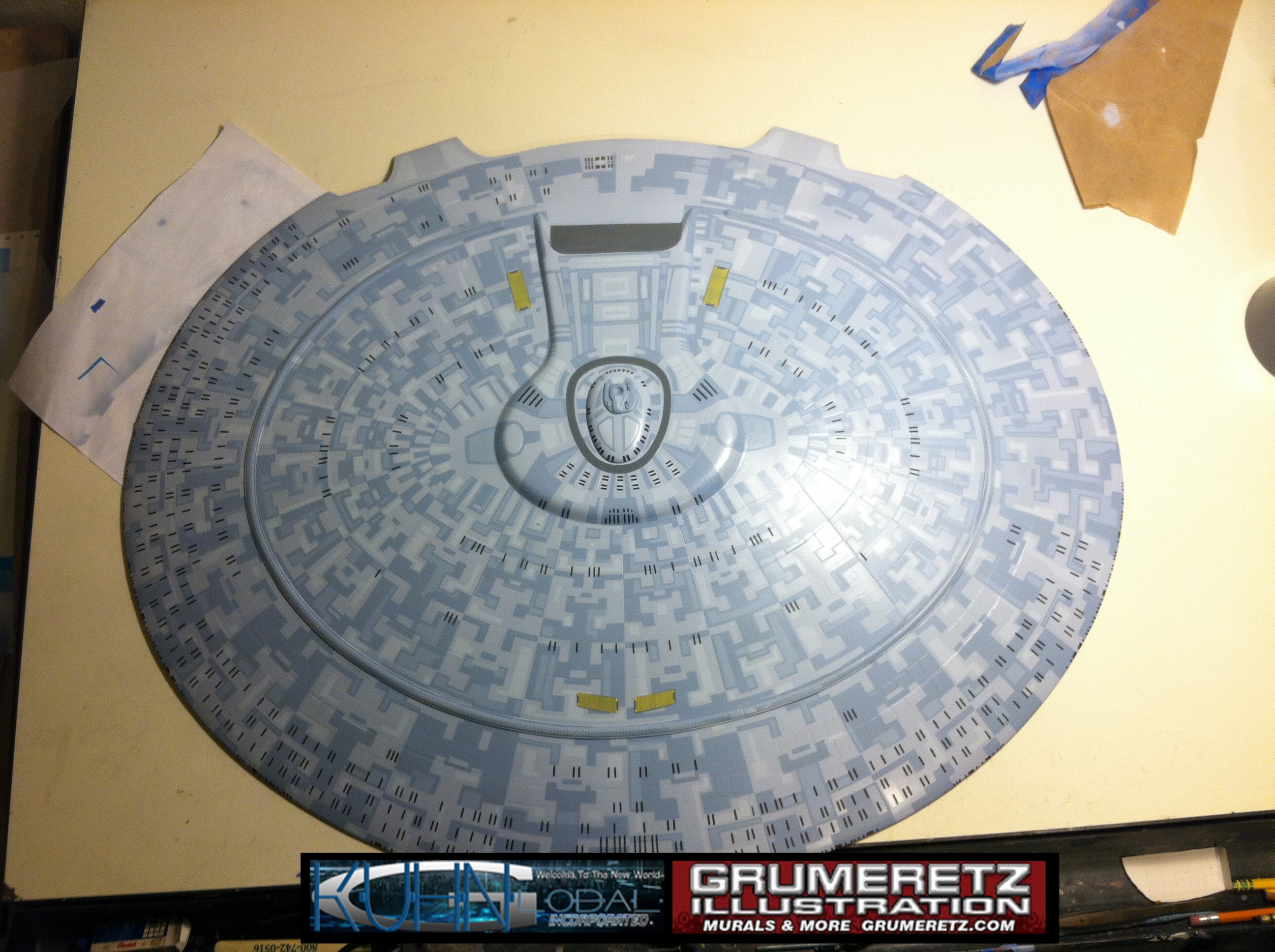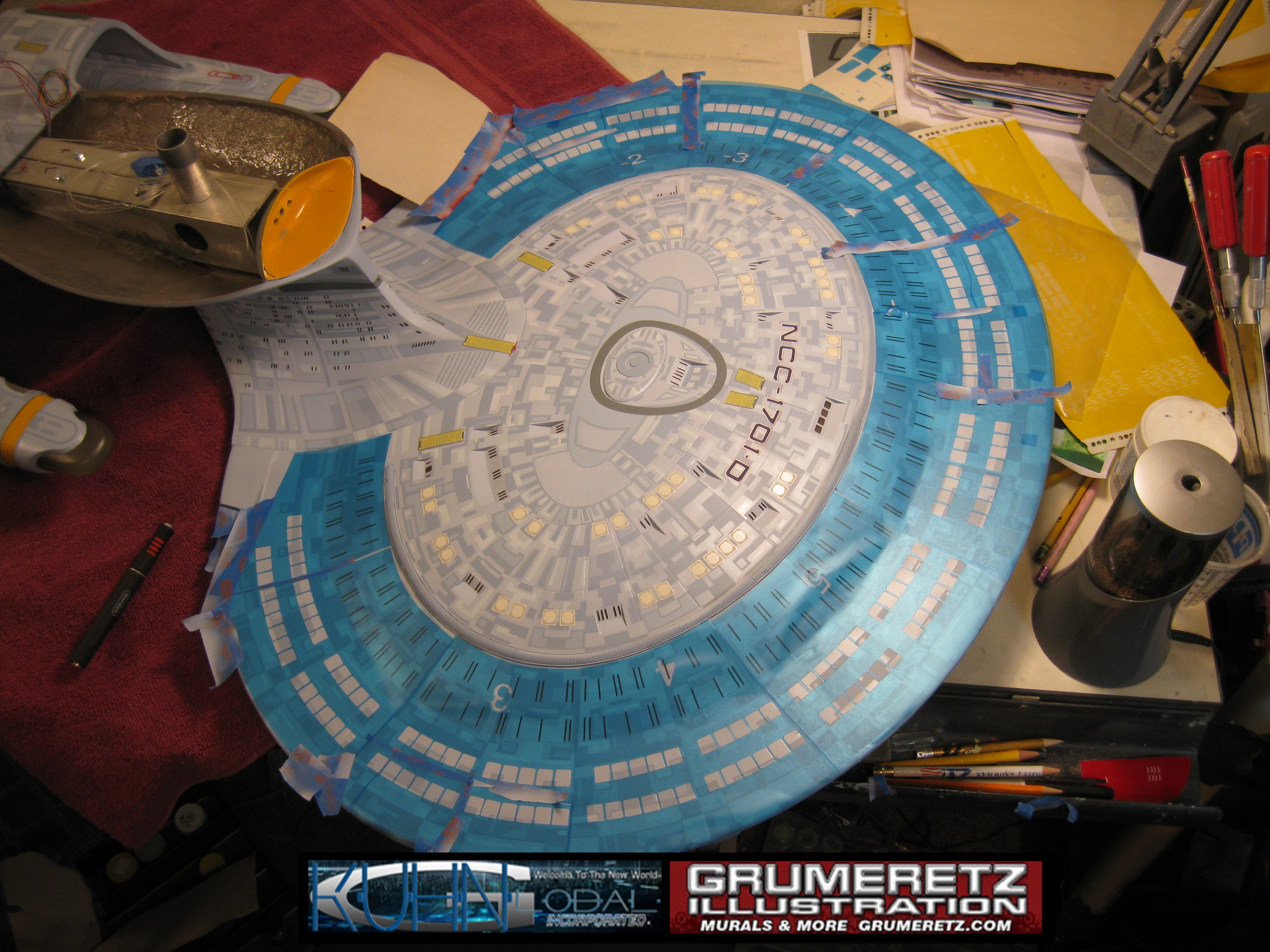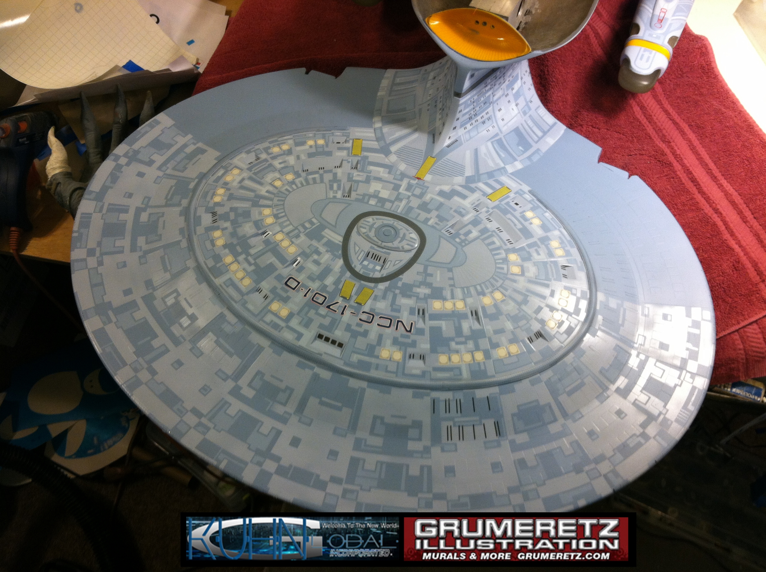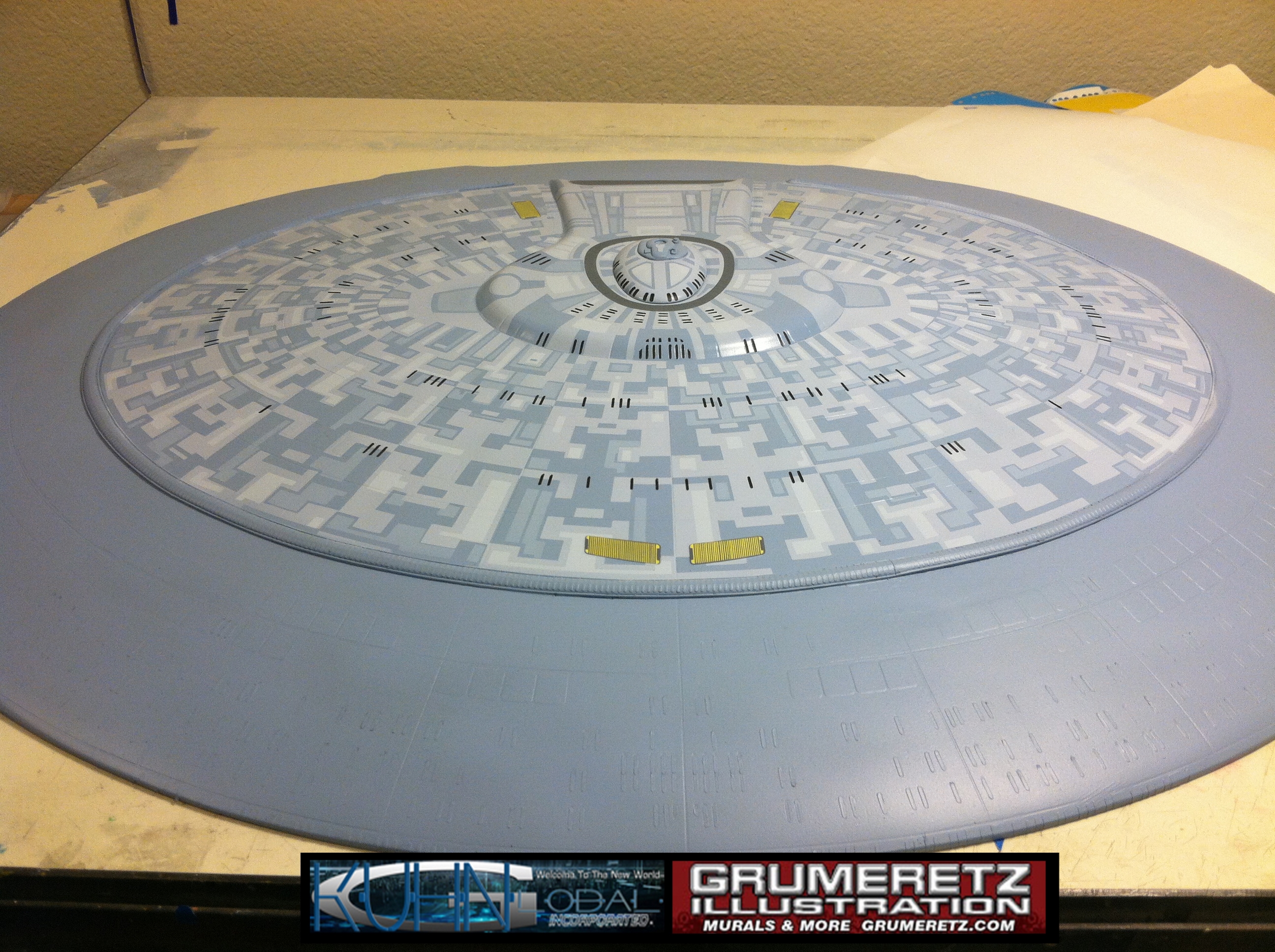 Artist Dan Grumeretz is doing magnificent work on recreating the TNG 6 foot studio model paint job on this 40 inch Enterprise 1701-D. There were differences in this cast from the actual 6 foot studio model of which he worked well with, changing a few cast details, then incorporating the FOUR levels of paint paneling to fit this cast. Dan studied the 6 foot model paint scheme very closely to get these patterns correct. Like I stated, there were minor differences in this cast from the cast configuration of the 6 foot studio model, so he fit it as well as possible to recreate the 6 foot beast in this just under four foot version. Other than the twin red vinyl stripes going down the spine, all you see on this is paint, even the lettered markings…. NO DECALS were used. The paint colors themselves came direct from Rick Sternback. I had purchased the one and only DeAgostini 1:900 (QMX Size) Enterprise 1701-D from him that included the same paint colors as was used on the 6 foot model. So we utilized those same colors for this 40 inch build. That stated, the camera Dan is using to photograph this progress really shows high contrast between the colors used. In person, they are not so pronounced and look much like the 6 foot studio model. With the custom studio stand now at Dan’s shop, still remaining to complete this build is minor clean up, fill in, nacelle ribs, and final lighting test. Once again, Dan is doing amazing work. This project has been a long time coming and I am pleased to see it coming to a close for final display in the collection here. There will be Blue Screen photos when it arrives. We hope you like it!