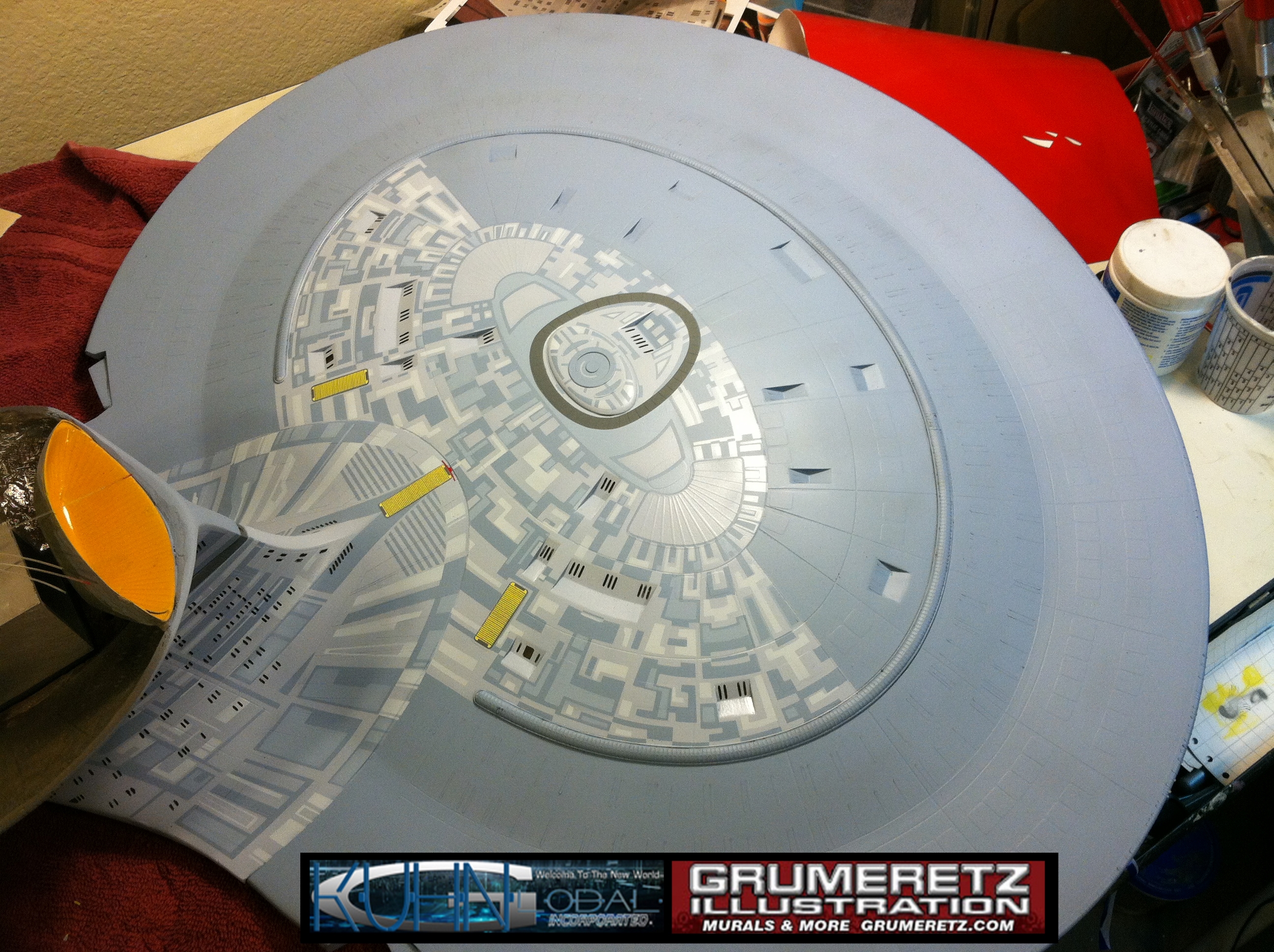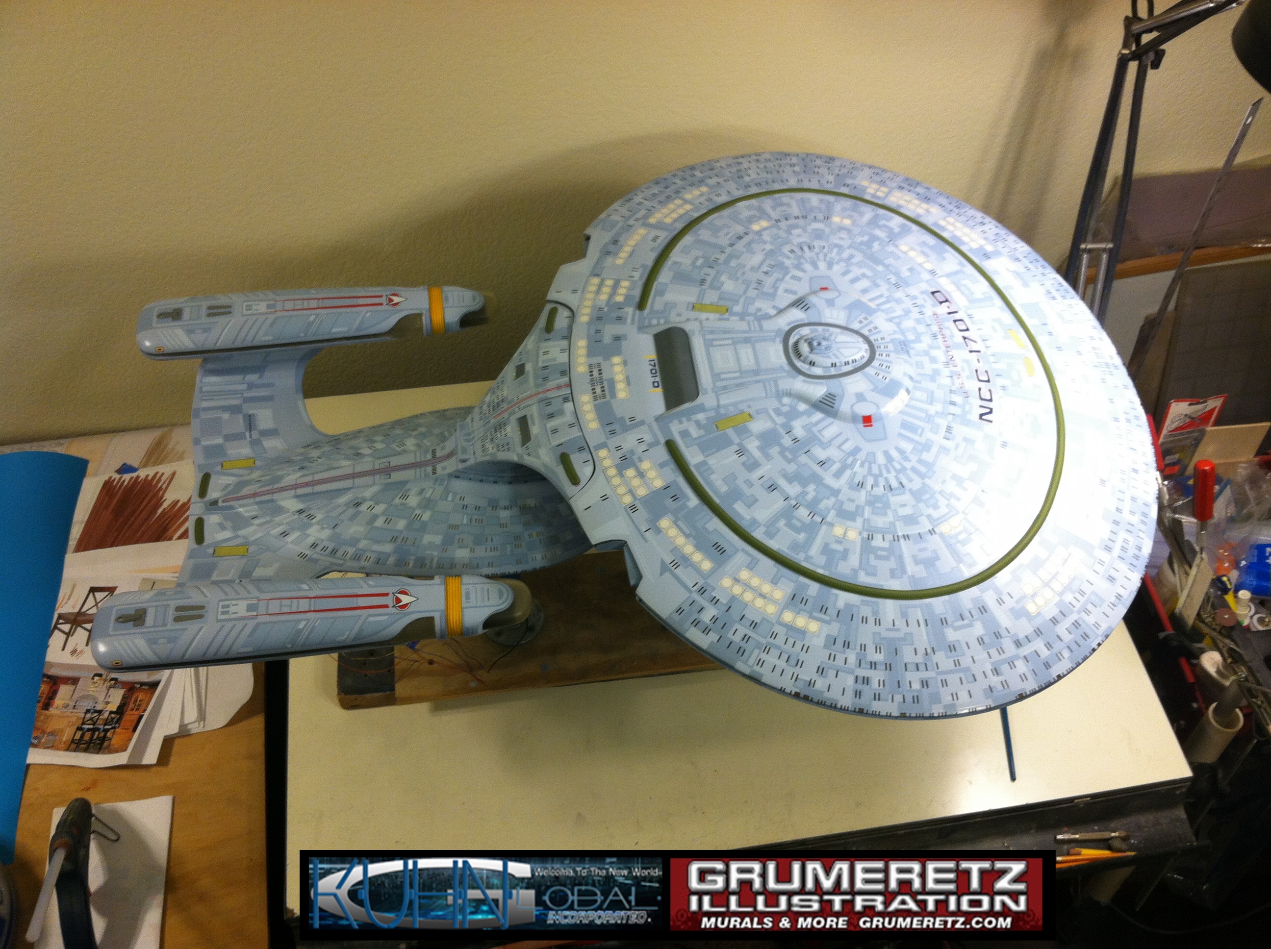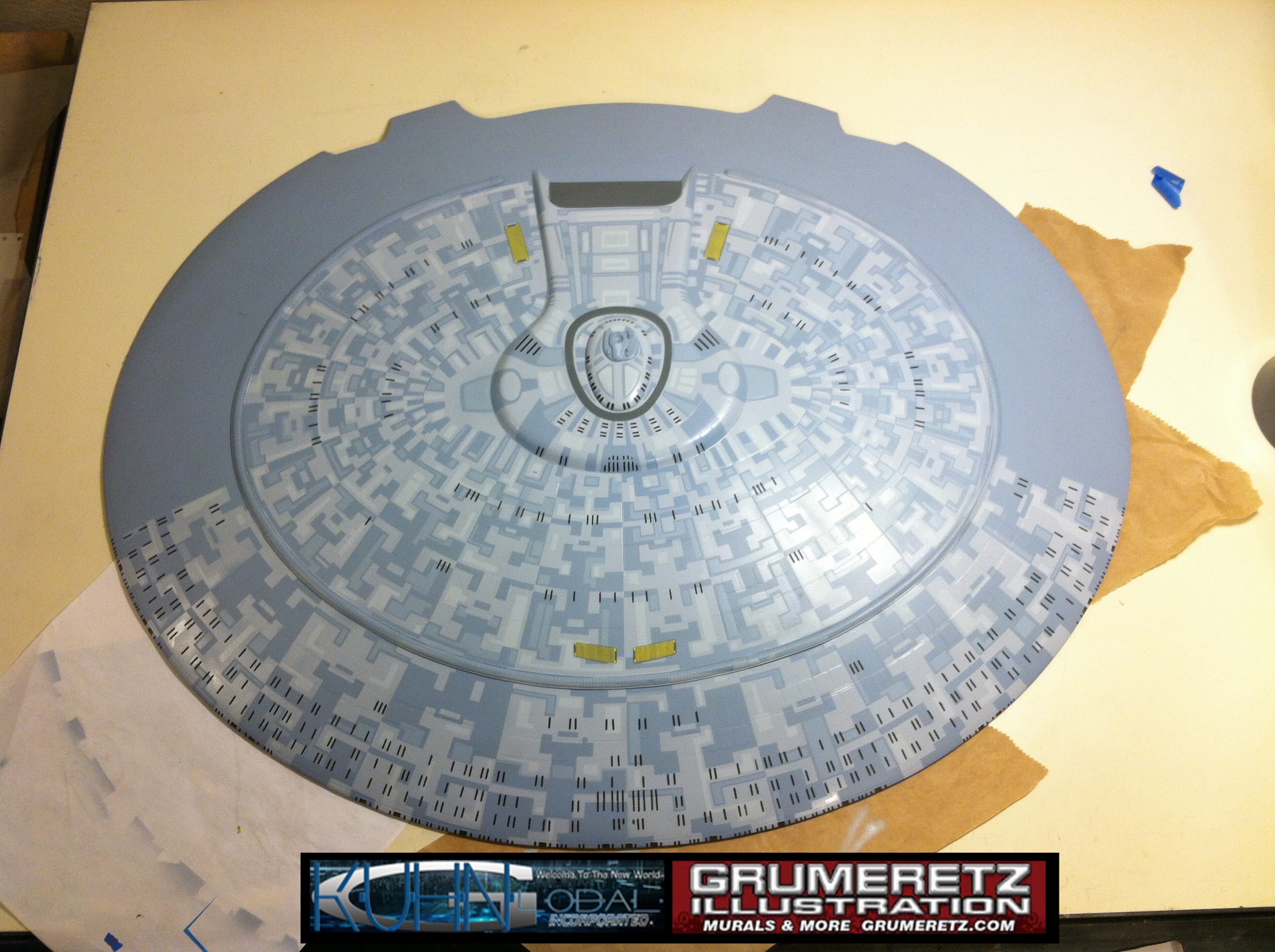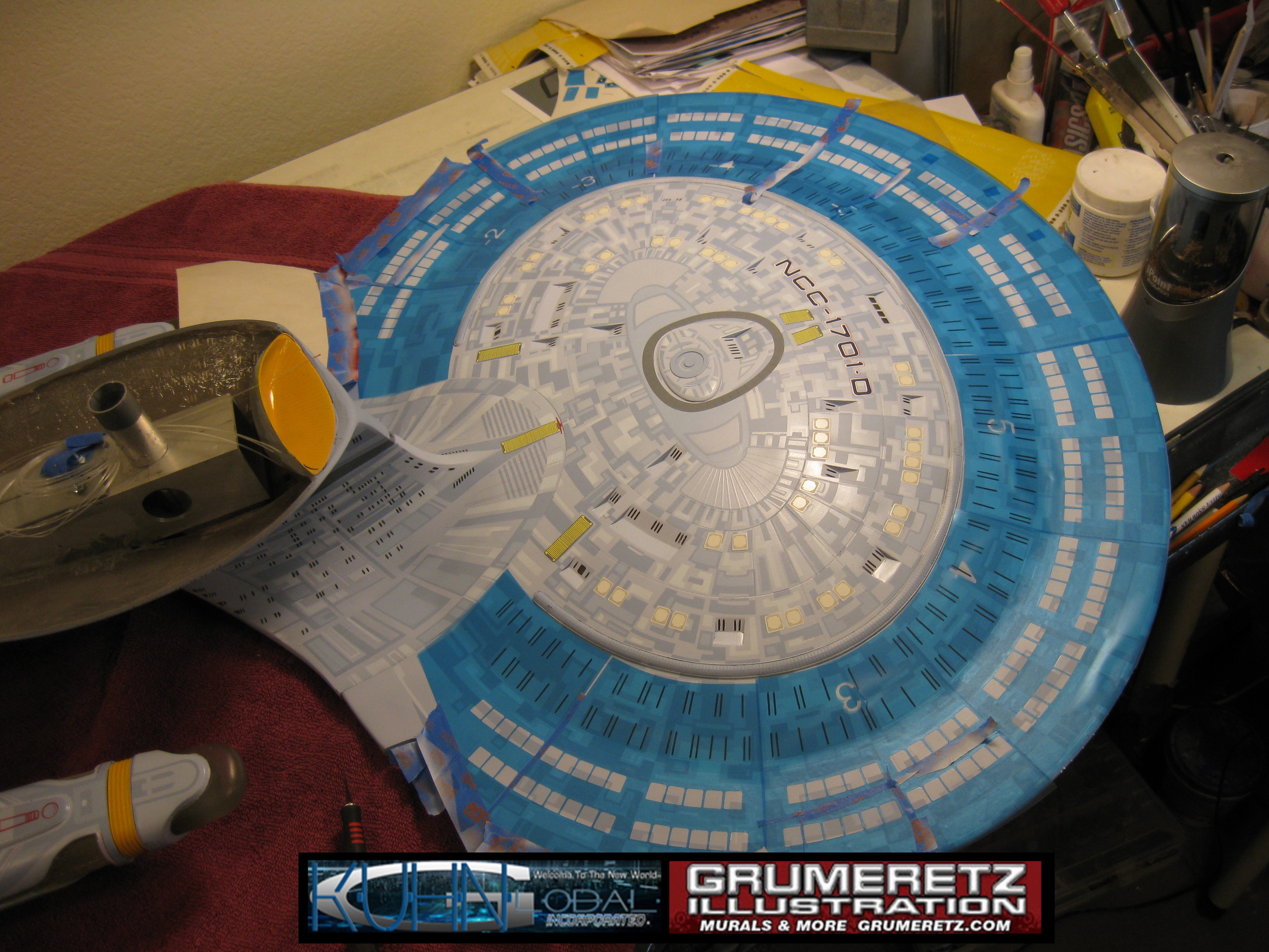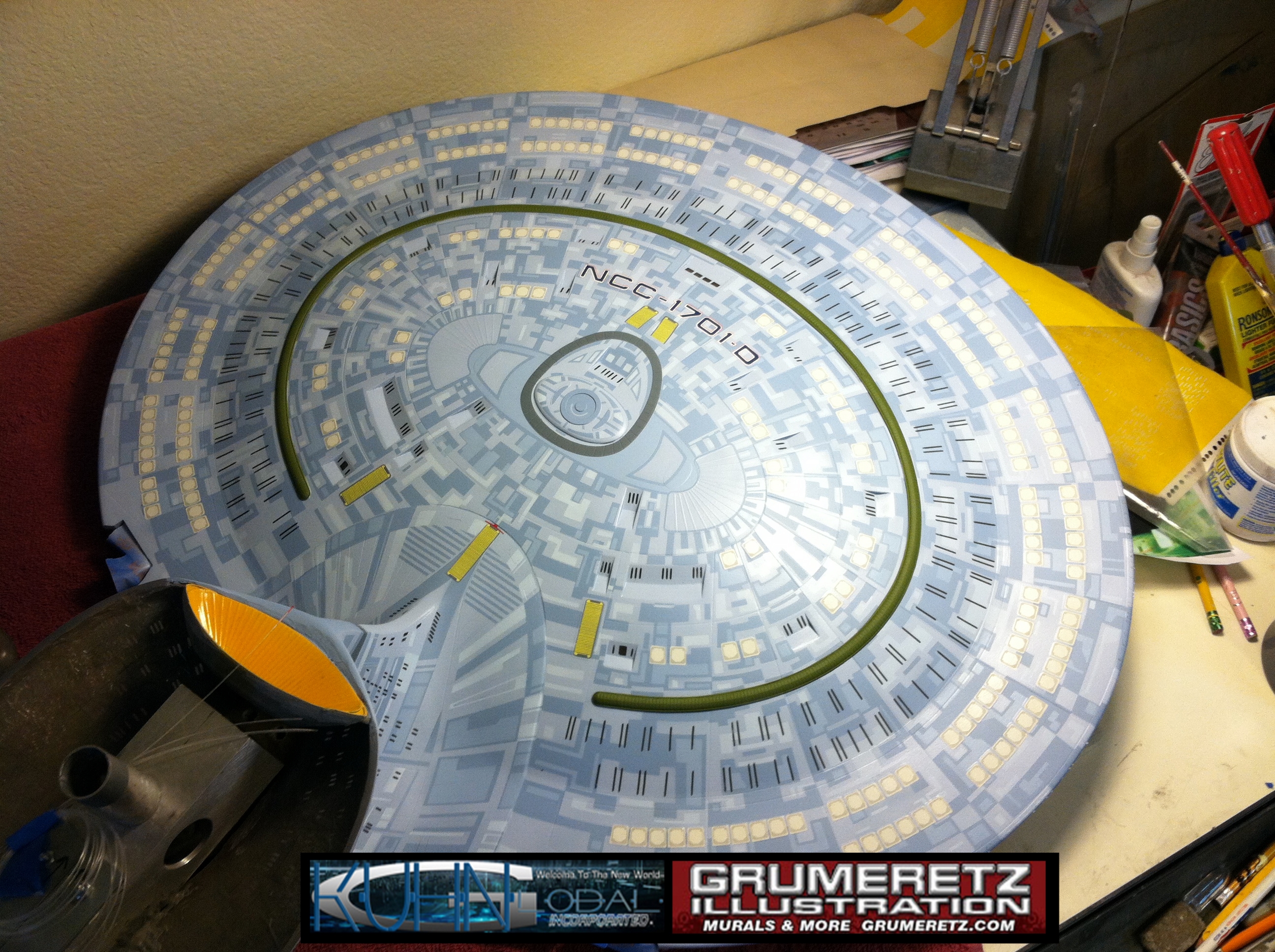 Artist Dan Grumeretz is doing magnificent work on recreating the TNG 6 foot studio model paint job on this 40 inch Enterprise 1701-D. There were differences in this cast from the actual 6 foot studio model of which he worked well with, changing a few cast details, then incorporating the FOUR levels of paint paneling to fit this cast. Dan studied the 6 foot model paint scheme very closely to get these patterns correct. Like I stated, there were minor differences in this cast from the cast configuration of the 6 foot studio model, so he fit it as well as possible to recreate the 6 foot beast in this just under four foot version. Other than the twin red vinyl stripes going down the spine, all you see on this is paint, even the lettered markings…. NO DECALS were used. The paint colors themselves came direct from Rick Sternback. I had purchased the one and only DeAgostini 1:900 (QMX Size) Enterprise 1701-D from him that included the same paint colors as was used on the 6 foot model. So we utilized those same colors for this 40 inch build. That stated, the camera Dan is using to photograph this progress really shows high contrast between the colors used. In person, they are not so pronounced and look much like the 6 foot studio model. With the custom studio stand now at Dan’s shop, still remaining to complete this build is minor clean up, fill in, nacelle ribs, and final lighting test. Once again, Dan is doing amazing work. This project has been a long time coming and I am pleased to see it coming to a close for final display in the collection here. There will be Blue Screen photos when it arrives. We hope you like it!