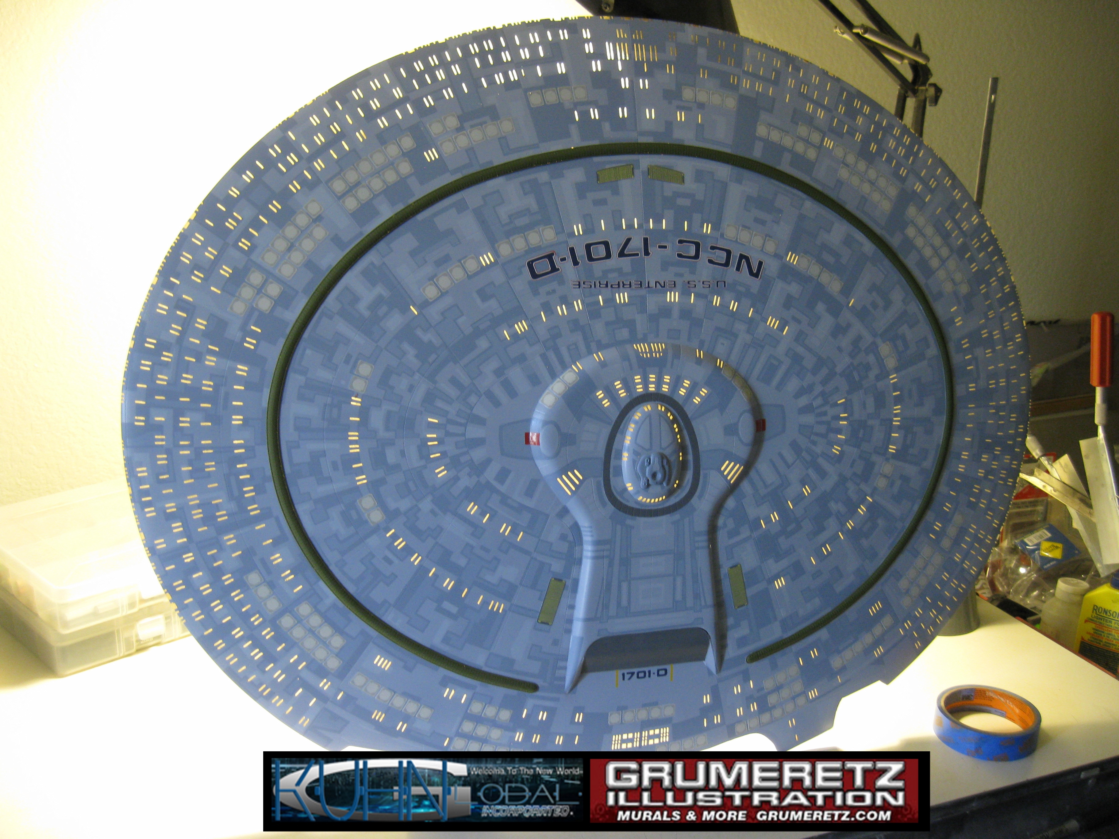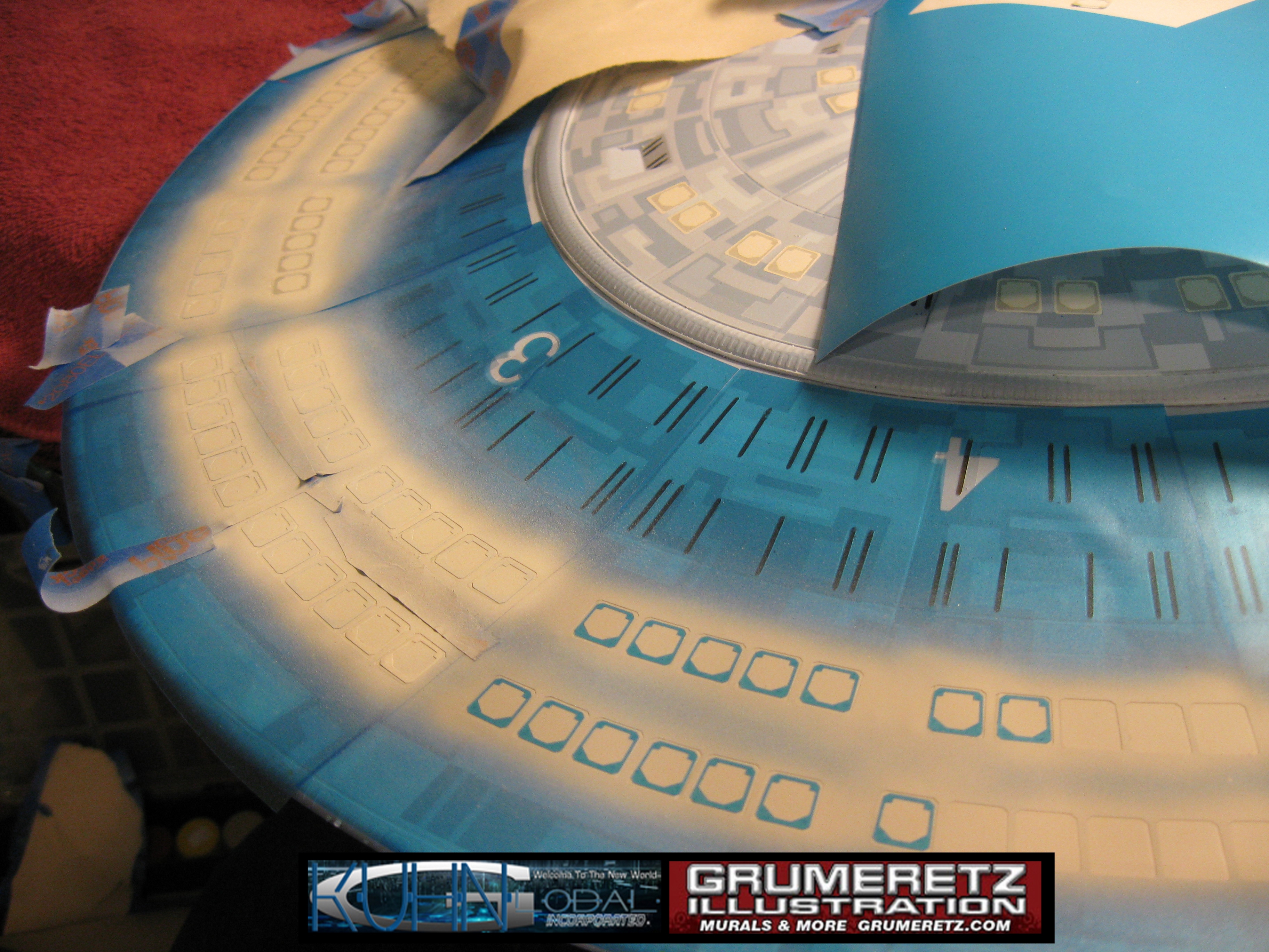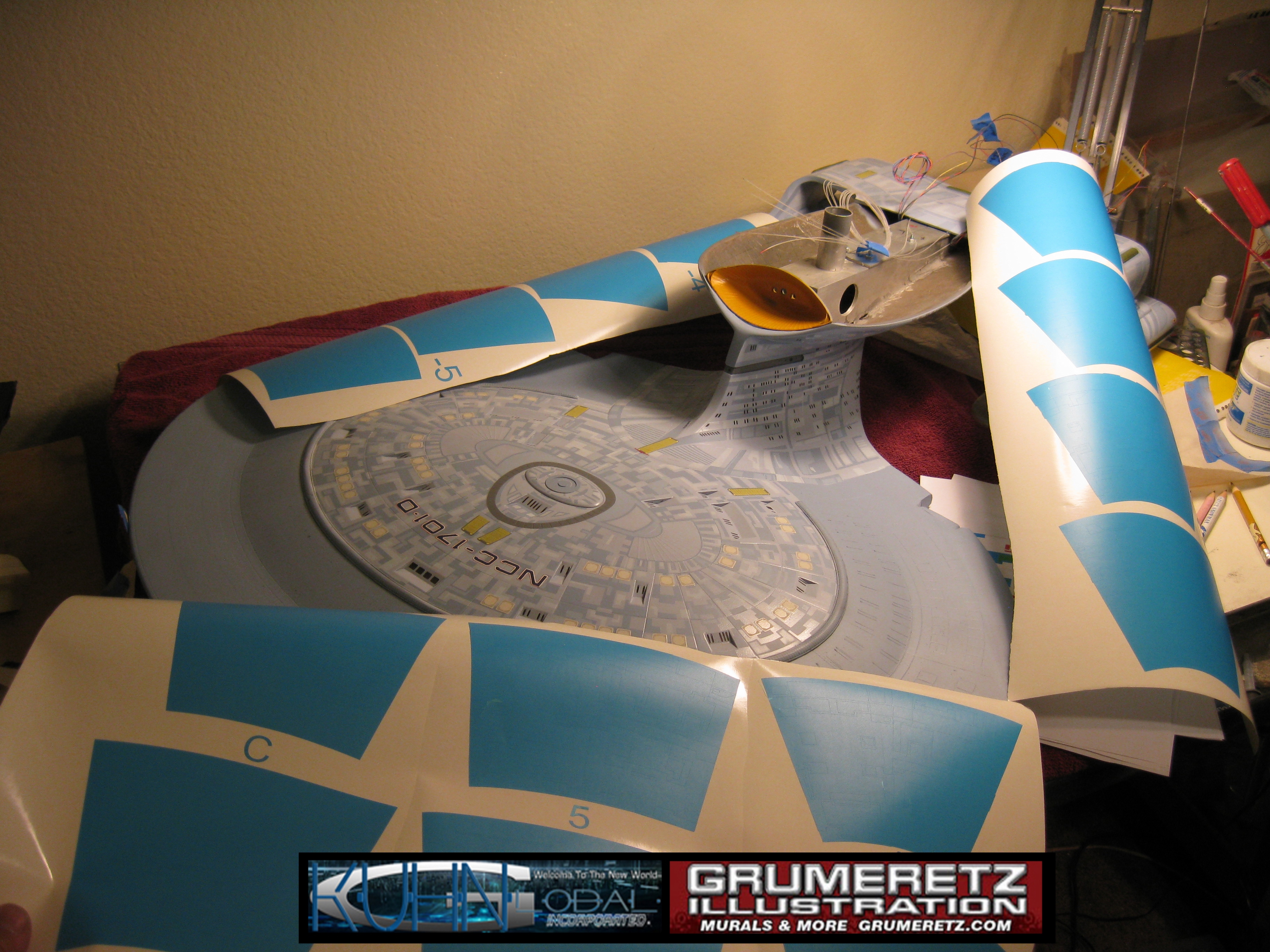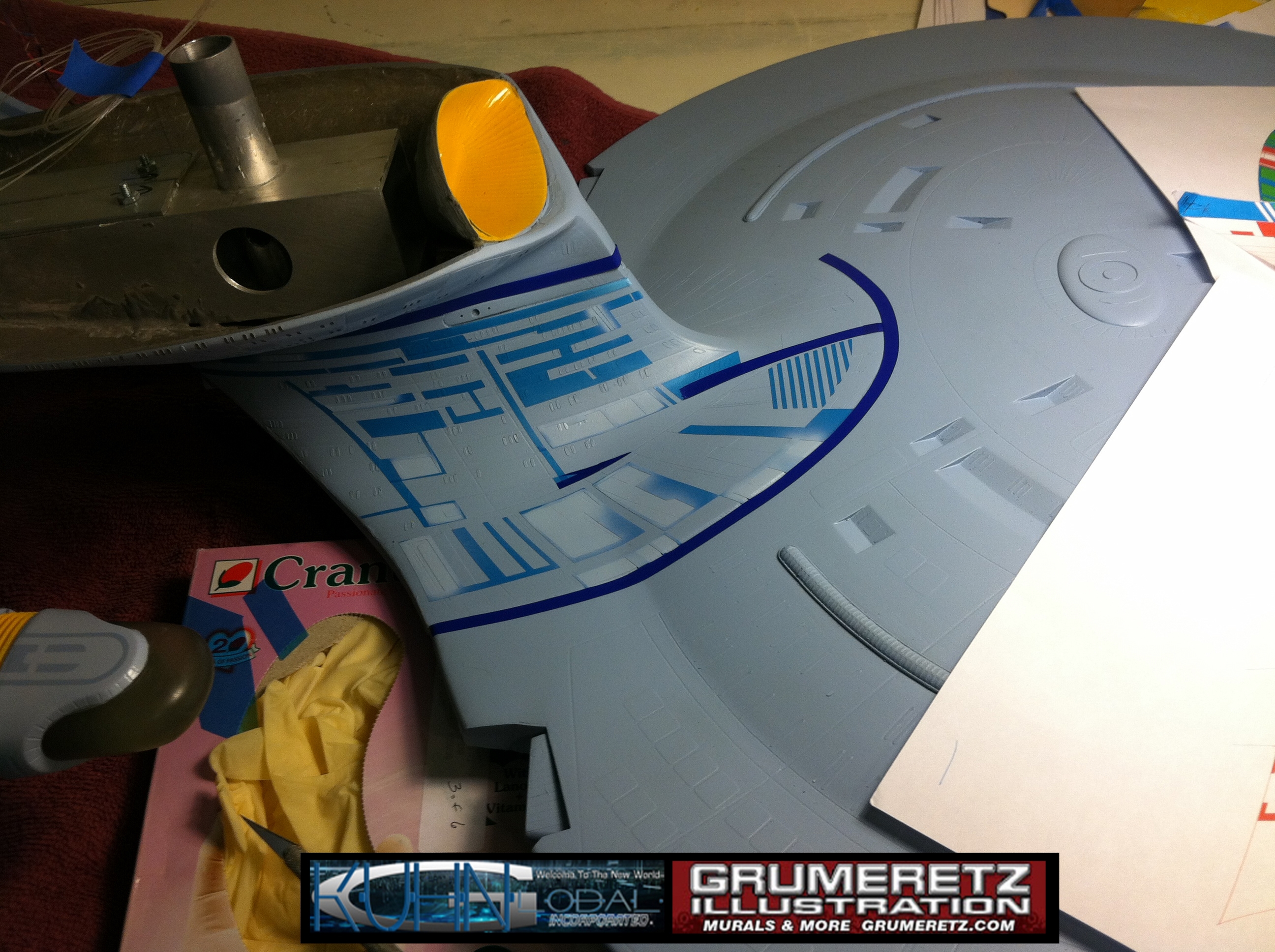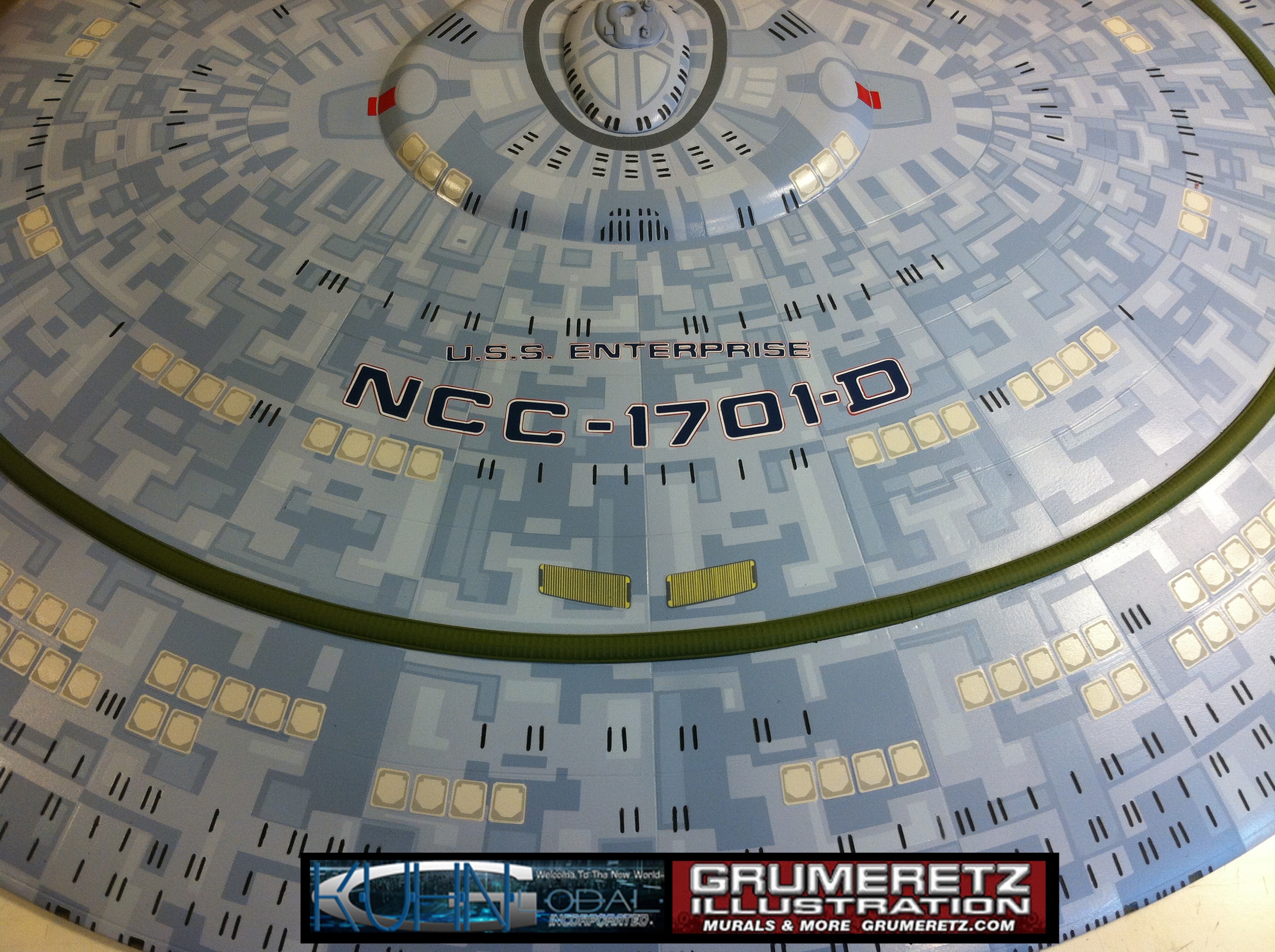 Artist Dan Grumeretz is doing magnificent work on recreating the TNG 6 foot studio model paint job on this 40 inch Enterprise 1701-D. There were differences in this cast from the actual 6 foot studio model of which he worked well with, changing a few cast details, then incorporating the FOUR levels of paint paneling to fit this cast. Dan studied the 6 foot model paint scheme very closely to get these patterns correct. Like I stated, there were minor differences in this cast from the cast configuration of the 6 foot studio model, so he fit it as well as possible to recreate the 6 foot beast in this just under four foot version. Other than the twin red vinyl stripes going down the spine, all you see on this is paint, even the lettered markings…. NO DECALS were used. The paint colors themselves came direct from Rick Sternback. I had purchased the one and only DeAgostini 1:900 (QMX Size) Enterprise 1701-D from him that included the same paint colors as was used on the 6 foot model. So we utilized those same colors for this 40 inch build. That stated, the camera Dan is using to photograph this progress really shows high contrast between the colors used. In person, they are not so pronounced and look much like the 6 foot studio model. With the custom studio stand now at Dan’s shop, still remaining to complete this build is minor clean up, fill in, nacelle ribs, and final lighting test. Once again, Dan is doing amazing work. This project has been a long time coming and I am pleased to see it coming to a close for final display in the collection here. There will be Blue Screen photos when it arrives. We hope you like it!