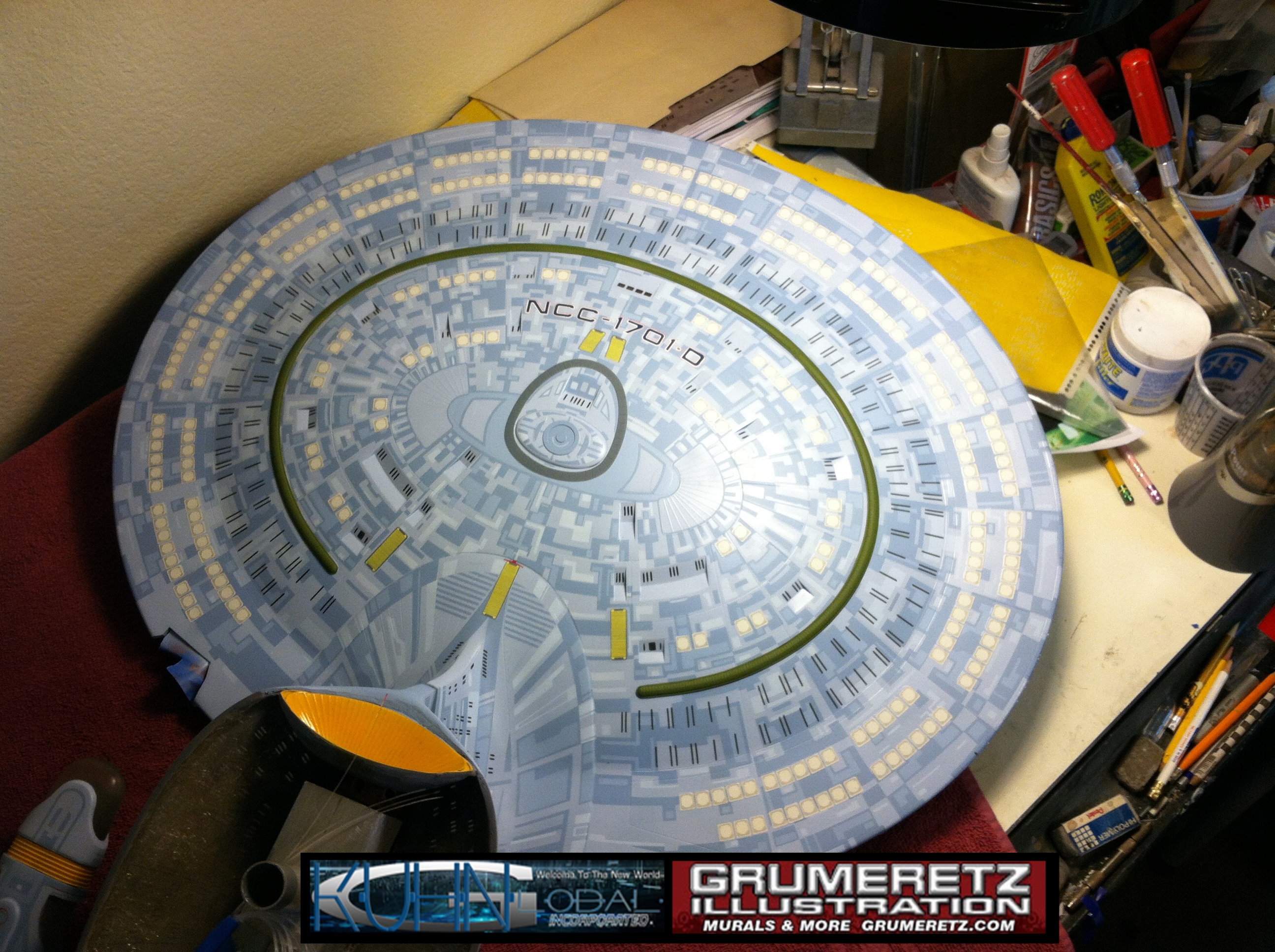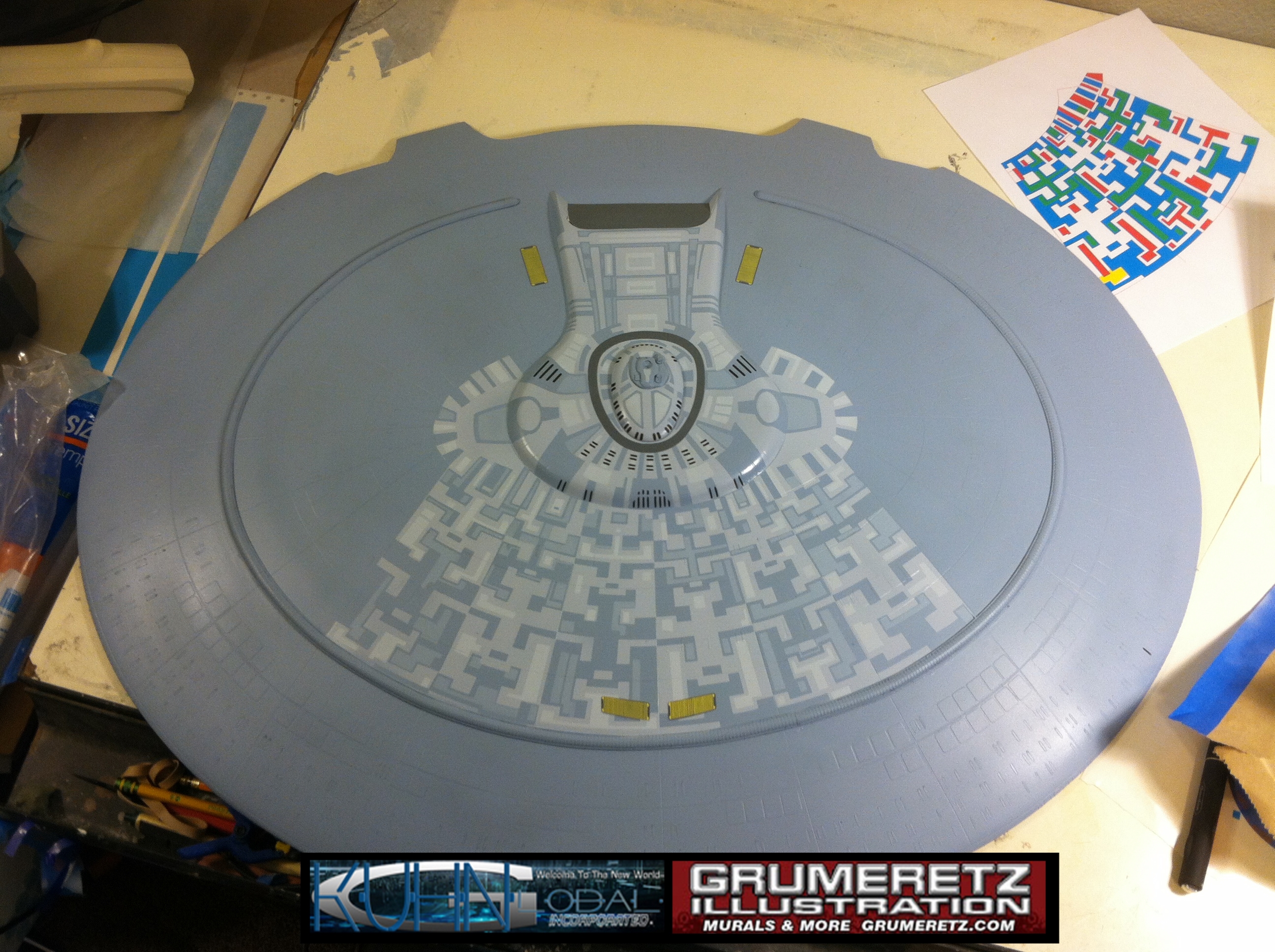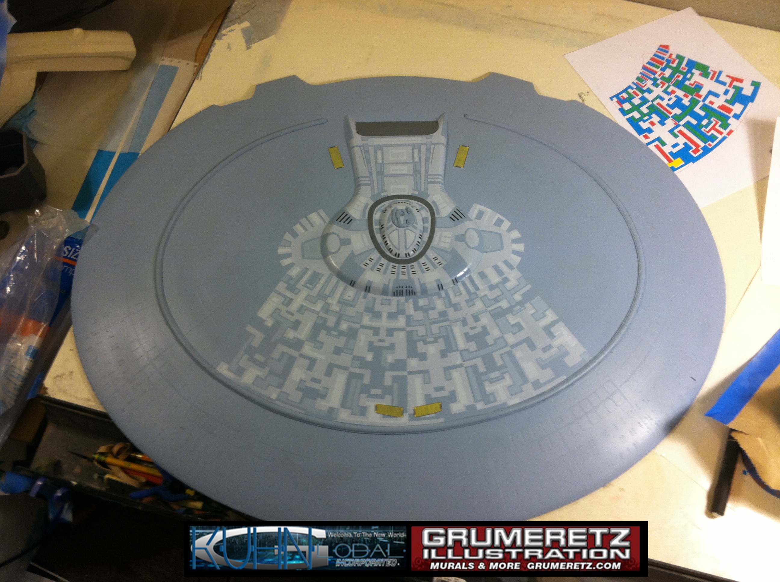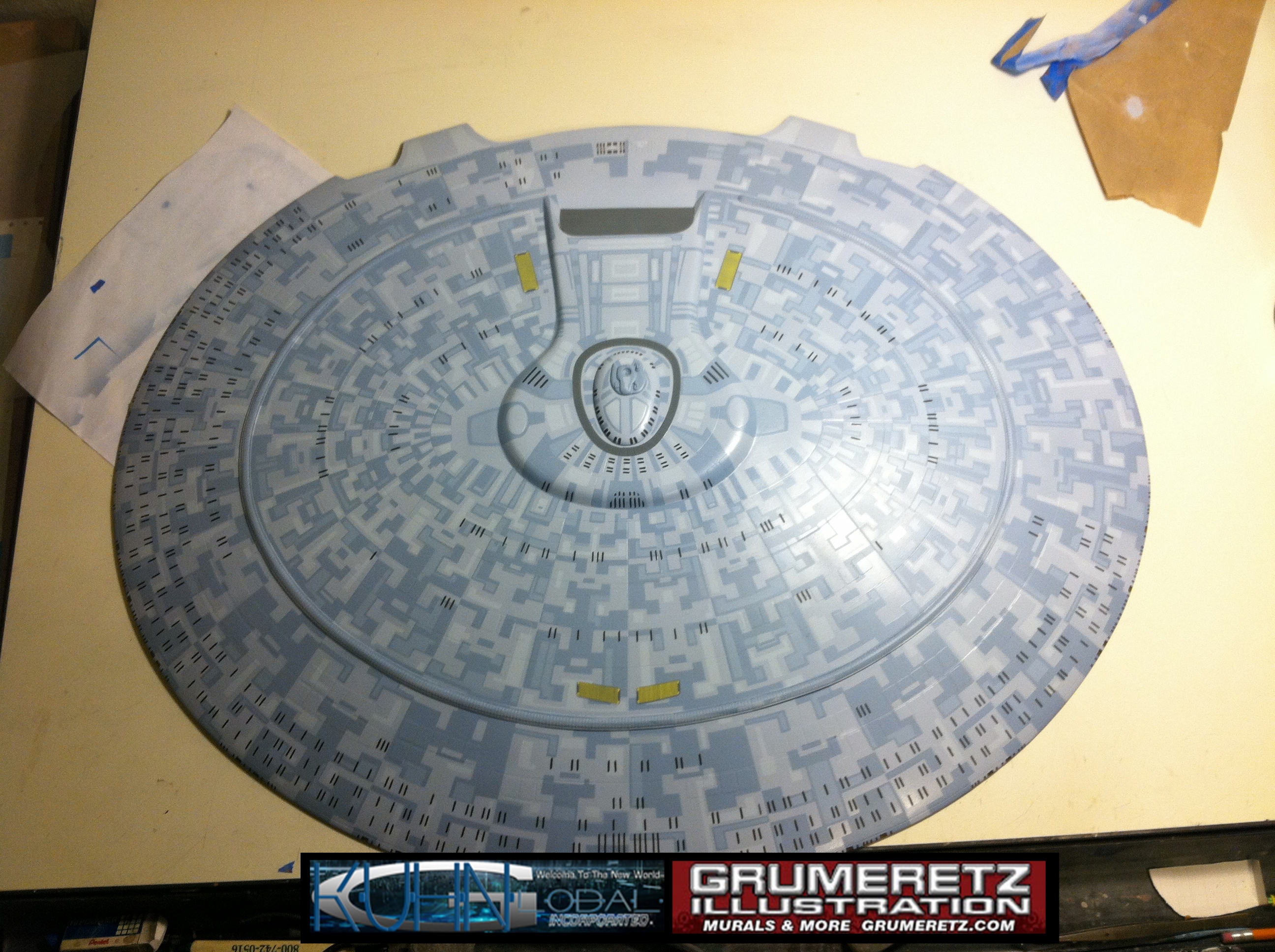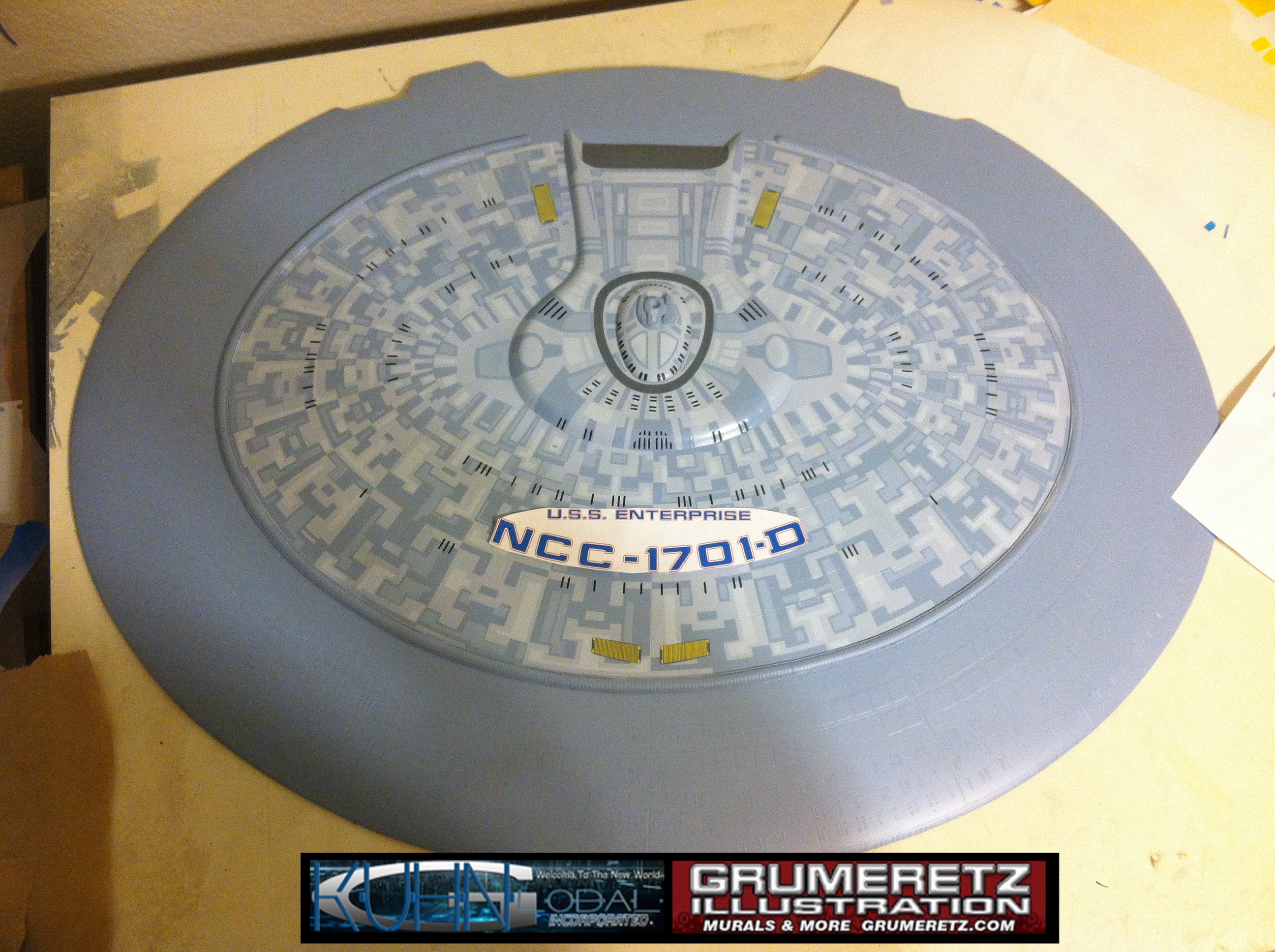 Artist Dan Grumeretz is doing magnificent work on recreating the TNG 6 foot studio model paint job on this 40 inch Enterprise 1701-D. There were differences in this cast from the actual 6 foot studio model of which he worked well with, changing a few cast details, then incorporating the FOUR levels of paint paneling to fit this cast. Dan studied the 6 foot model paint scheme very closely to get these patterns correct. Like I stated, there were minor differences in this cast from the cast configuration of the 6 foot studio model, so he fit it as well as possible to recreate the 6 foot beast in this just under four foot version. Other than the twin red vinyl stripes going down the spine, all you see on this is paint, even the lettered markings…. NO DECALS were used. The paint colors themselves came direct from Rick Sternback. I had purchased the one and only DeAgostini 1:900 (QMX Size) Enterprise 1701-D from him that included the same paint colors as was used on the 6 foot model. So we utilized those same colors for this 40 inch build. That stated, the camera Dan is using to photograph this progress really shows high contrast between the colors used. In person, they are not so pronounced and look much like the 6 foot studio model. With the custom studio stand now at Dan’s shop, still remaining to complete this build is minor clean up, fill in, nacelle ribs, and final lighting test. Once again, Dan is doing amazing work. This project has been a long time coming and I am pleased to see it coming to a close for final display in the collection here. There will be Blue Screen photos when it arrives. We hope you like it!