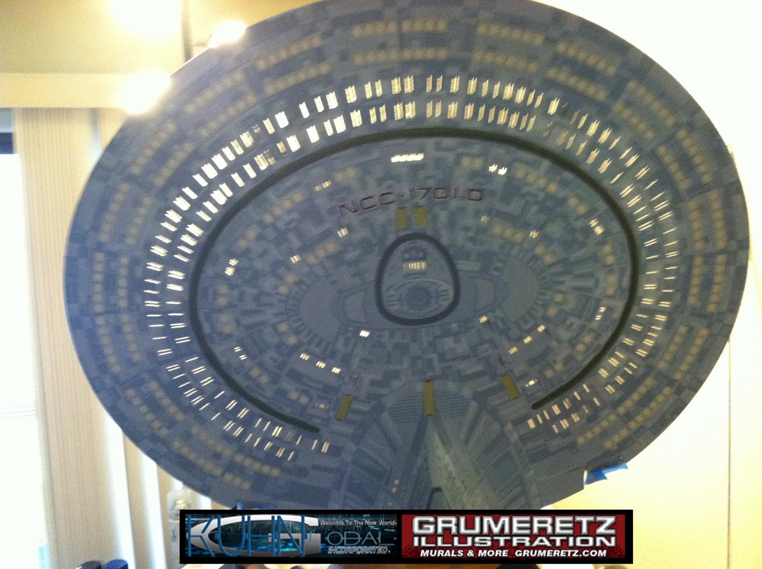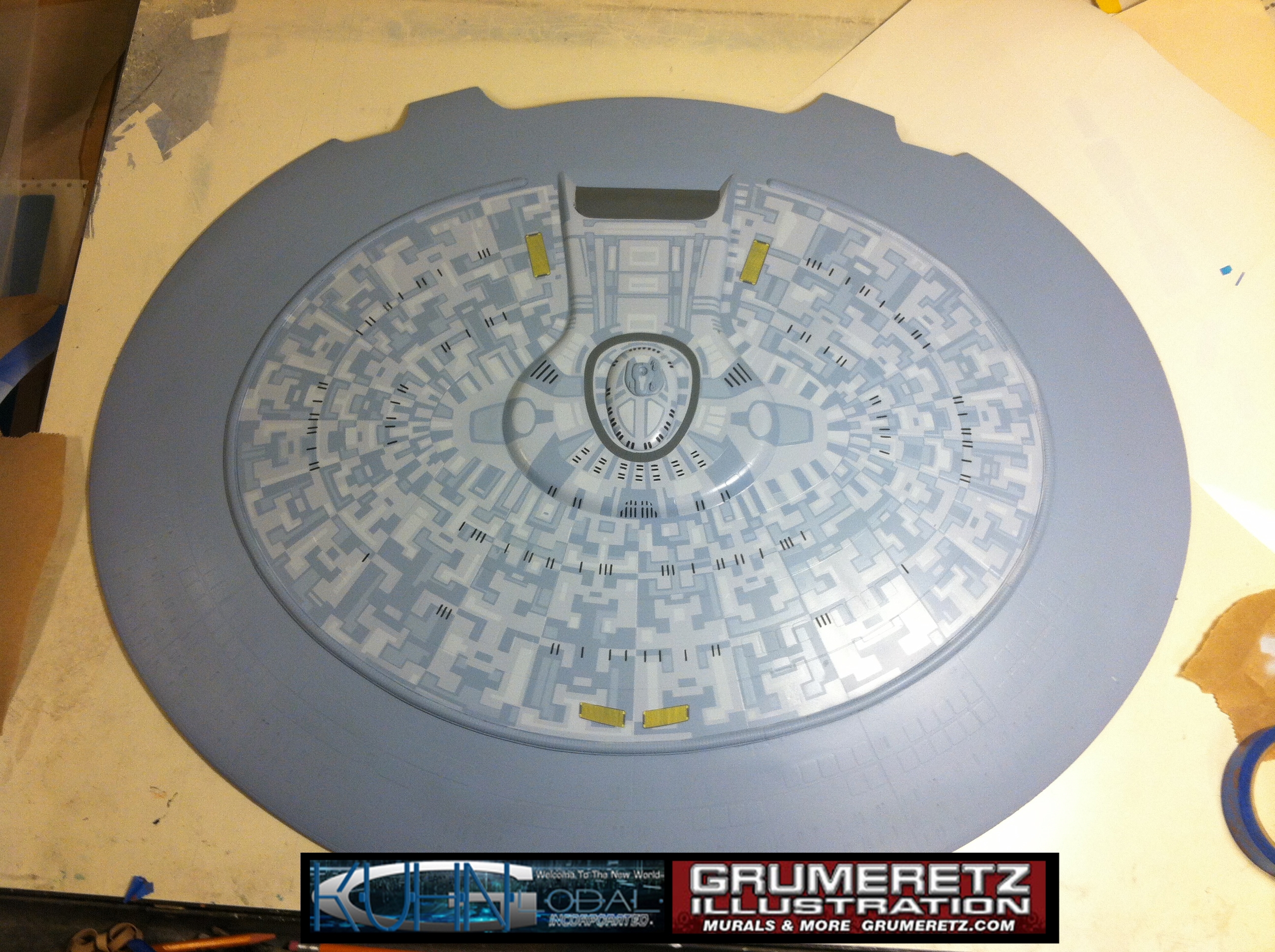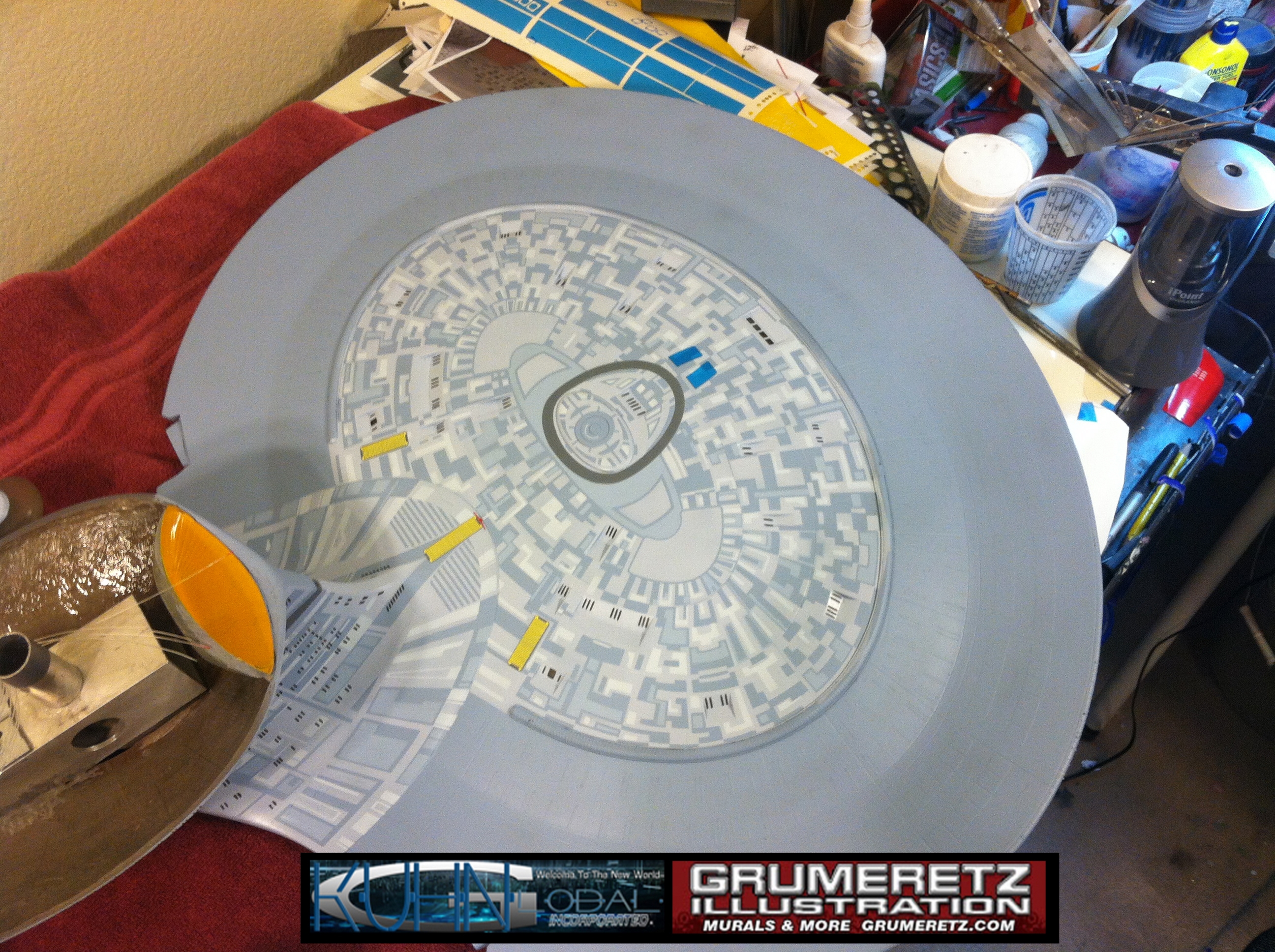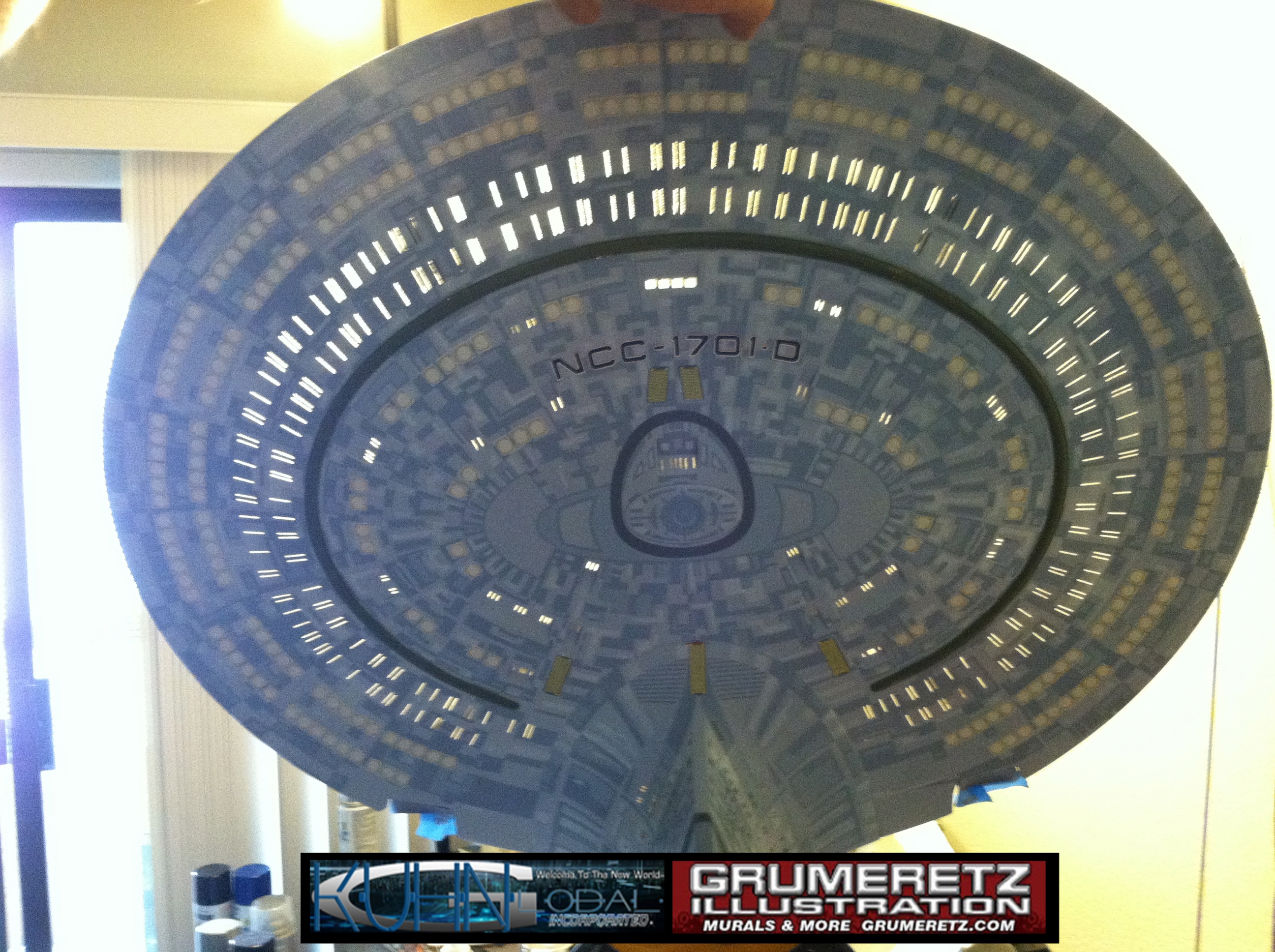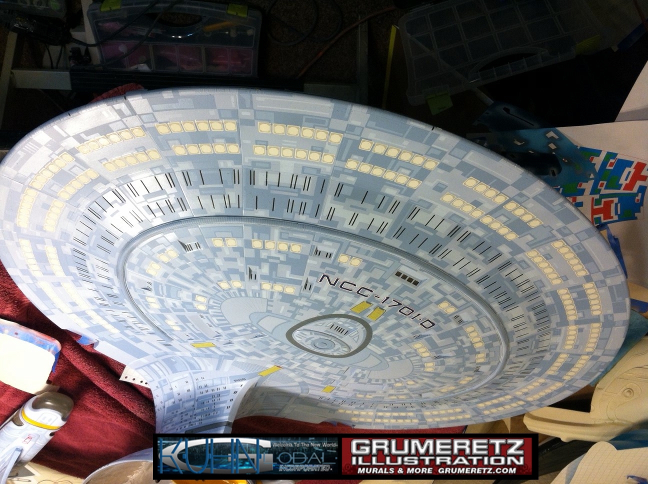 Artist Dan Grumeretz is doing magnificent work on recreating the TNG 6 foot studio model paint job on this 40 inch Enterprise 1701-D. There were differences in this cast from the actual 6 foot studio model of which he worked well with, changing a few cast details, then incorporating the FOUR levels of paint paneling to fit this cast. Dan studied the 6 foot model paint scheme very closely to get these patterns correct. Like I stated, there were minor differences in this cast from the cast configuration of the 6 foot studio model, so he fit it as well as possible to recreate the 6 foot beast in this just under four foot version. Other than the twin red vinyl stripes going down the spine, all you see on this is paint, even the lettered markings…. NO DECALS were used. The paint colors themselves came direct from Rick Sternback. I had purchased the one and only DeAgostini 1:900 (QMX Size) Enterprise 1701-D from him that included the same paint colors as was used on the 6 foot model. So we utilized those same colors for this 40 inch build. That stated, the camera Dan is using to photograph this progress really shows high contrast between the colors used. In person, they are not so pronounced and look much like the 6 foot studio model. With the custom studio stand now at Dan’s shop, still remaining to complete this build is minor clean up, fill in, nacelle ribs, and final lighting test. Once again, Dan is doing amazing work. This project has been a long time coming and I am pleased to see it coming to a close for final display in the collection here. There will be Blue Screen photos when it arrives. We hope you like it!