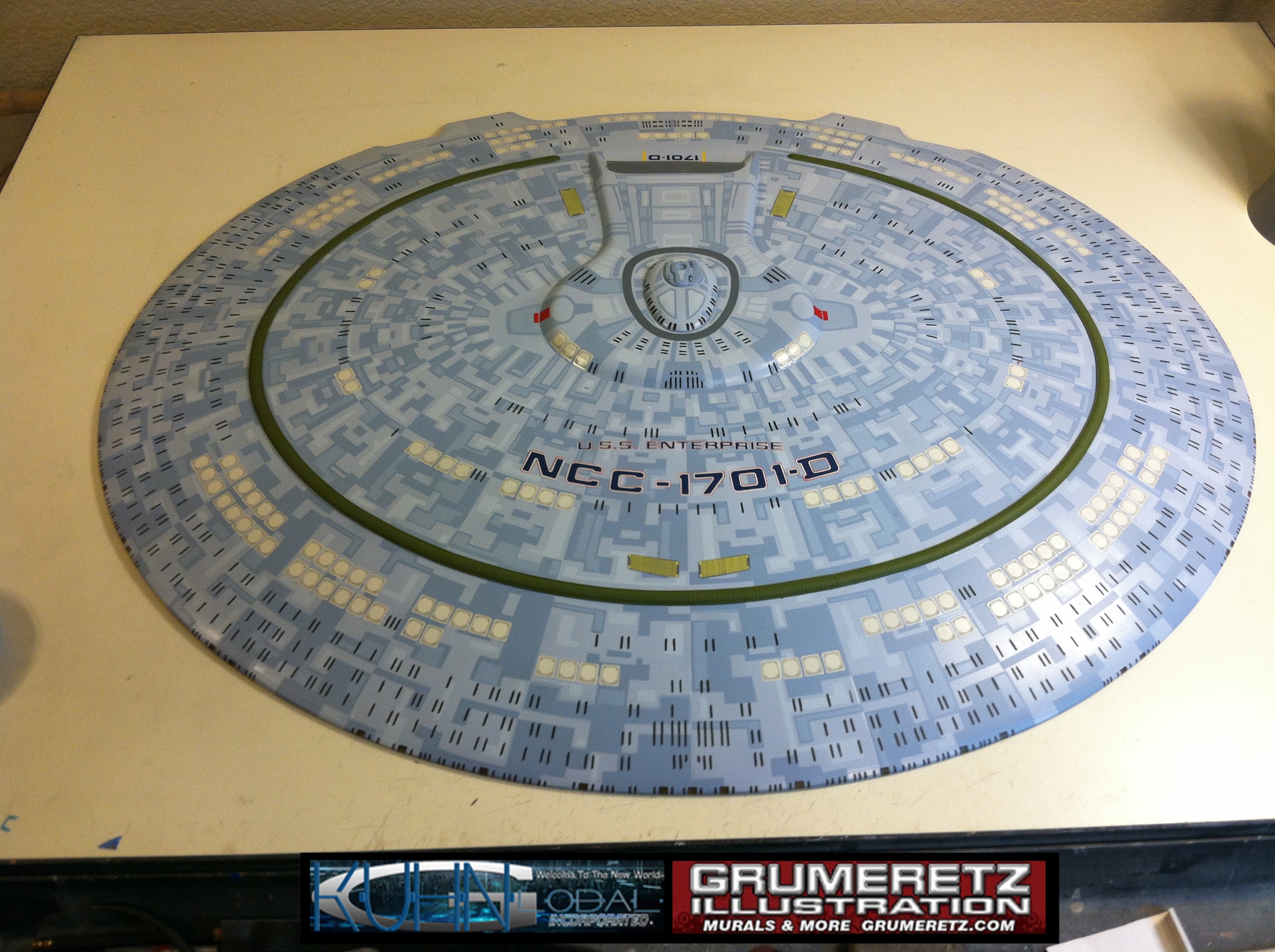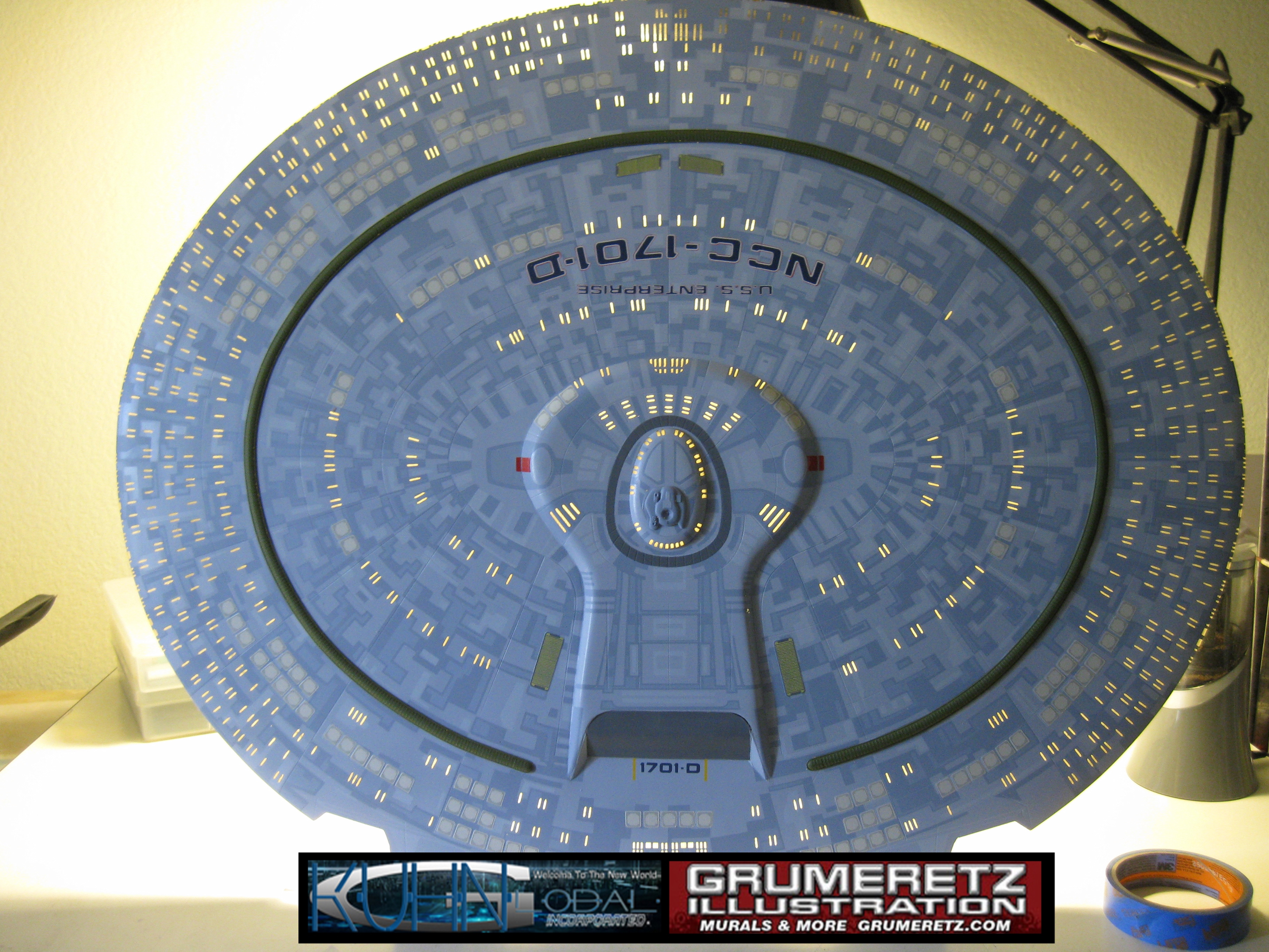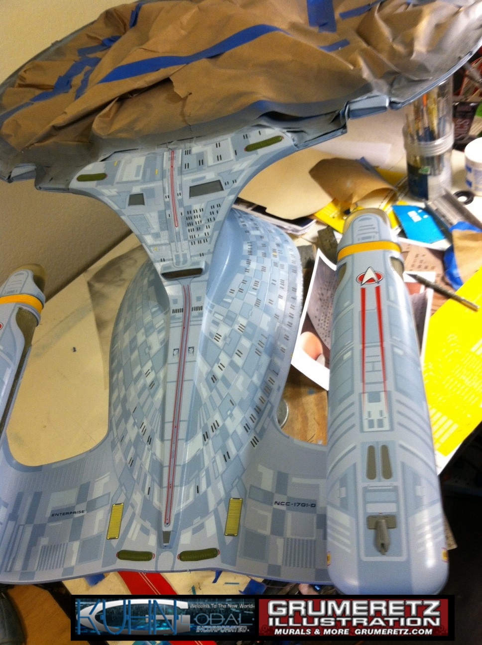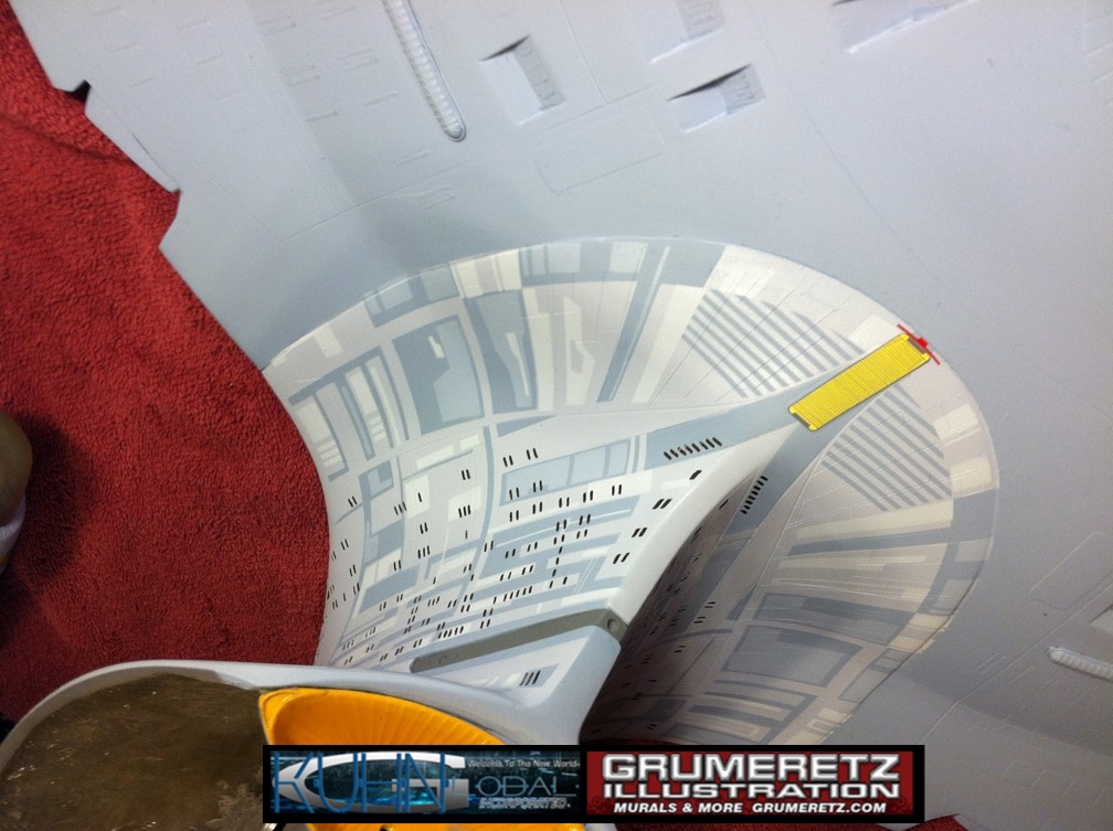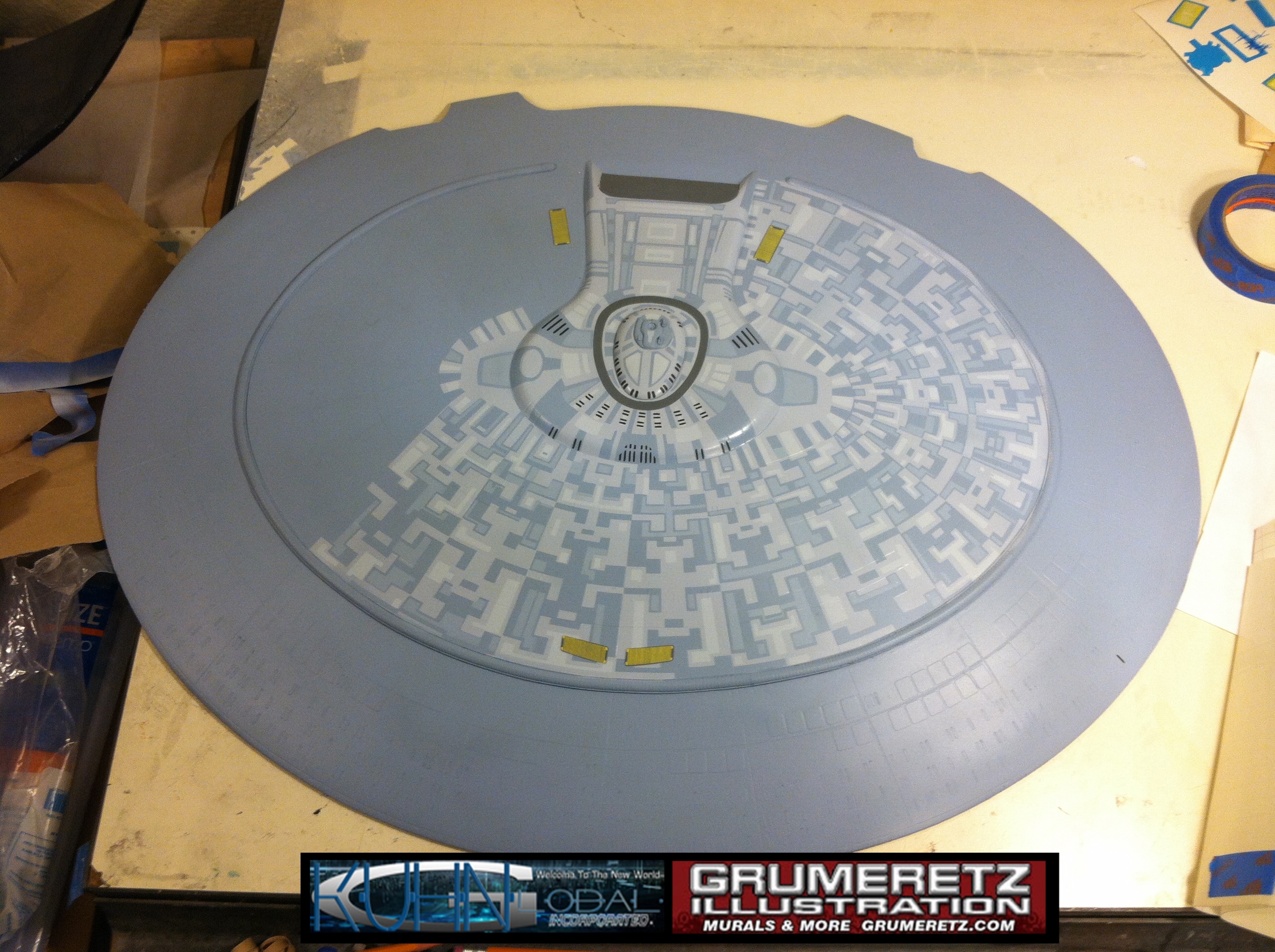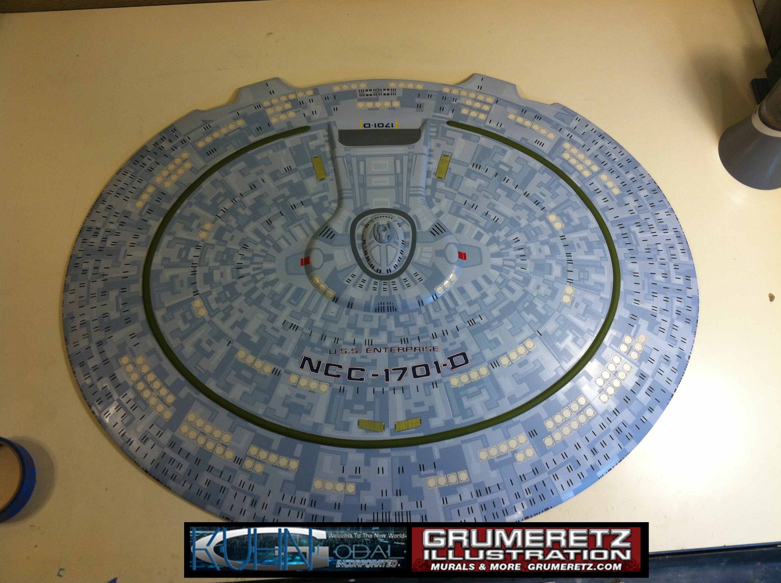 Artist Dan Grumeretz is doing magnificent work on recreating the TNG 6 foot studio model paint job on this 40 inch Enterprise 1701-D. There were differences in this cast from the actual 6 foot studio model of which he worked well with, changing a few cast details, then incorporating the FOUR levels of paint paneling to fit this cast. Dan studied the 6 foot model paint scheme very closely to get these patterns correct. Like I stated, there were minor differences in this cast from the cast configuration of the 6 foot studio model, so he fit it as well as possible to recreate the 6 foot beast in this just under four foot version. Other than the twin red vinyl stripes going down the spine, all you see on this is paint, even the lettered markings…. NO DECALS were used. The paint colors themselves came direct from Rick Sternback. I had purchased the one and only DeAgostini 1:900 (QMX Size) Enterprise 1701-D from him that included the same paint colors as was used on the 6 foot model. So we utilized those same colors for this 40 inch build. That stated, the camera Dan is using to photograph this progress really shows high contrast between the colors used. In person, they are not so pronounced and look much like the 6 foot studio model. With the custom studio stand now at Dan’s shop, still remaining to complete this build is minor clean up, fill in, nacelle ribs, and final lighting test. Once again, Dan is doing amazing work. This project has been a long time coming and I am pleased to see it coming to a close for final display in the collection here. There will be Blue Screen photos when it arrives. We hope you like it!