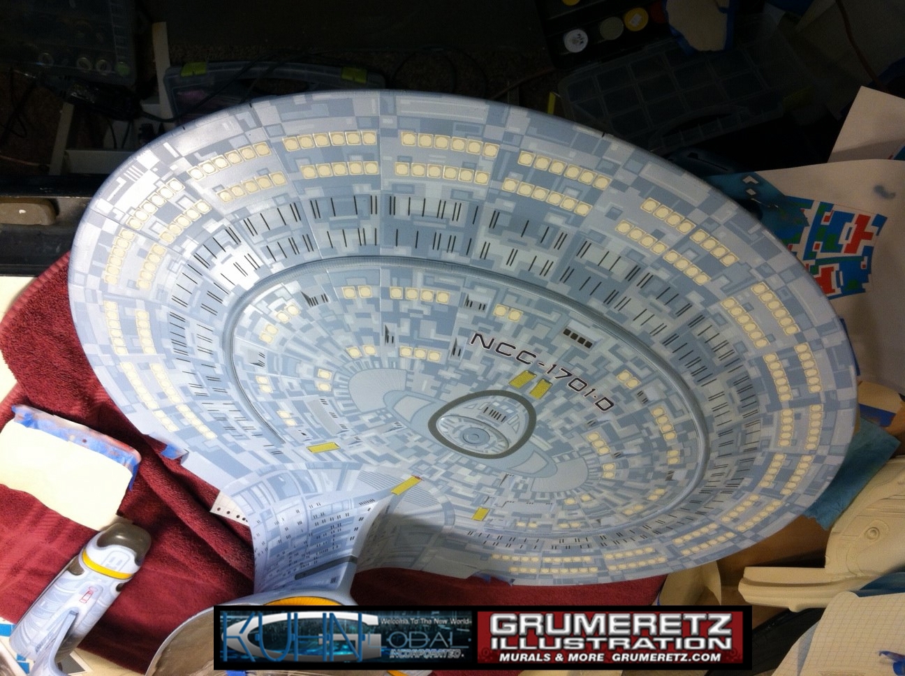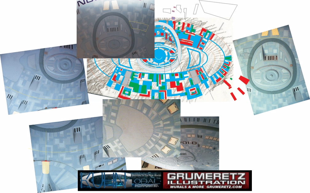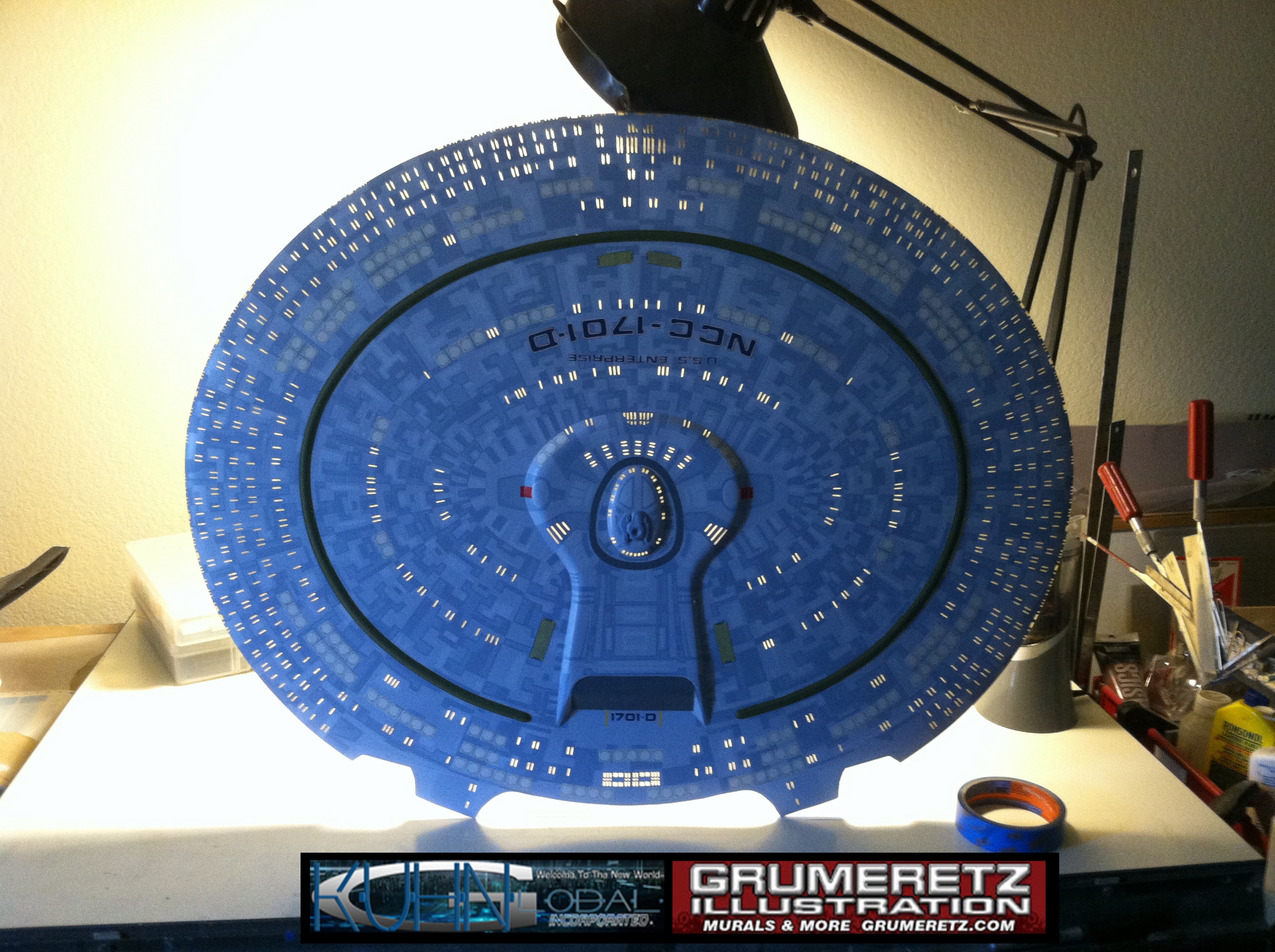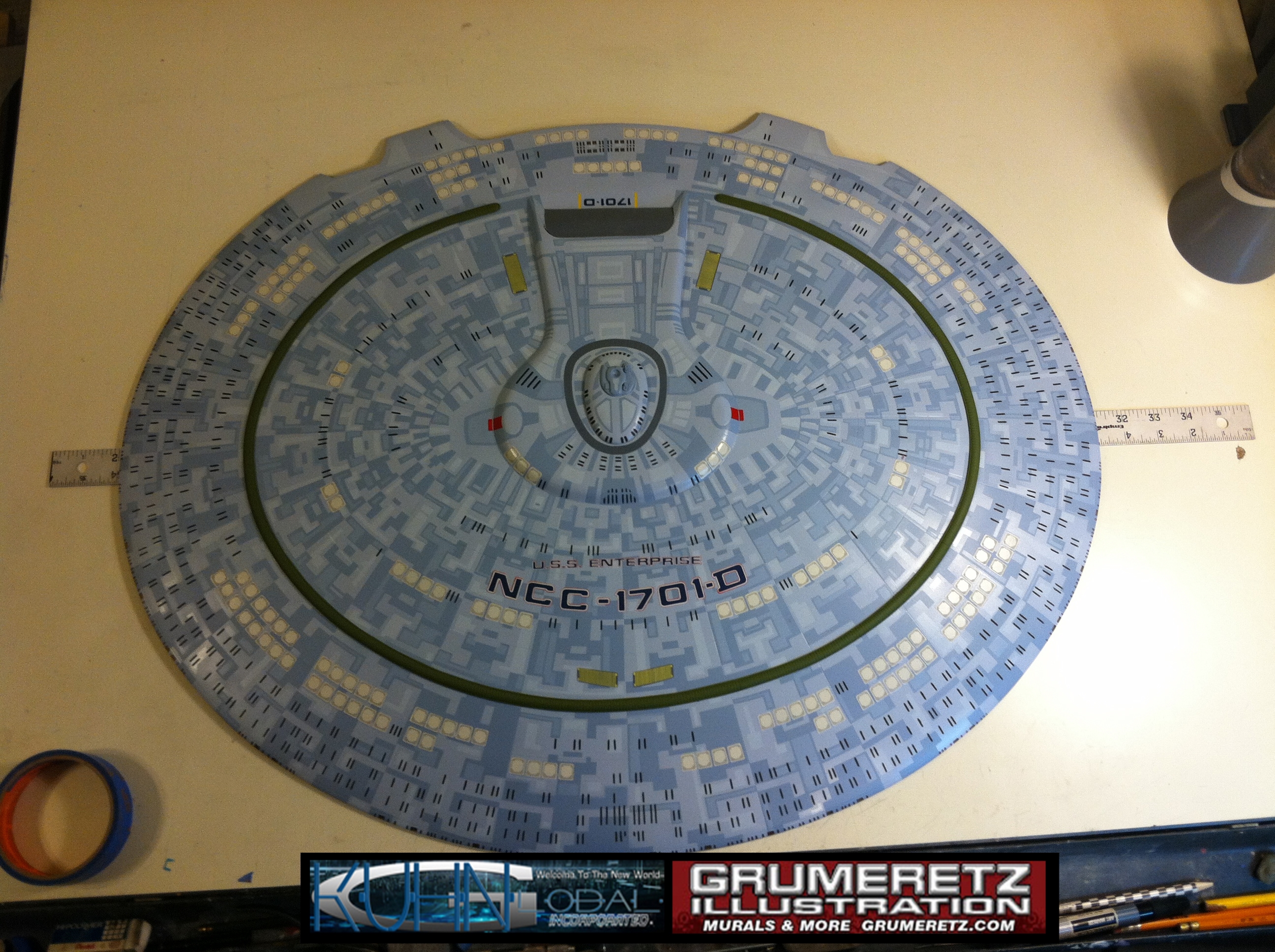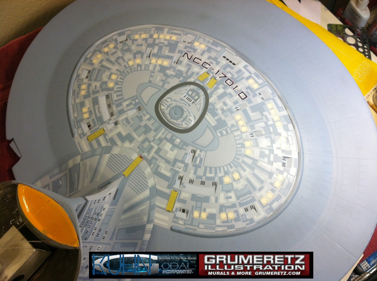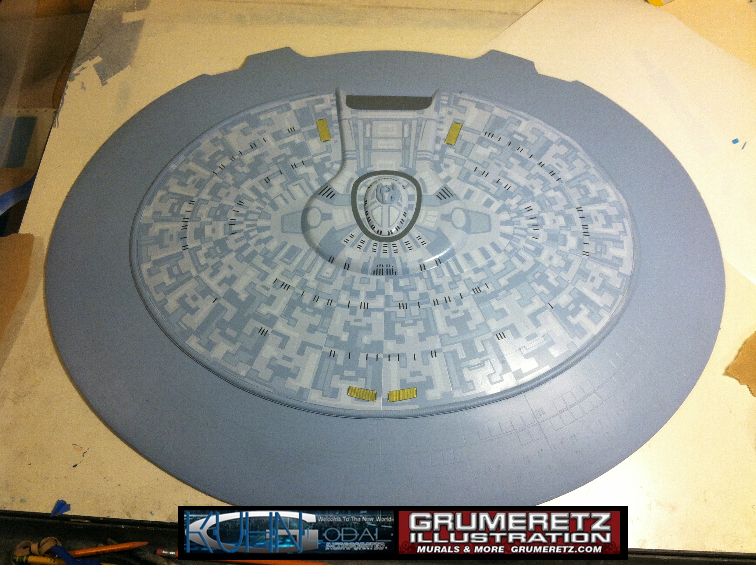 Artist Dan Grumeretz is doing magnificent work on recreating the TNG 6 foot studio model paint job on this 40 inch Enterprise 1701-D. There were differences in this cast from the actual 6 foot studio model of which he worked well with, changing a few cast details, then incorporating the FOUR levels of paint paneling to fit this cast. Dan studied the 6 foot model paint scheme very closely to get these patterns correct. Like I stated, there were minor differences in this cast from the cast configuration of the 6 foot studio model, so he fit it as well as possible to recreate the 6 foot beast in this just under four foot version. Other than the twin red vinyl stripes going down the spine, all you see on this is paint, even the lettered markings…. NO DECALS were used. The paint colors themselves came direct from Rick Sternback. I had purchased the one and only DeAgostini 1:900 (QMX Size) Enterprise 1701-D from him that included the same paint colors as was used on the 6 foot model. So we utilized those same colors for this 40 inch build. That stated, the camera Dan is using to photograph this progress really shows high contrast between the colors used. In person, they are not so pronounced and look much like the 6 foot studio model. With the custom studio stand now at Dan’s shop, still remaining to complete this build is minor clean up, fill in, nacelle ribs, and final lighting test. Once again, Dan is doing amazing work. This project has been a long time coming and I am pleased to see it coming to a close for final display in the collection here. There will be Blue Screen photos when it arrives. We hope you like it!