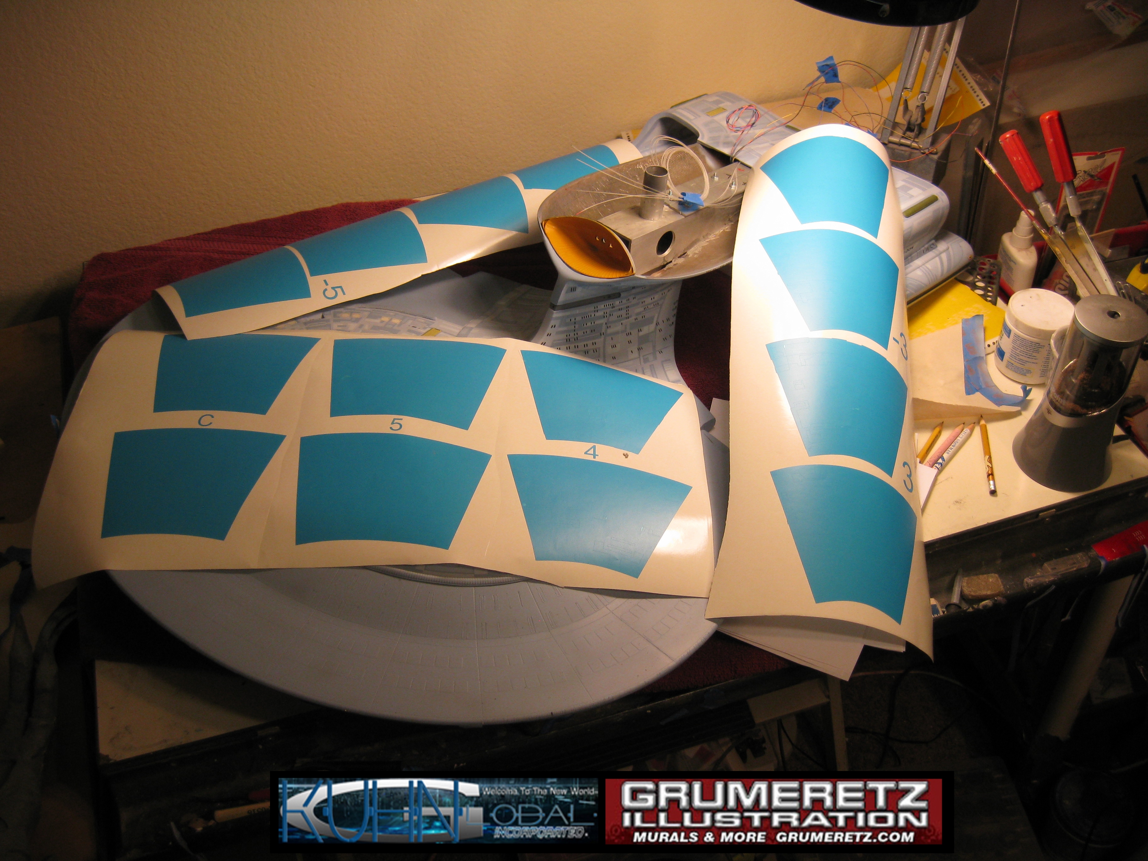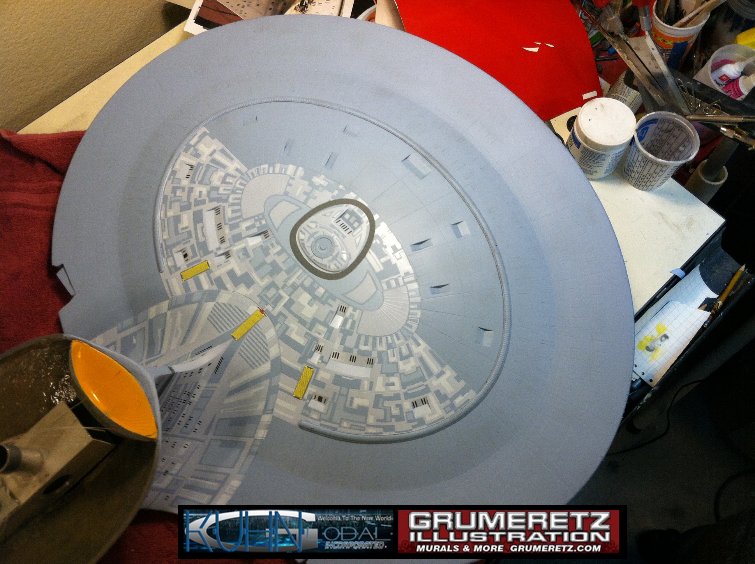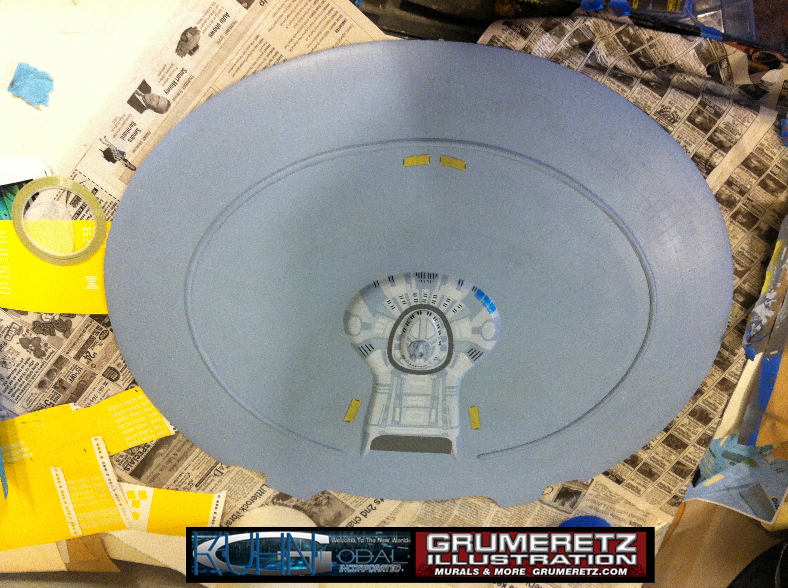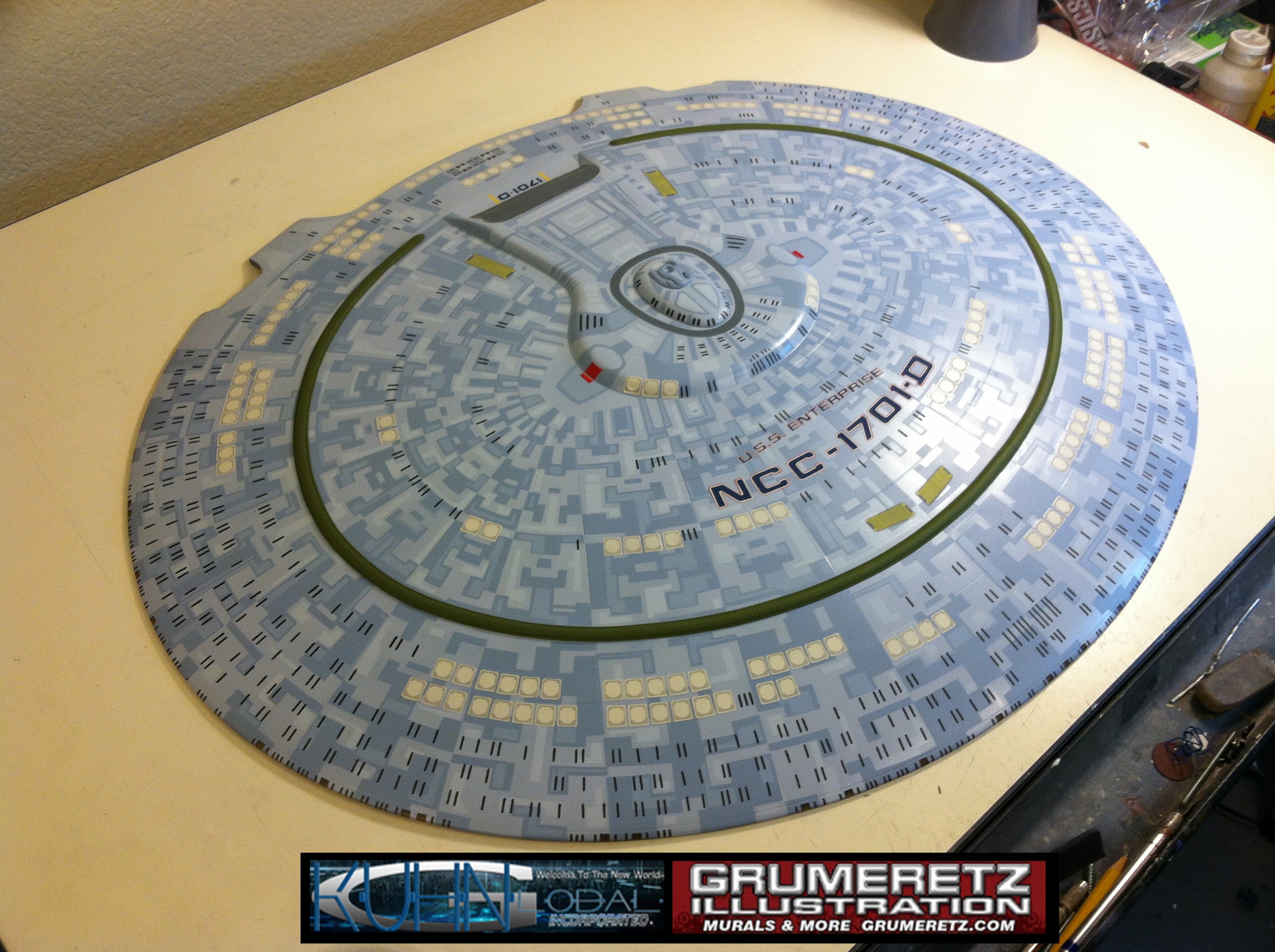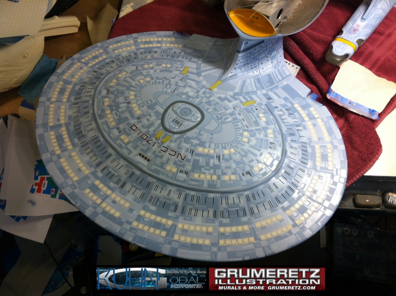 Artist Dan Grumeretz is doing magnificent work on recreating the TNG 6 foot studio model paint job on this 40 inch Enterprise 1701-D. There were differences in this cast from the actual 6 foot studio model of which he worked well with, changing a few cast details, then incorporating the FOUR levels of paint paneling to fit this cast. Dan studied the 6 foot model paint scheme very closely to get these patterns correct. Like I stated, there were minor differences in this cast from the cast configuration of the 6 foot studio model, so he fit it as well as possible to recreate the 6 foot beast in this just under four foot version. Other than the twin red vinyl stripes going down the spine, all you see on this is paint, even the lettered markings…. NO DECALS were used. The paint colors themselves came direct from Rick Sternback. I had purchased the one and only DeAgostini 1:900 (QMX Size) Enterprise 1701-D from him that included the same paint colors as was used on the 6 foot model. So we utilized those same colors for this 40 inch build. That stated, the camera Dan is using to photograph this progress really shows high contrast between the colors used. In person, they are not so pronounced and look much like the 6 foot studio model. With the custom studio stand now at Dan’s shop, still remaining to complete this build is minor clean up, fill in, nacelle ribs, and final lighting test. Once again, Dan is doing amazing work. This project has been a long time coming and I am pleased to see it coming to a close for final display in the collection here. There will be Blue Screen photos when it arrives. We hope you like it!