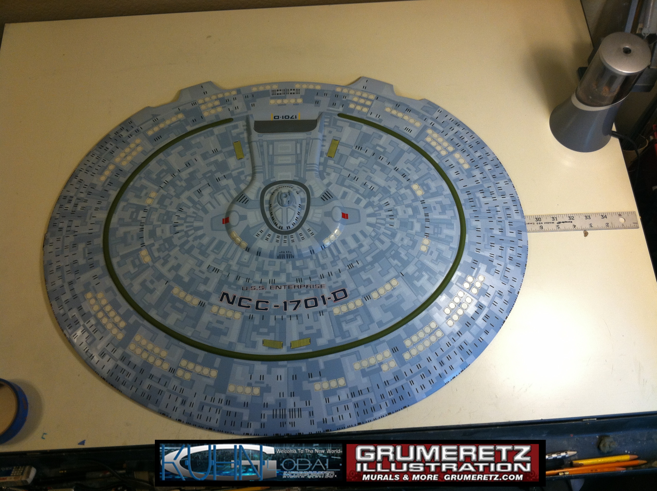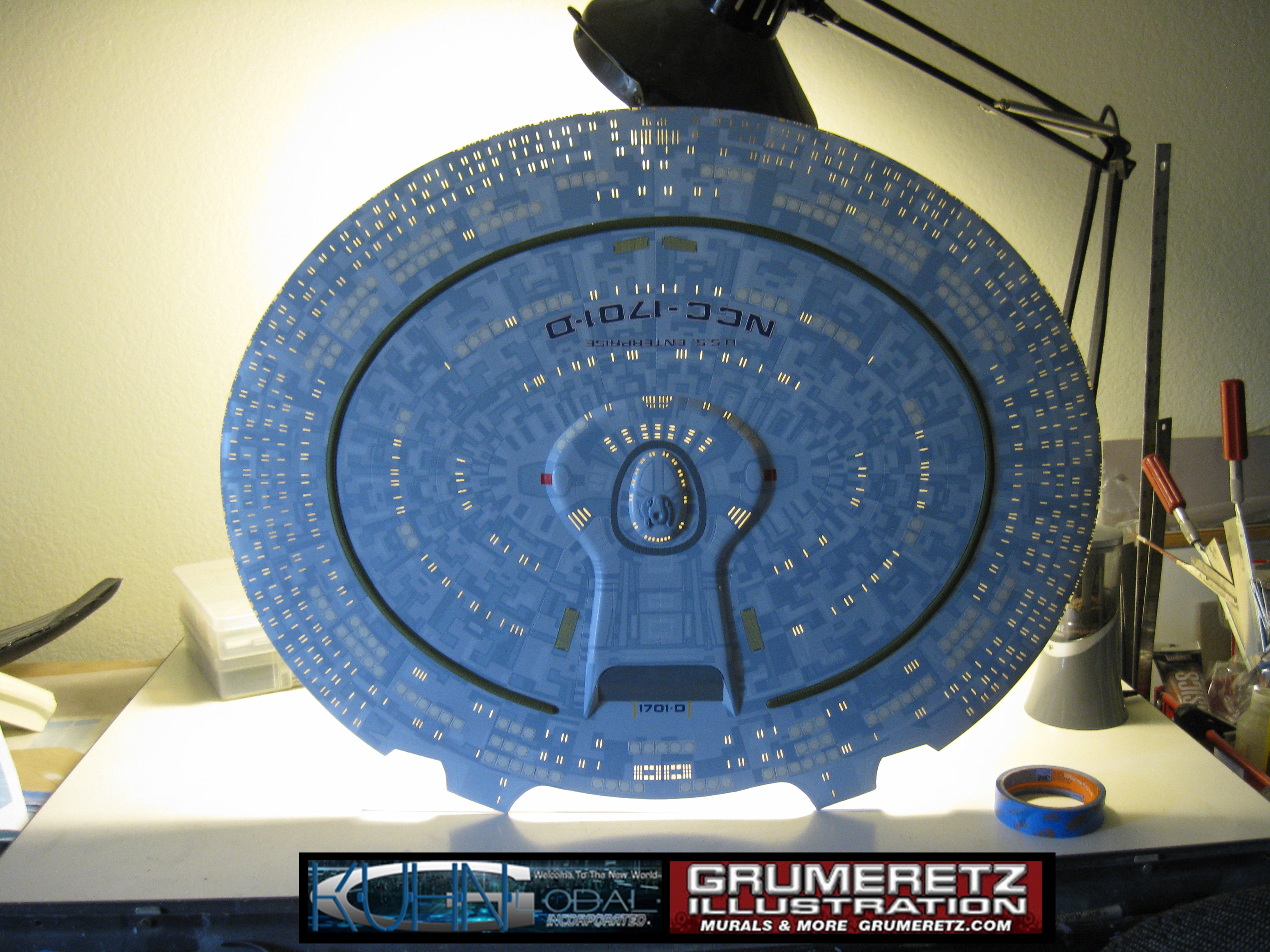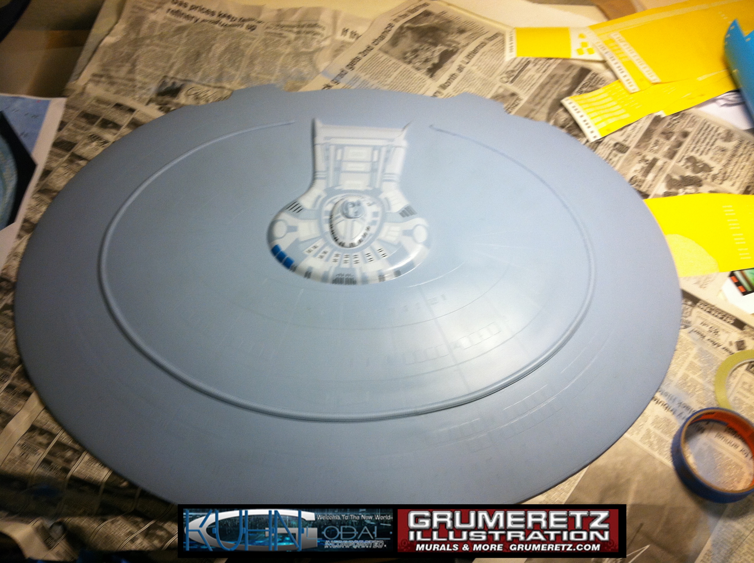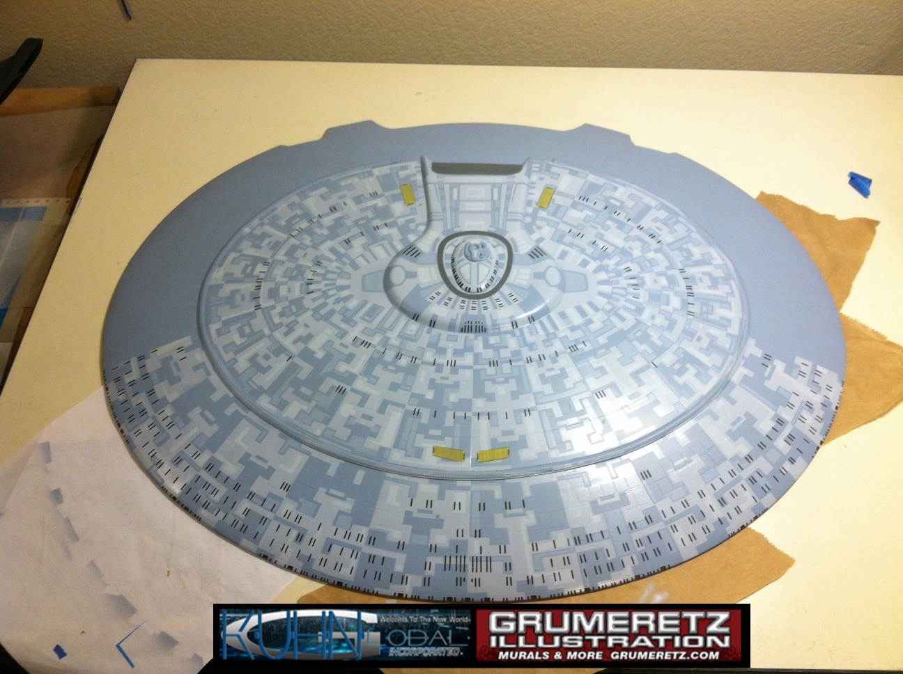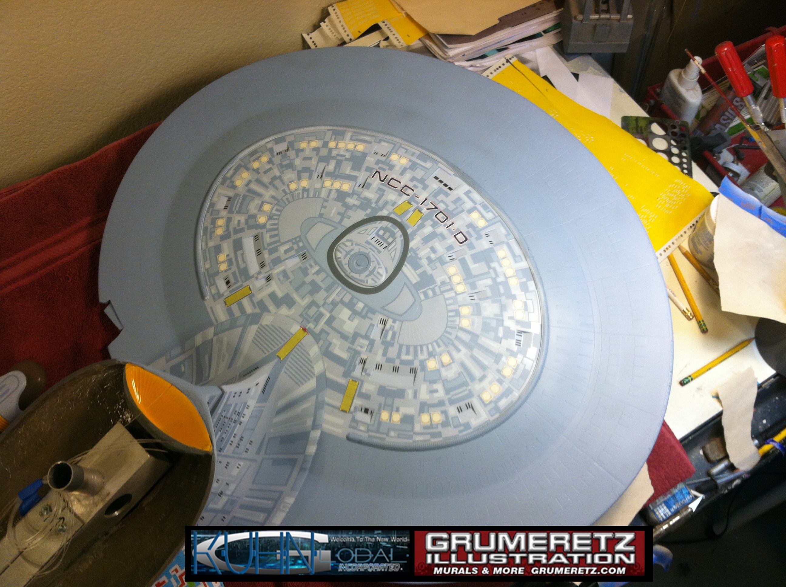 Artist Dan Grumeretz is doing magnificent work on recreating the TNG 6 foot studio model paint job on this 40 inch Enterprise 1701-D. There were differences in this cast from the actual 6 foot studio model of which he worked well with, changing a few cast details, then incorporating the FOUR levels of paint paneling to fit this cast. Dan studied the 6 foot model paint scheme very closely to get these patterns correct. Like I stated, there were minor differences in this cast from the cast configuration of the 6 foot studio model, so he fit it as well as possible to recreate the 6 foot beast in this just under four foot version. Other than the twin red vinyl stripes going down the spine, all you see on this is paint, even the lettered markings…. NO DECALS were used. The paint colors themselves came direct from Rick Sternback. I had purchased the one and only DeAgostini 1:900 (QMX Size) Enterprise 1701-D from him that included the same paint colors as was used on the 6 foot model. So we utilized those same colors for this 40 inch build. That stated, the camera Dan is using to photograph this progress really shows high contrast between the colors used. In person, they are not so pronounced and look much like the 6 foot studio model. With the custom studio stand now at Dan’s shop, still remaining to complete this build is minor clean up, fill in, nacelle ribs, and final lighting test. Once again, Dan is doing amazing work. This project has been a long time coming and I am pleased to see it coming to a close for final display in the collection here. There will be Blue Screen photos when it arrives. We hope you like it!