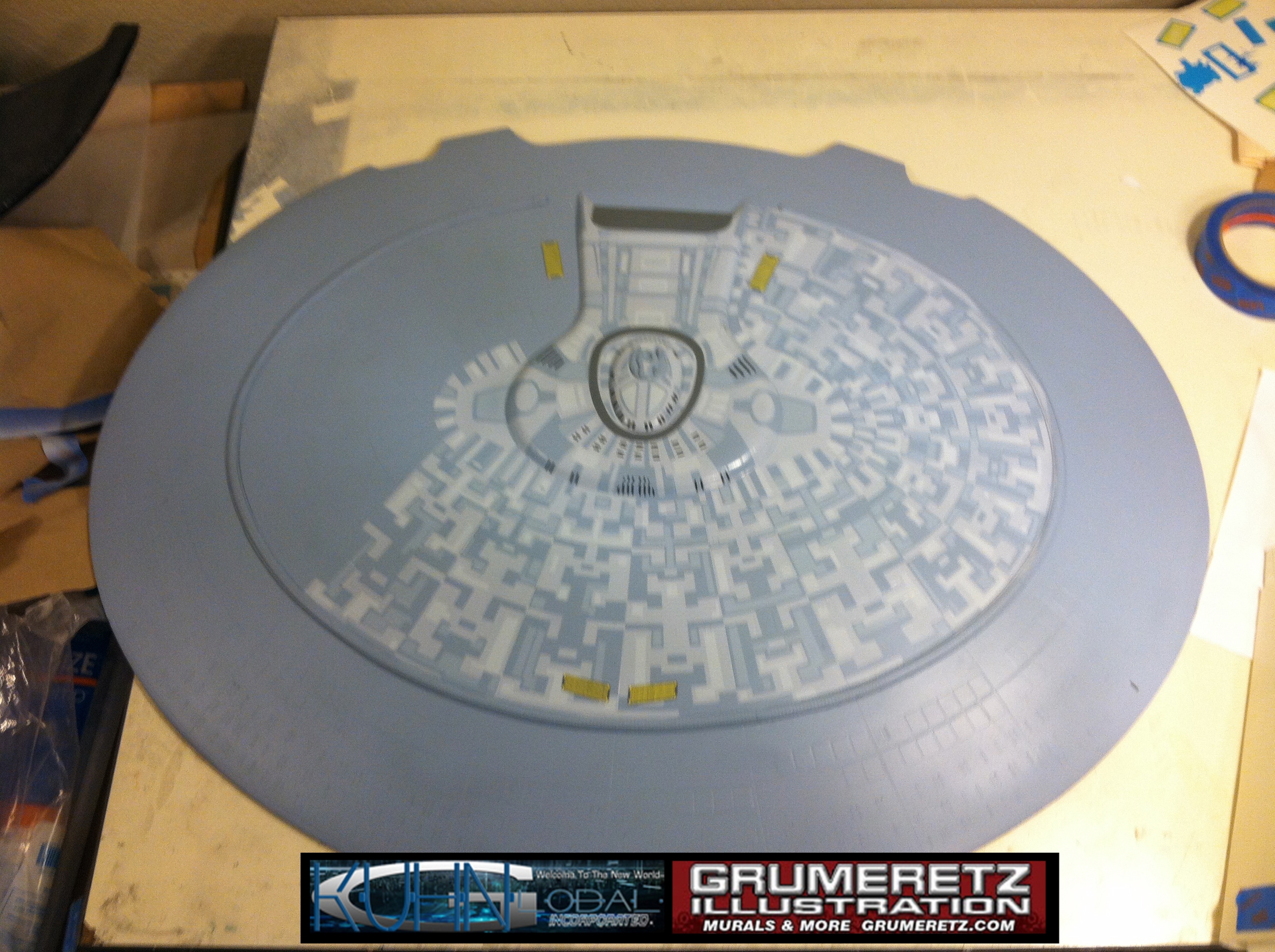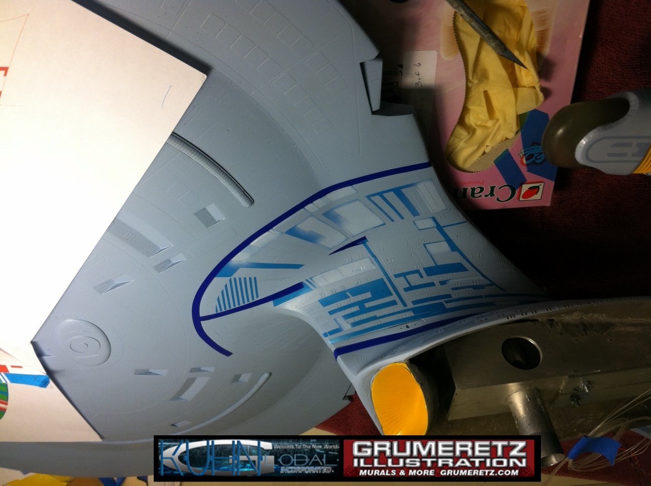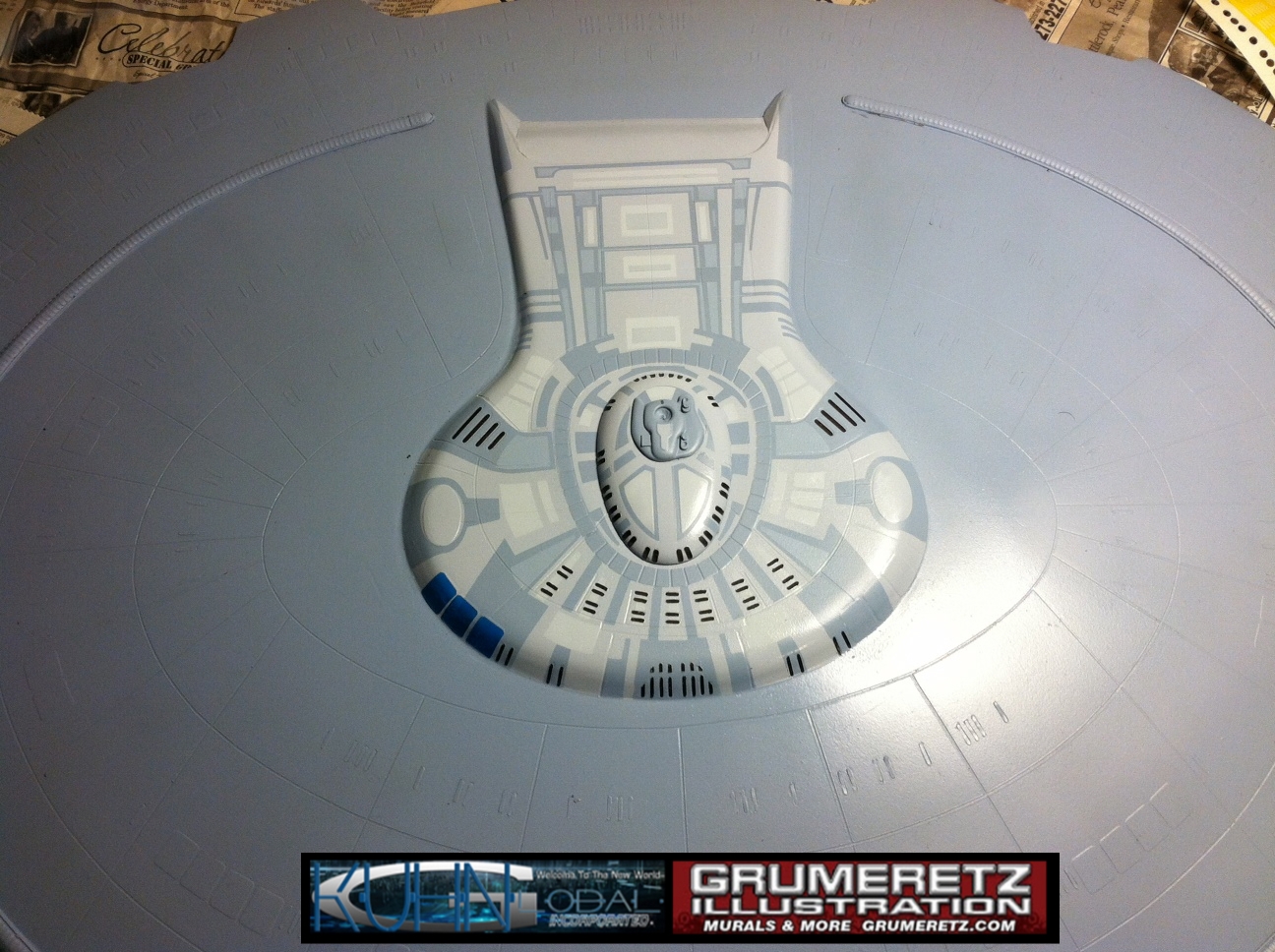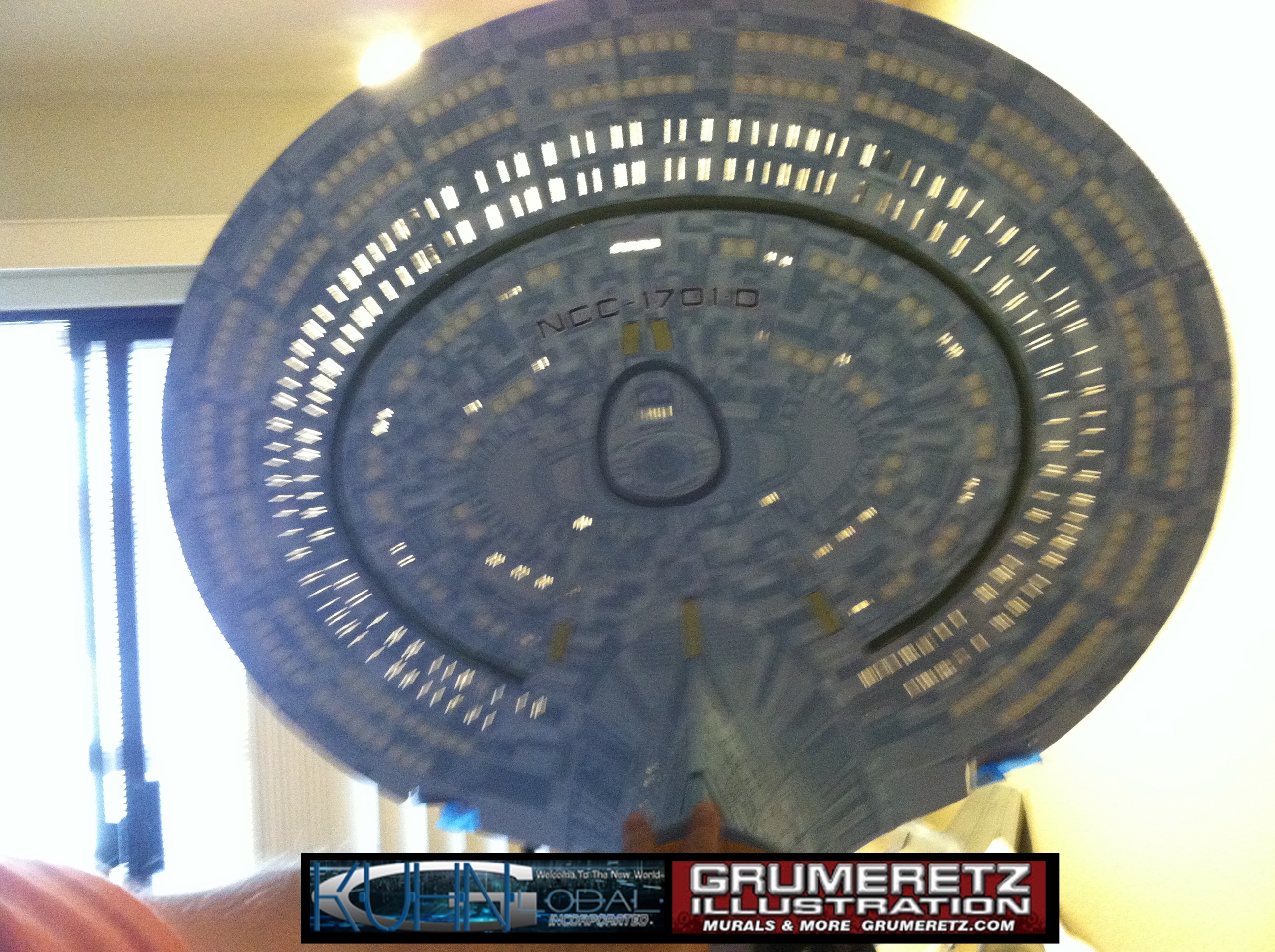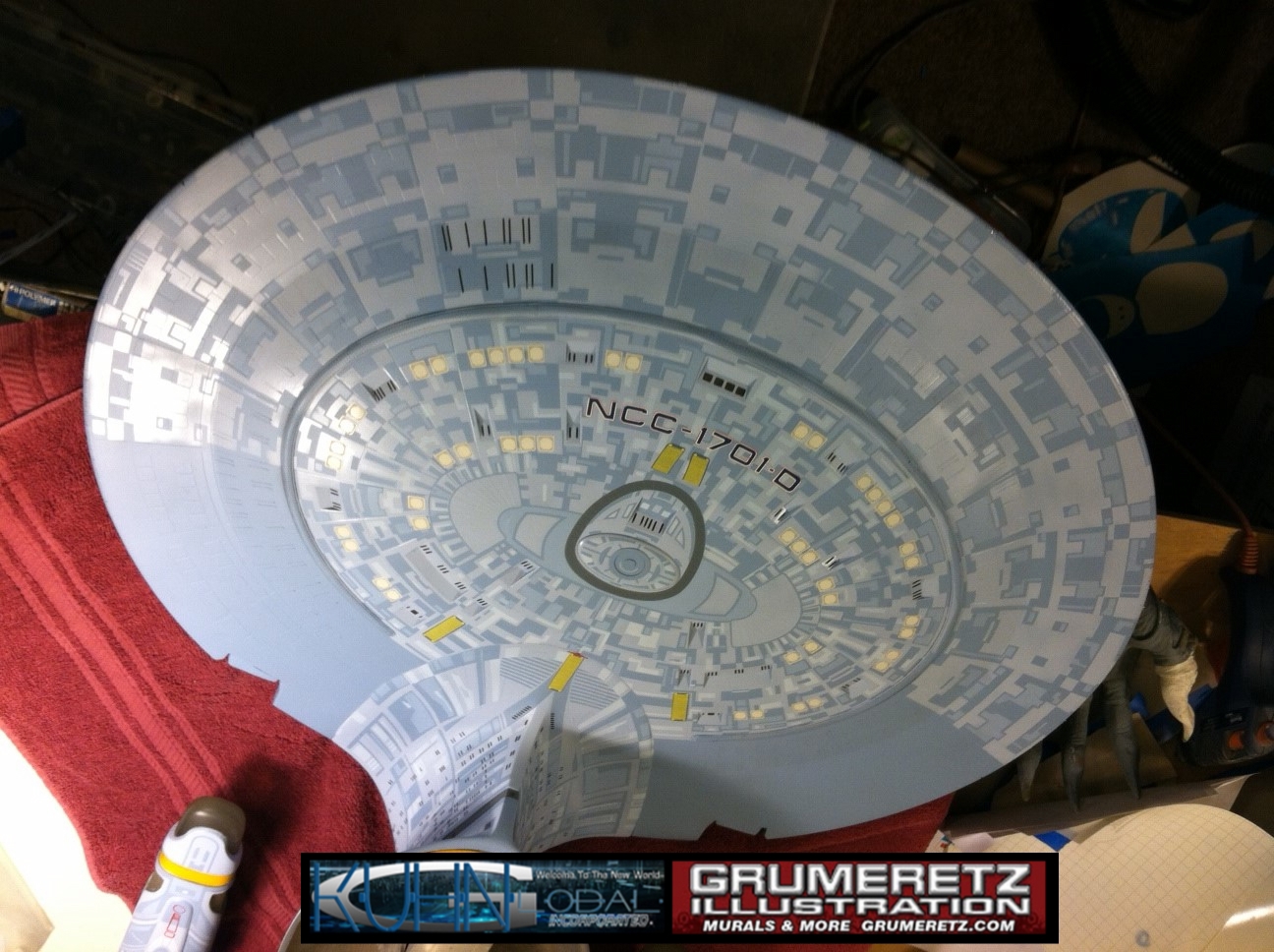 Artist Dan Grumeretz is doing magnificent work on recreating the TNG 6 foot studio model paint job on this 40 inch Enterprise 1701-D. There were differences in this cast from the actual 6 foot studio model of which he worked well with, changing a few cast details, then incorporating the FOUR levels of paint paneling to fit this cast. Dan studied the 6 foot model paint scheme very closely to get these patterns correct. Like I stated, there were minor differences in this cast from the cast configuration of the 6 foot studio model, so he fit it as well as possible to recreate the 6 foot beast in this just under four foot version. Other than the twin red vinyl stripes going down the spine, all you see on this is paint, even the lettered markings…. NO DECALS were used. The paint colors themselves came direct from Rick Sternback. I had purchased the one and only DeAgostini 1:900 (QMX Size) Enterprise 1701-D from him that included the same paint colors as was used on the 6 foot model. So we utilized those same colors for this 40 inch build. That stated, the camera Dan is using to photograph this progress really shows high contrast between the colors used. In person, they are not so pronounced and look much like the 6 foot studio model. With the custom studio stand now at Dan’s shop, still remaining to complete this build is minor clean up, fill in, nacelle ribs, and final lighting test. Once again, Dan is doing amazing work. This project has been a long time coming and I am pleased to see it coming to a close for final display in the collection here. There will be Blue Screen photos when it arrives. We hope you like it!