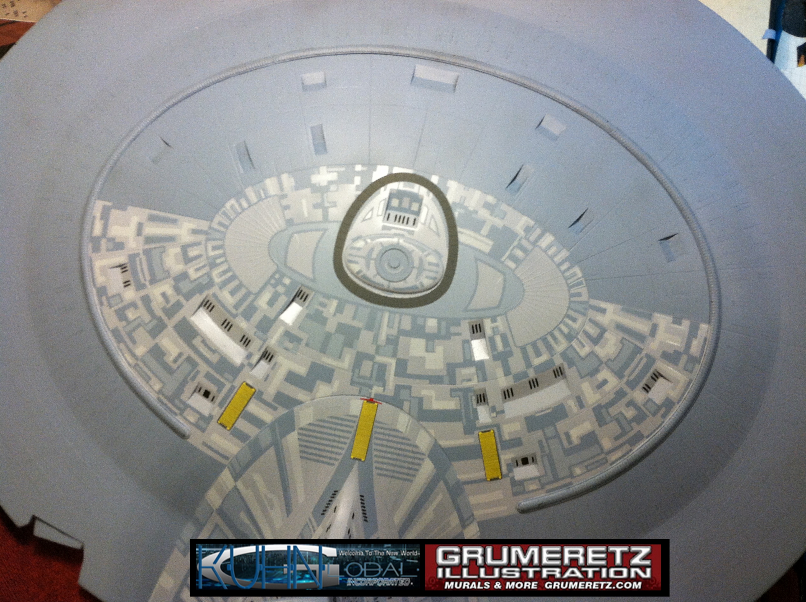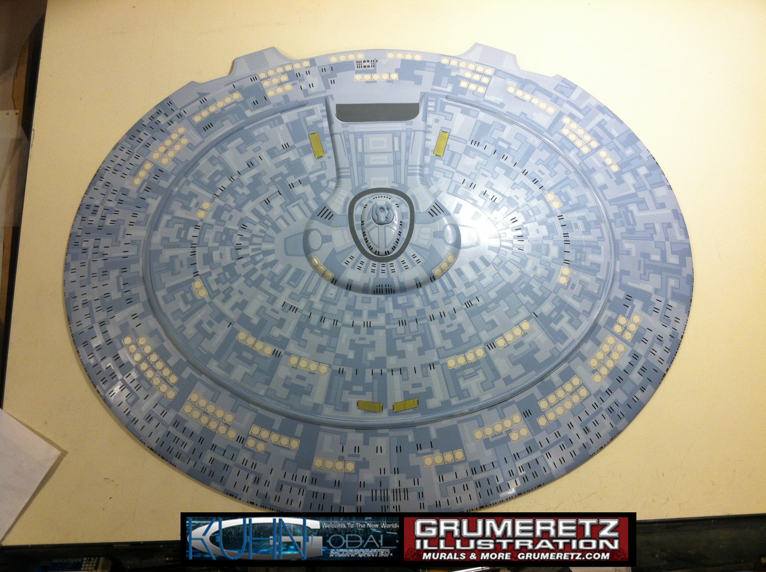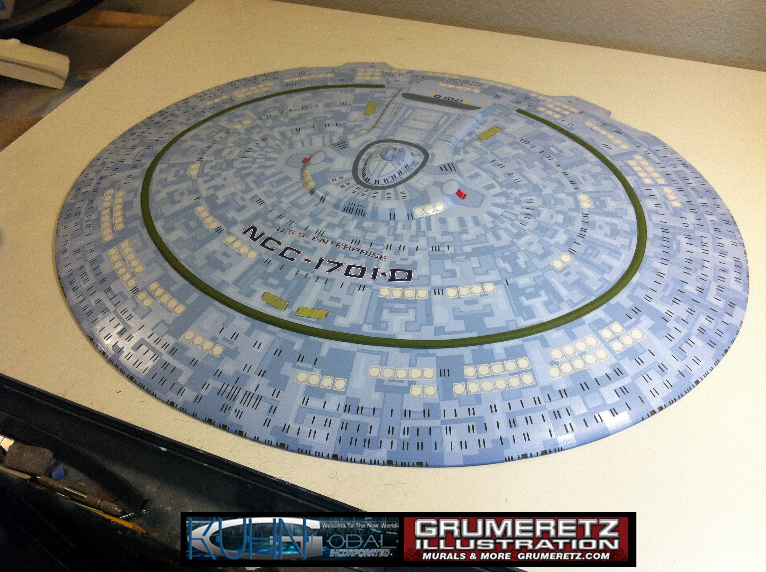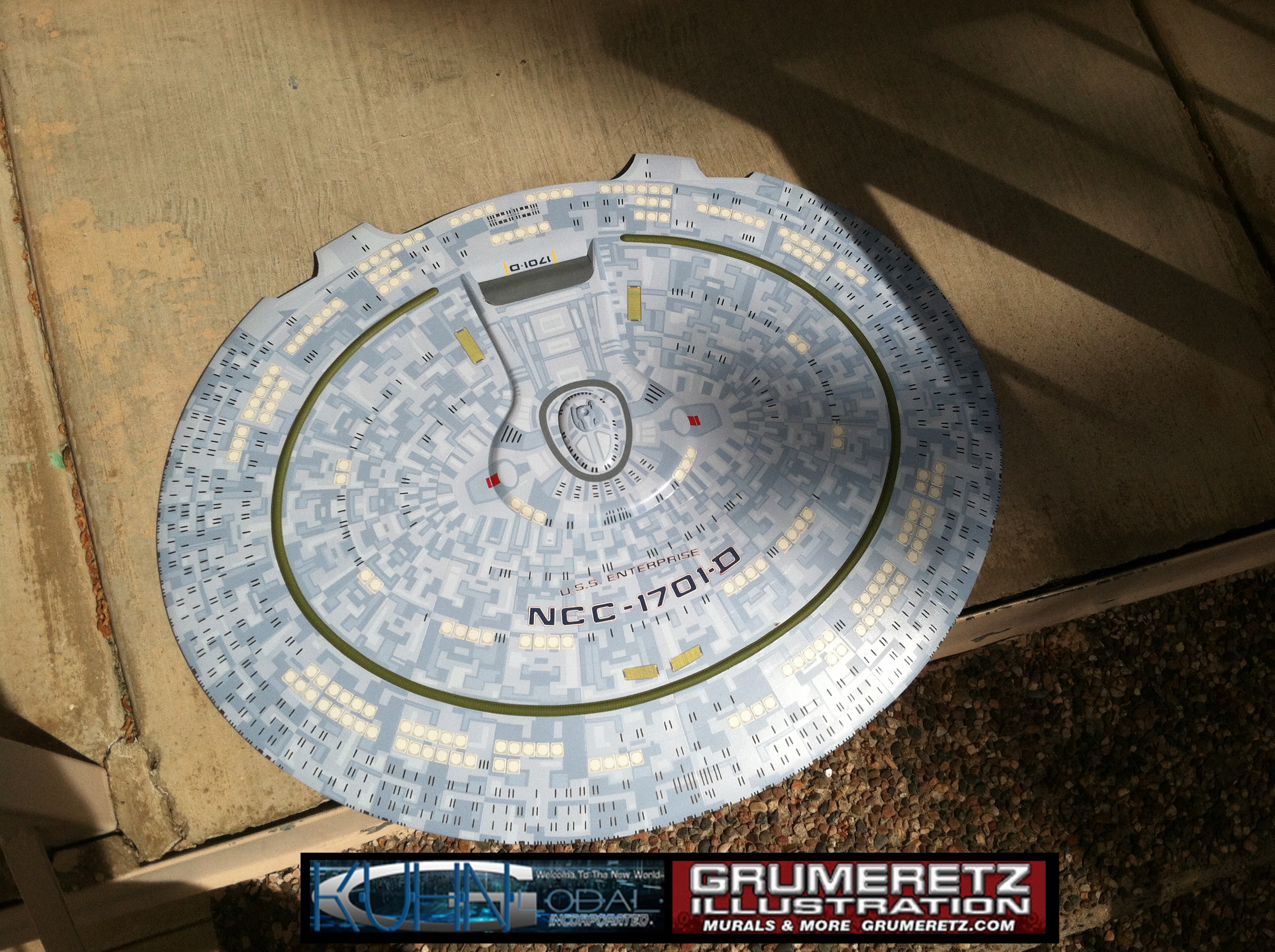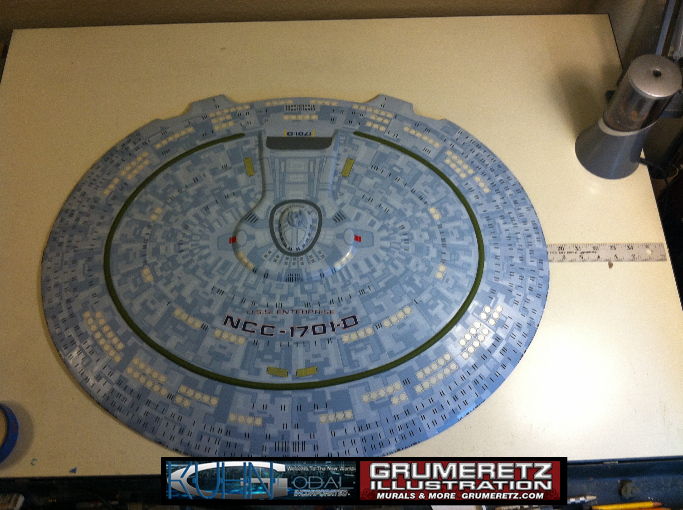 Artist Dan Grumeretz is doing magnificent work on recreating the TNG 6 foot studio model paint job on this 40 inch Enterprise 1701-D. There were differences in this cast from the actual 6 foot studio model of which he worked well with, changing a few cast details, then incorporating the FOUR levels of paint paneling to fit this cast. Dan studied the 6 foot model paint scheme very closely to get these patterns correct. Like I stated, there were minor differences in this cast from the cast configuration of the 6 foot studio model, so he fit it as well as possible to recreate the 6 foot beast in this just under four foot version. Other than the twin red vinyl stripes going down the spine, all you see on this is paint, even the lettered markings…. NO DECALS were used. The paint colors themselves came direct from Rick Sternback. I had purchased the one and only DeAgostini 1:900 (QMX Size) Enterprise 1701-D from him that included the same paint colors as was used on the 6 foot model. So we utilized those same colors for this 40 inch build. That stated, the camera Dan is using to photograph this progress really shows high contrast between the colors used. In person, they are not so pronounced and look much like the 6 foot studio model. With the custom studio stand now at Dan’s shop, still remaining to complete this build is minor clean up, fill in, nacelle ribs, and final lighting test. Once again, Dan is doing amazing work. This project has been a long time coming and I am pleased to see it coming to a close for final display in the collection here. There will be Blue Screen photos when it arrives. We hope you like it!