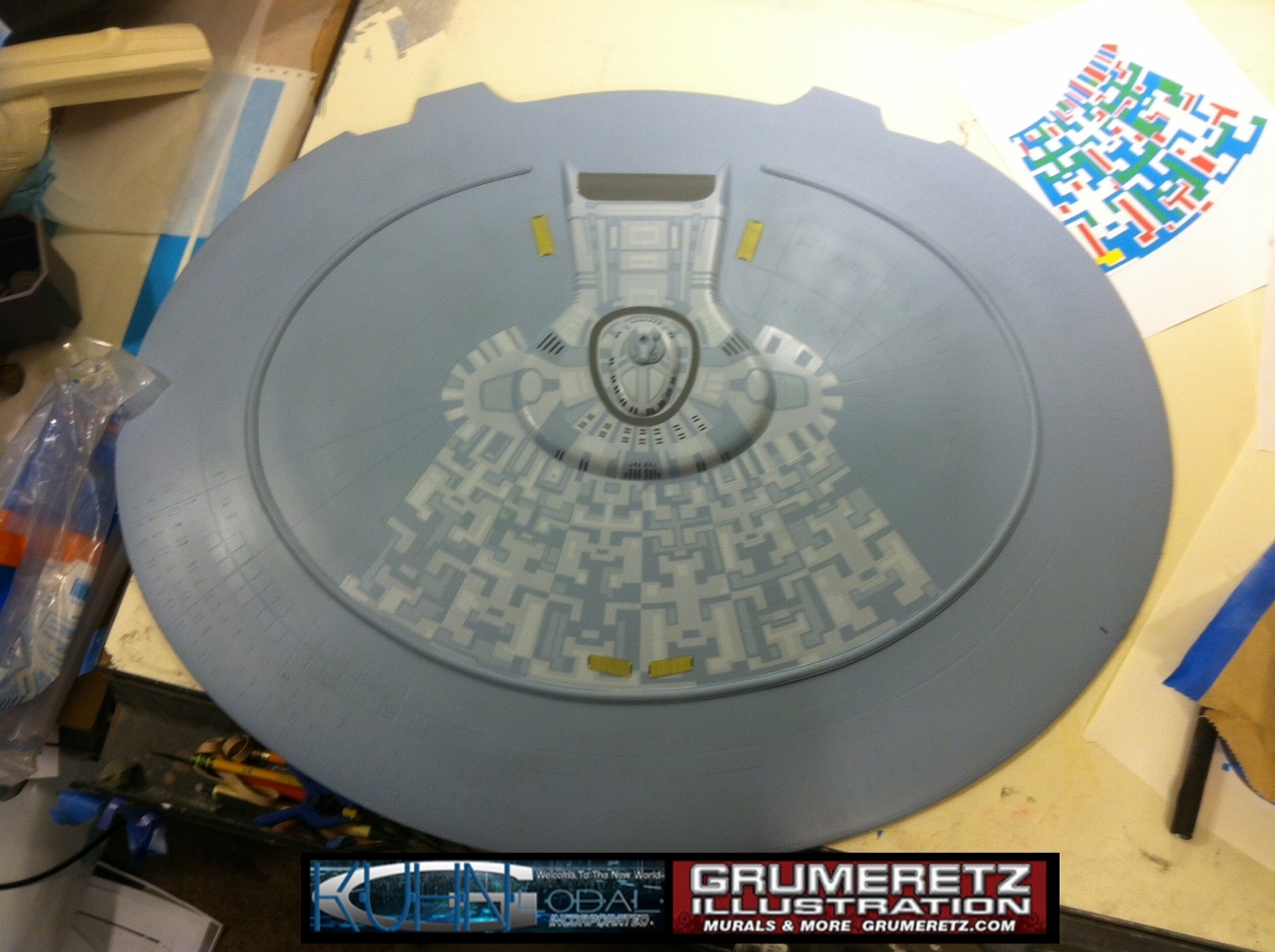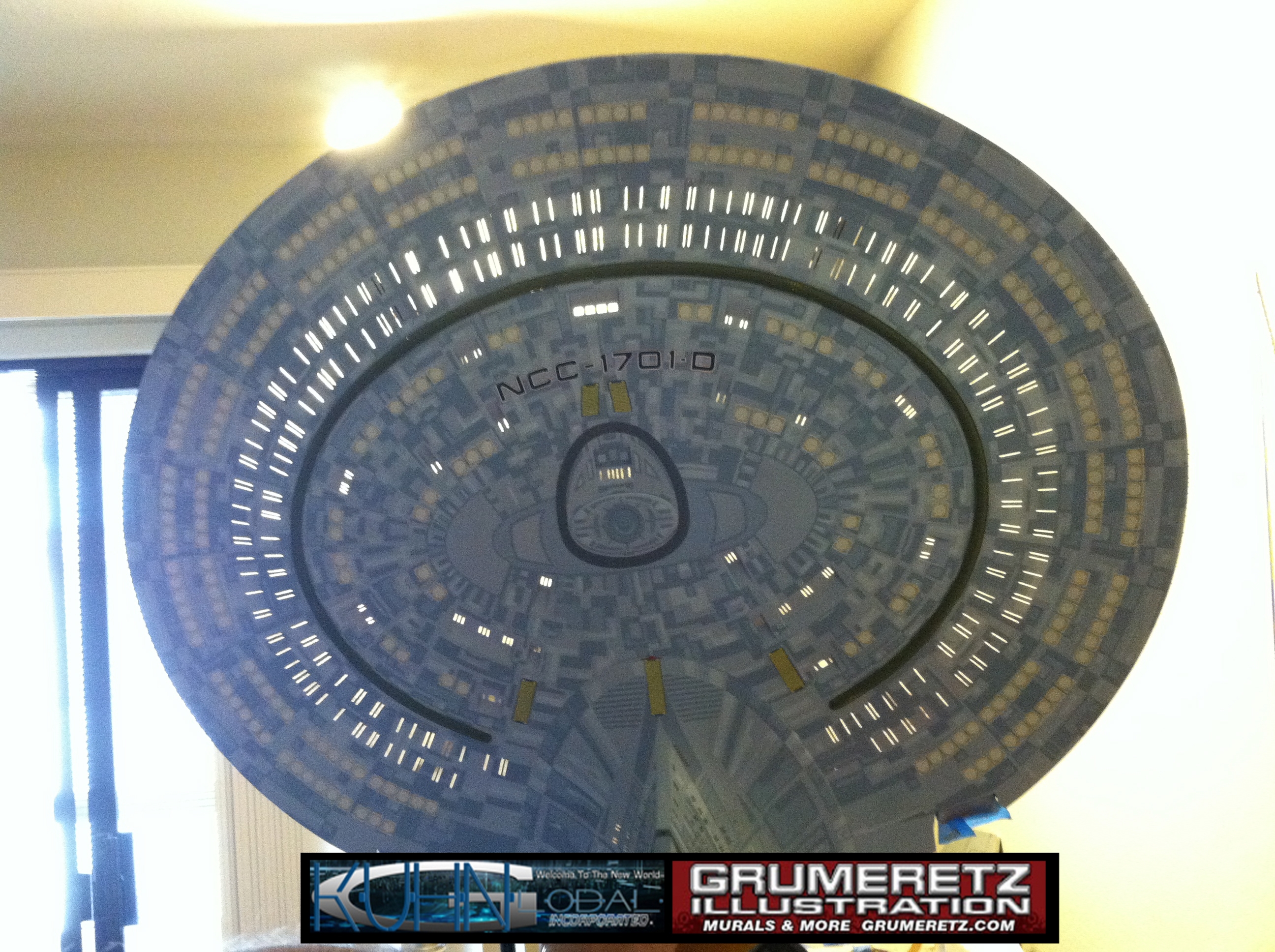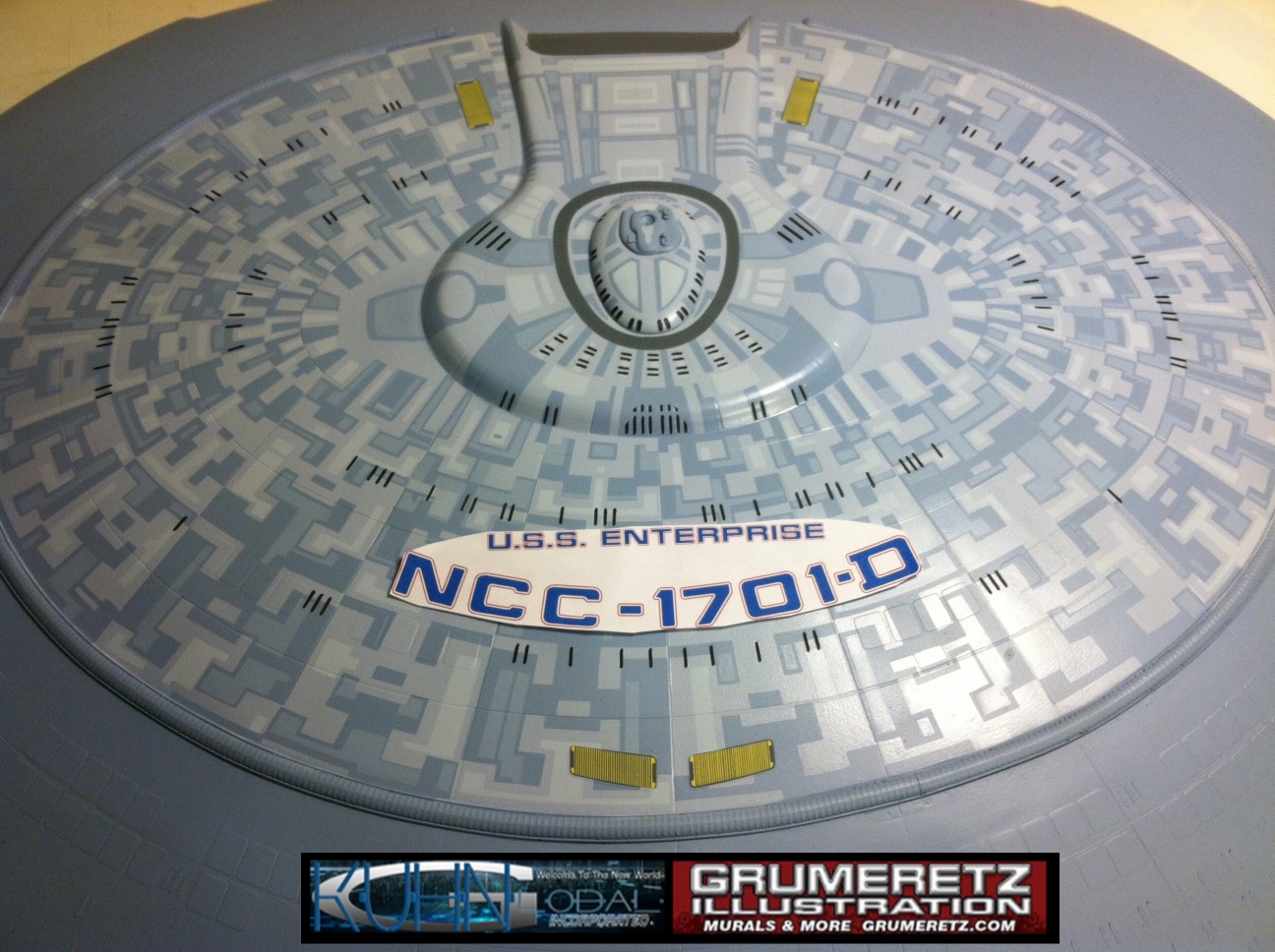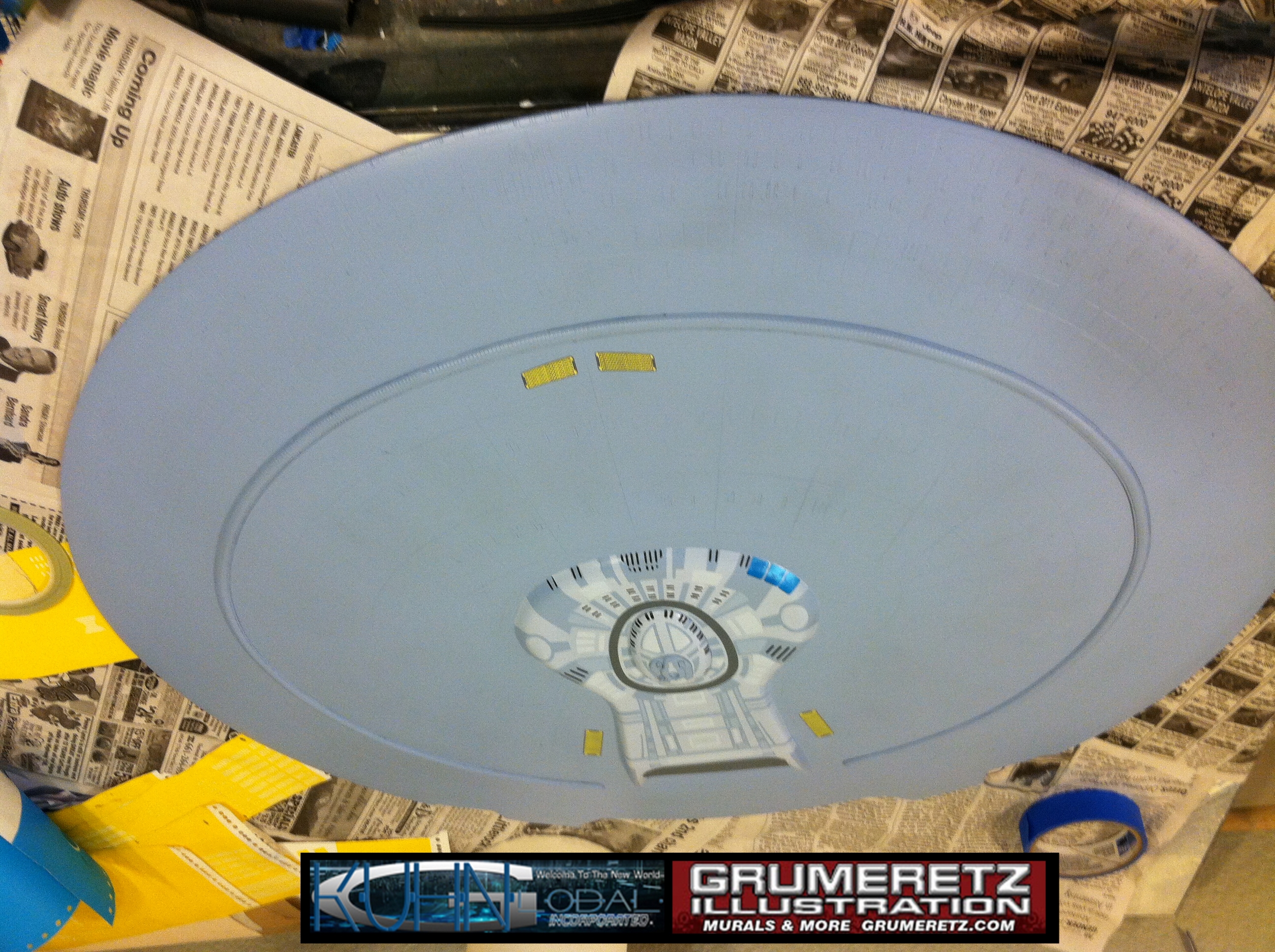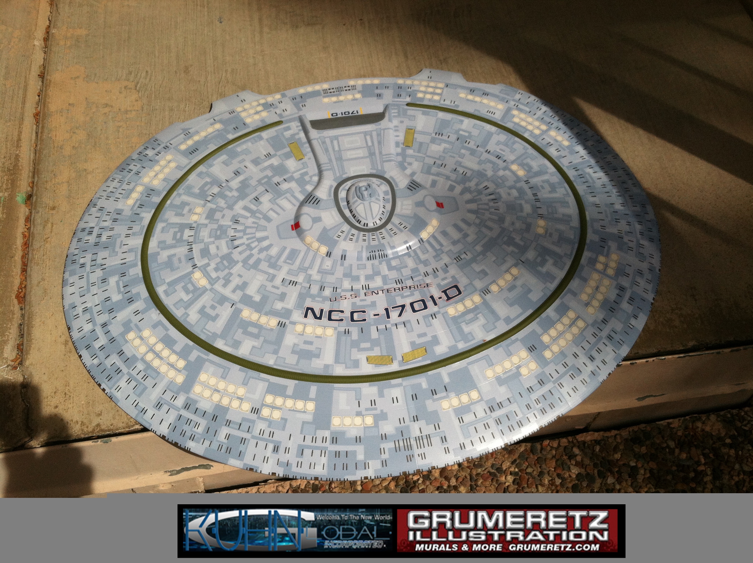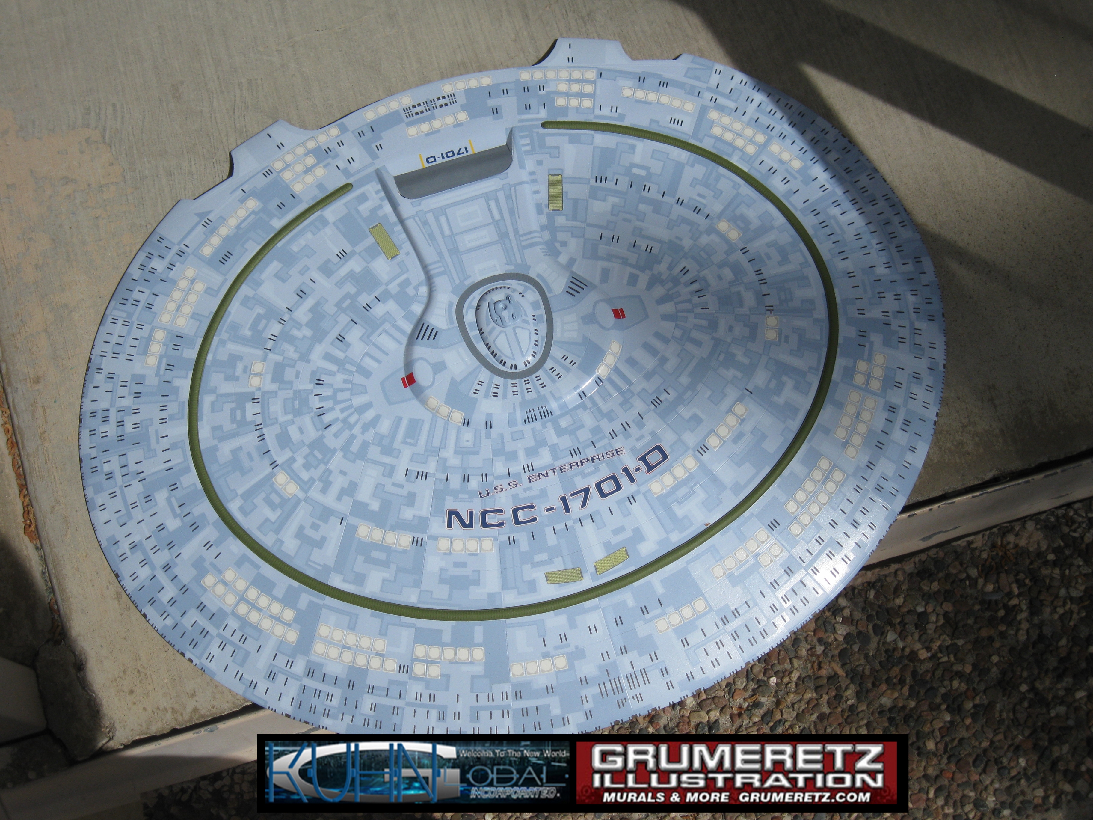Artist Dan Grumeretz is doing magnificent work on recreating the TNG 6 foot studio model paint job on this 40 inch Enterprise 1701-D. There were differences in this cast from the actual 6 foot studio model of which he worked well with, changing a few cast details, then incorporating the FOUR levels of paint paneling to fit this cast. Dan studied the 6 foot model paint scheme very closely to get these patterns correct. Like I stated, there were minor differences in this cast from the cast configuration of the 6 foot studio model, so he fit it as well as possible to recreate the 6 foot beast in this just under four foot version. Other than the twin red vinyl stripes going down the spine, all you see on this is paint, even the lettered markings…. NO DECALS were used. The paint colors themselves came direct from Rick Sternback. I had purchased the one and only DeAgostini 1:900 (QMX Size) Enterprise 1701-D from him that included the same paint colors as was used on the 6 foot model. So we utilized those same colors for this 40 inch build. That stated, the camera Dan is using to photograph this progress really shows high contrast between the colors used. In person, they are not so pronounced and look much like the 6 foot studio model. With the custom studio stand now at Dan’s shop, still remaining to complete this build is minor clean up, fill in, nacelle ribs, and final lighting test. Once again, Dan is doing amazing work. This project has been a long time coming and I am pleased to see it coming to a close for final display in the collection here. There will be Blue Screen photos when it arrives. We hope you like it!