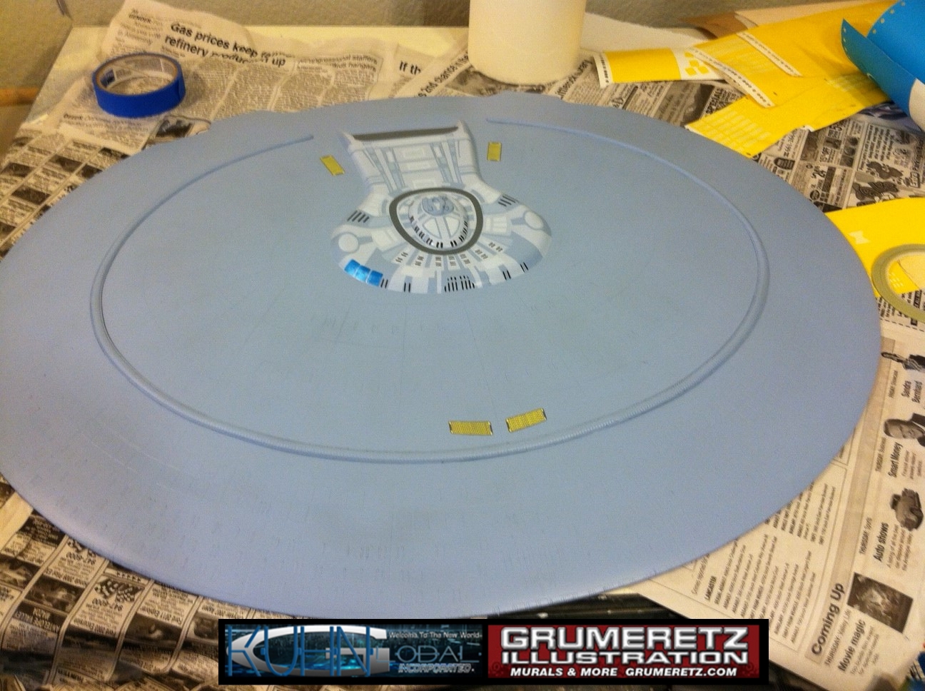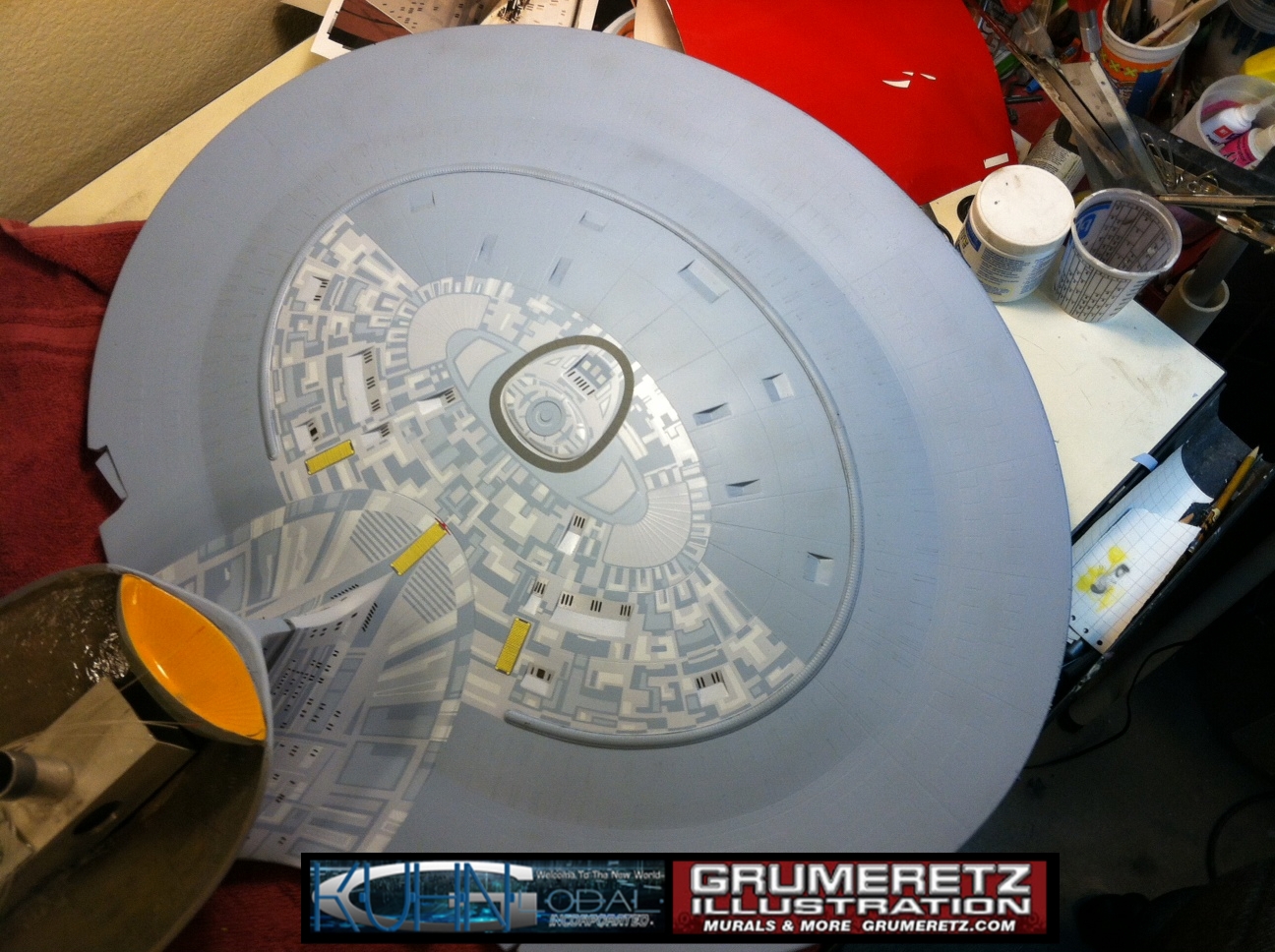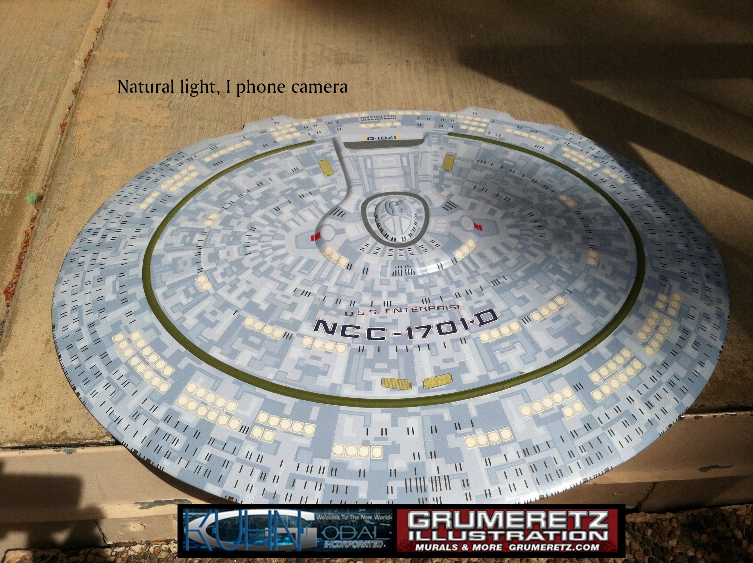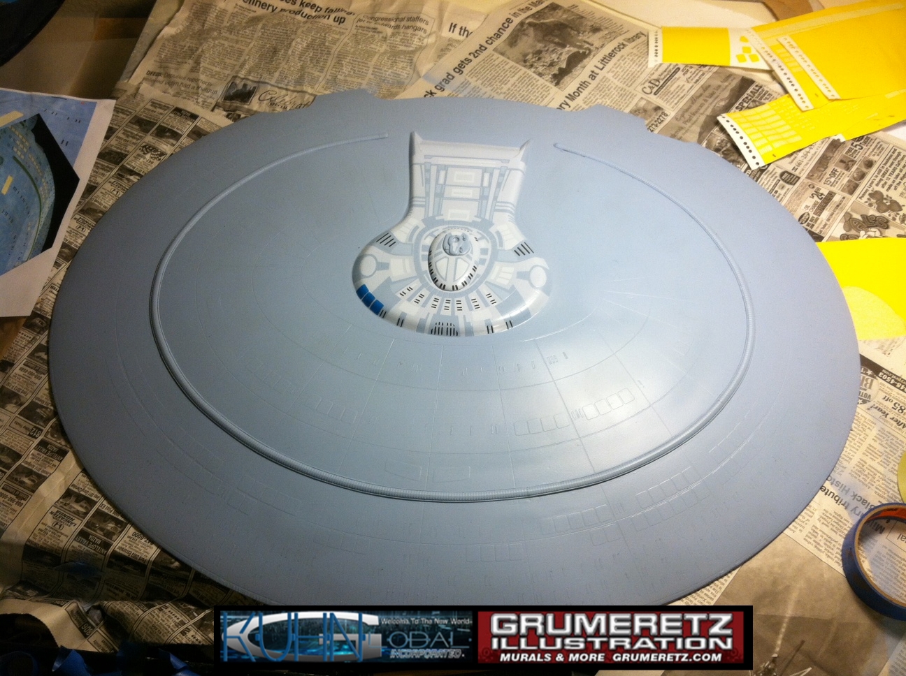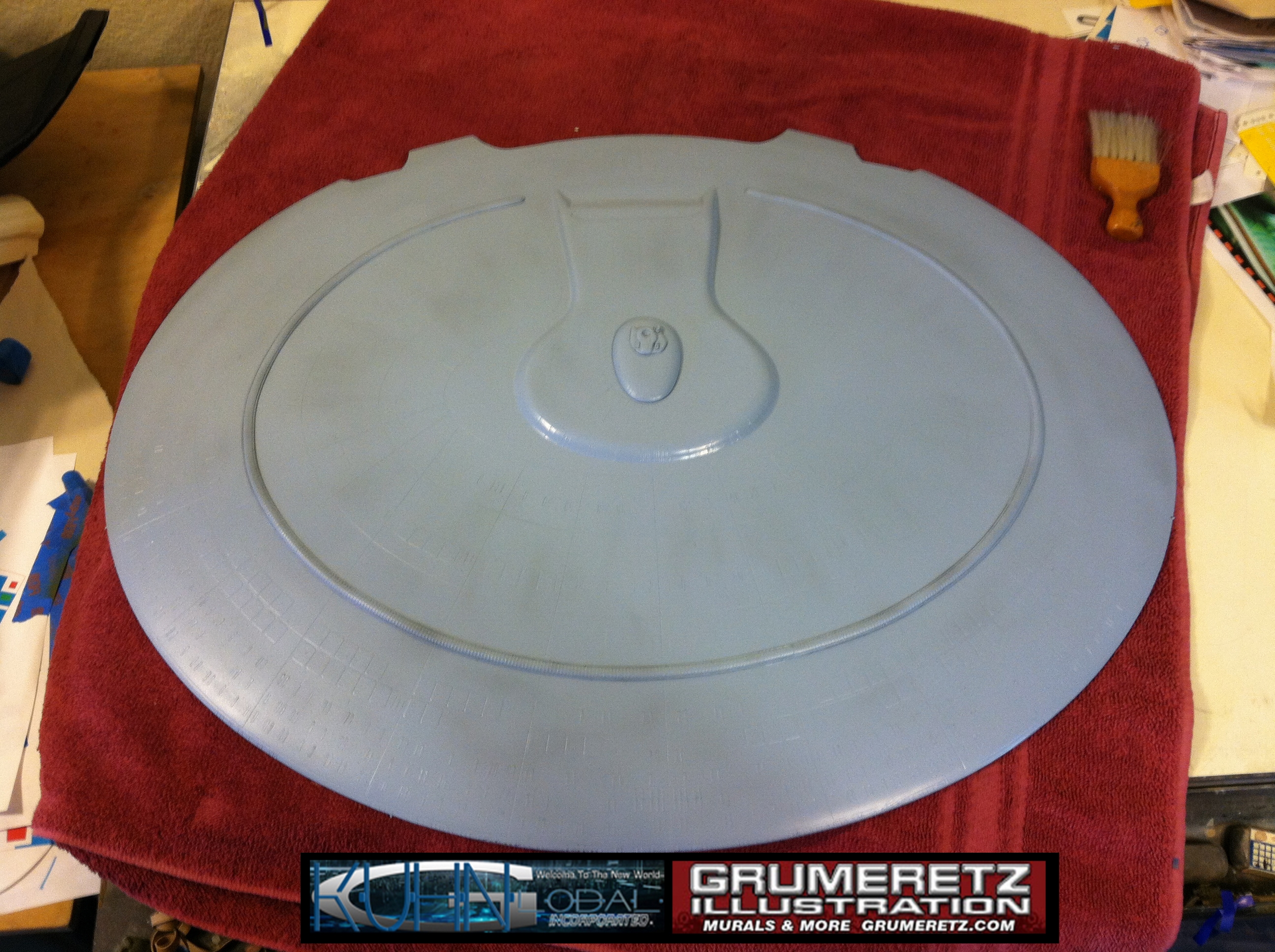 Artist Dan Grumeretz is doing magnificent work on recreating the TNG 6 foot studio model paint job on this 40 inch Enterprise 1701-D. There were differences in this cast from the actual 6 foot studio model of which he worked well with, changing a few cast details, then incorporating the FOUR levels of paint paneling to fit this cast. Dan studied the 6 foot model paint scheme very closely to get these patterns correct. Like I stated, there were minor differences in this cast from the cast configuration of the 6 foot studio model, so he fit it as well as possible to recreate the 6 foot beast in this just under four foot version. Other than the twin red vinyl stripes going down the spine, all you see on this is paint, even the lettered markings…. NO DECALS were used. The paint colors themselves came direct from Rick Sternback. I had purchased the one and only DeAgostini 1:900 (QMX Size) Enterprise 1701-D from him that included the same paint colors as was used on the 6 foot model. So we utilized those same colors for this 40 inch build. That stated, the camera Dan is using to photograph this progress really shows high contrast between the colors used. In person, they are not so pronounced and look much like the 6 foot studio model. With the custom studio stand now at Dan’s shop, still remaining to complete this build is minor clean up, fill in, nacelle ribs, and final lighting test. Once again, Dan is doing amazing work. This project has been a long time coming and I am pleased to see it coming to a close for final display in the collection here. There will be Blue Screen photos when it arrives. We hope you like it!