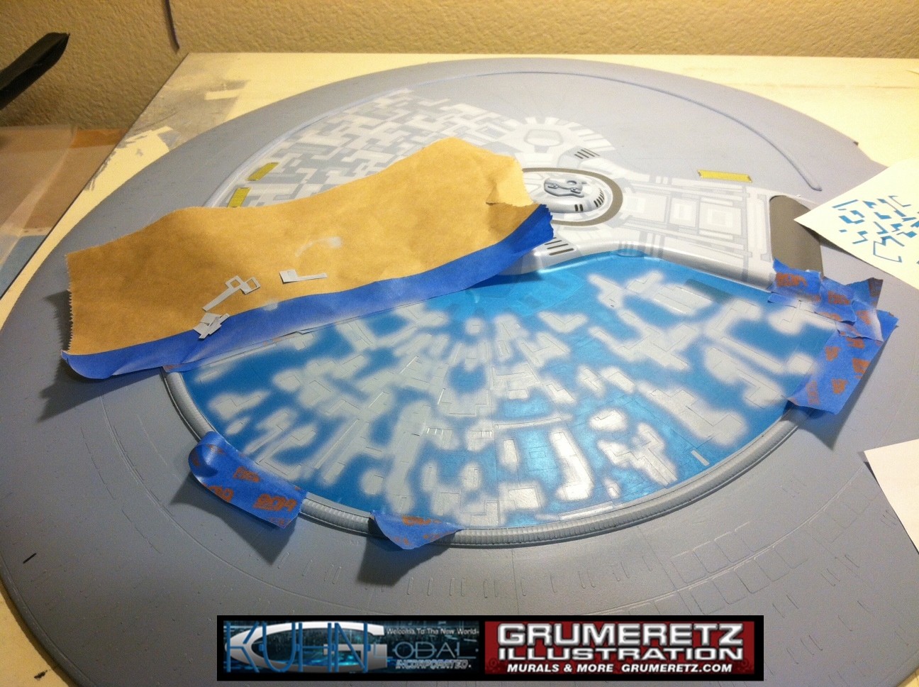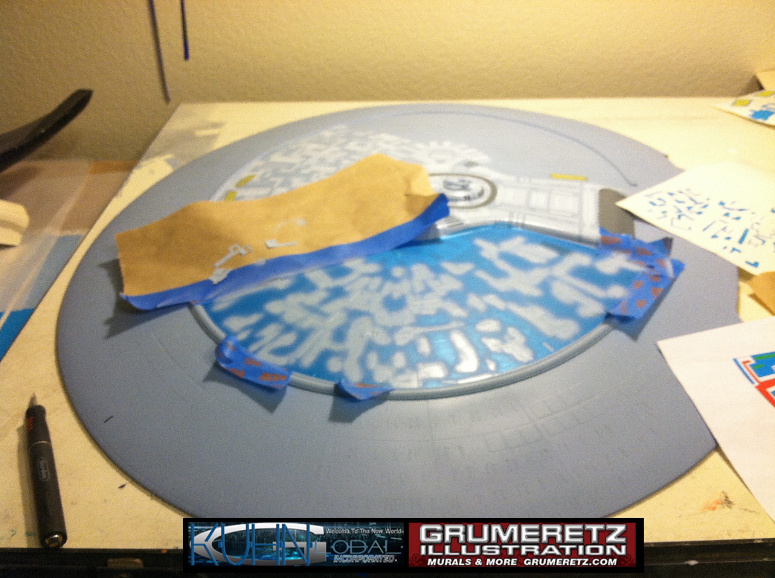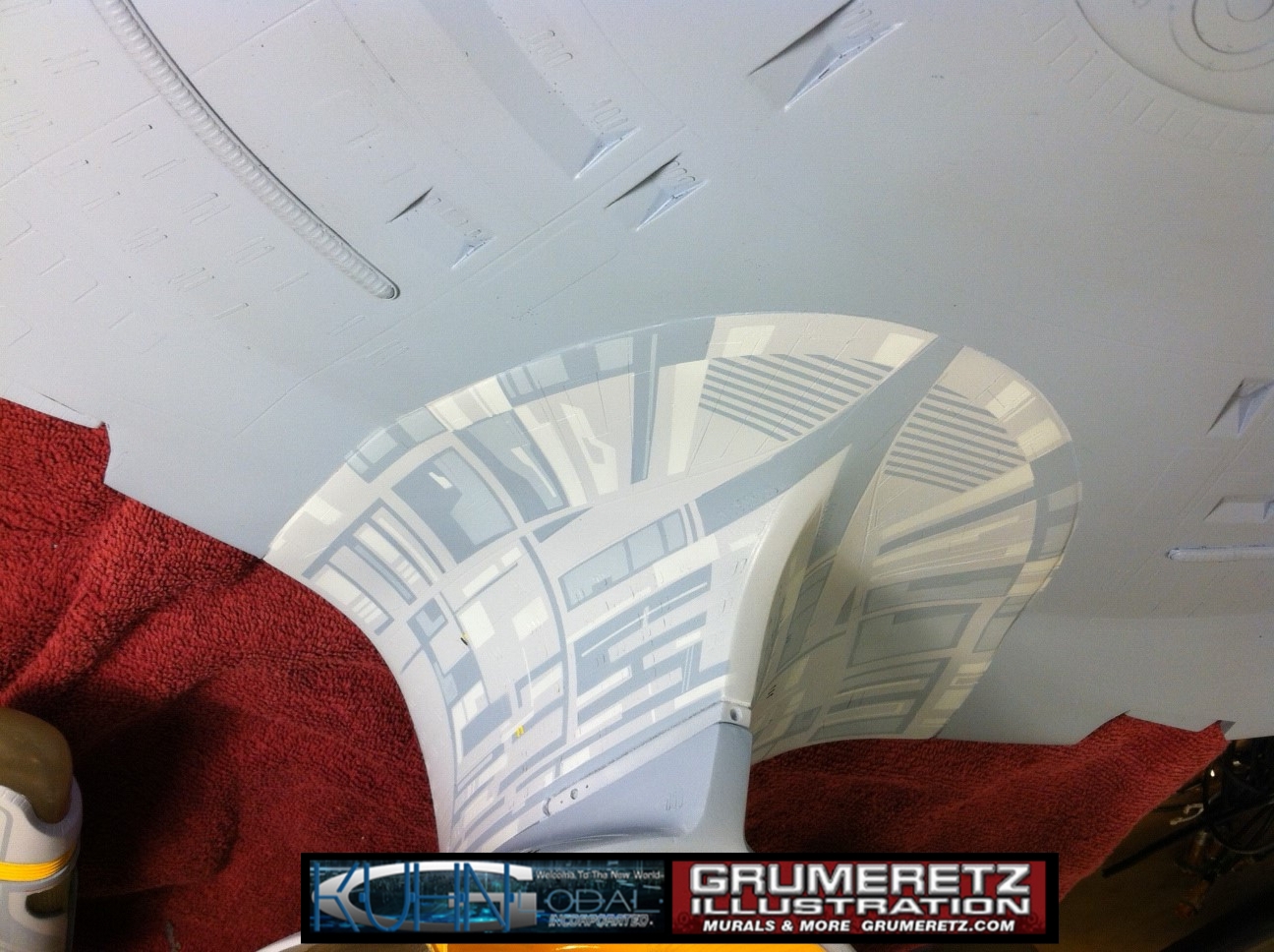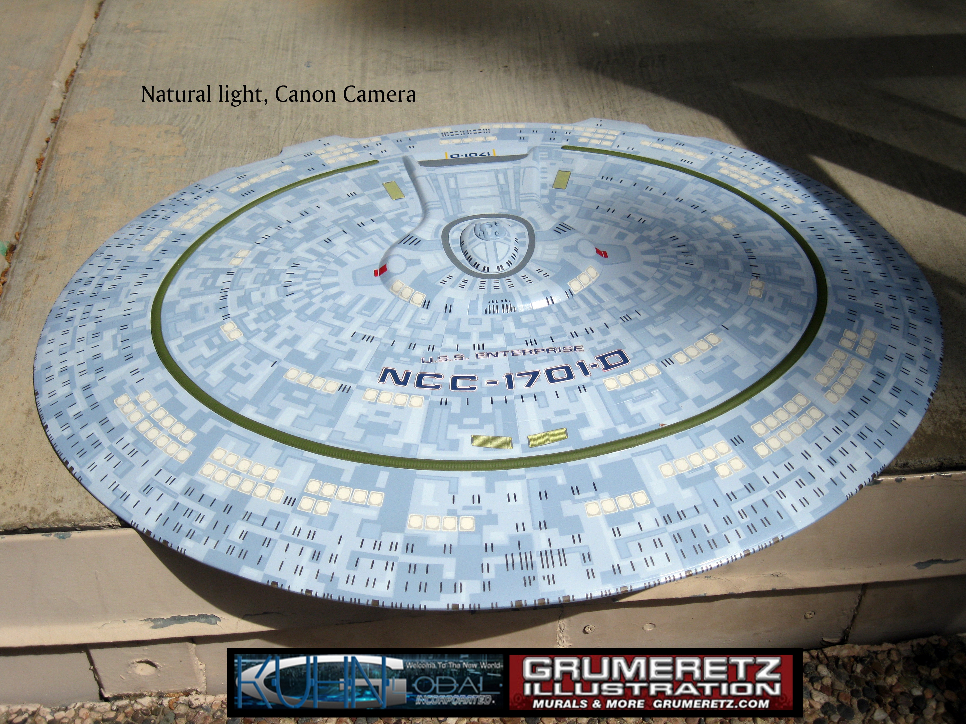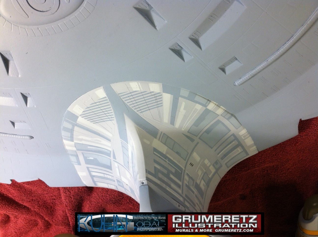 Artist Dan Grumeretz is doing magnificent work on recreating the TNG 6 foot studio model paint job on this 40 inch Enterprise 1701-D. There were differences in this cast from the actual 6 foot studio model of which he worked well with, changing a few cast details, then incorporating the FOUR levels of paint paneling to fit this cast. Dan studied the 6 foot model paint scheme very closely to get these patterns correct. Like I stated, there were minor differences in this cast from the cast configuration of the 6 foot studio model, so he fit it as well as possible to recreate the 6 foot beast in this just under four foot version. Other than the twin red vinyl stripes going down the spine, all you see on this is paint, even the lettered markings…. NO DECALS were used. The paint colors themselves came direct from Rick Sternback. I had purchased the one and only DeAgostini 1:900 (QMX Size) Enterprise 1701-D from him that included the same paint colors as was used on the 6 foot model. So we utilized those same colors for this 40 inch build. That stated, the camera Dan is using to photograph this progress really shows high contrast between the colors used. In person, they are not so pronounced and look much like the 6 foot studio model. With the custom studio stand now at Dan’s shop, still remaining to complete this build is minor clean up, fill in, nacelle ribs, and final lighting test. Once again, Dan is doing amazing work. This project has been a long time coming and I am pleased to see it coming to a close for final display in the collection here. There will be Blue Screen photos when it arrives. We hope you like it!