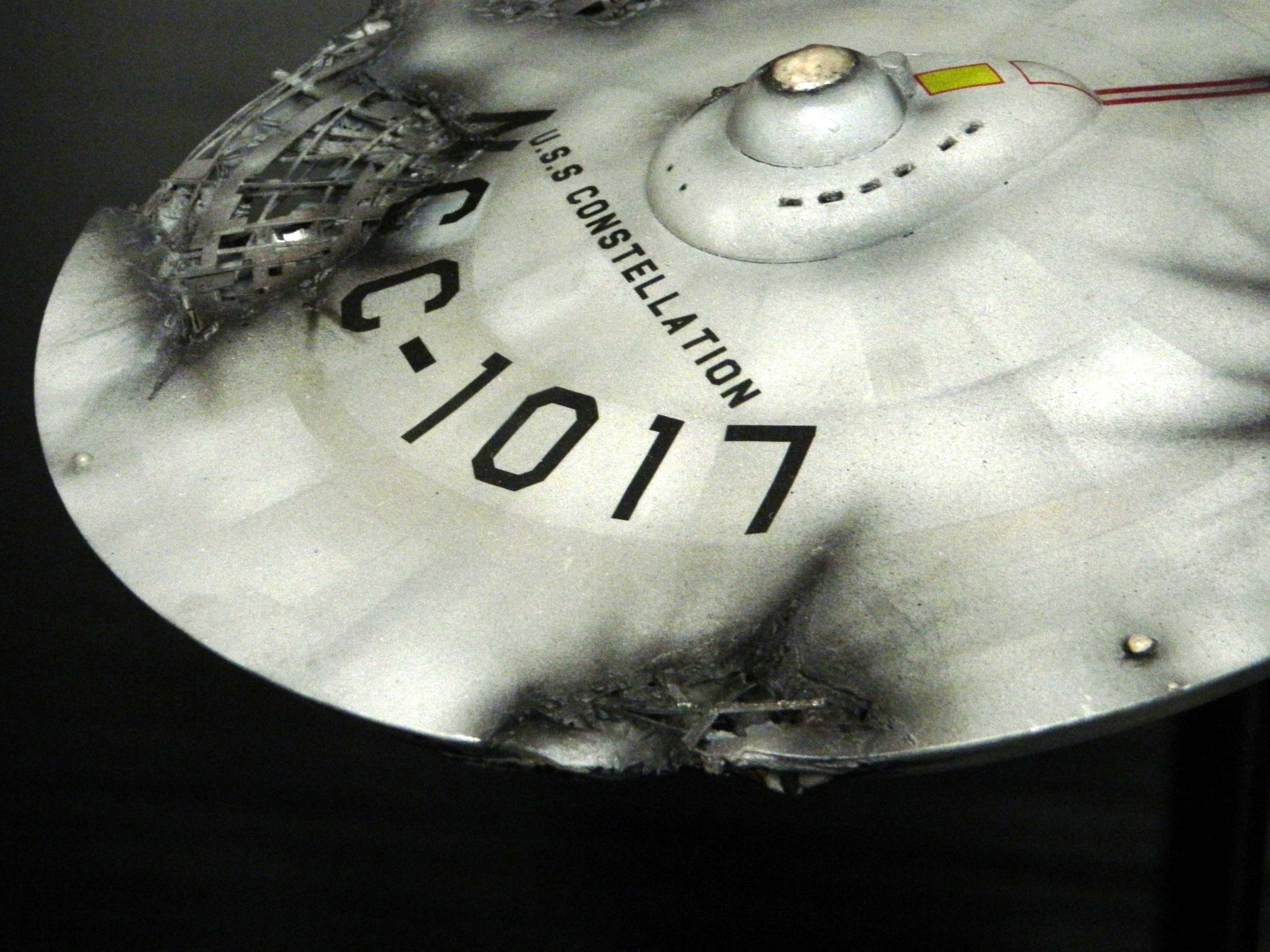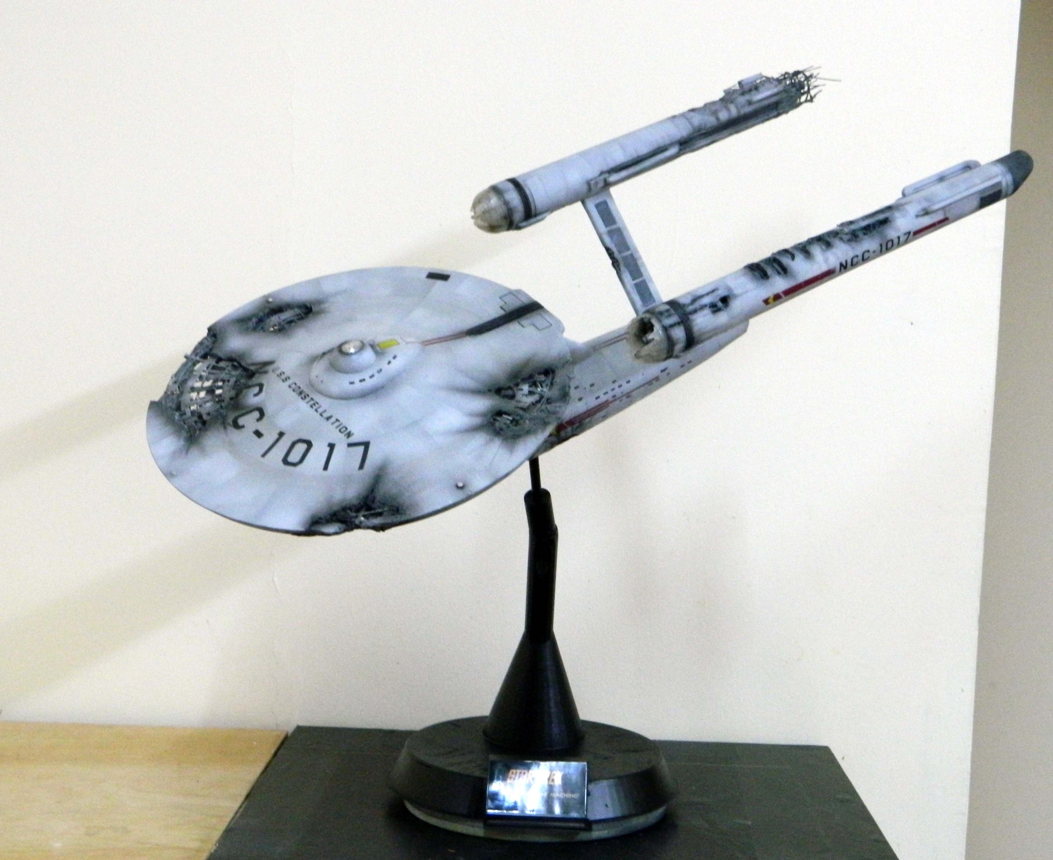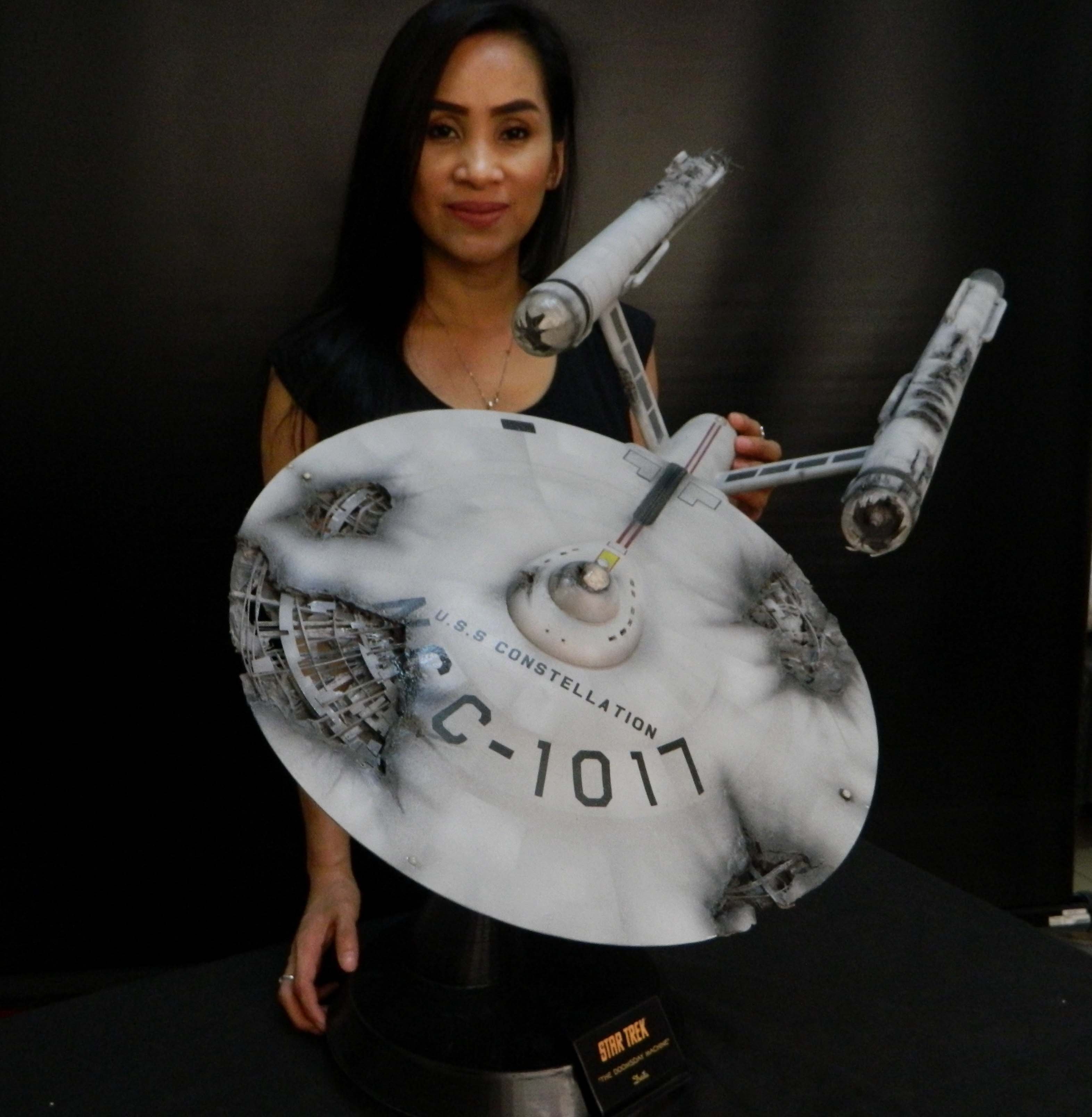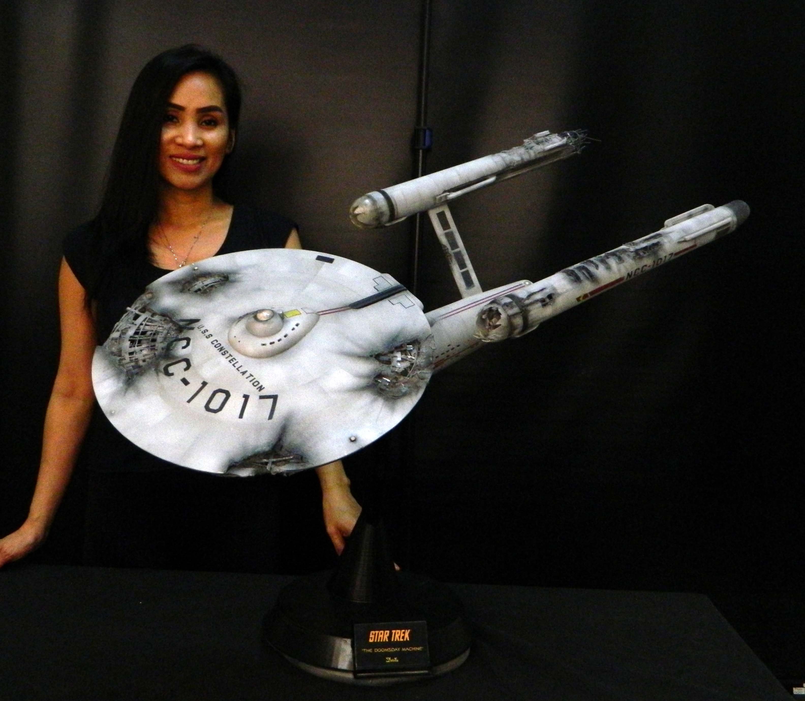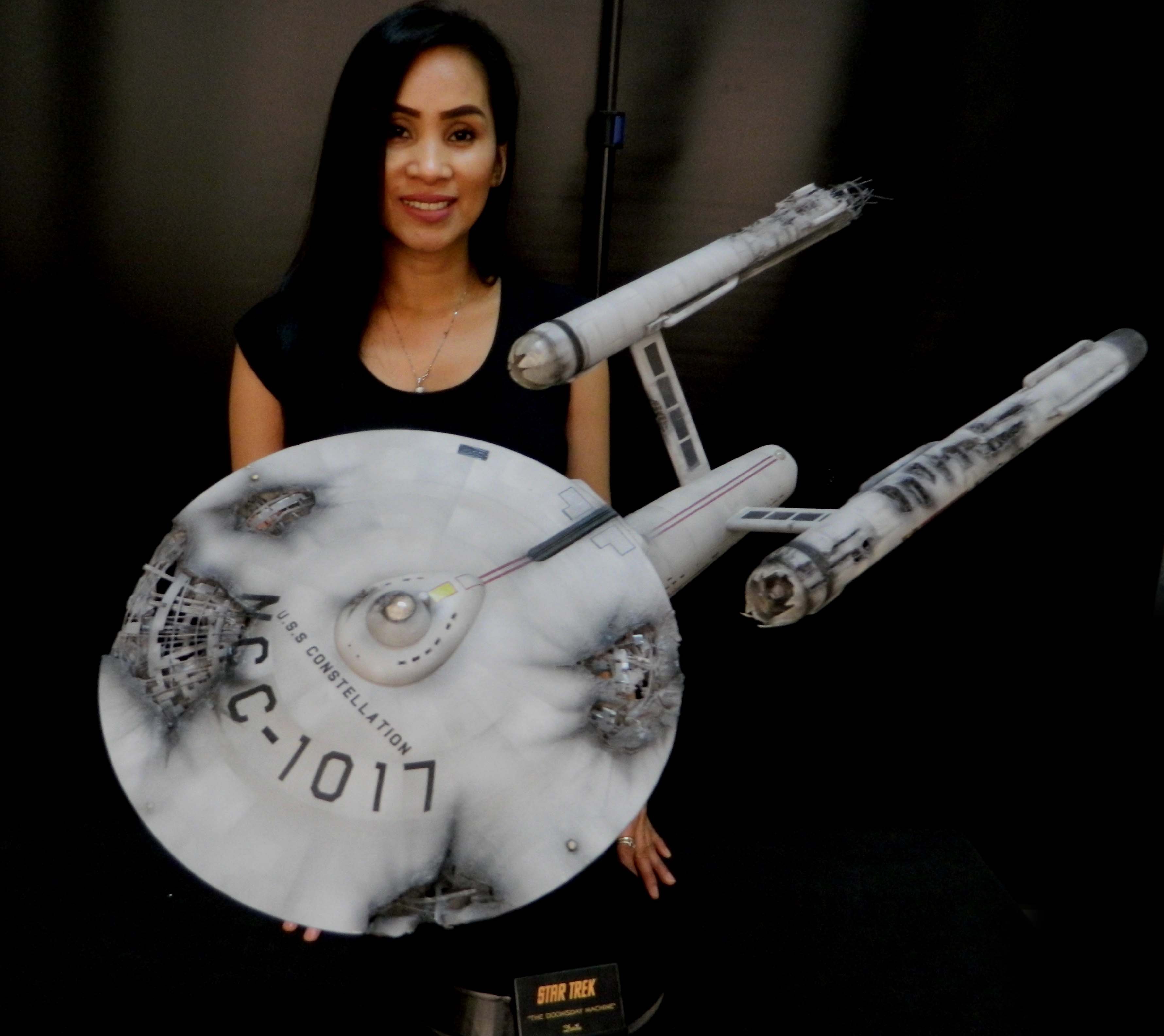 The USS Constellation has always stuck in my mind. The Planet Killer nearly destroyer her, and was eventually destroyed by her. The wreckage we saw in the original series was a simple AMT Model kit. When the HD version came out, the digital model makers for that series really upped what we viewed of this Starship. The twisted metal girders, and sparks… along with open voids of saucer section that leave a chill on my skin ever time I view it. Artist Paul Craggs captured those HD moments greatly in his own 3D printed work of art you see here, along with Paul’s wife in the photos for scale… (or the second model in the photos… heh heh). 😉 The Starship is even sitting on a tilt… as it should be. Beautifully completed.