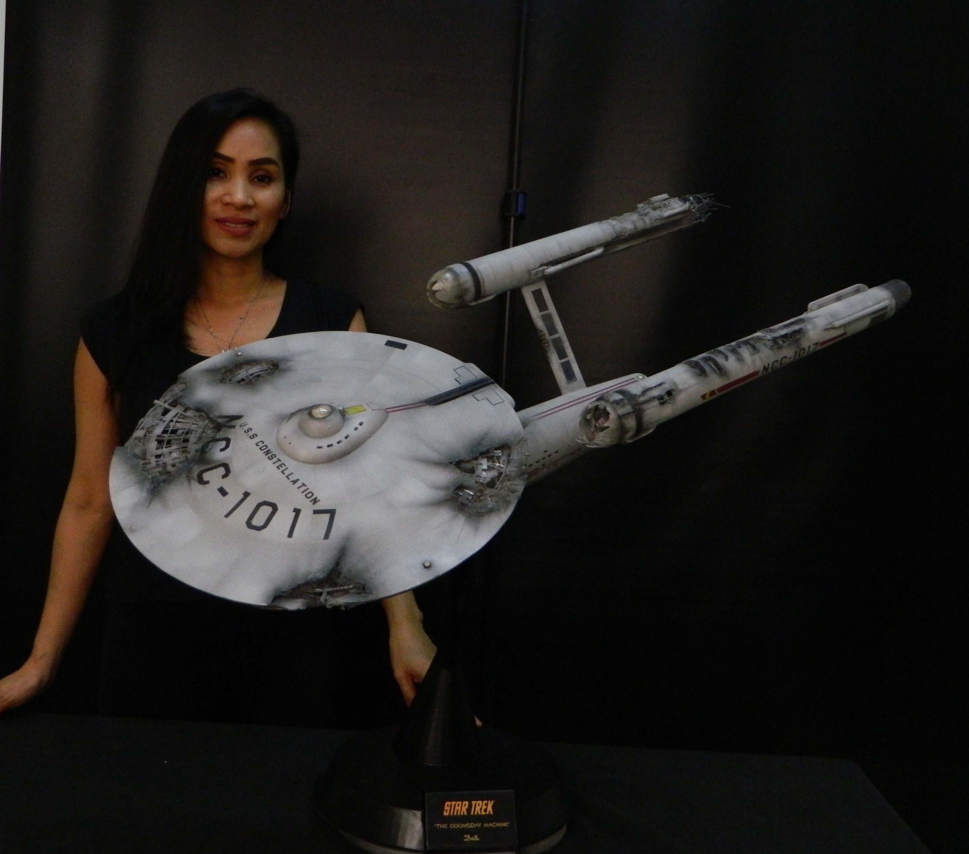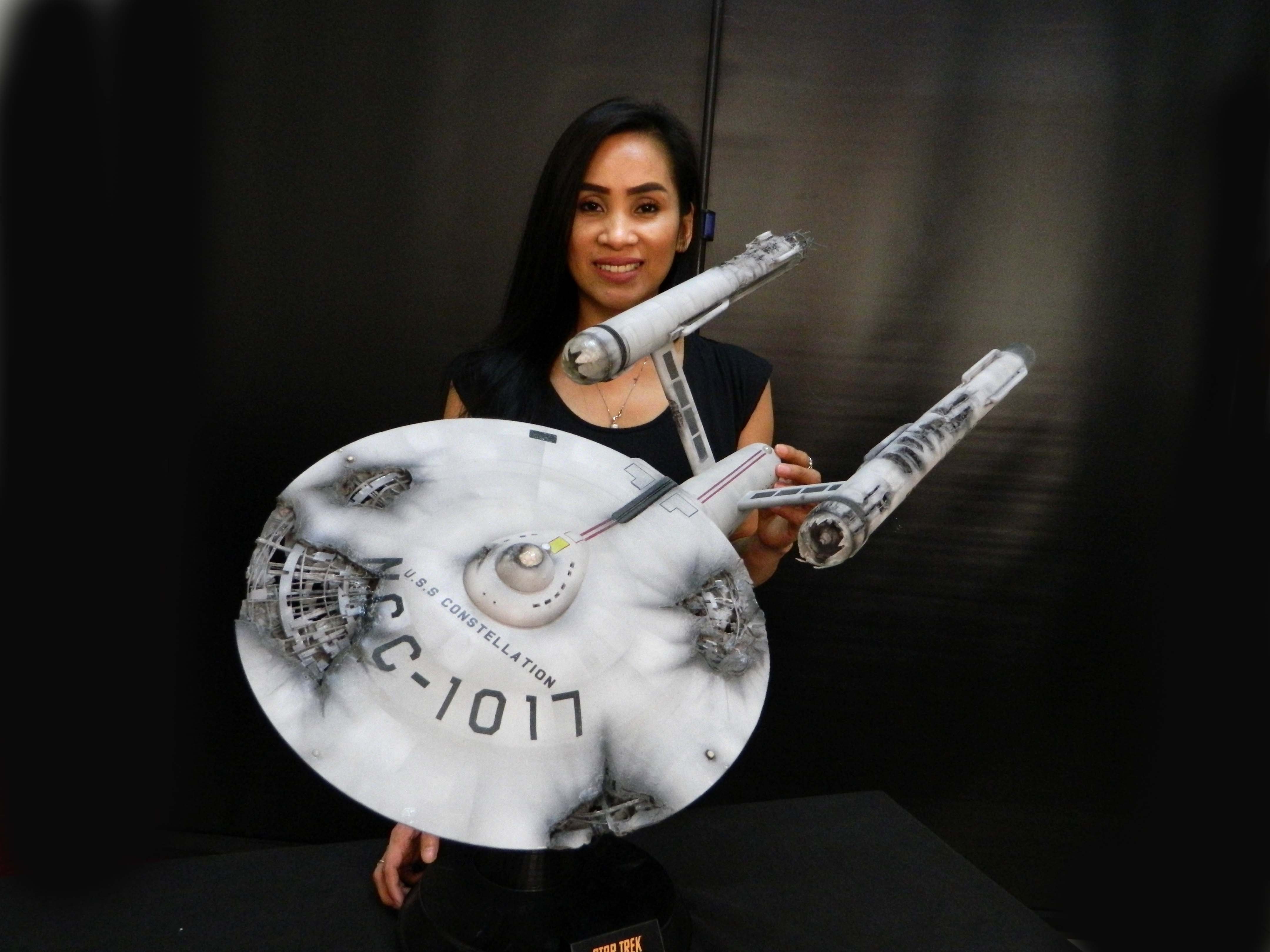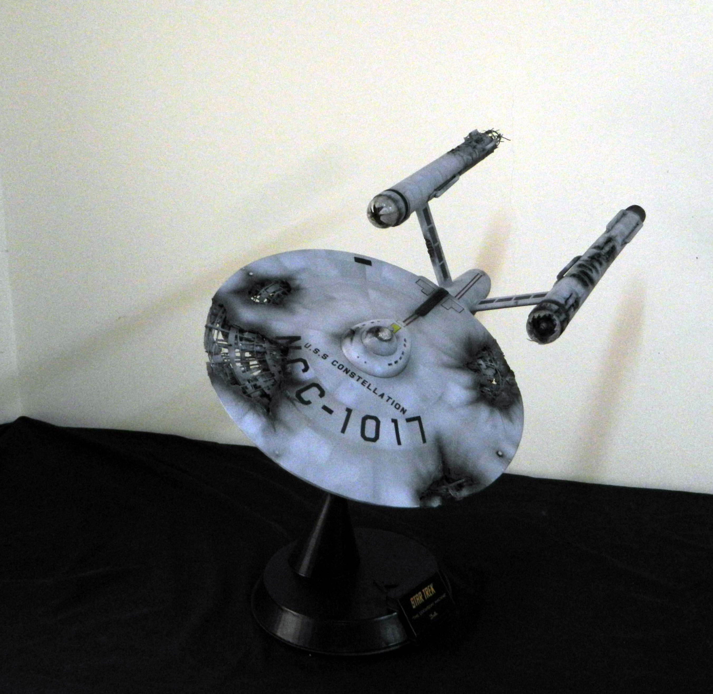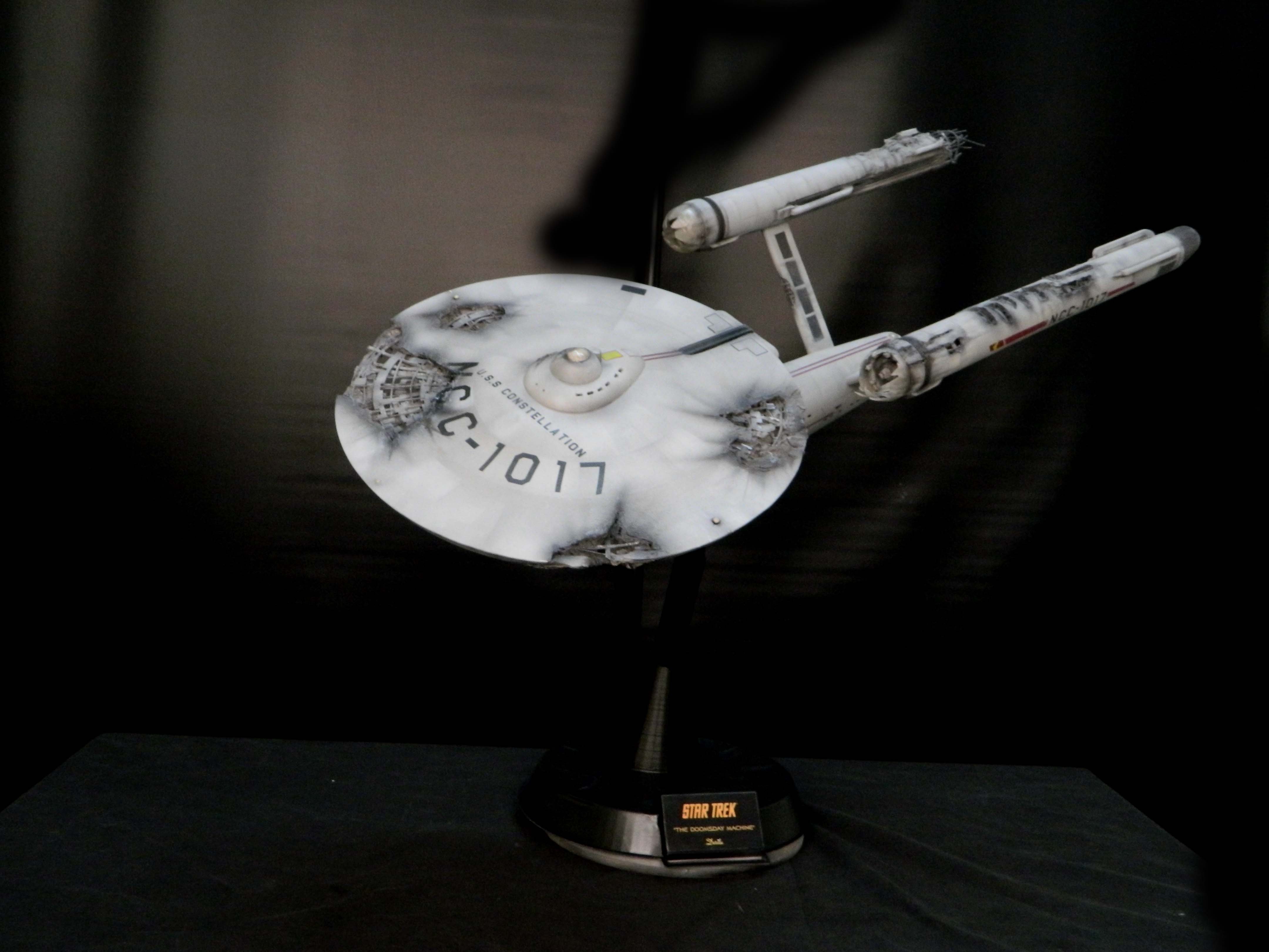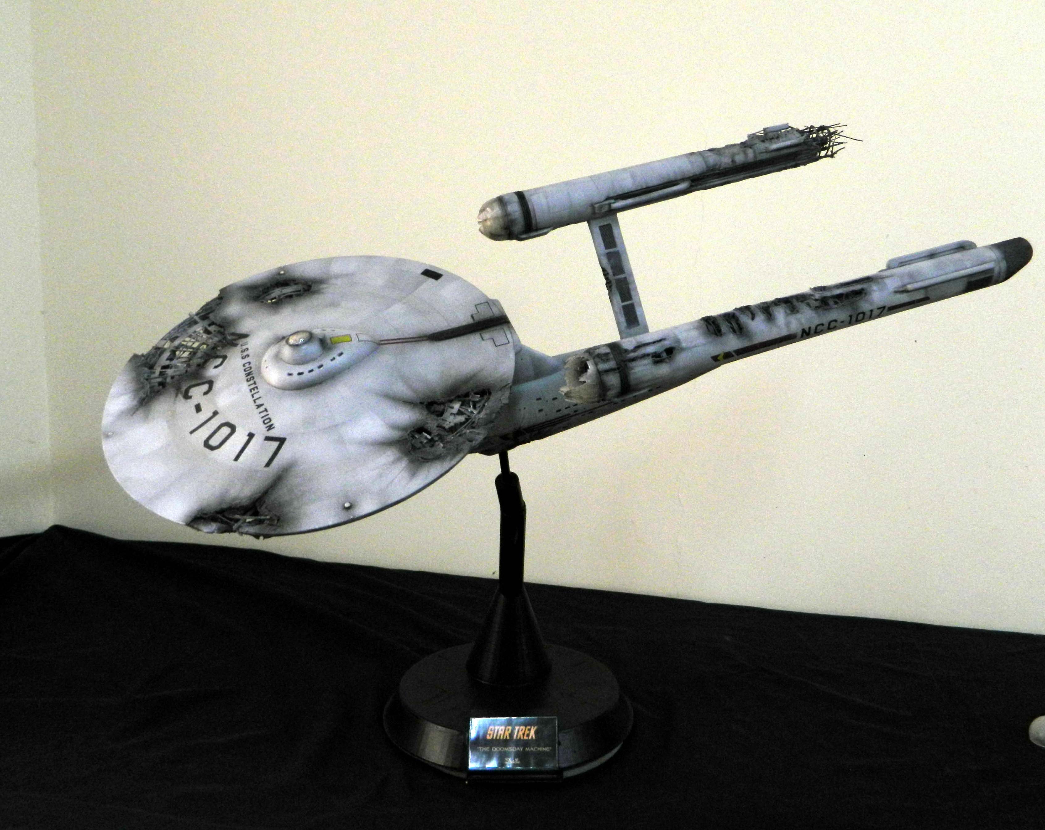 The USS Constellation has always stuck in my mind. The Planet Killer nearly destroyer her, and was eventually destroyed by her. The wreckage we saw in the original series was a simple AMT Model kit. When the HD version came out, the digital model makers for that series really upped what we viewed of this Starship. The twisted metal girders, and sparks… along with open voids of saucer section that leave a chill on my skin ever time I view it. Artist Paul Craggs captured those HD moments greatly in his own 3D printed work of art you see here, along with Paul’s wife in the photos for scale… (or the second model in the photos… heh heh). 😉 The Starship is even sitting on a tilt… as it should be. Beautifully completed.