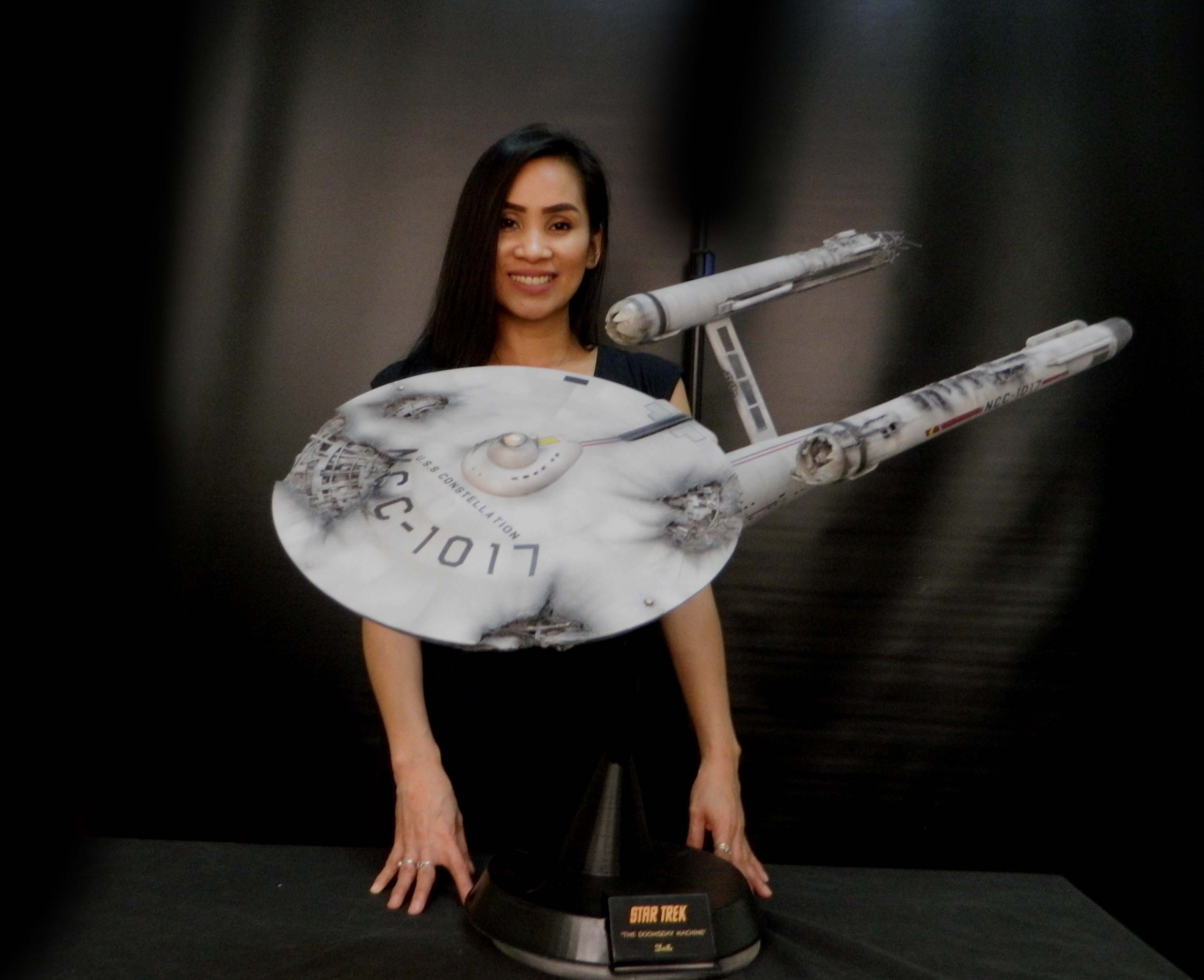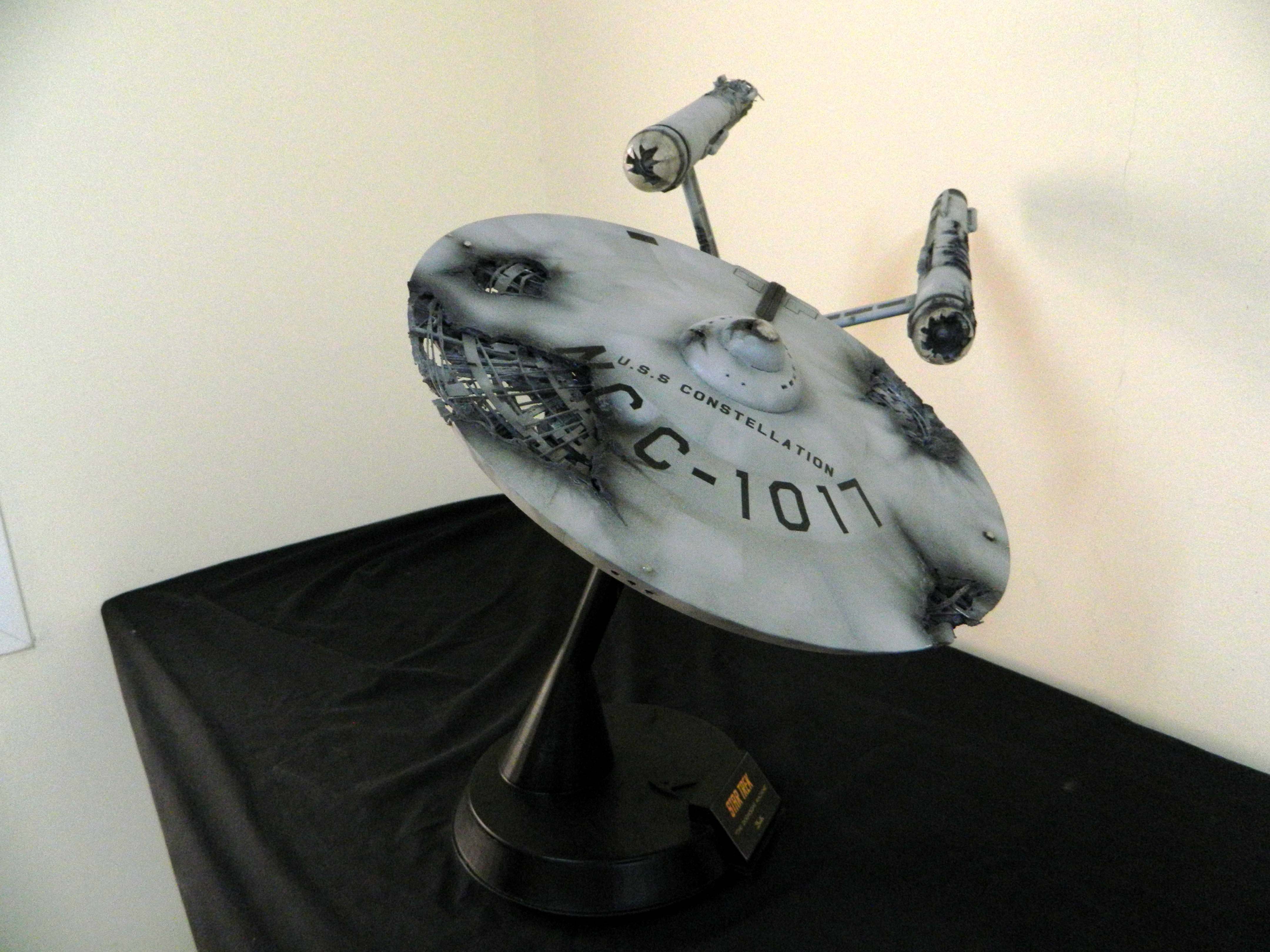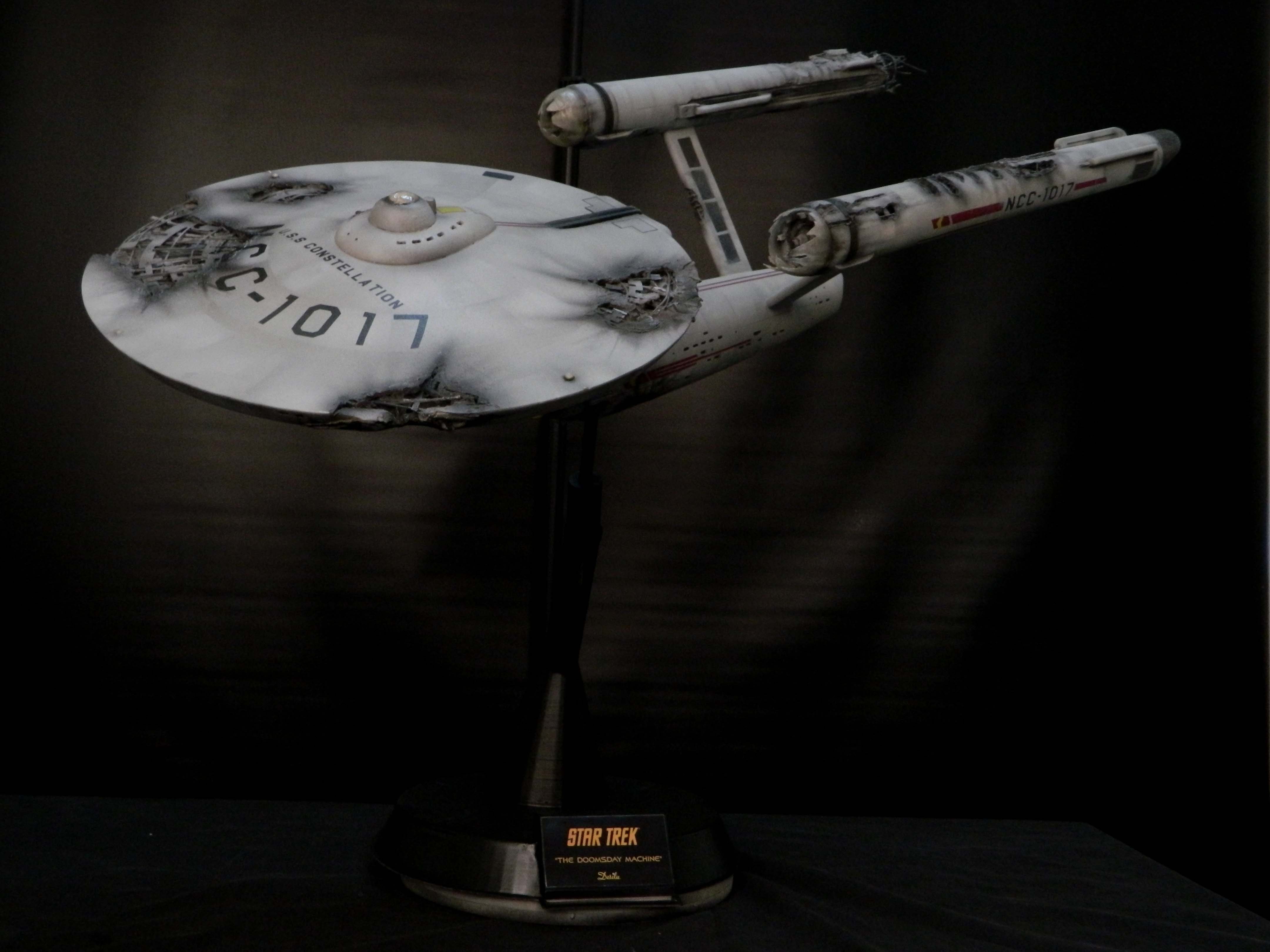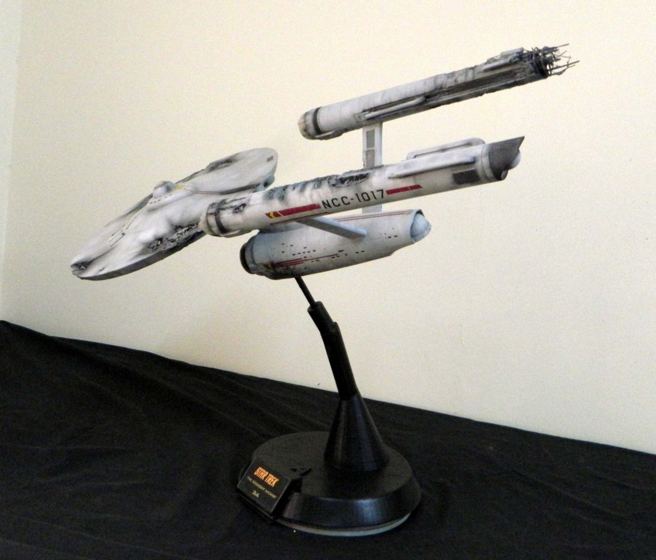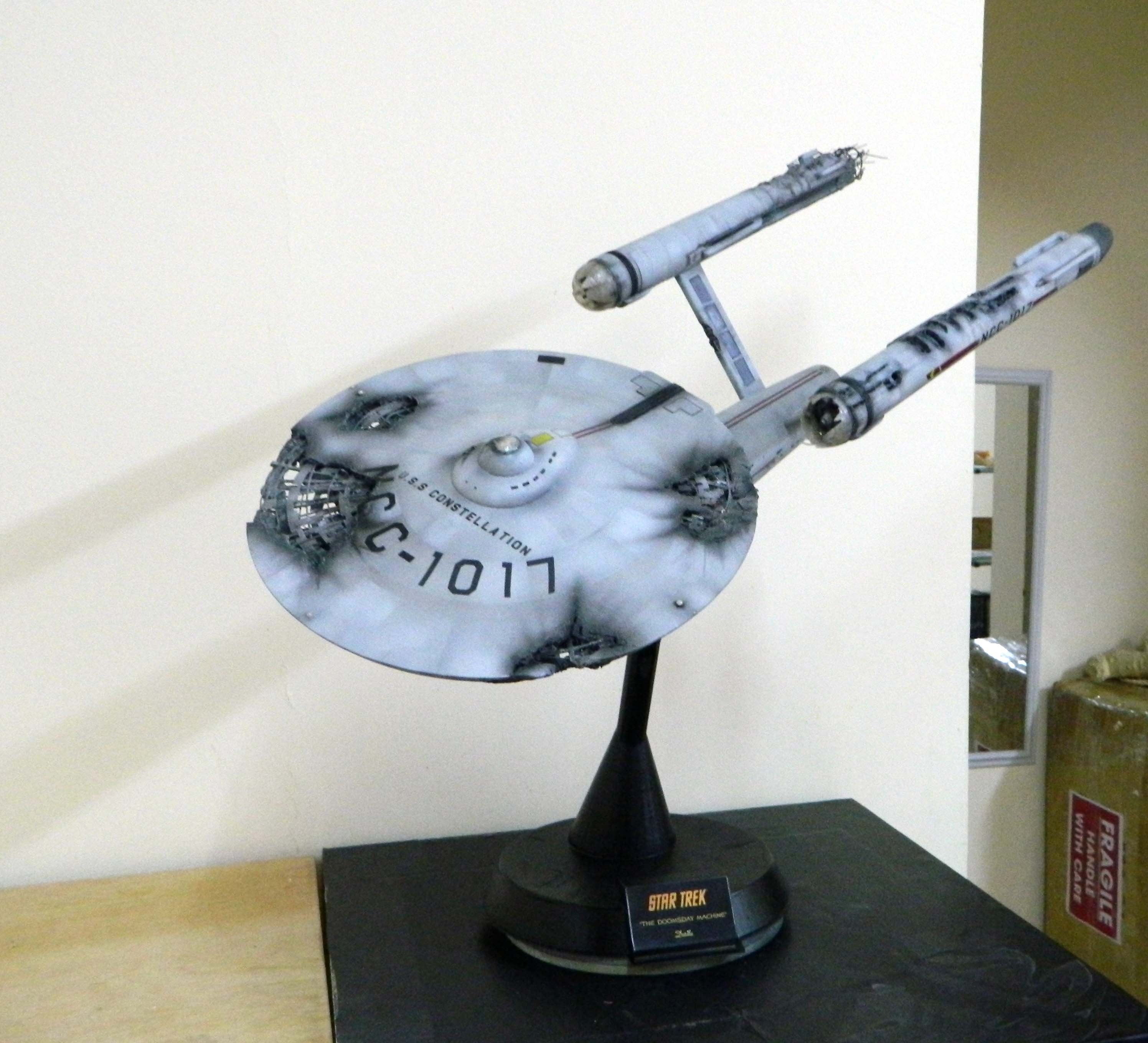 The USS Constellation has always stuck in my mind. The Planet Killer nearly destroyer her, and was eventually destroyed by her. The wreckage we saw in the original series was a simple AMT Model kit. When the HD version came out, the digital model makers for that series really upped what we viewed of this Starship. The twisted metal girders, and sparks… along with open voids of saucer section that leave a chill on my skin ever time I view it. Artist Paul Craggs captured those HD moments greatly in his own 3D printed work of art you see here, along with Paul’s wife in the photos for scale… (or the second model in the photos… heh heh). 😉 The Starship is even sitting on a tilt… as it should be. Beautifully completed.