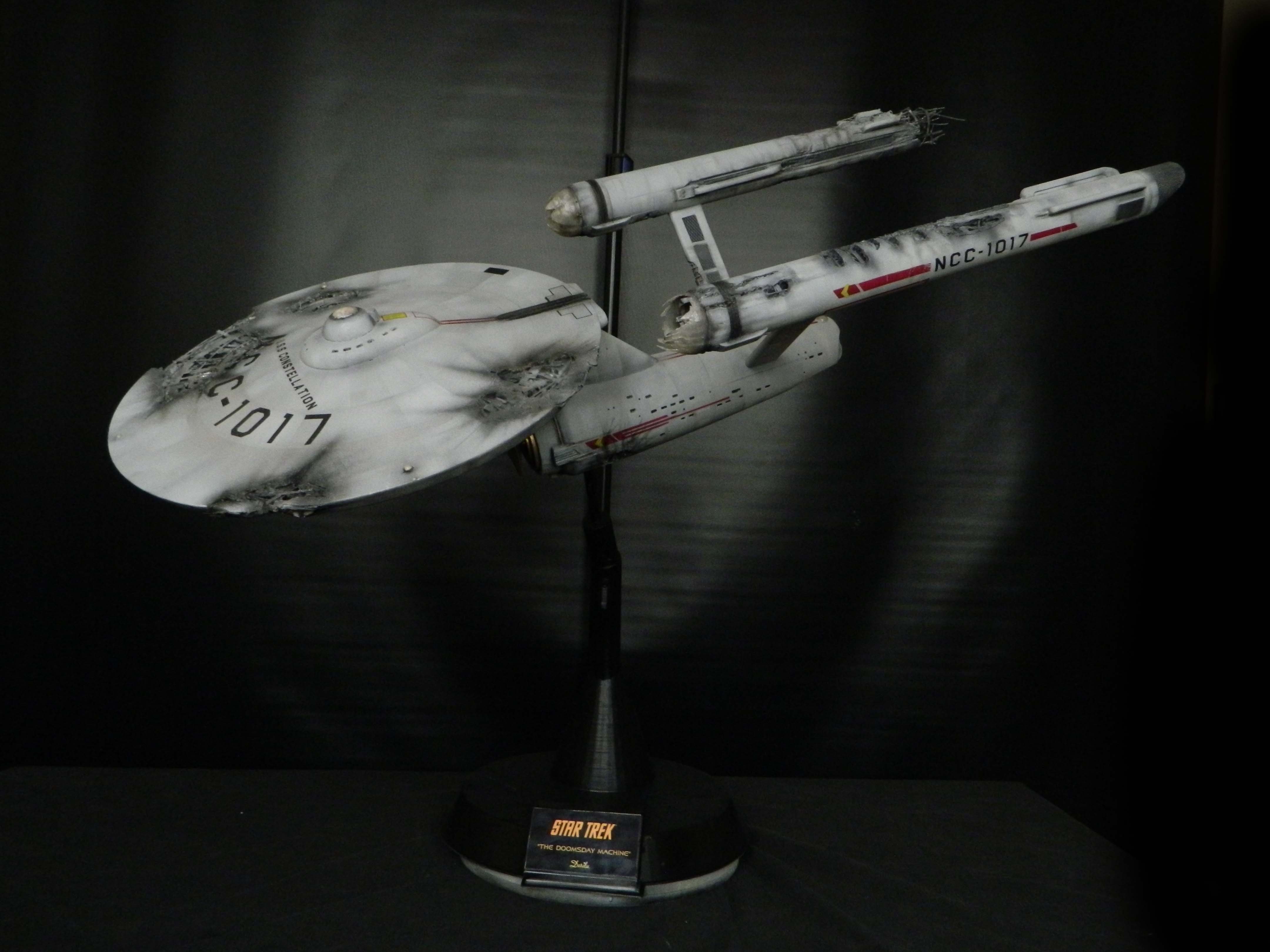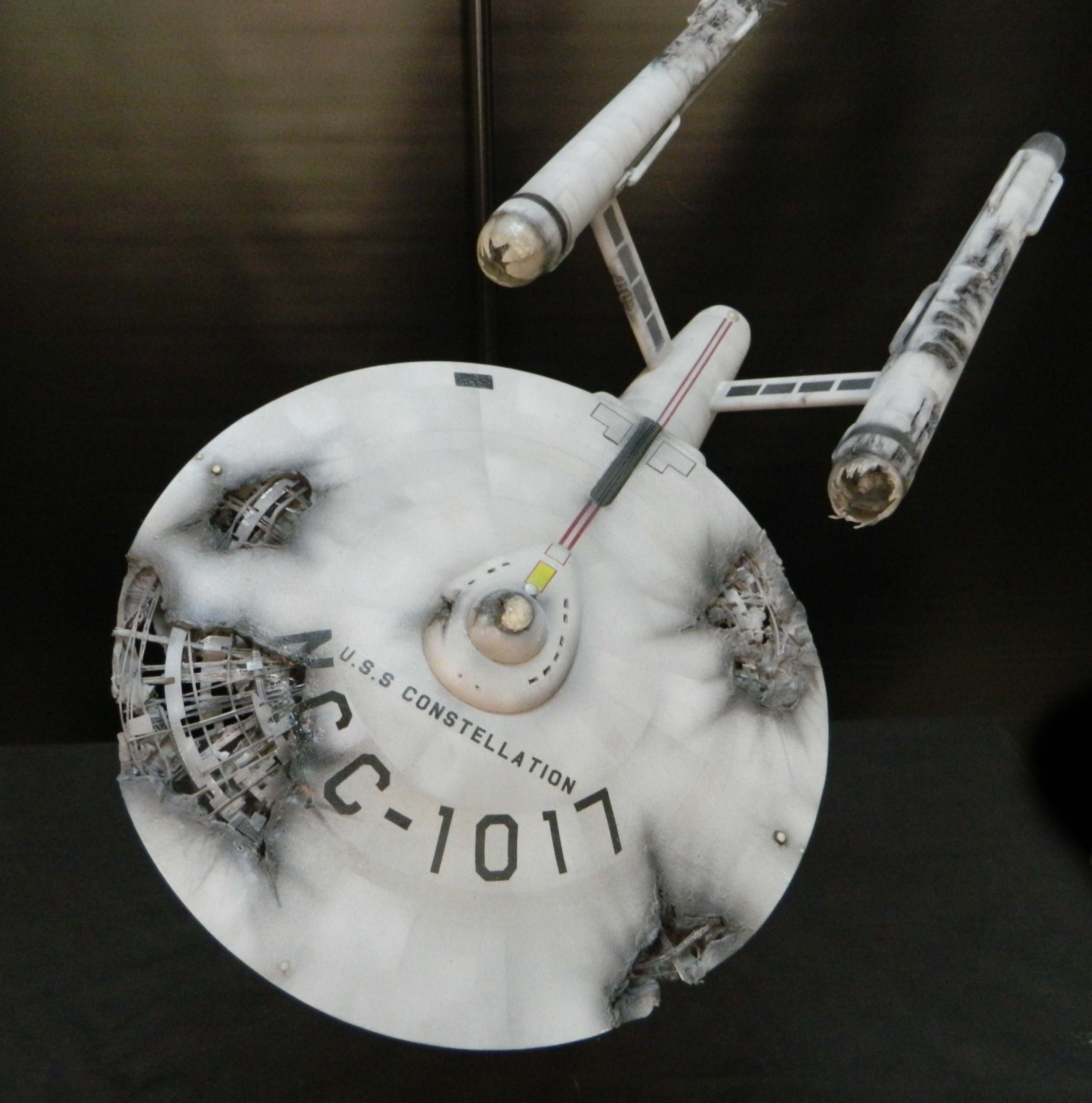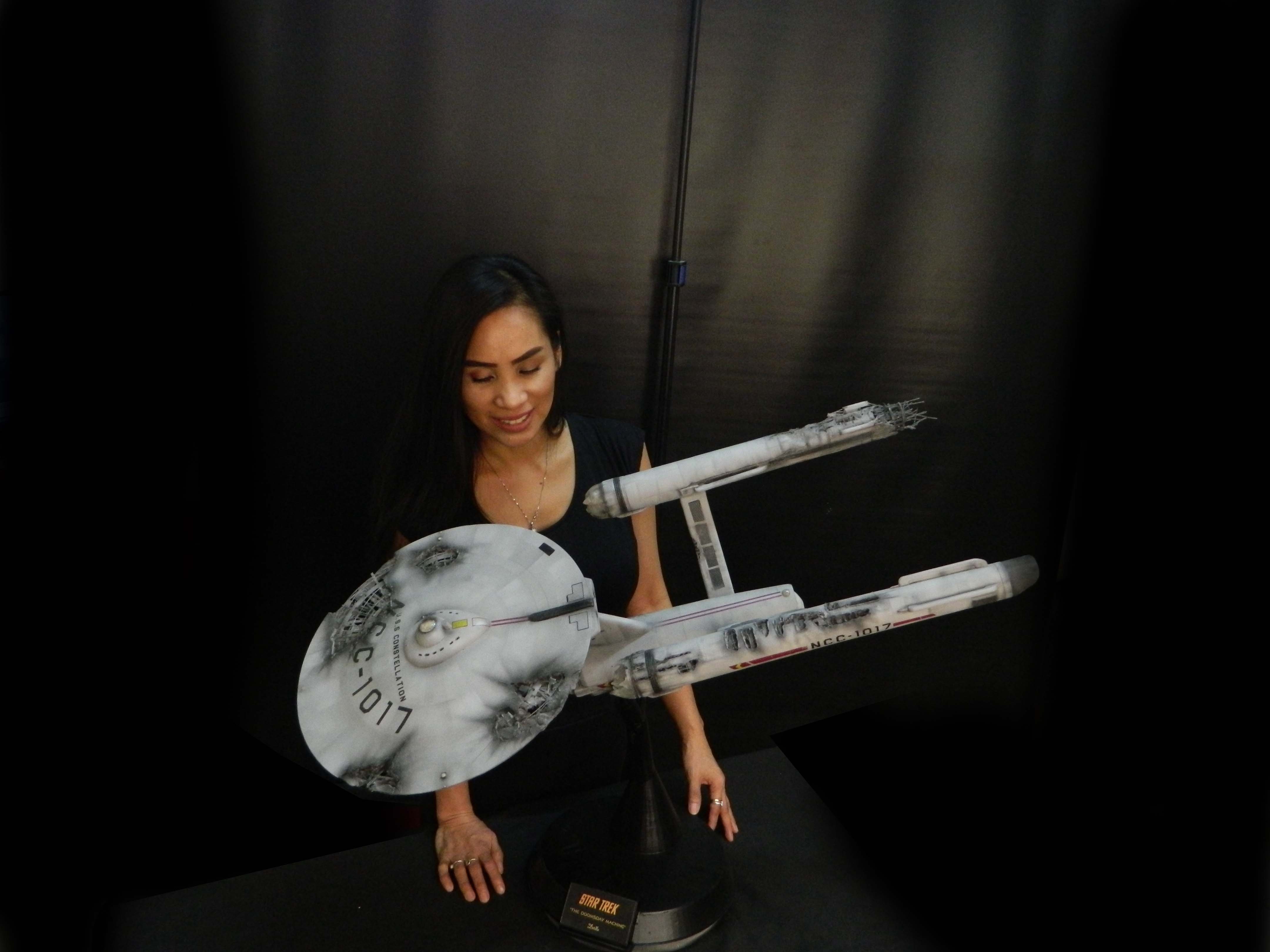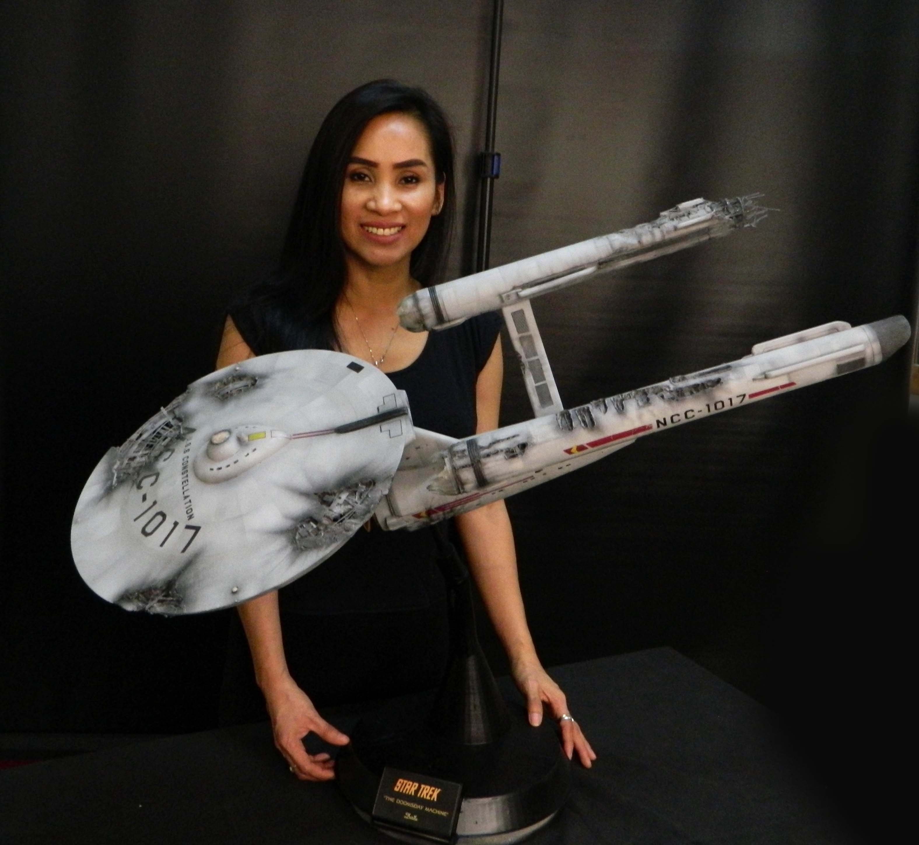 The USS Constellation has always stuck in my mind. The Planet Killer nearly destroyer her, and was eventually destroyed by her. The wreckage we saw in the original series was a simple AMT Model kit. When the HD version came out, the digital model makers for that series really upped what we viewed of this Starship. The twisted metal girders, and sparks… along with open voids of saucer section that leave a chill on my skin ever time I view it. Artist Paul Craggs captured those HD moments greatly in his own 3D printed work of art you see here, along with Paul’s wife in the photos for scale… (or the second model in the photos… heh heh). 😉 The Starship is even sitting on a tilt… as it should be. Beautifully completed.
