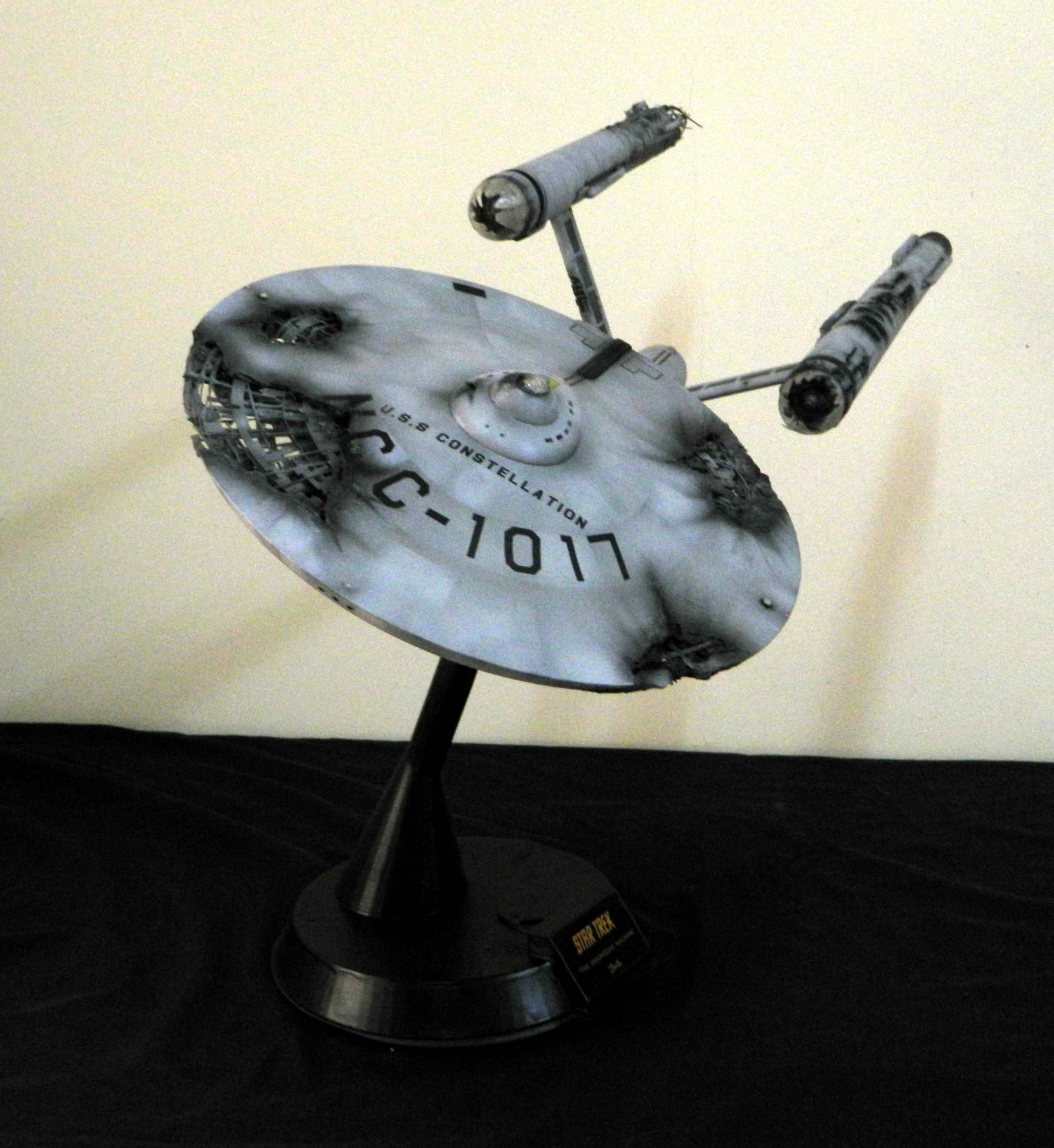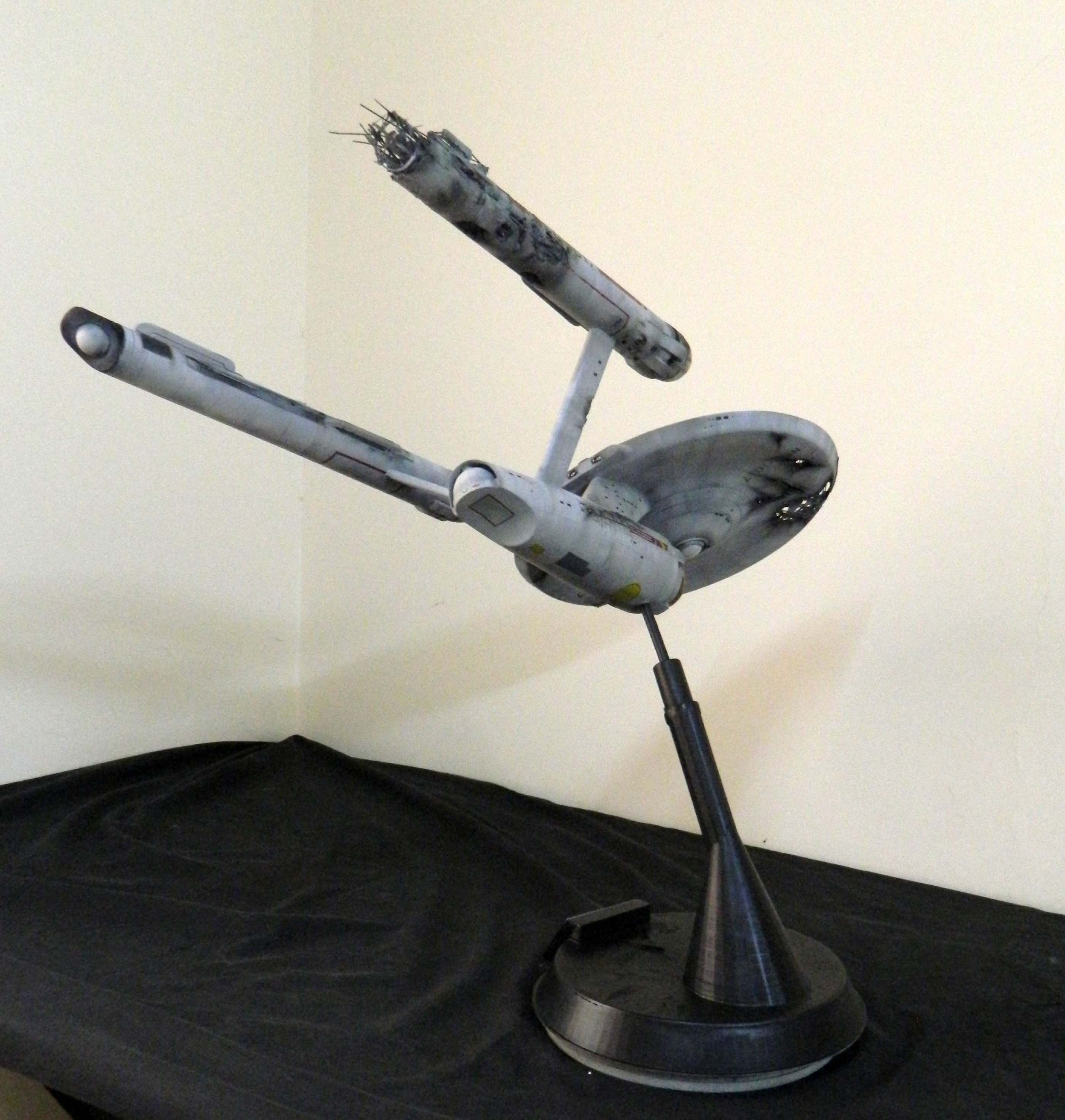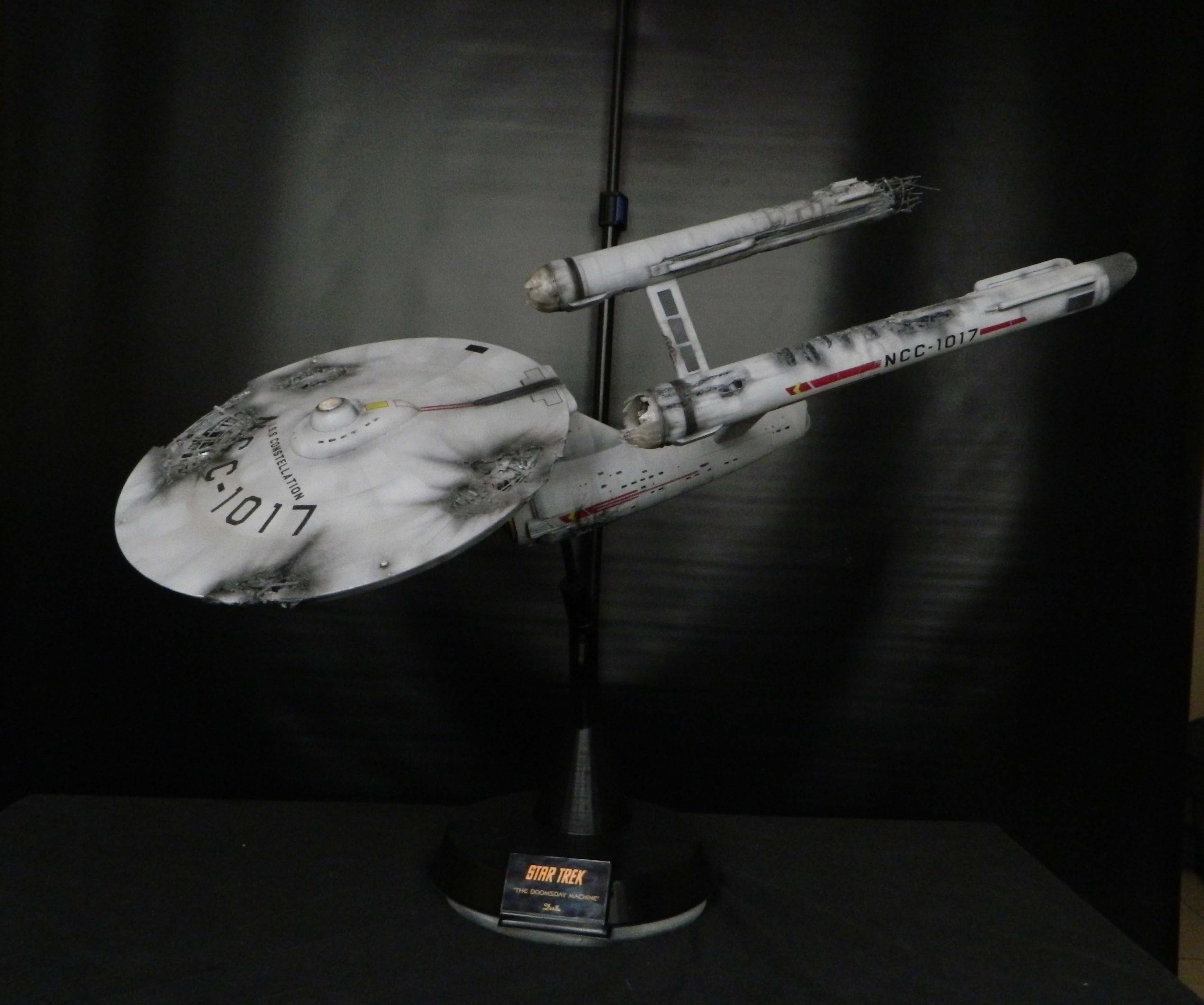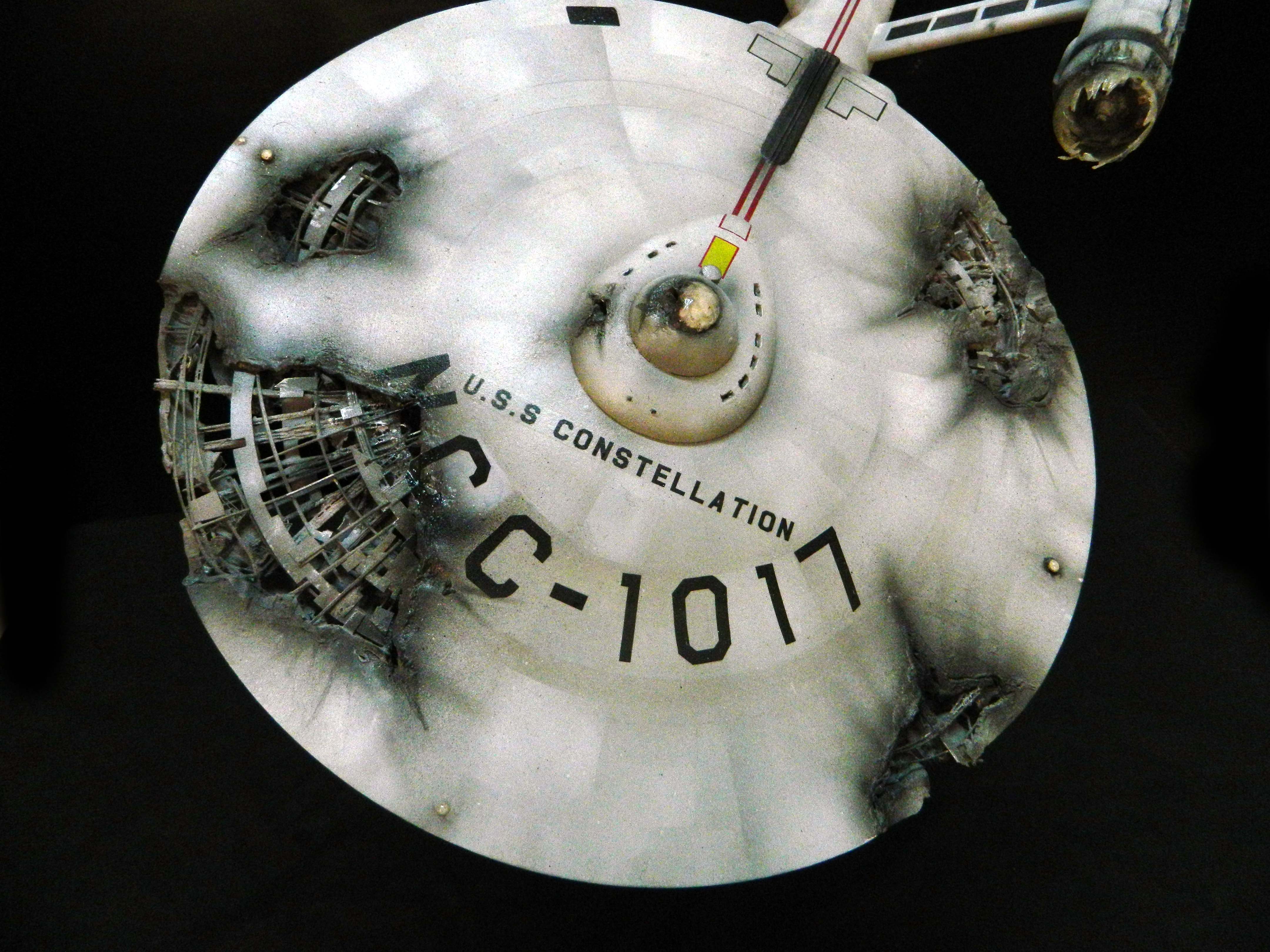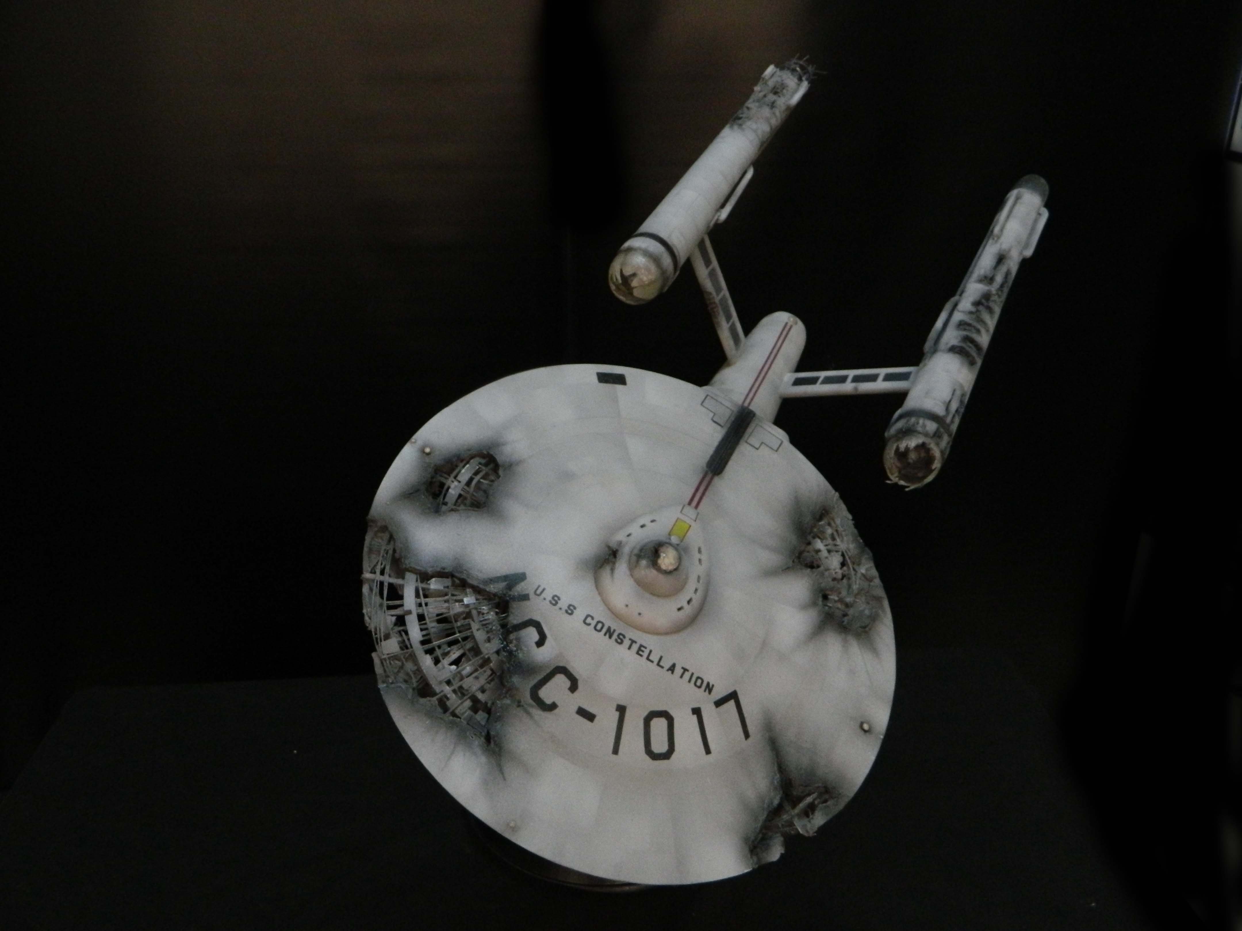 The USS Constellation has always stuck in my mind. The Planet Killer nearly destroyer her, and was eventually destroyed by her. The wreckage we saw in the original series was a simple AMT Model kit. When the HD version came out, the digital model makers for that series really upped what we viewed of this Starship. The twisted metal girders, and sparks… along with open voids of saucer section that leave a chill on my skin ever time I view it. Artist Paul Craggs captured those HD moments greatly in his own 3D printed work of art you see here, along with Paul’s wife in the photos for scale… (or the second model in the photos… heh heh). 😉 The Starship is even sitting on a tilt… as it should be. Beautifully completed.