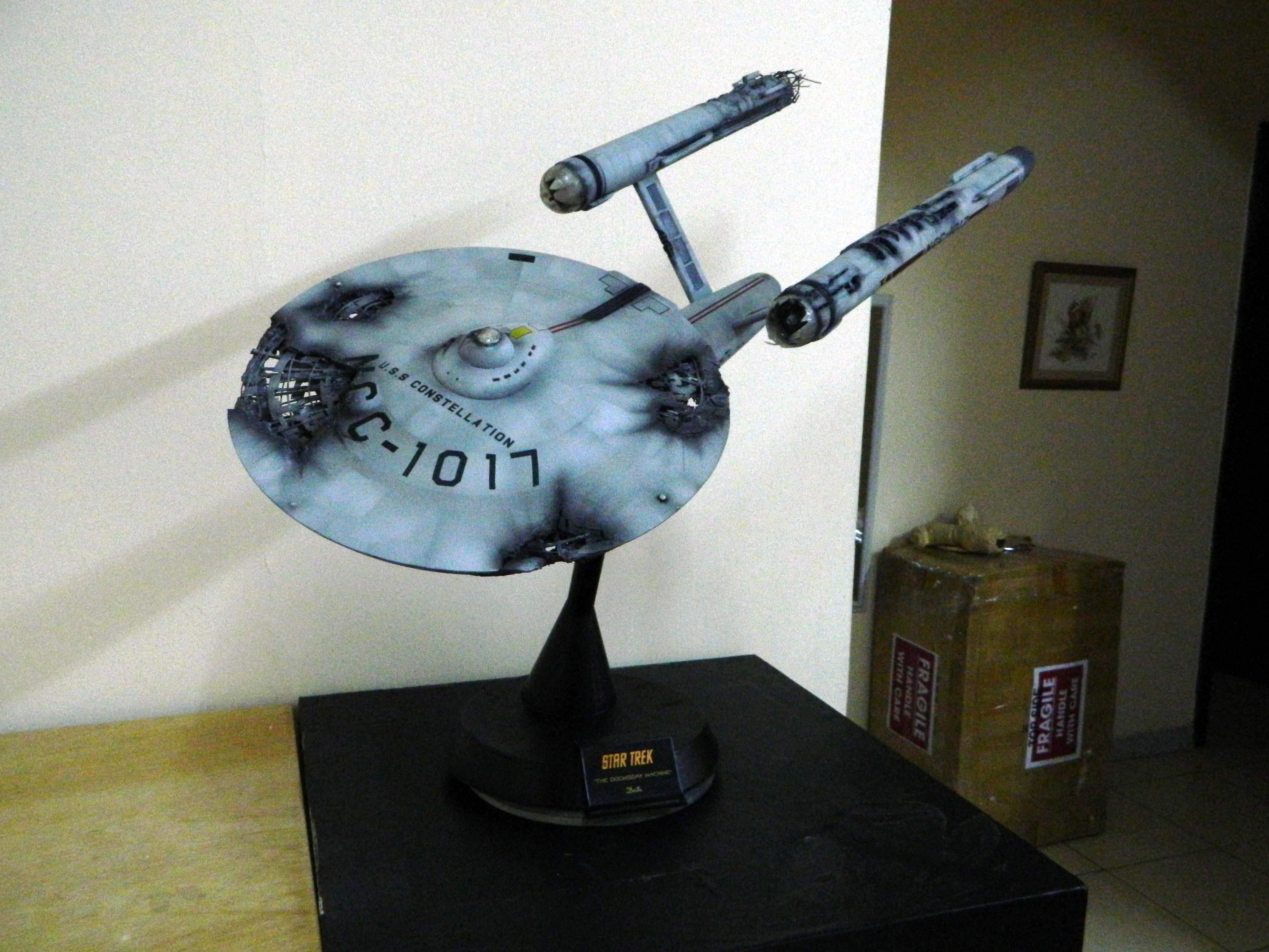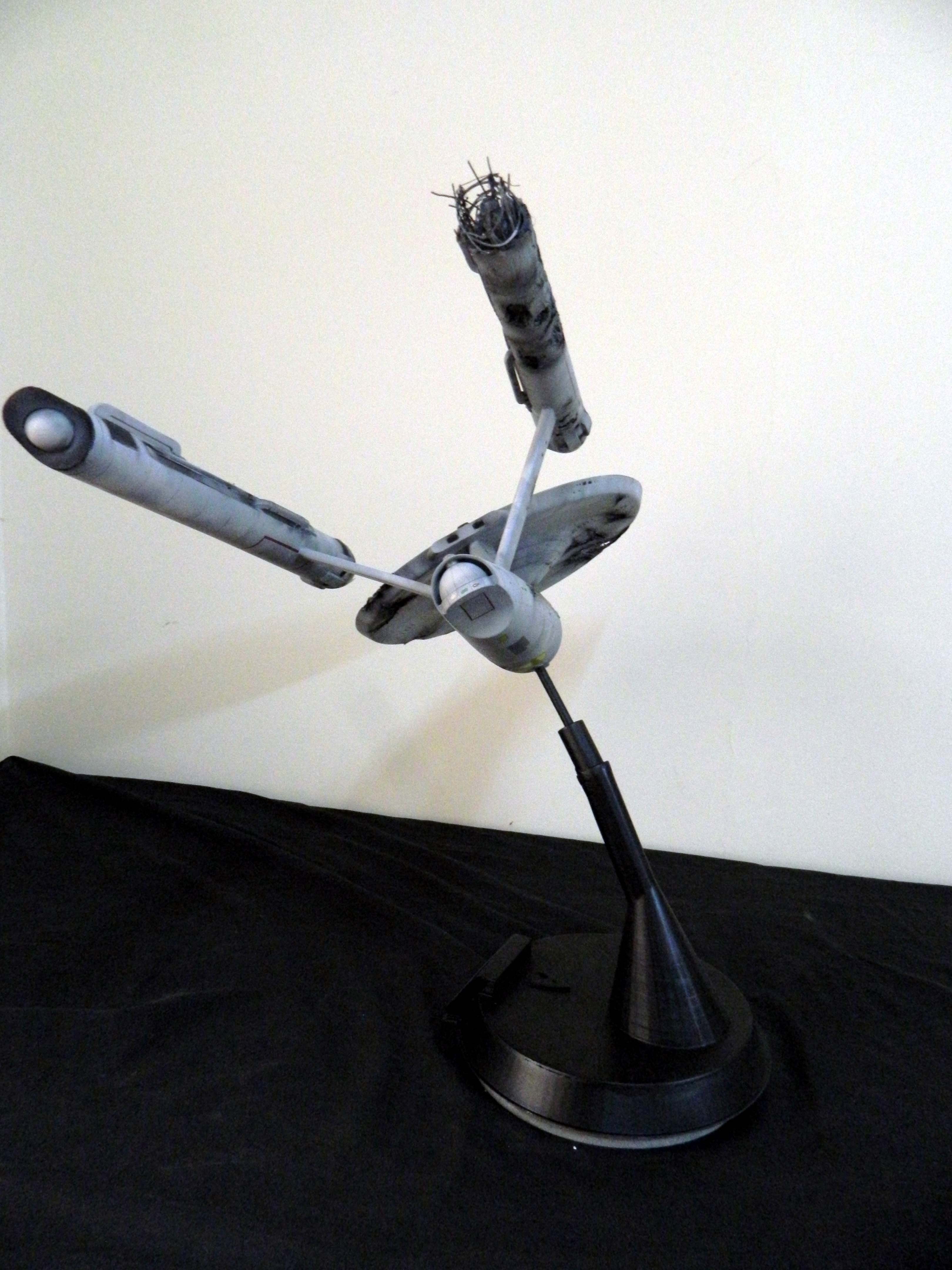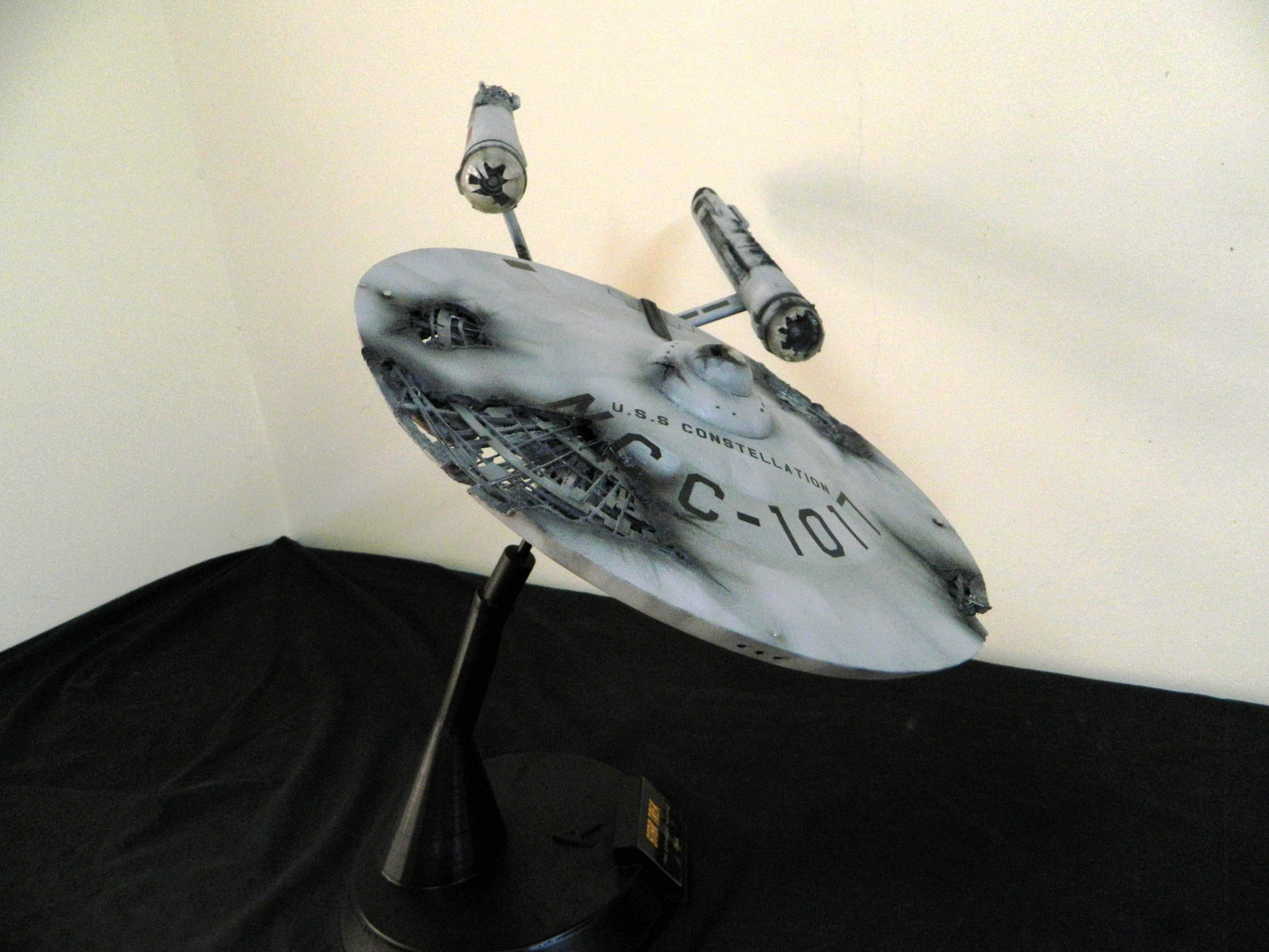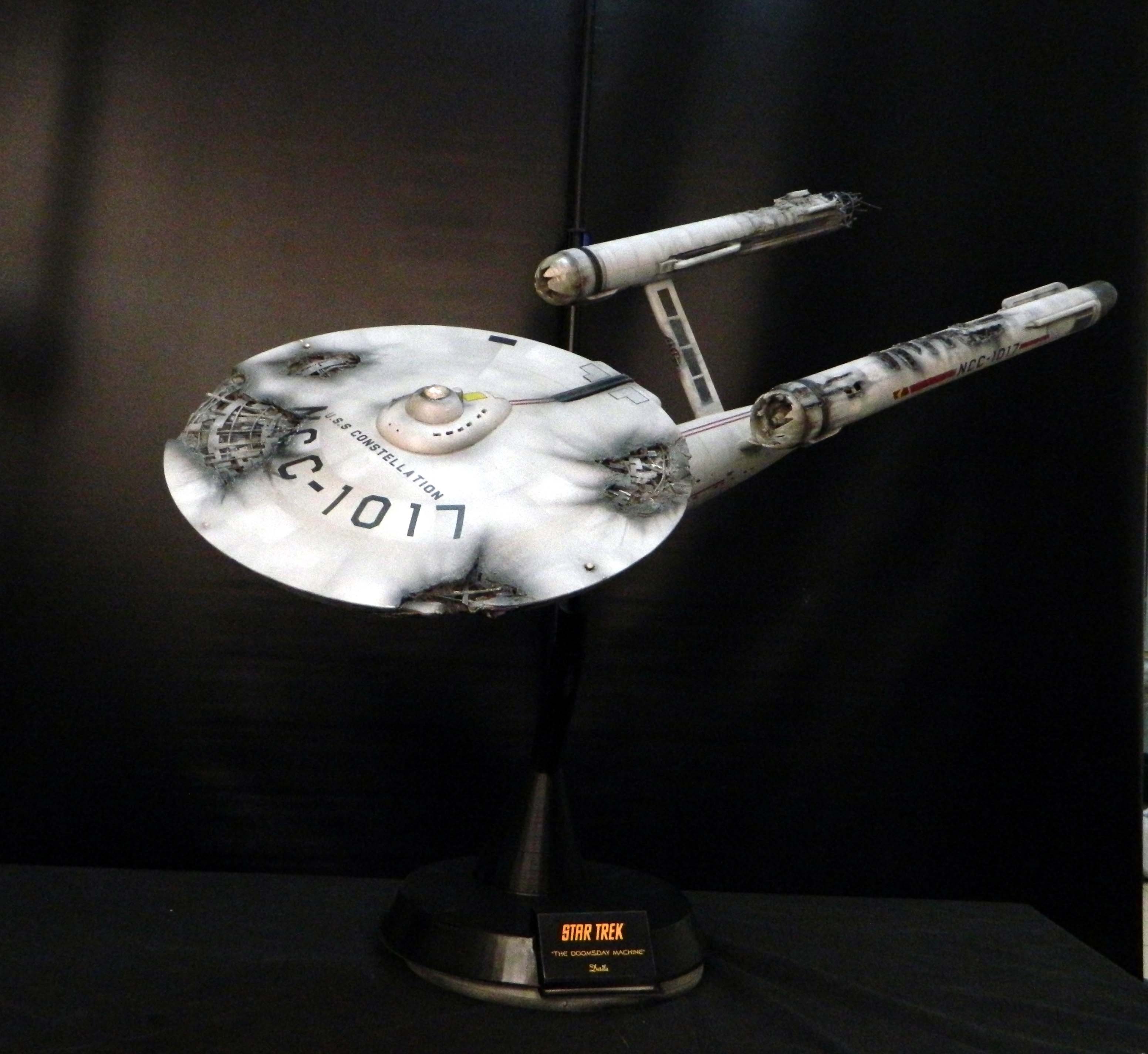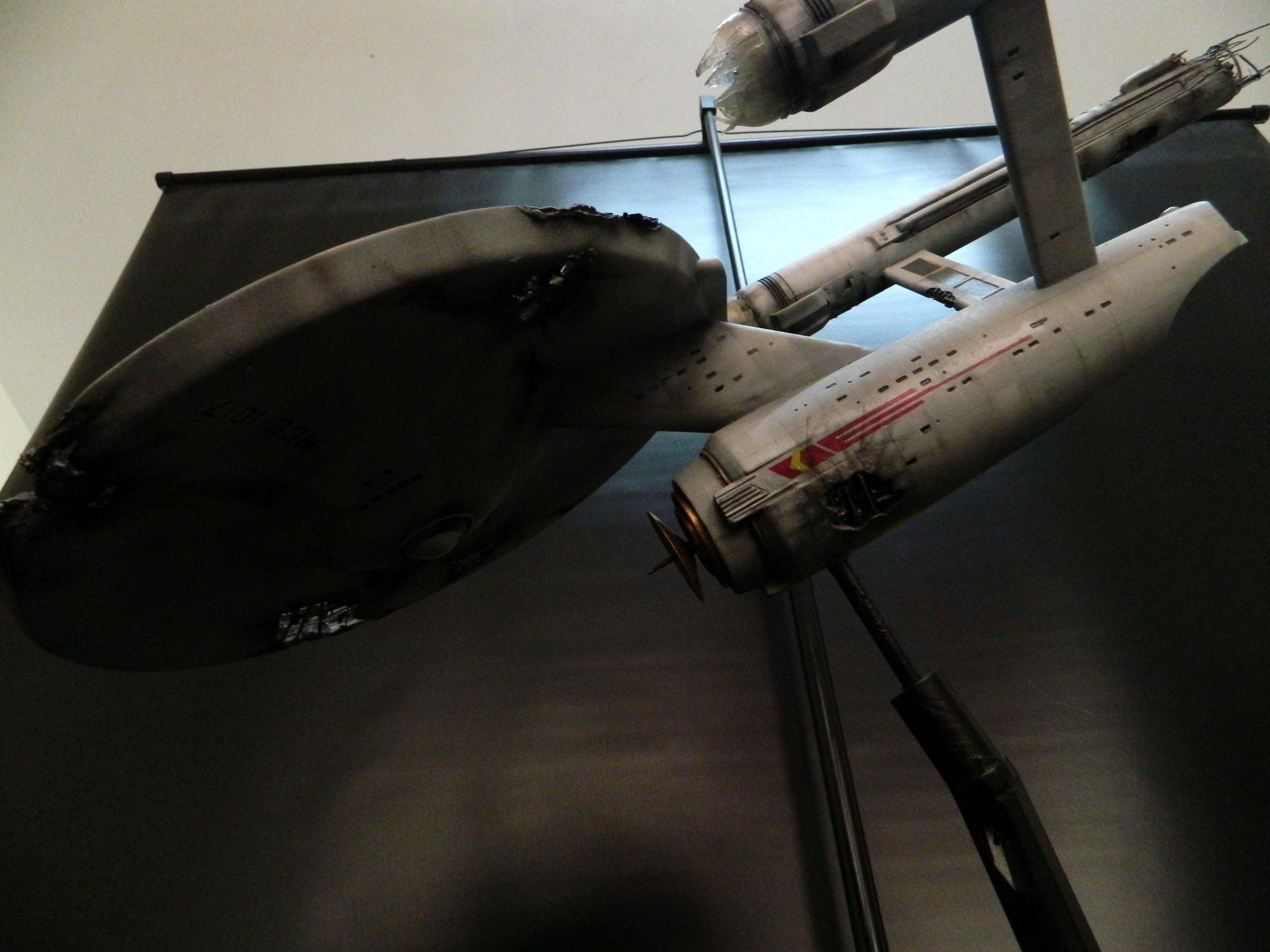 The USS Constellation has always stuck in my mind. The Planet Killer nearly destroyer her, and was eventually destroyed by her. The wreckage we saw in the original series was a simple AMT Model kit. When the HD version came out, the digital model makers for that series really upped what we viewed of this Starship. The twisted metal girders, and sparks… along with open voids of saucer section that leave a chill on my skin ever time I view it. Artist Paul Craggs captured those HD moments greatly in his own 3D printed work of art you see here, along with Paul’s wife in the photos for scale… (or the second model in the photos… heh heh). 😉 The Starship is even sitting on a tilt… as it should be. Beautifully completed.