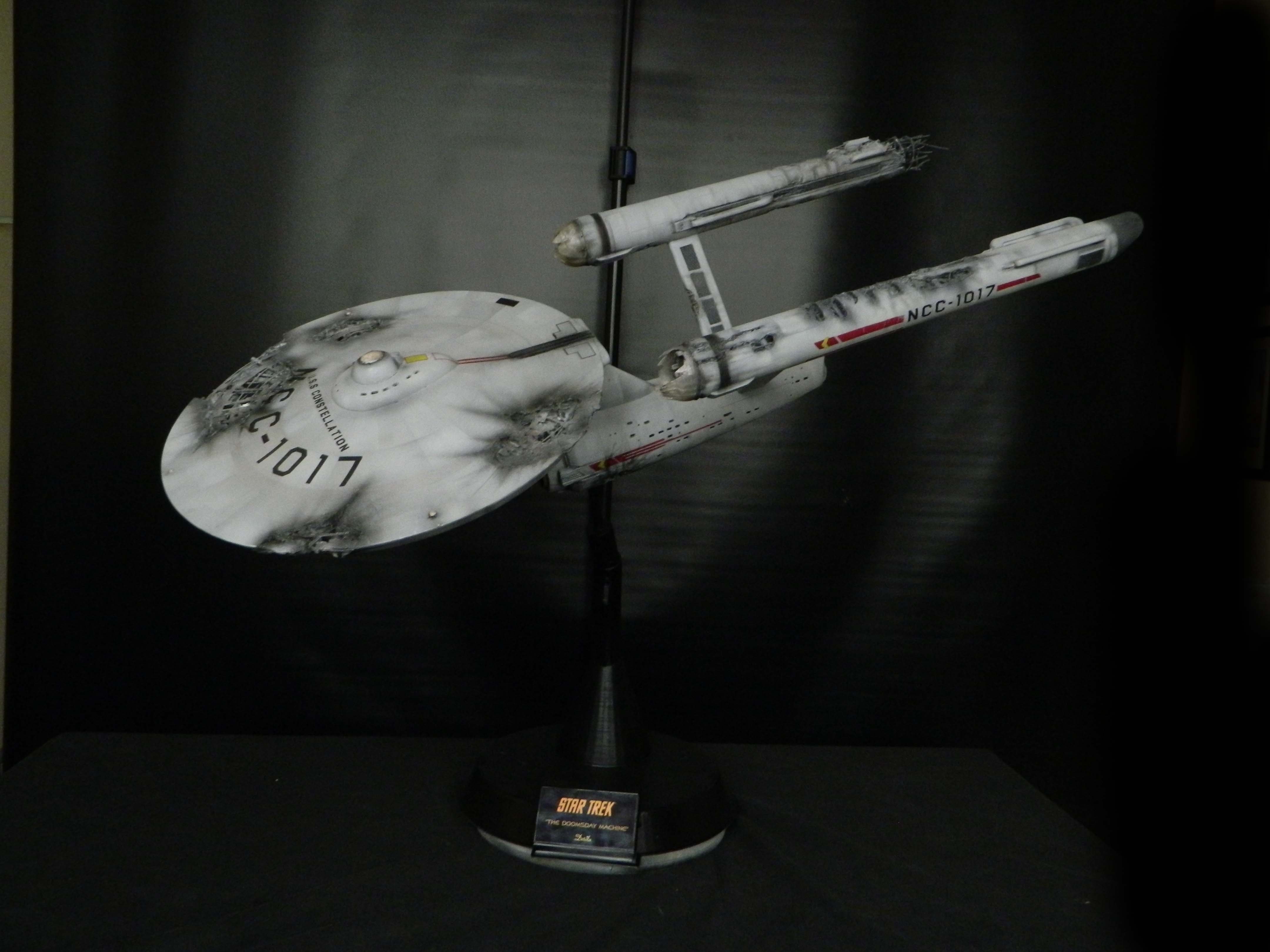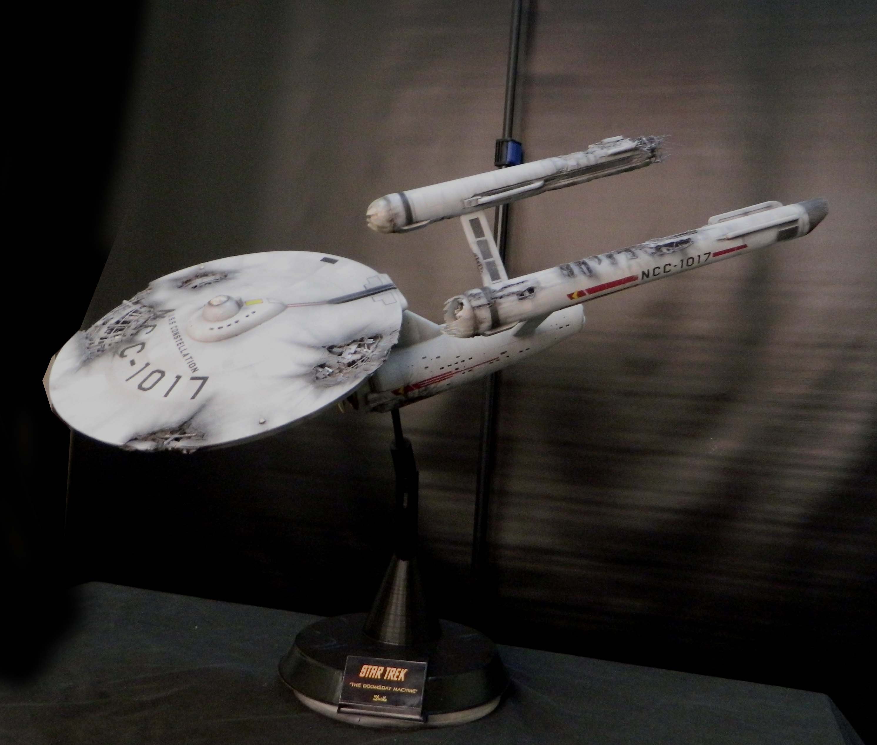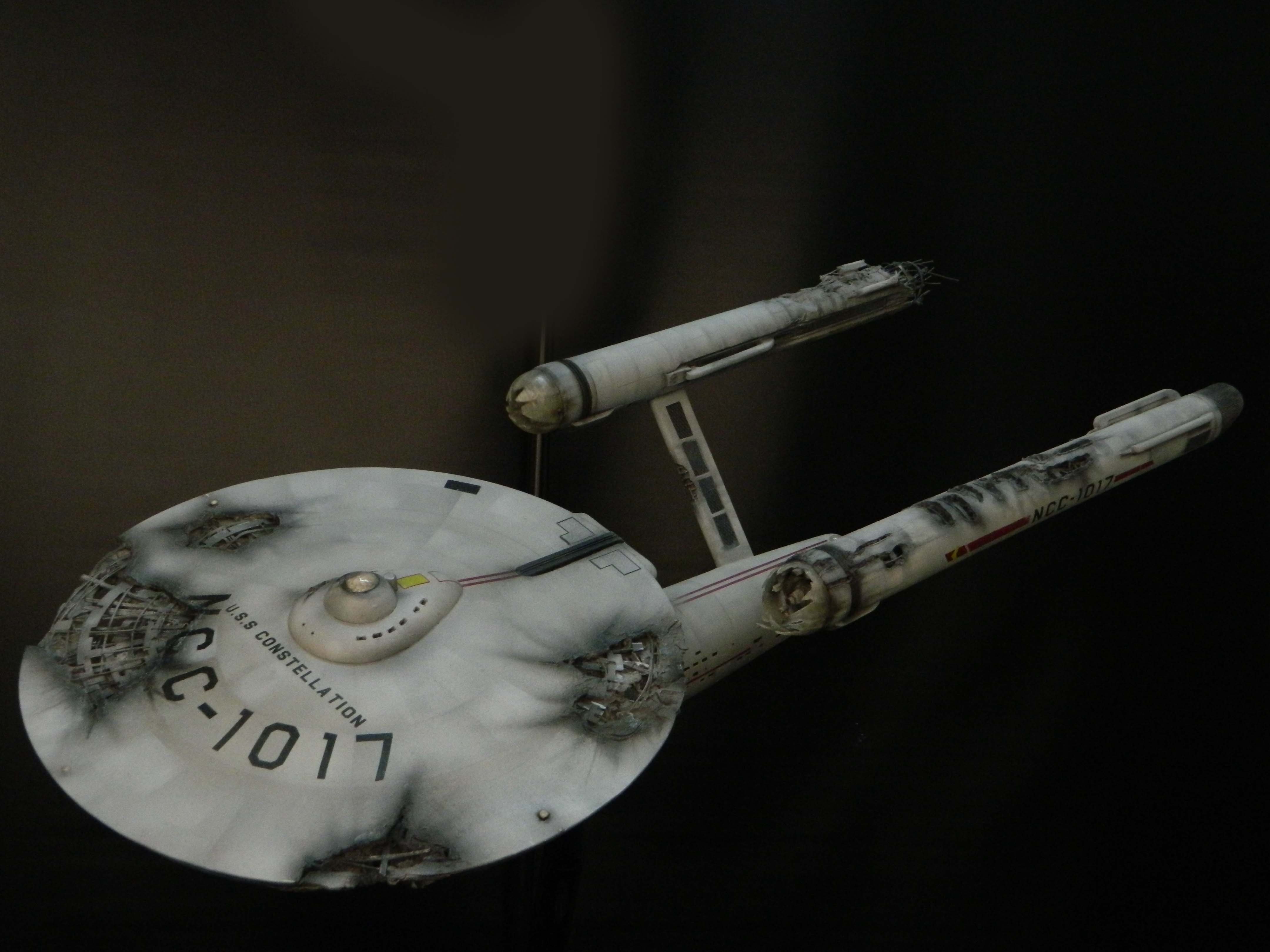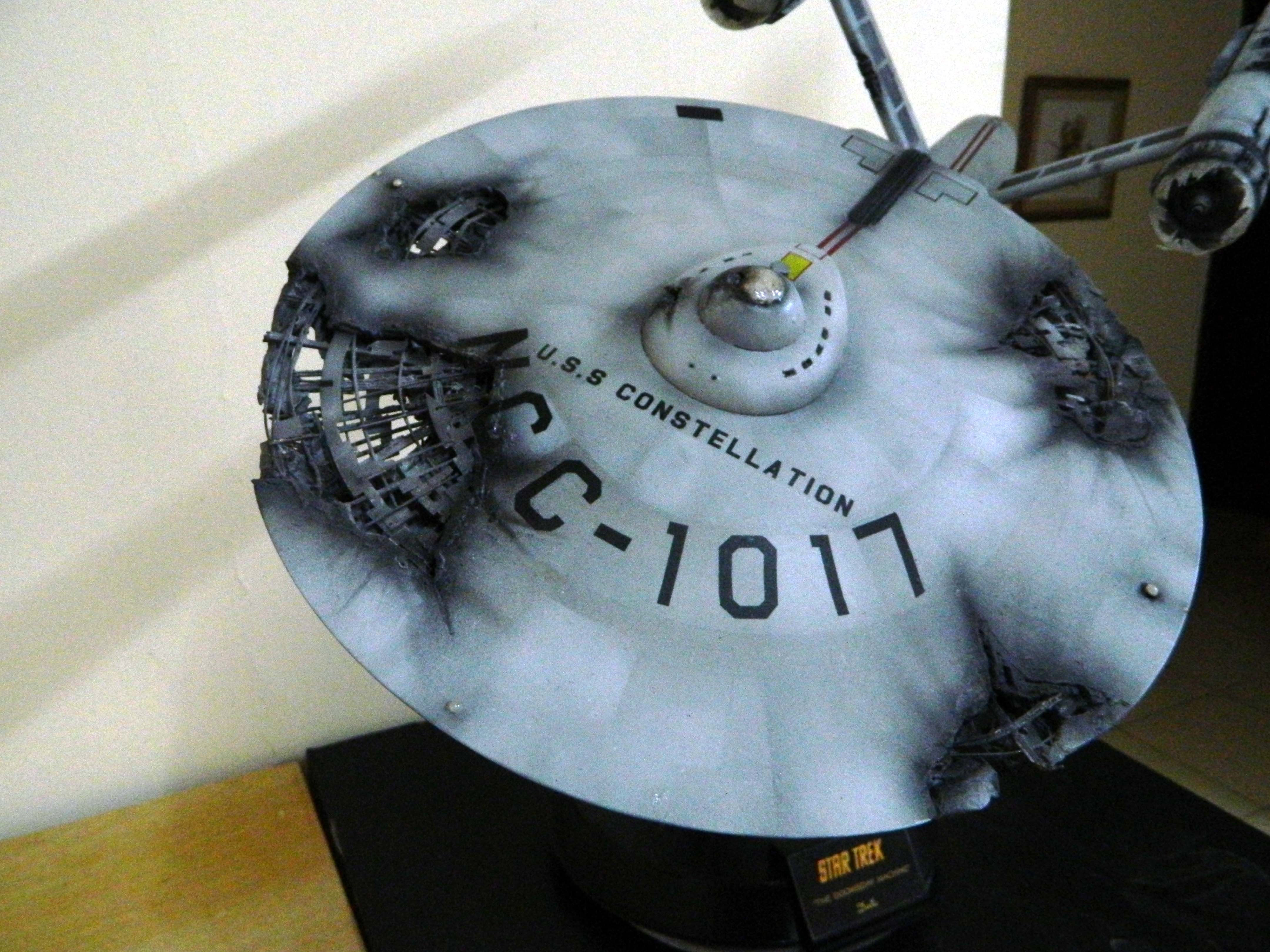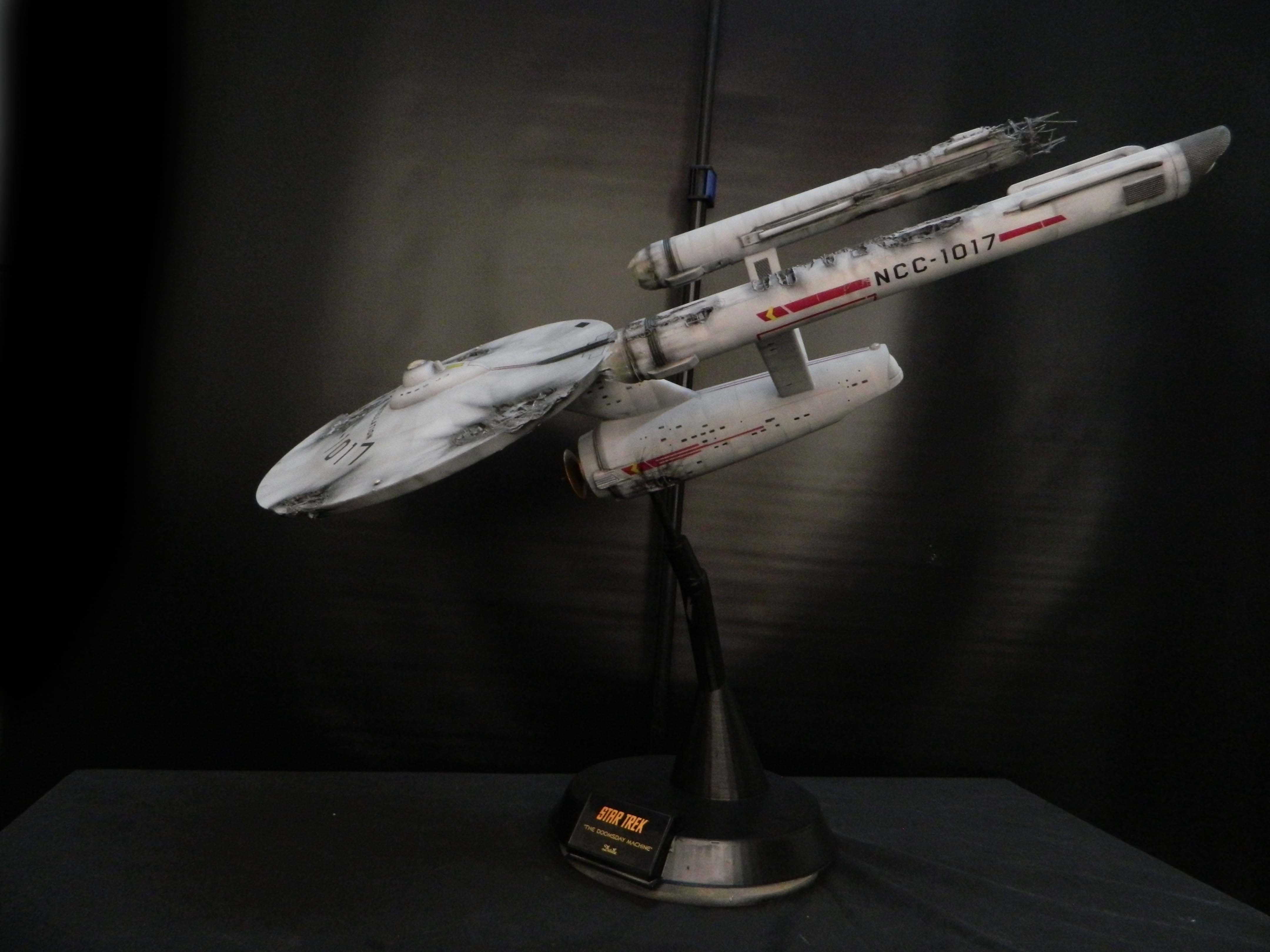 The USS Constellation has always stuck in my mind. The Planet Killer nearly destroyer her, and was eventually destroyed by her. The wreckage we saw in the original series was a simple AMT Model kit. When the HD version came out, the digital model makers for that series really upped what we viewed of this Starship. The twisted metal girders, and sparks… along with open voids of saucer section that leave a chill on my skin ever time I view it. Artist Paul Craggs captured those HD moments greatly in his own 3D printed work of art you see here, along with Paul’s wife in the photos for scale… (or the second model in the photos… heh heh). 😉 The Starship is even sitting on a tilt… as it should be. Beautifully completed.