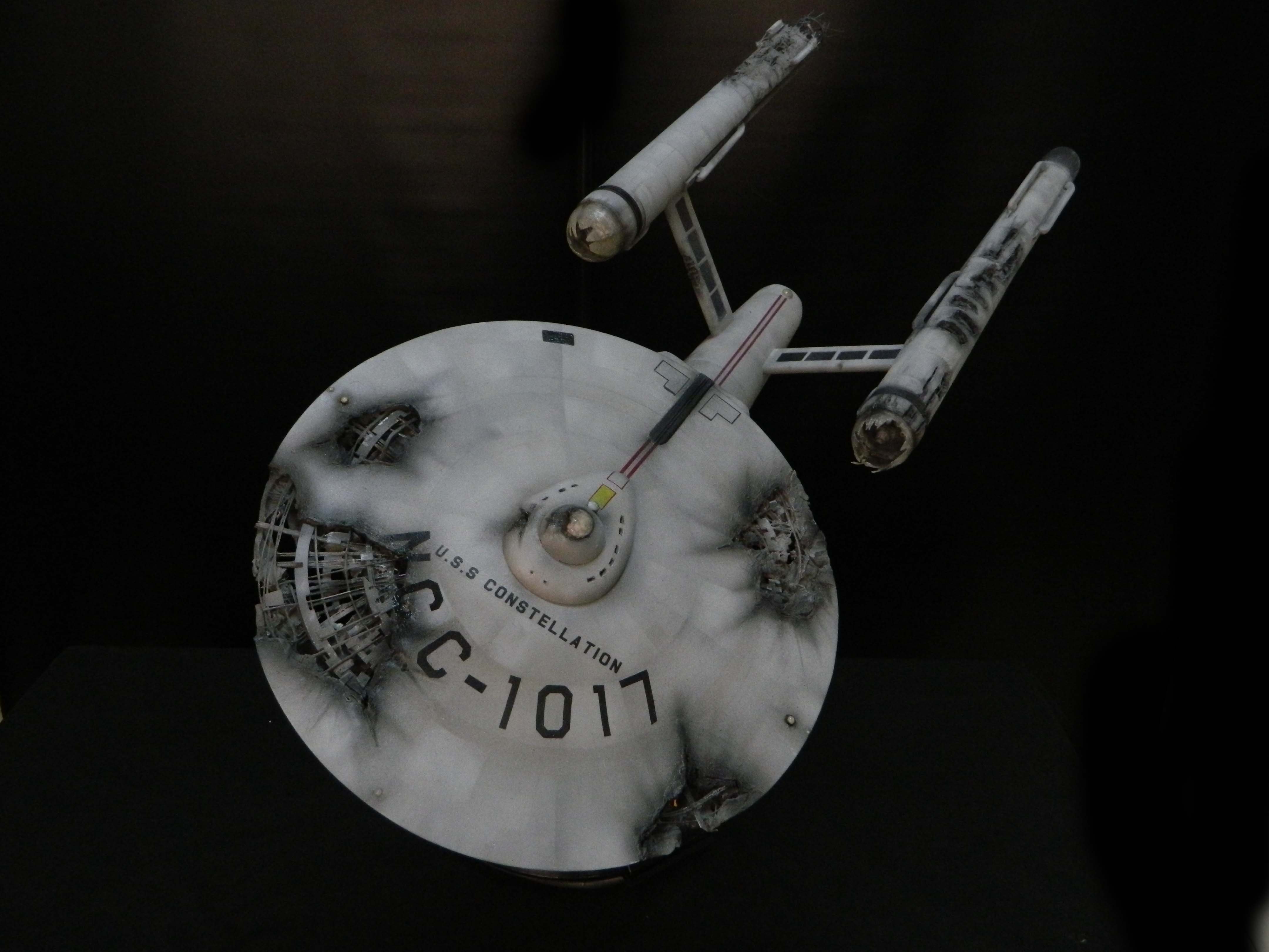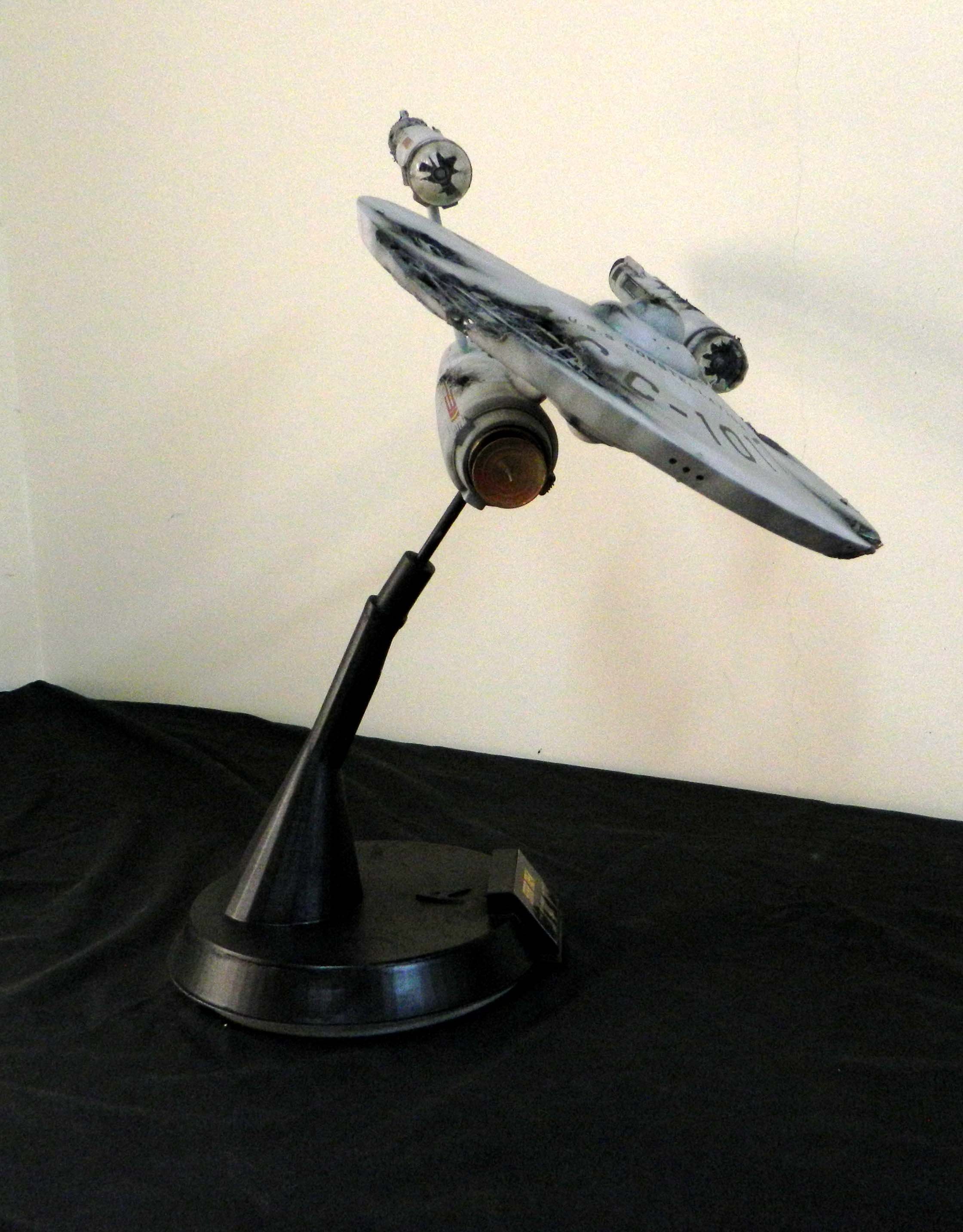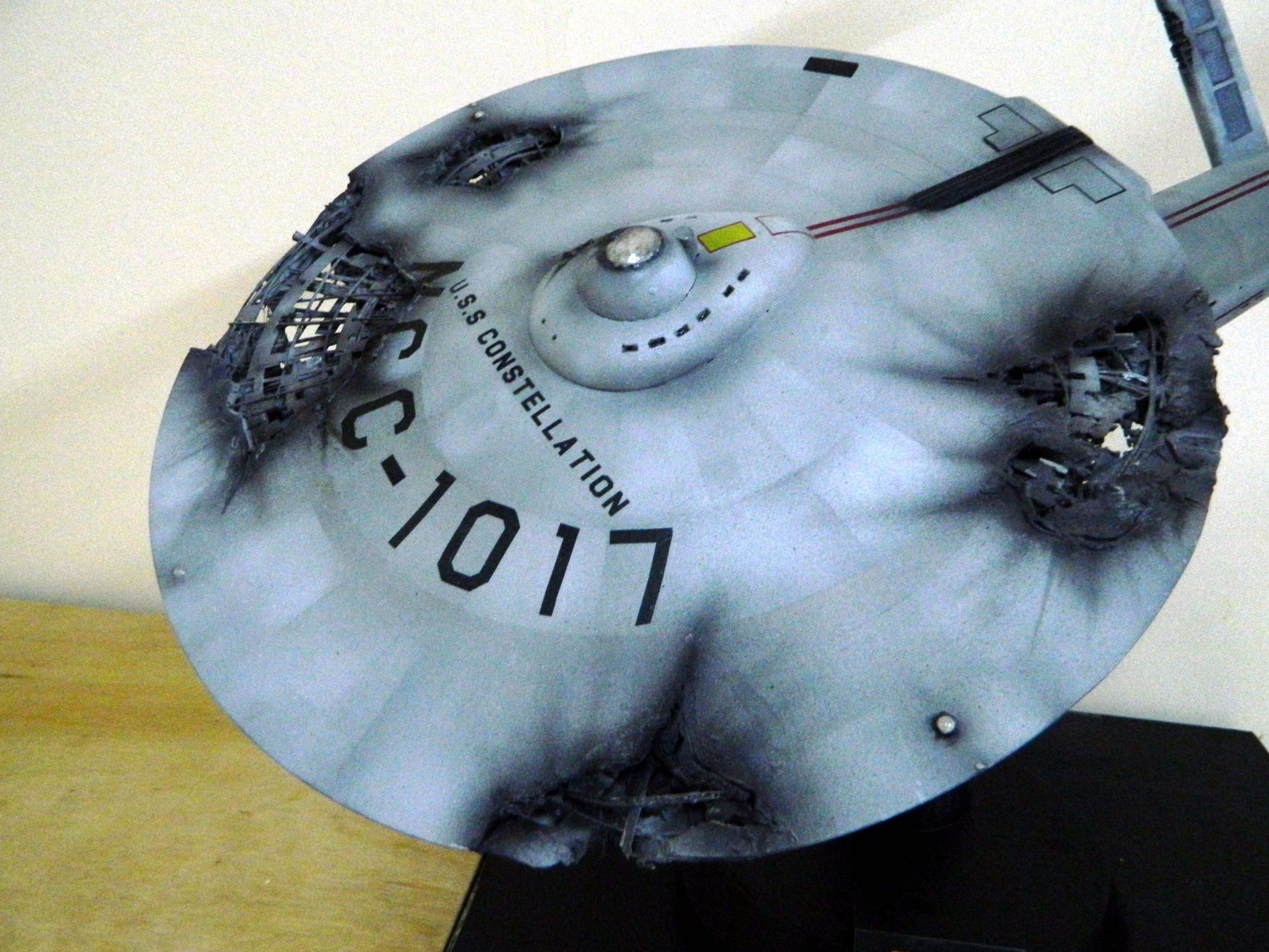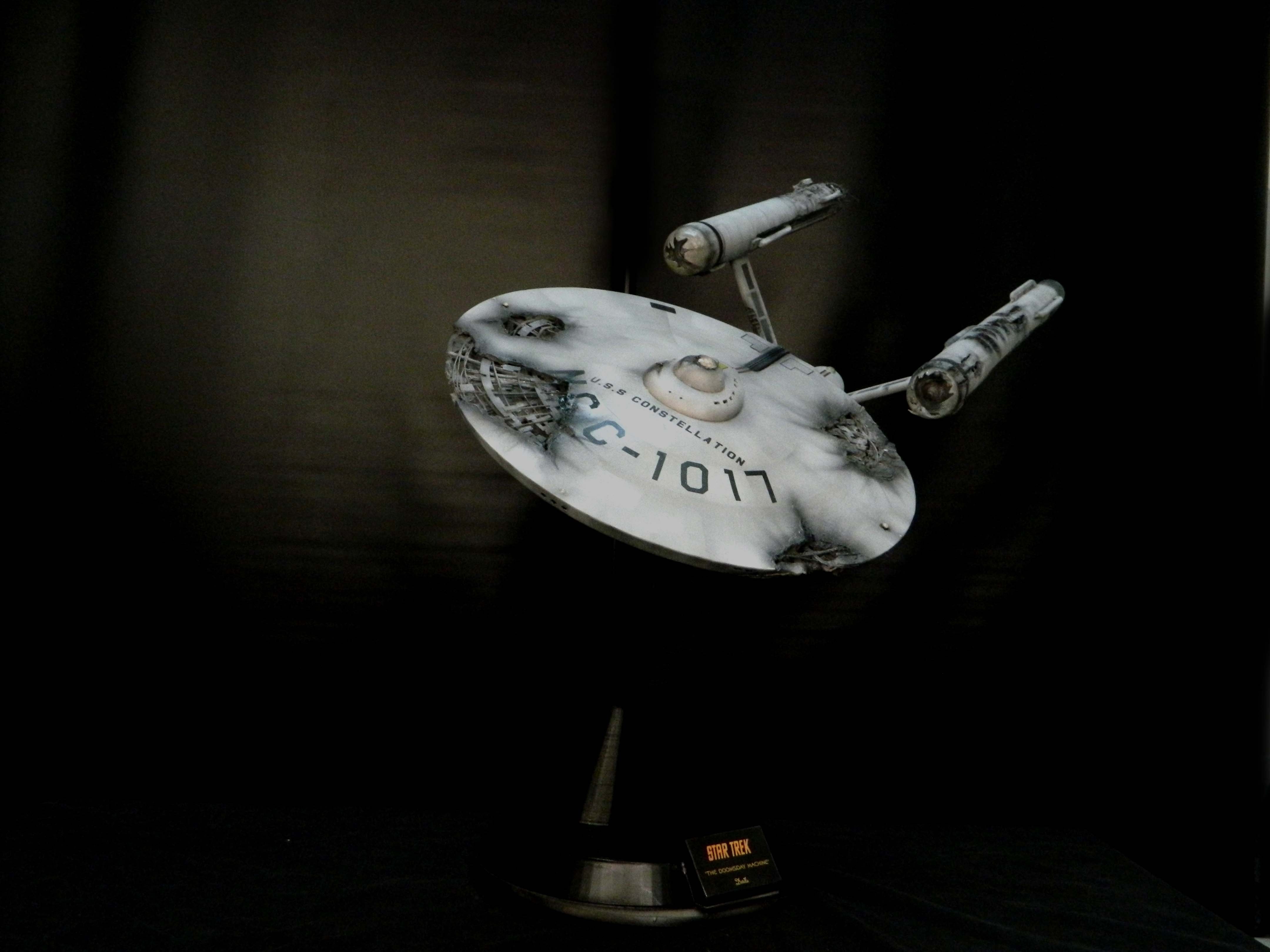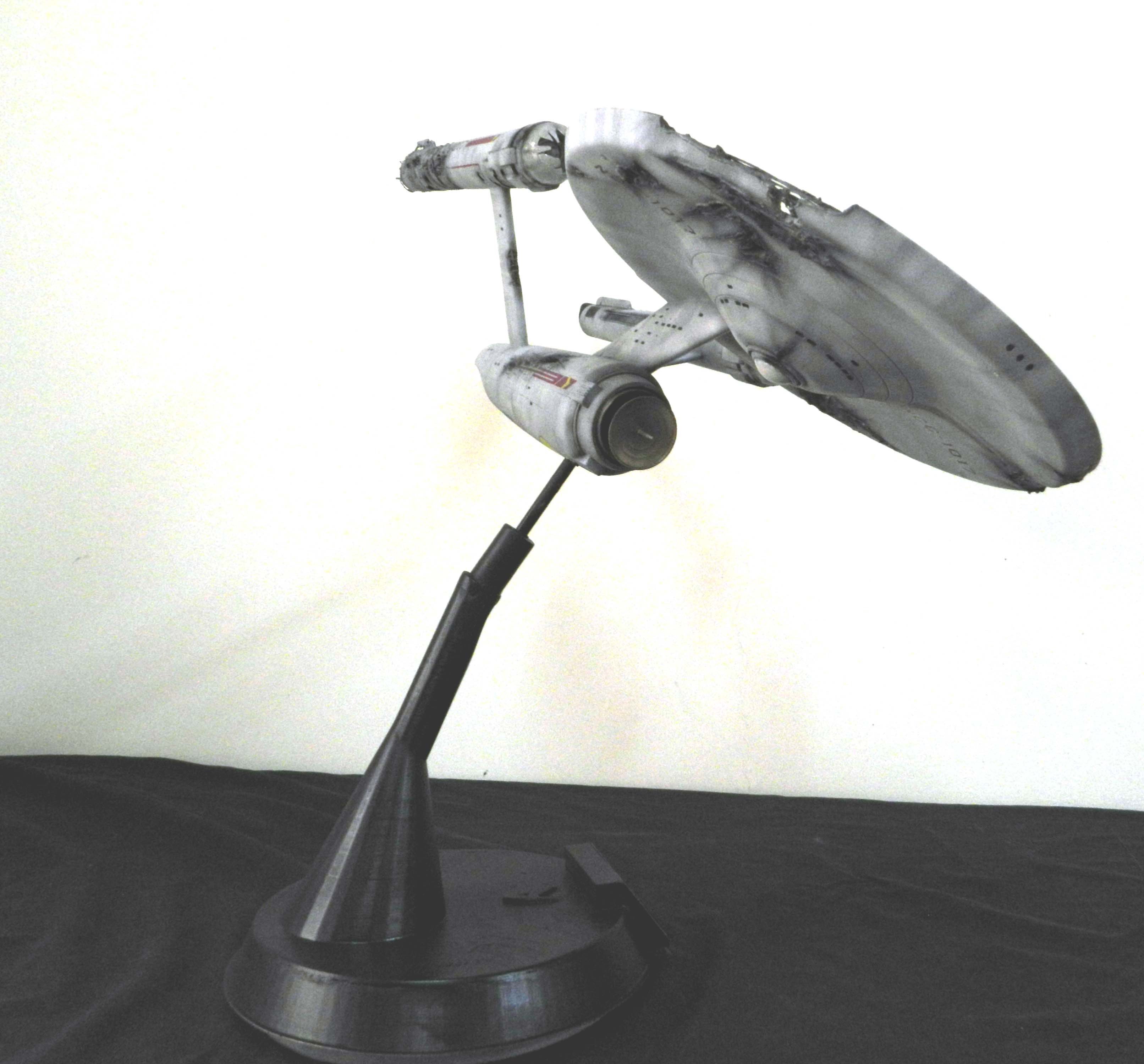 The USS Constellation has always stuck in my mind. The Planet Killer nearly destroyer her, and was eventually destroyed by her. The wreckage we saw in the original series was a simple AMT Model kit. When the HD version came out, the digital model makers for that series really upped what we viewed of this Starship. The twisted metal girders, and sparks… along with open voids of saucer section that leave a chill on my skin ever time I view it. Artist Paul Craggs captured those HD moments greatly in his own 3D printed work of art you see here, along with Paul’s wife in the photos for scale… (or the second model in the photos… heh heh). 😉 The Starship is even sitting on a tilt… as it should be. Beautifully completed.