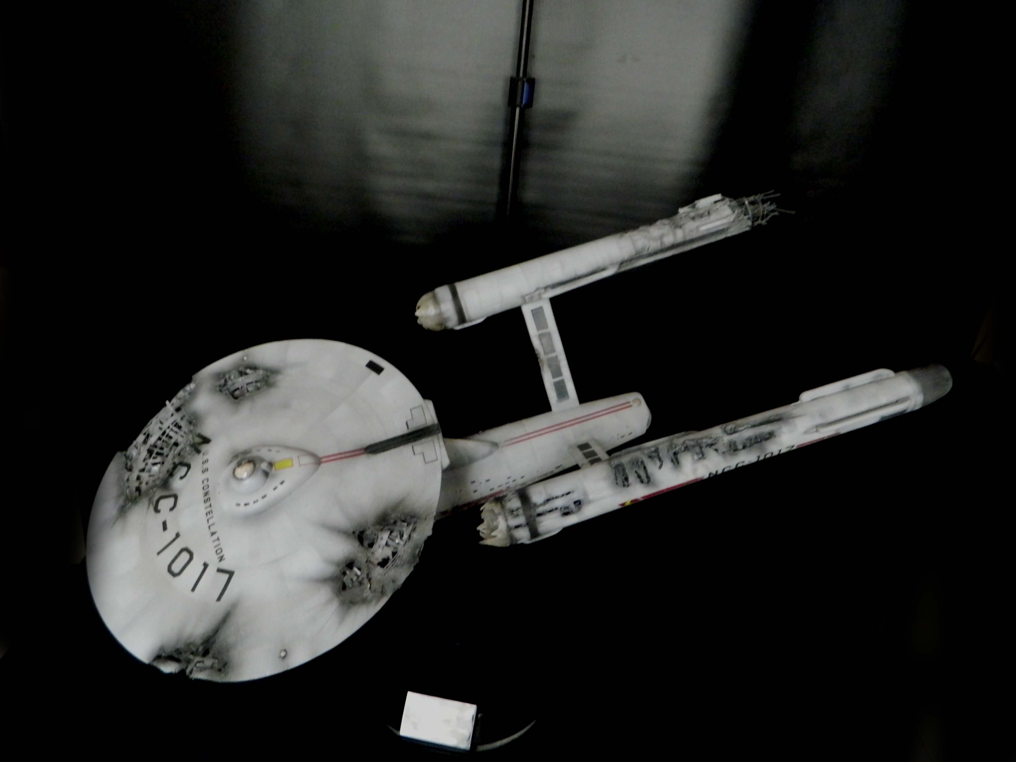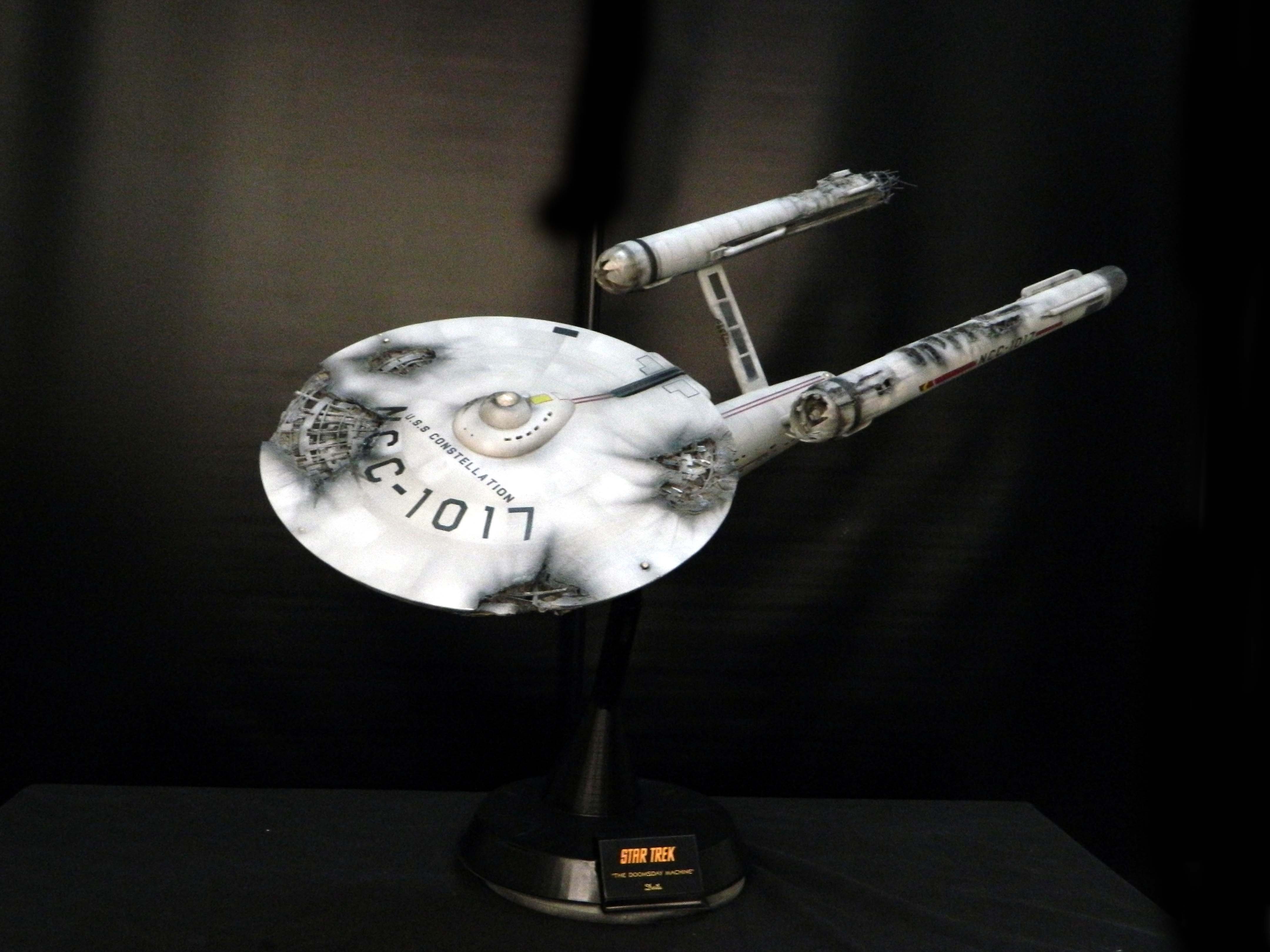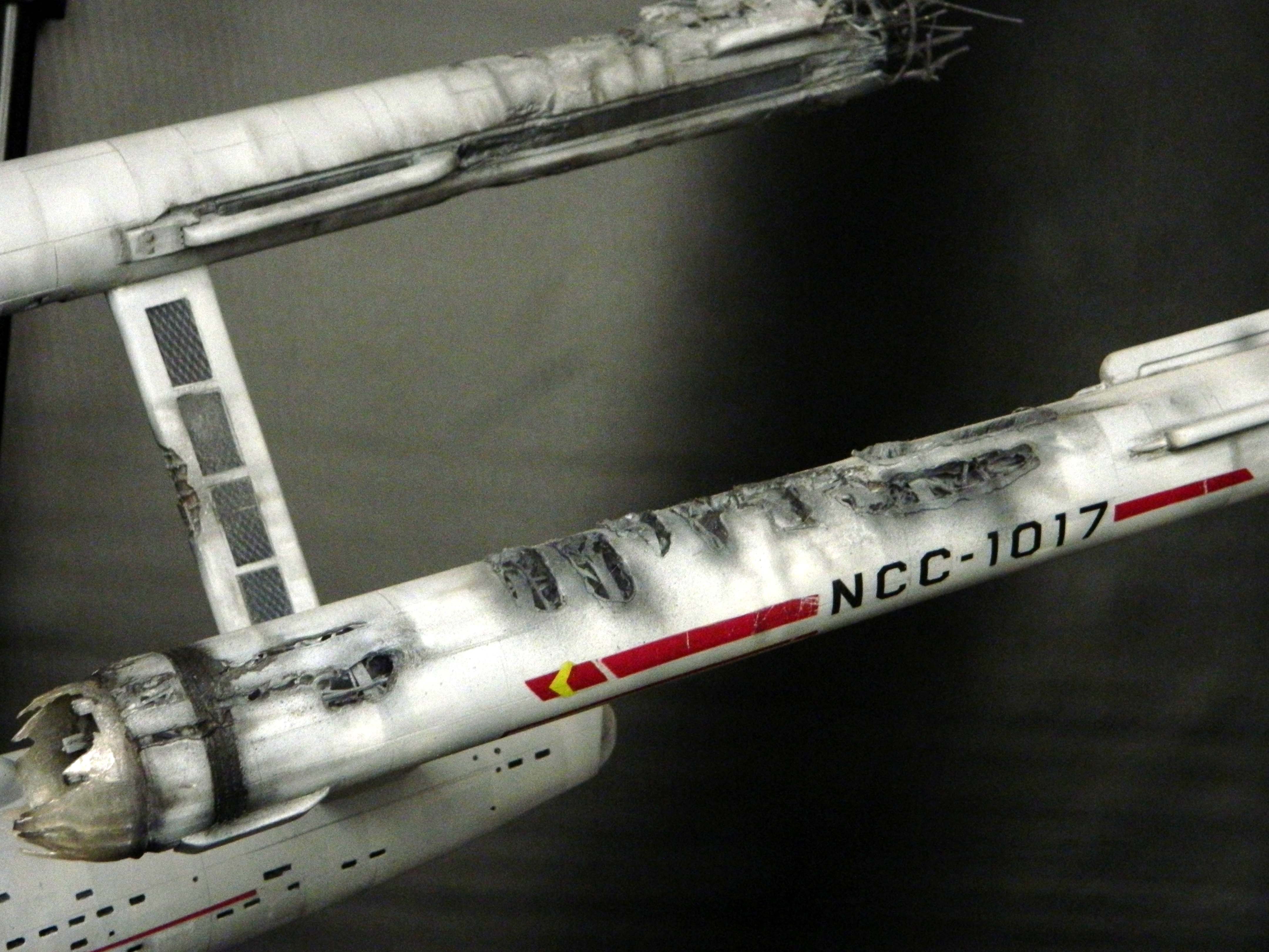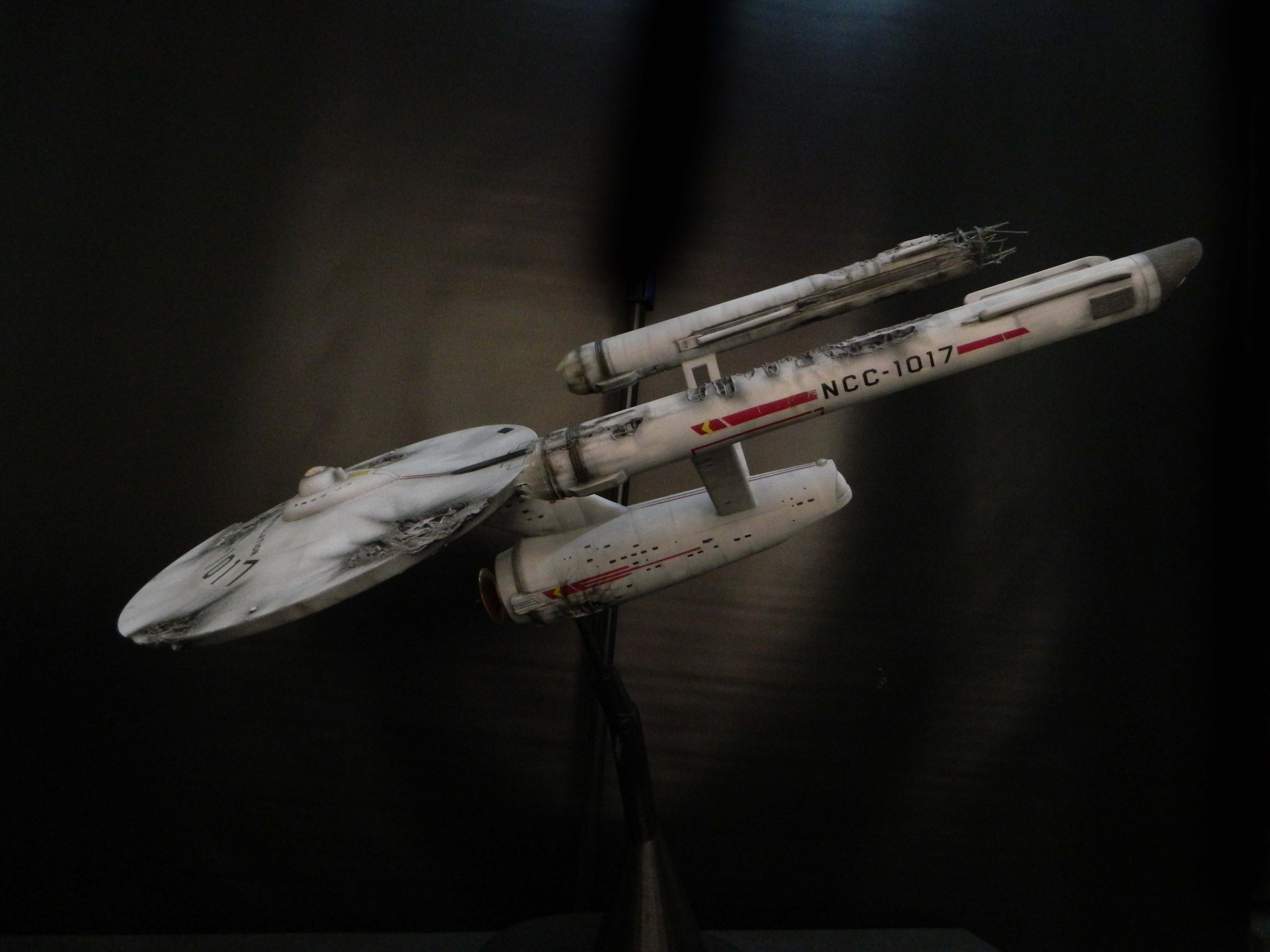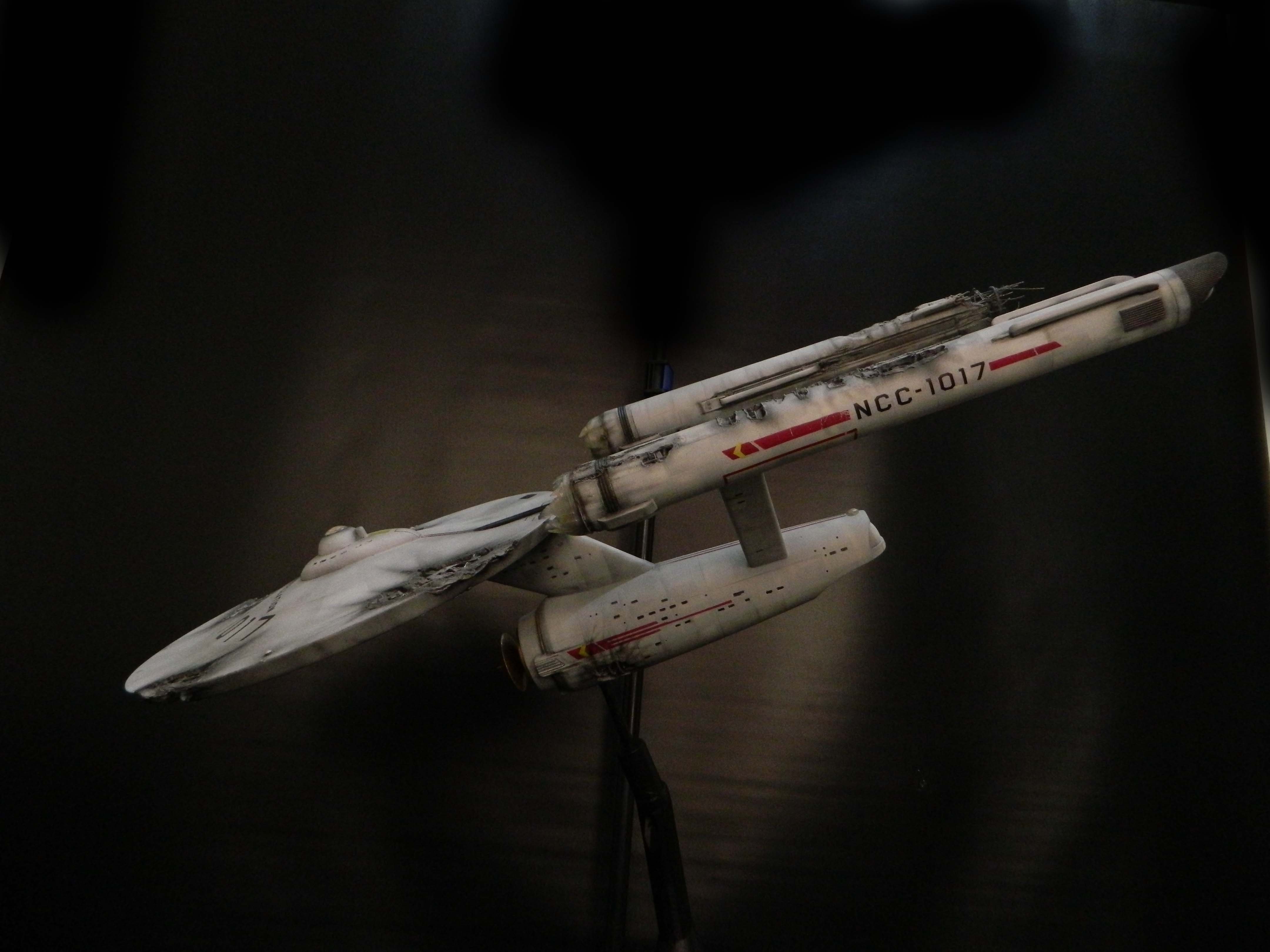 The USS Constellation has always stuck in my mind. The Planet Killer nearly destroyer her, and was eventually destroyed by her. The wreckage we saw in the original series was a simple AMT Model kit. When the HD version came out, the digital model makers for that series really upped what we viewed of this Starship. The twisted metal girders, and sparks… along with open voids of saucer section that leave a chill on my skin ever time I view it. Artist Paul Craggs captured those HD moments greatly in his own 3D printed work of art you see here, along with Paul’s wife in the photos for scale… (or the second model in the photos… heh heh). 😉 The Starship is even sitting on a tilt… as it should be. Beautifully completed.