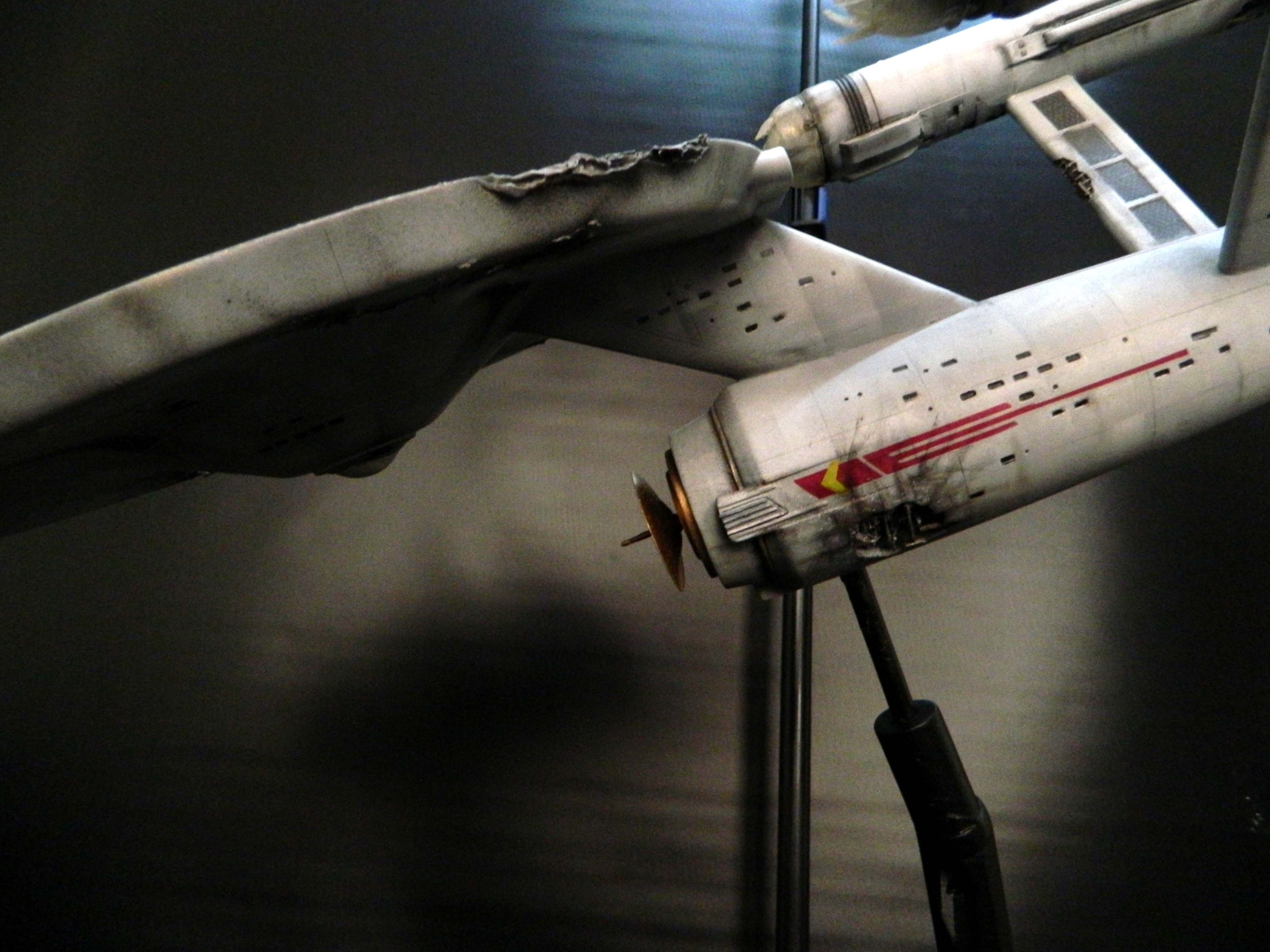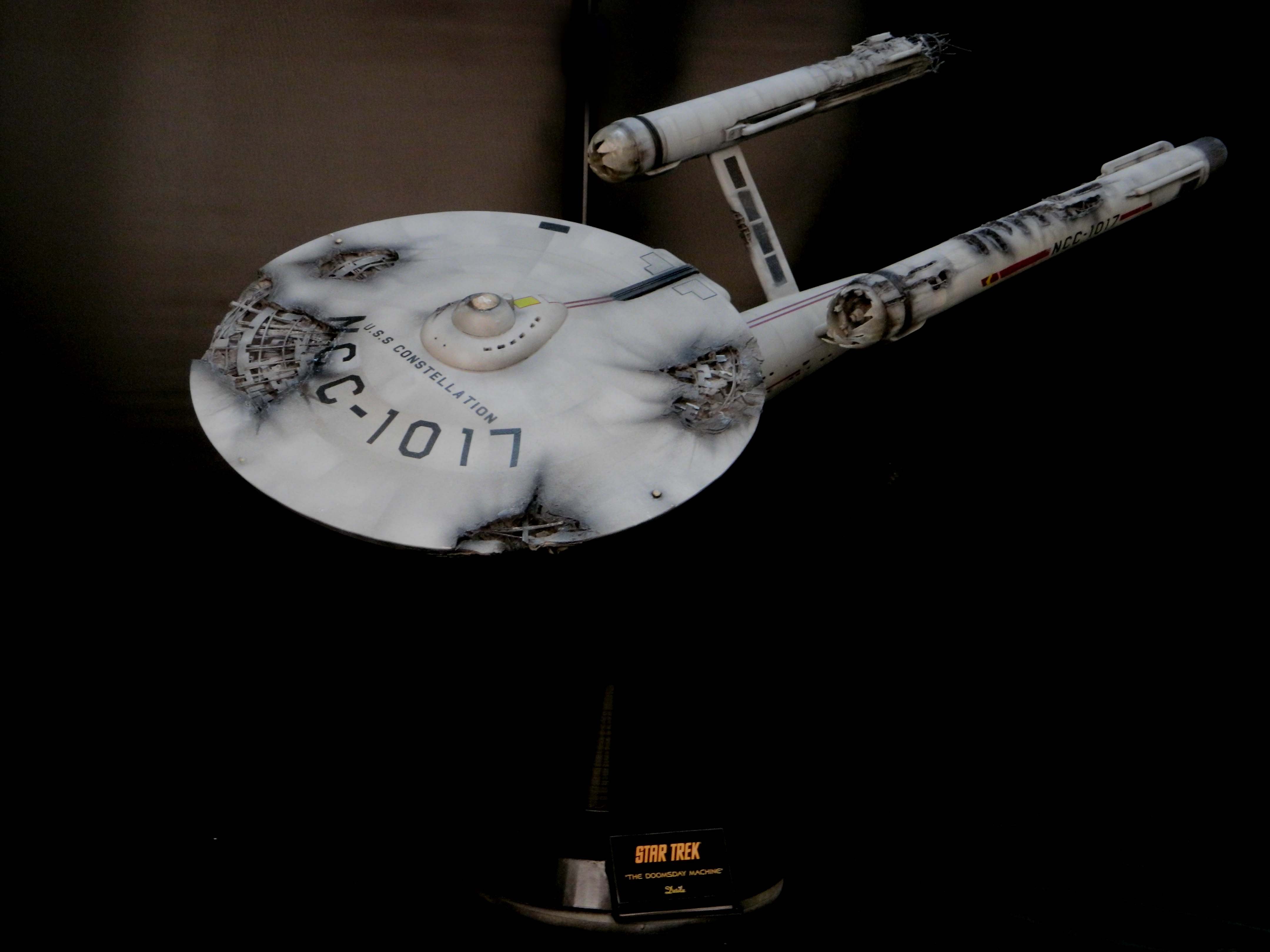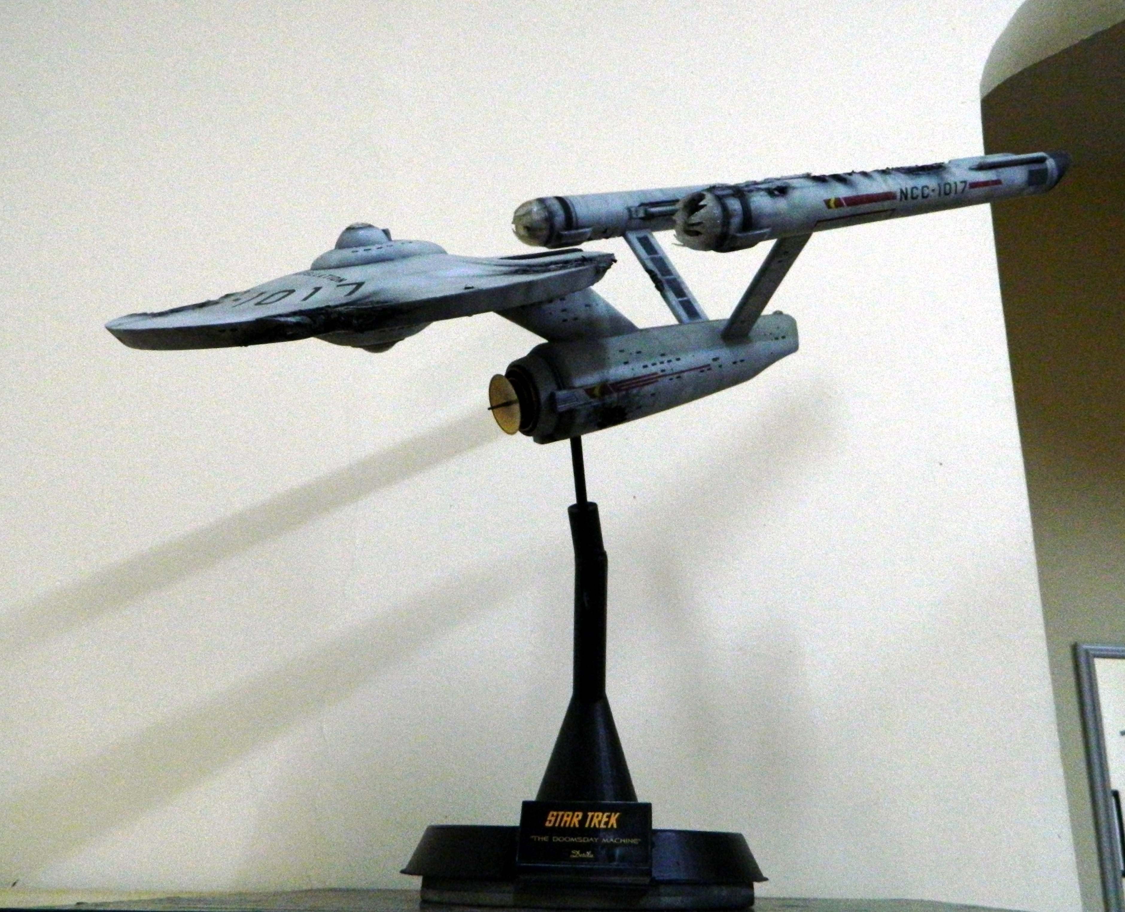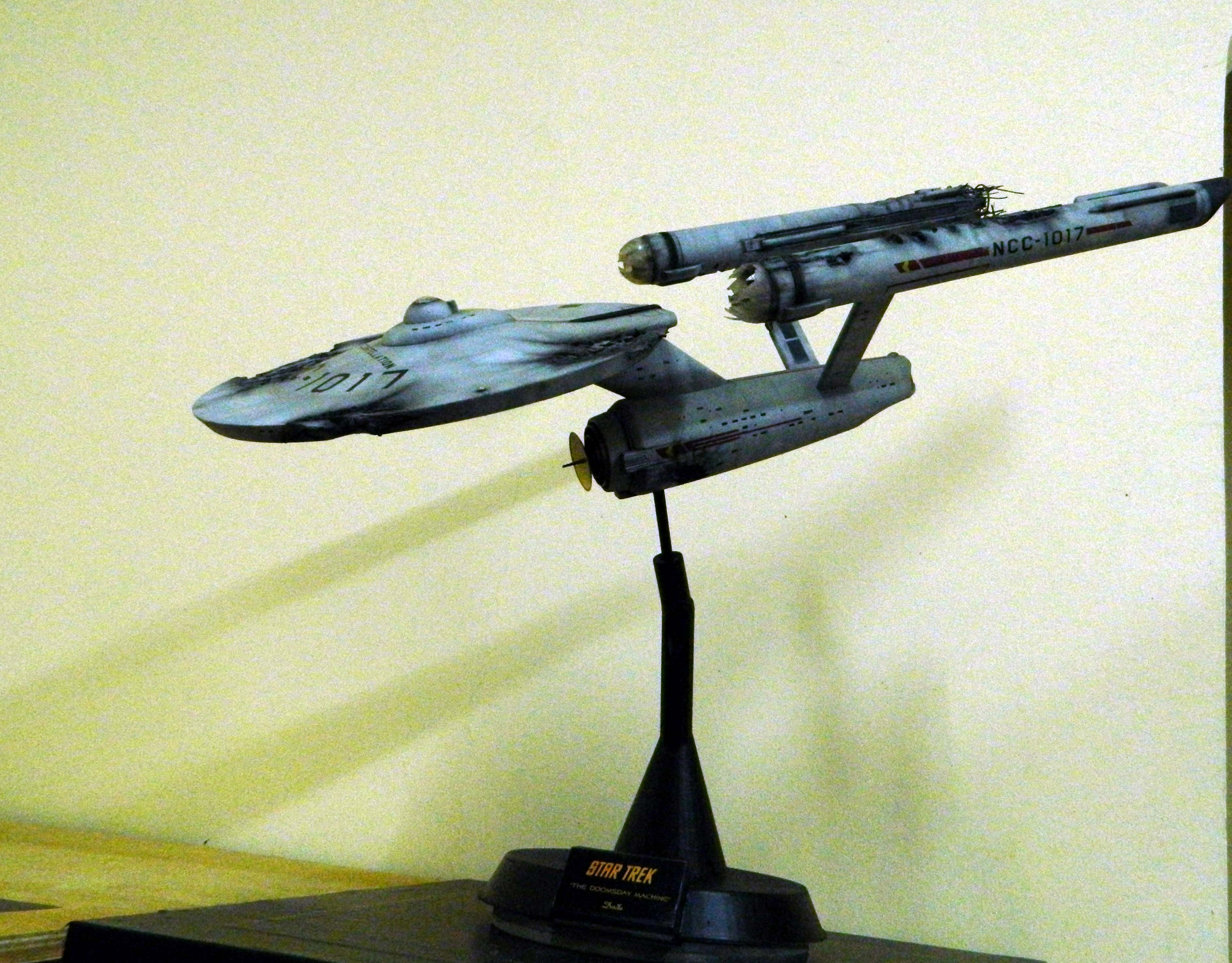 The USS Constellation has always stuck in my mind. The Planet Killer nearly destroyer her, and was eventually destroyed by her. The wreckage we saw in the original series was a simple AMT Model kit. When the HD version came out, the digital model makers for that series really upped what we viewed of this Starship. The twisted metal girders, and sparks… along with open voids of saucer section that leave a chill on my skin ever time I view it. Artist Paul Craggs captured those HD moments greatly in his own 3D printed work of art you see here, along with Paul’s wife in the photos for scale… (or the second model in the photos… heh heh). 😉 The Starship is even sitting on a tilt… as it should be. Beautifully completed.