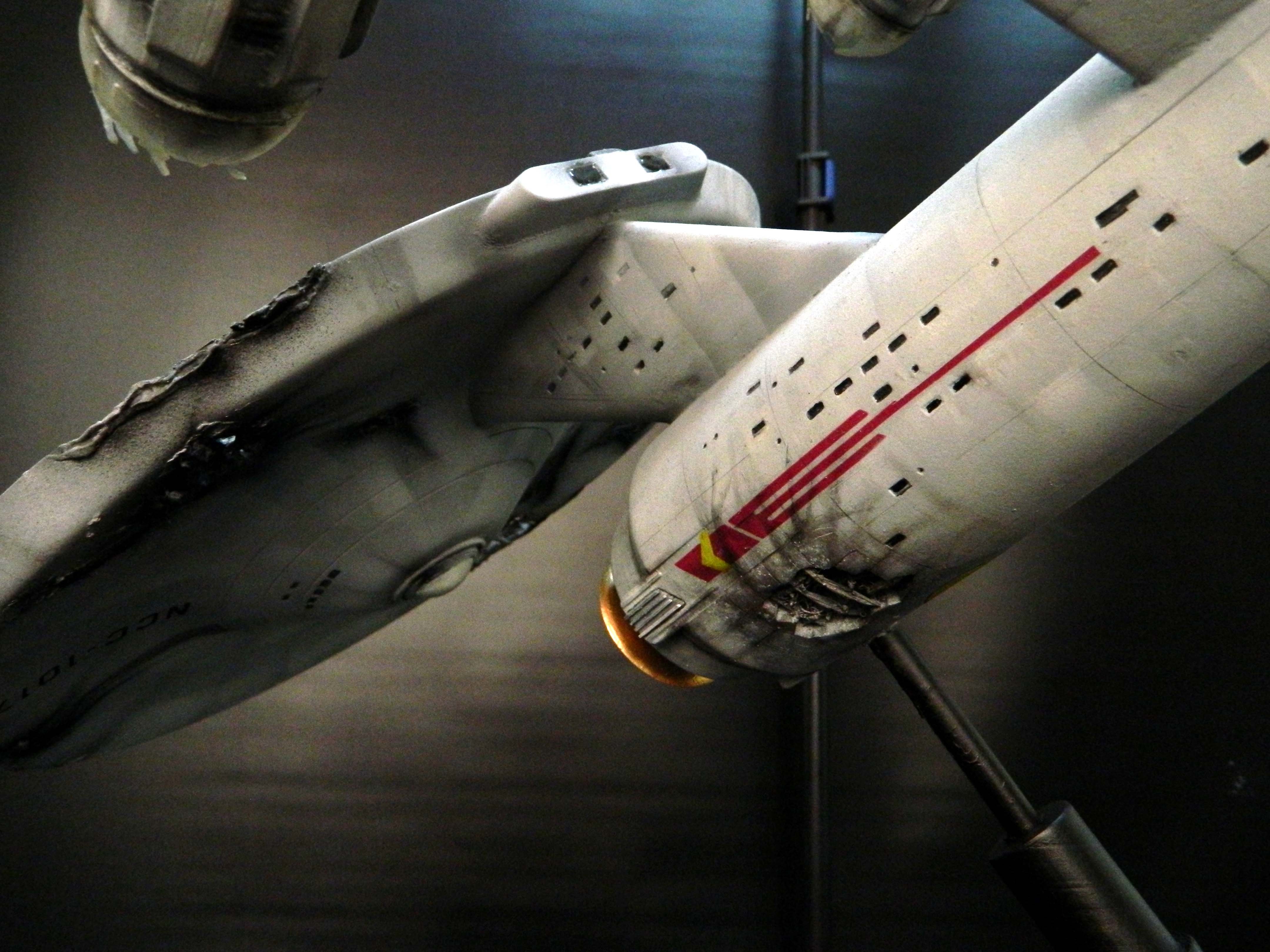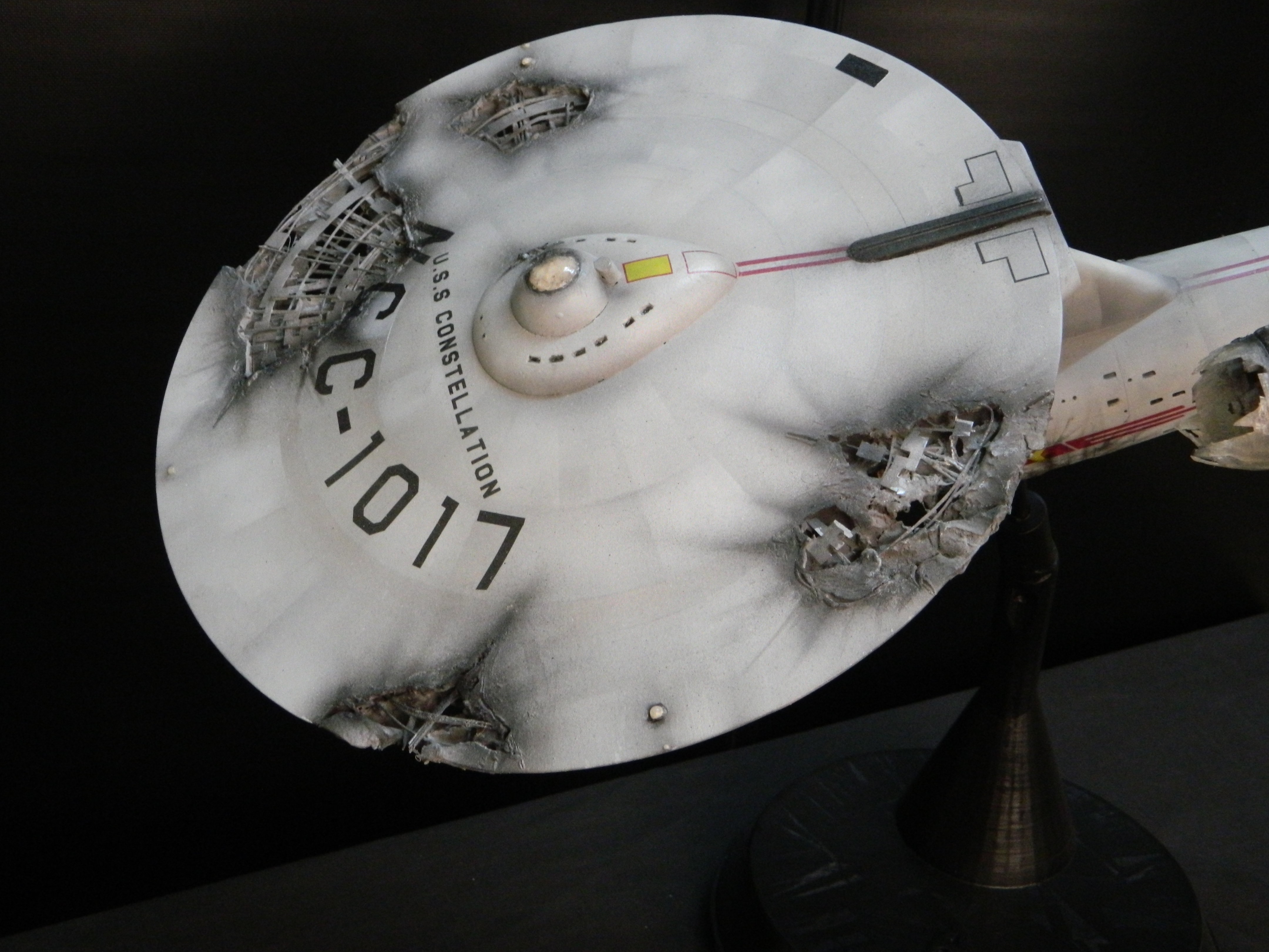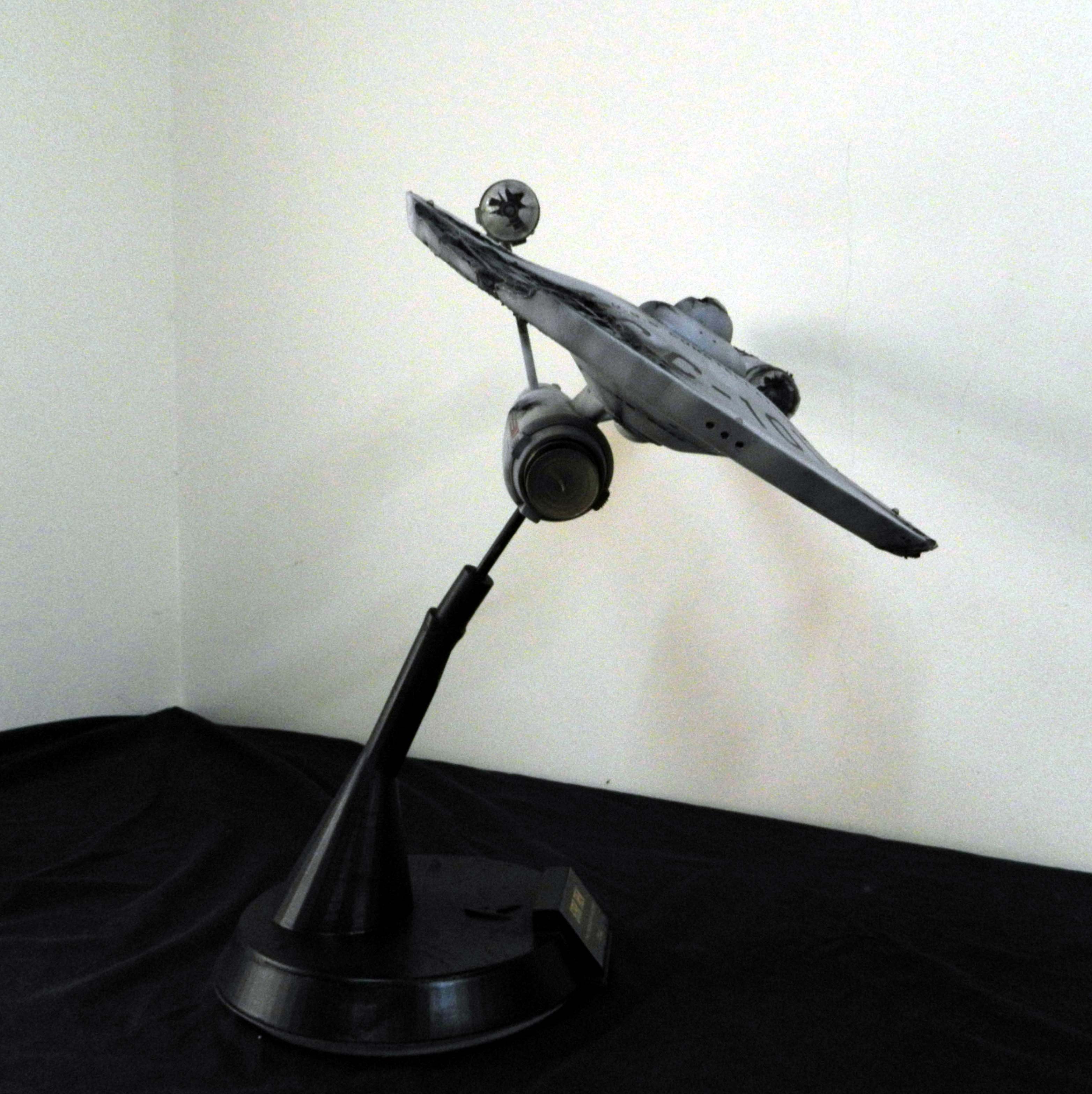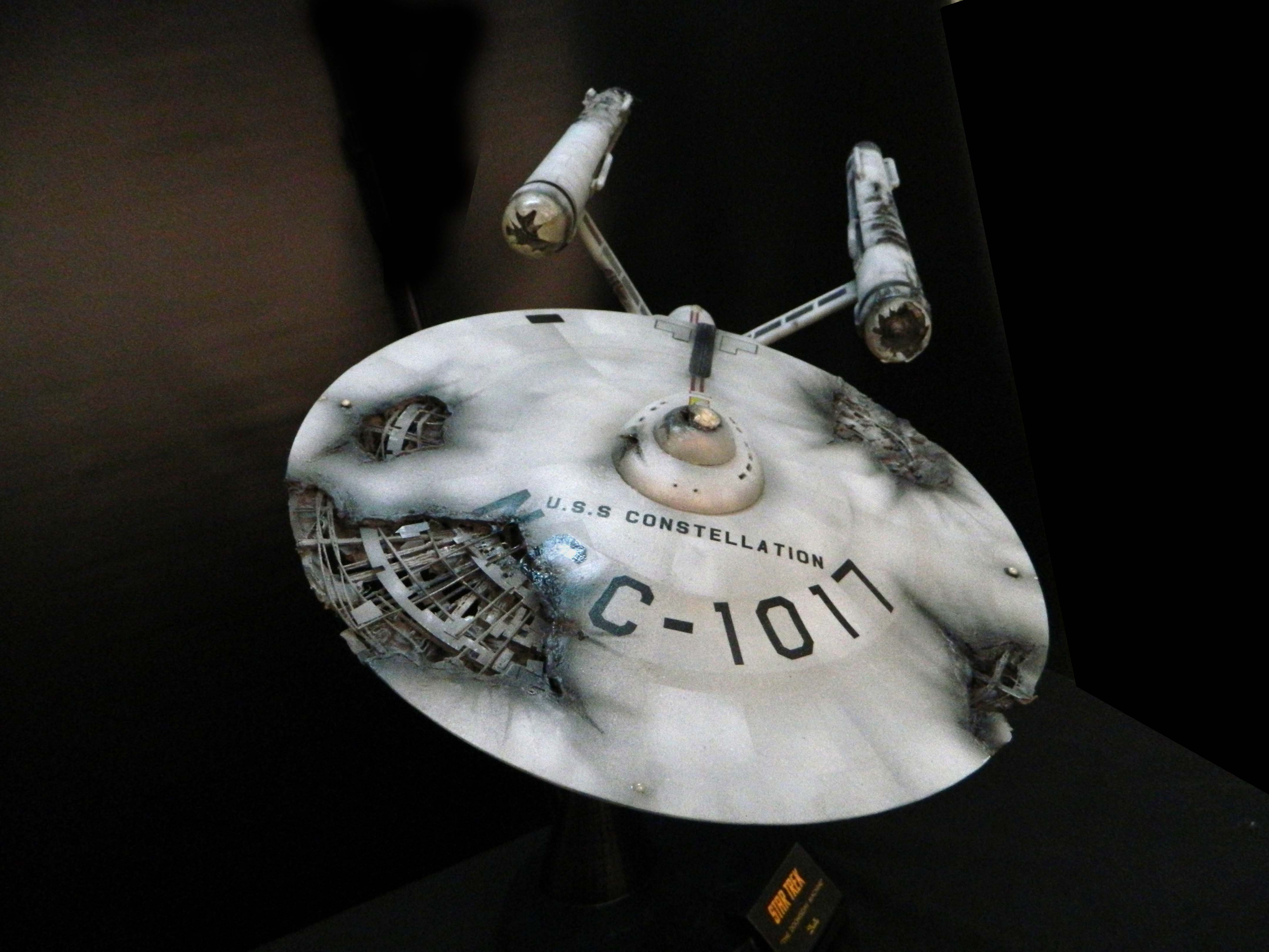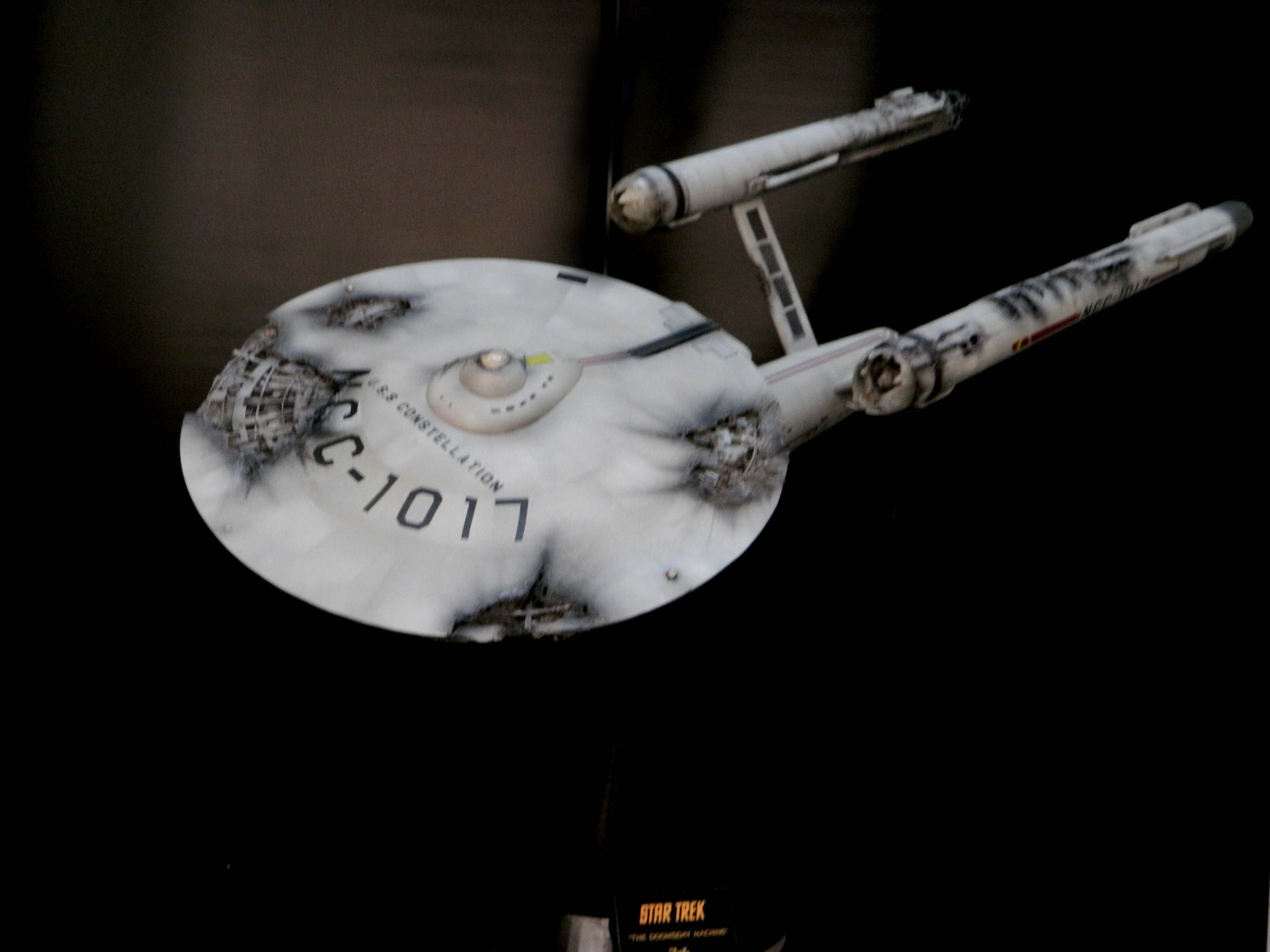 The USS Constellation has always stuck in my mind. The Planet Killer nearly destroyer her, and was eventually destroyed by her. The wreckage we saw in the original series was a simple AMT Model kit. When the HD version came out, the digital model makers for that series really upped what we viewed of this Starship. The twisted metal girders, and sparks… along with open voids of saucer section that leave a chill on my skin ever time I view it. Artist Paul Craggs captured those HD moments greatly in his own 3D printed work of art you see here, along with Paul’s wife in the photos for scale… (or the second model in the photos… heh heh). 😉 The Starship is even sitting on a tilt… as it should be. Beautifully completed.