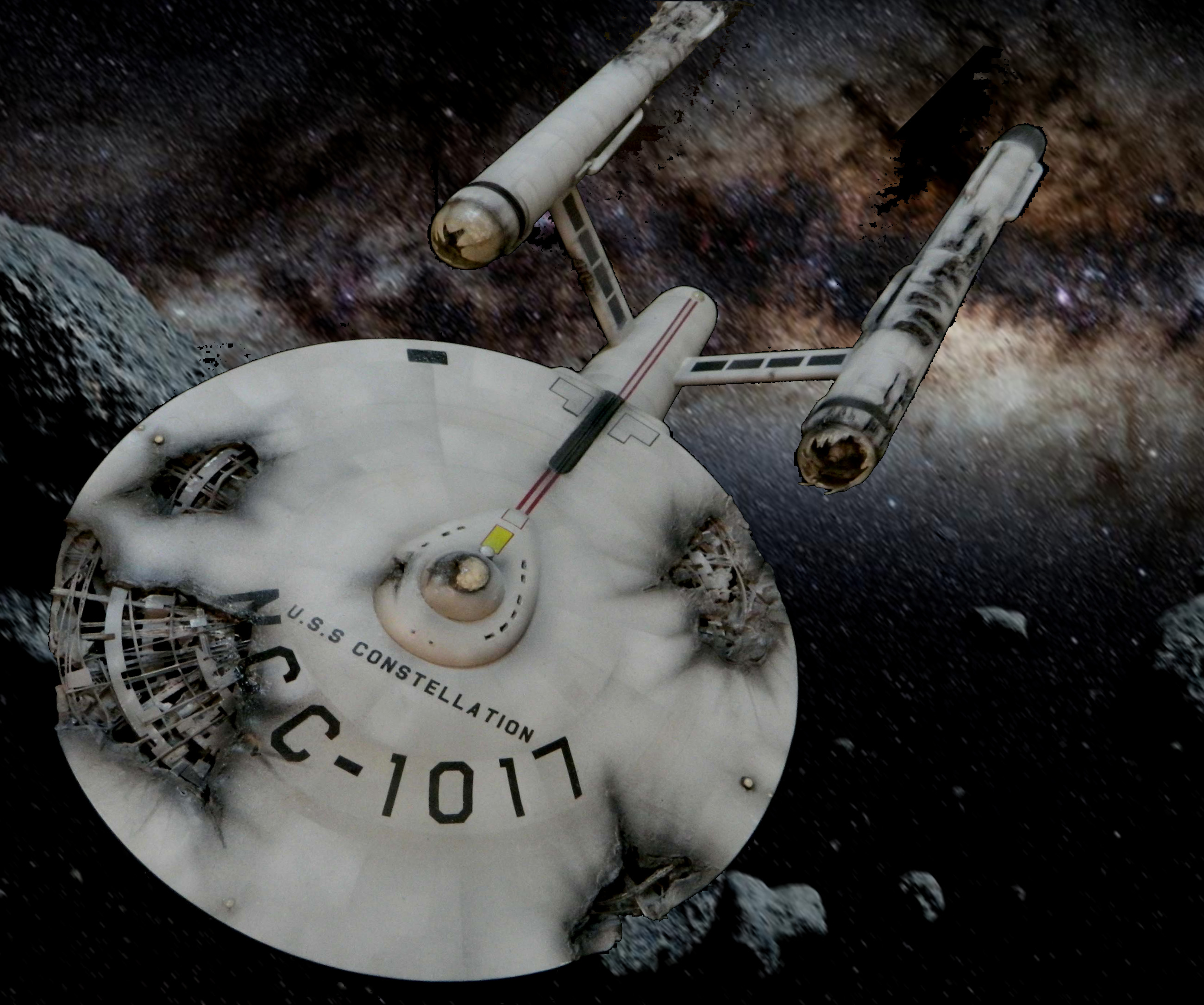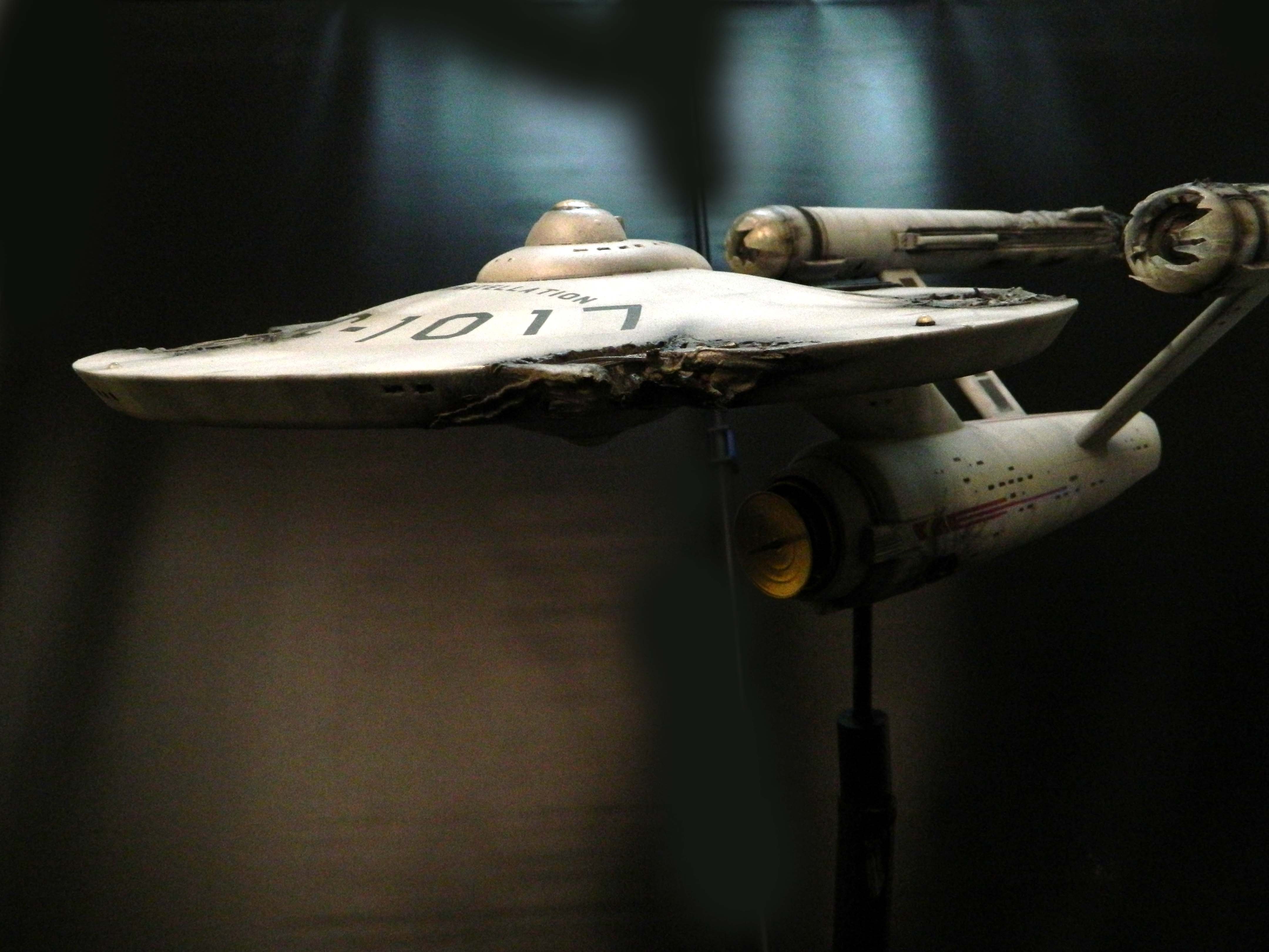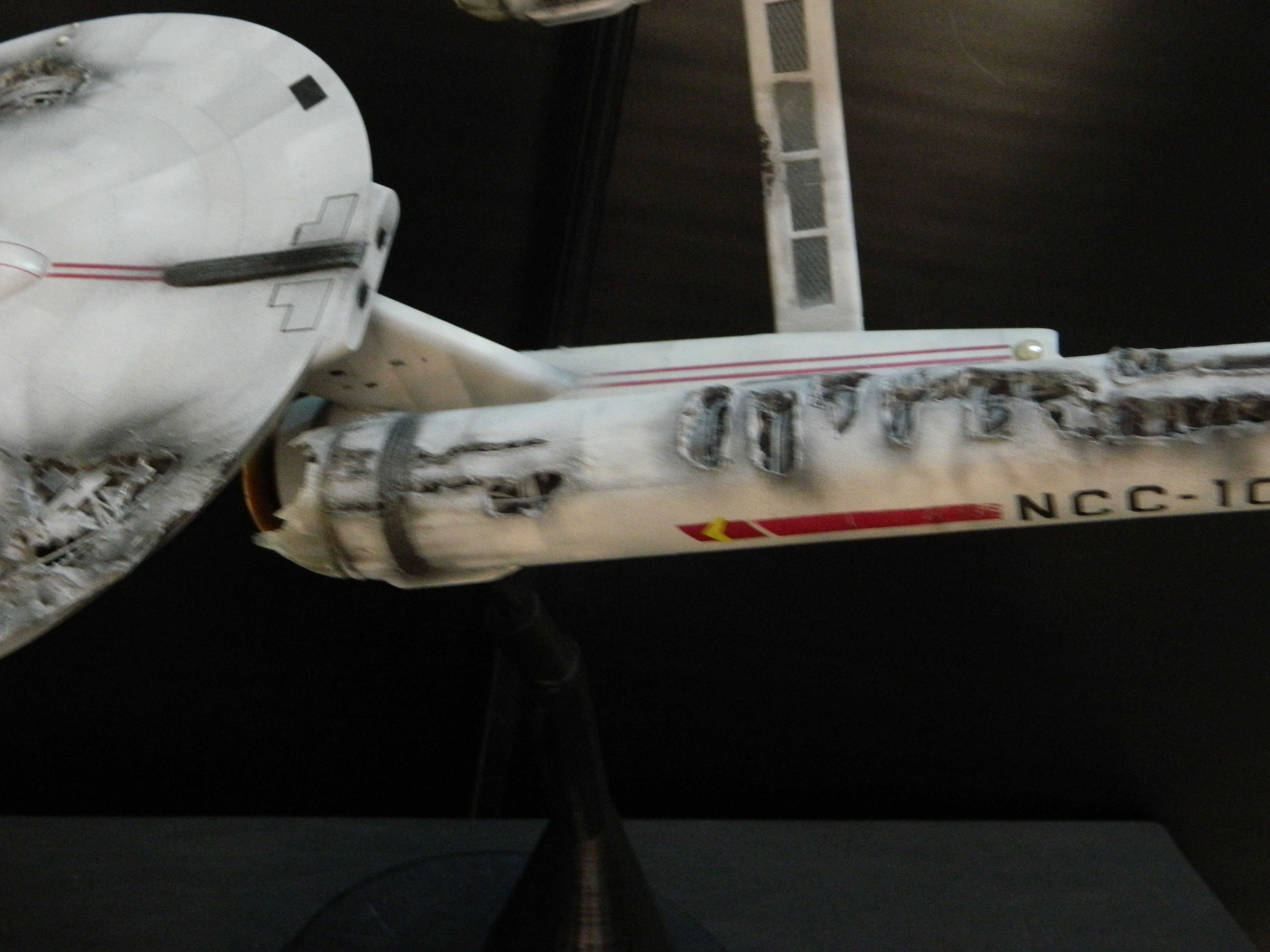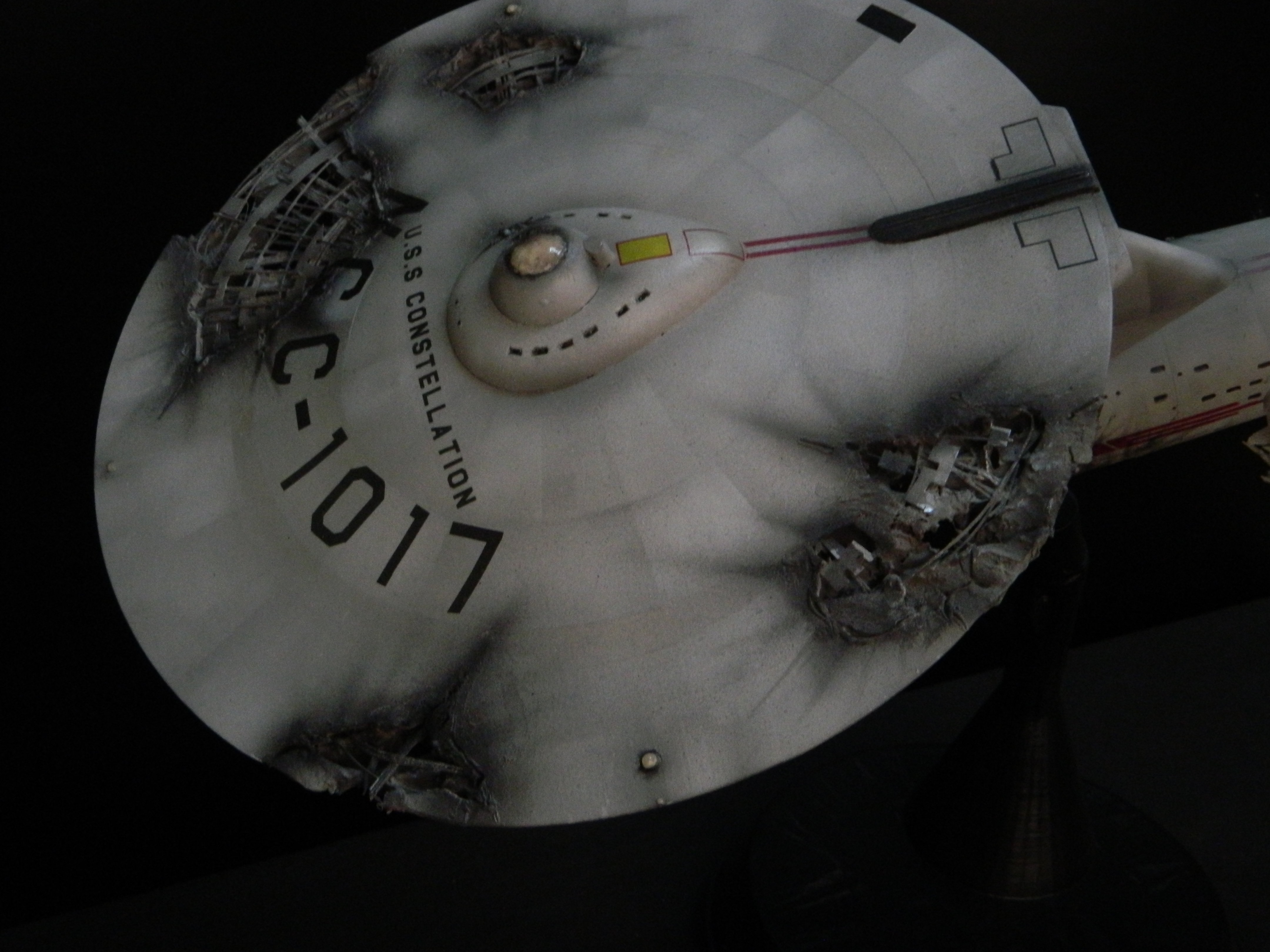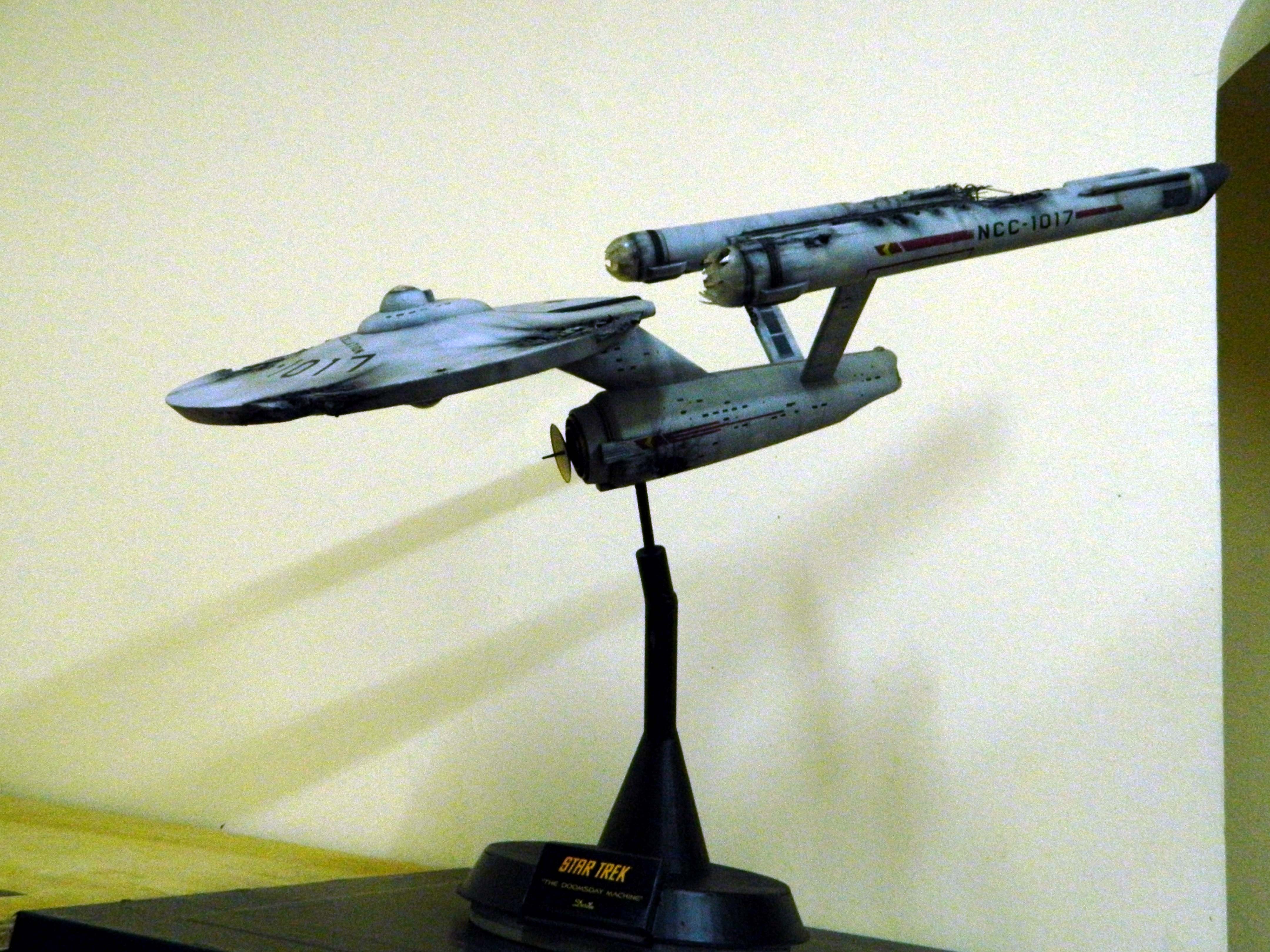 The USS Constellation has always stuck in my mind. The Planet Killer nearly destroyer her, and was eventually destroyed by her. The wreckage we saw in the original series was a simple AMT Model kit. When the HD version came out, the digital model makers for that series really upped what we viewed of this Starship. The twisted metal girders, and sparks… along with open voids of saucer section that leave a chill on my skin ever time I view it. Artist Paul Craggs captured those HD moments greatly in his own 3D printed work of art you see here, along with Paul’s wife in the photos for scale… (or the second model in the photos… heh heh). 😉 The Starship is even sitting on a tilt… as it should be. Beautifully completed.