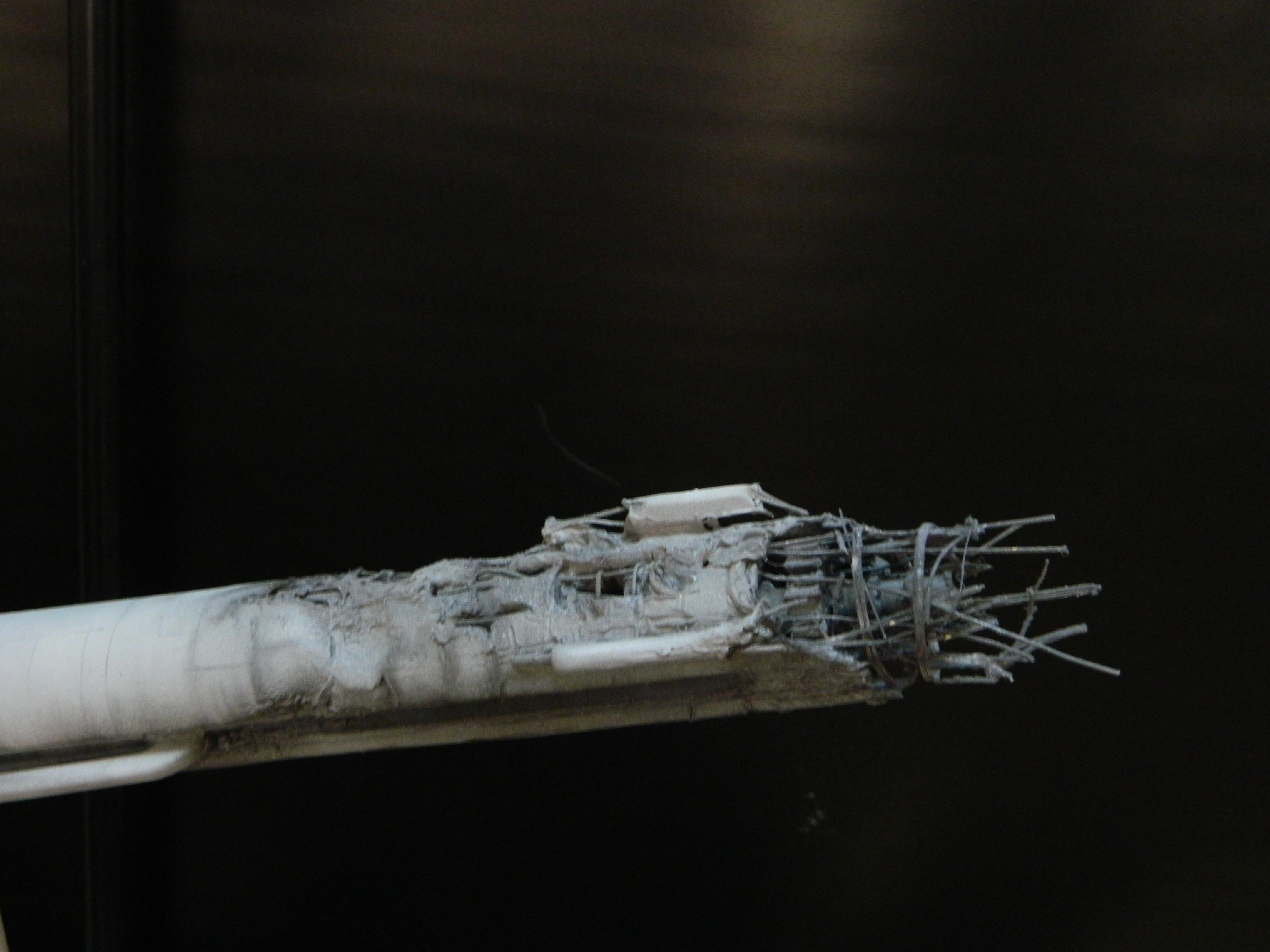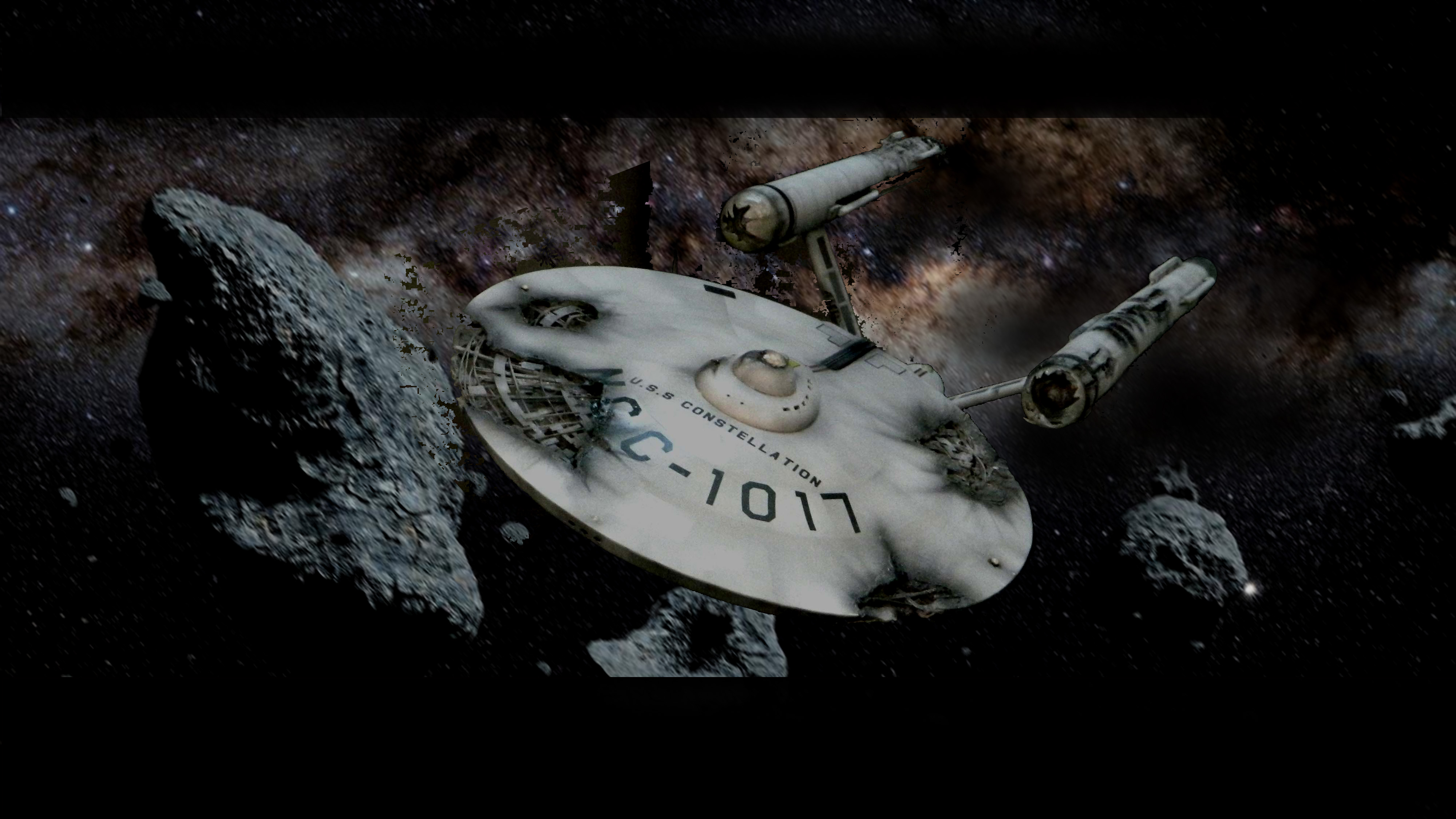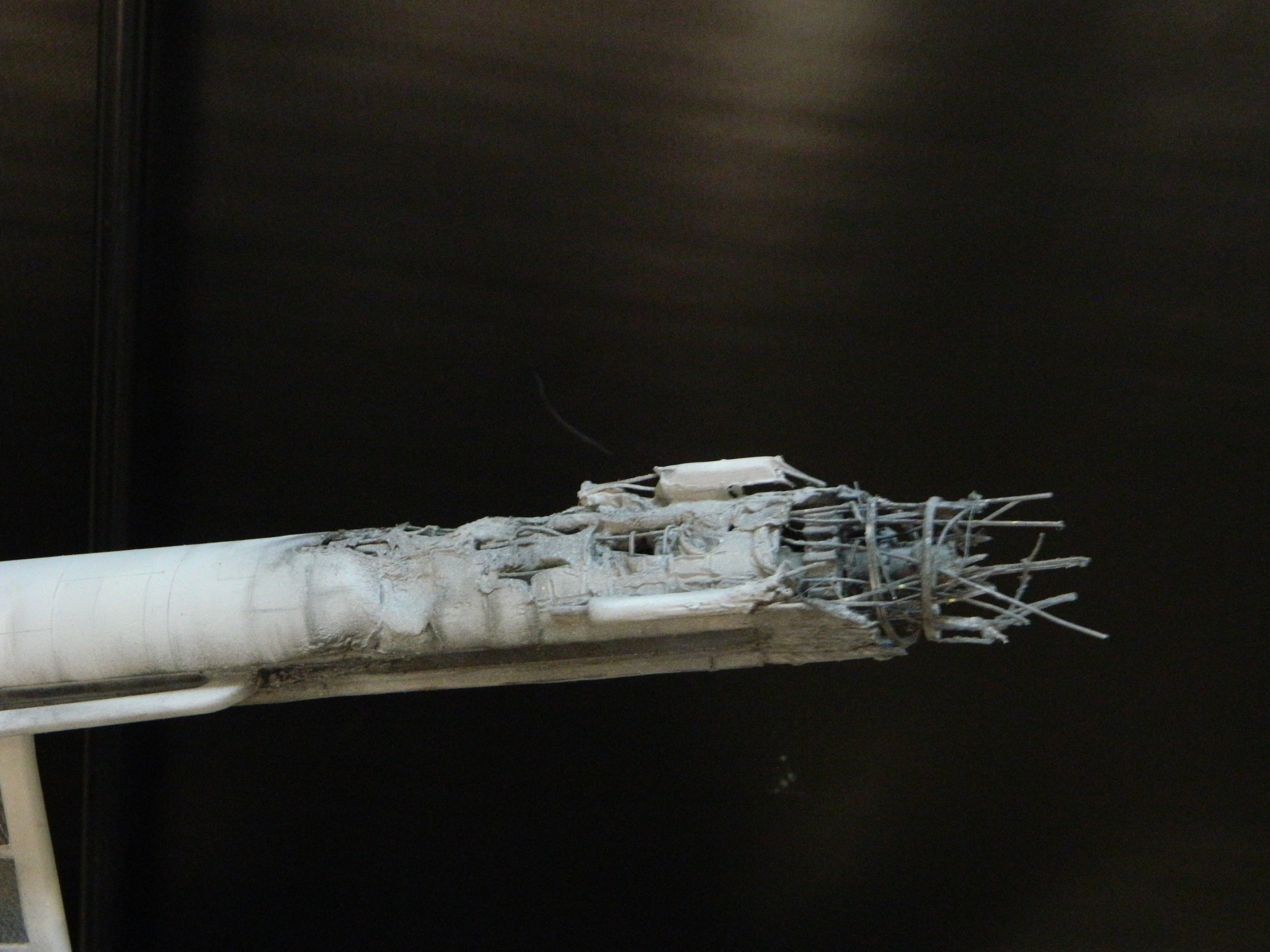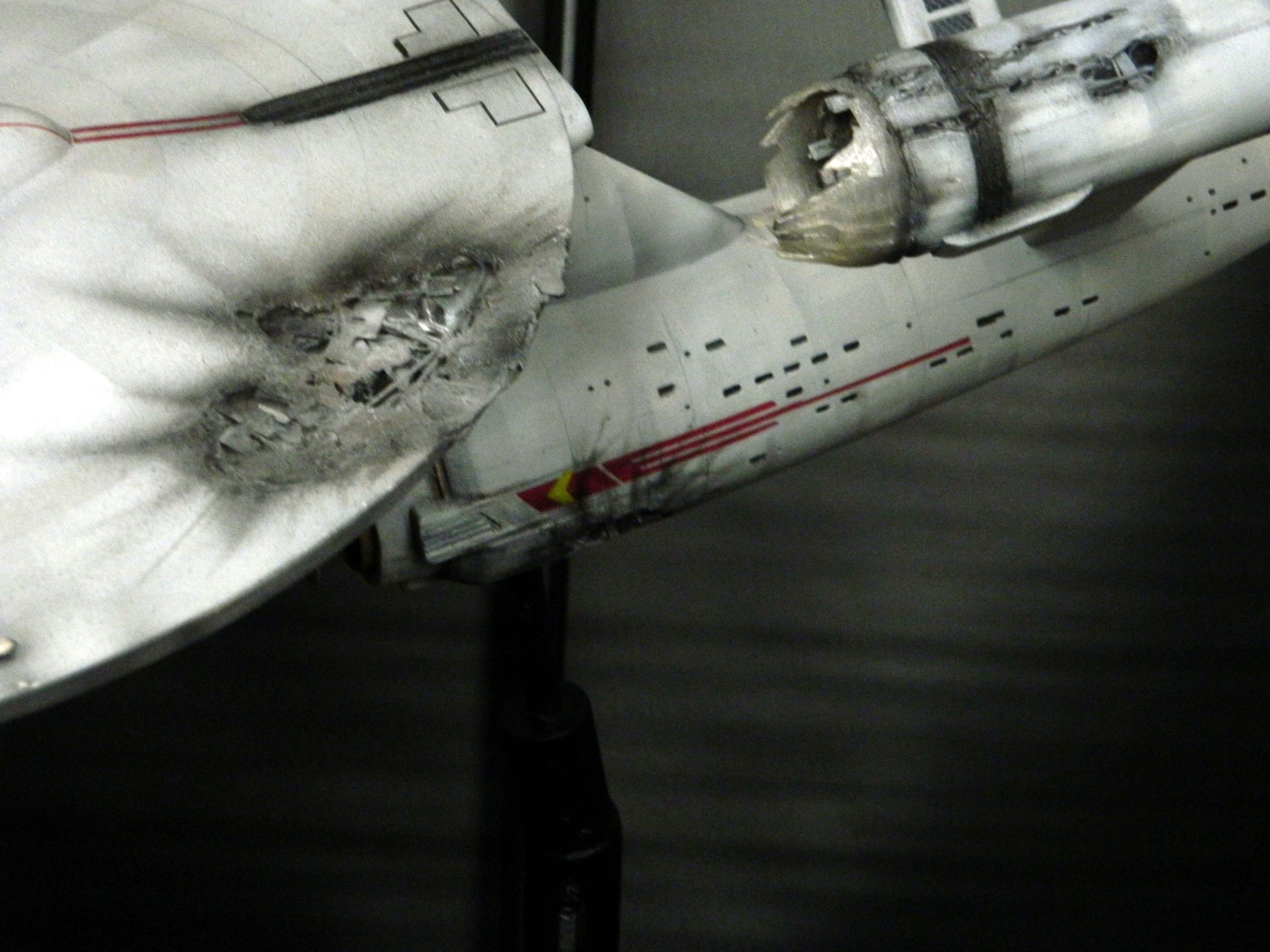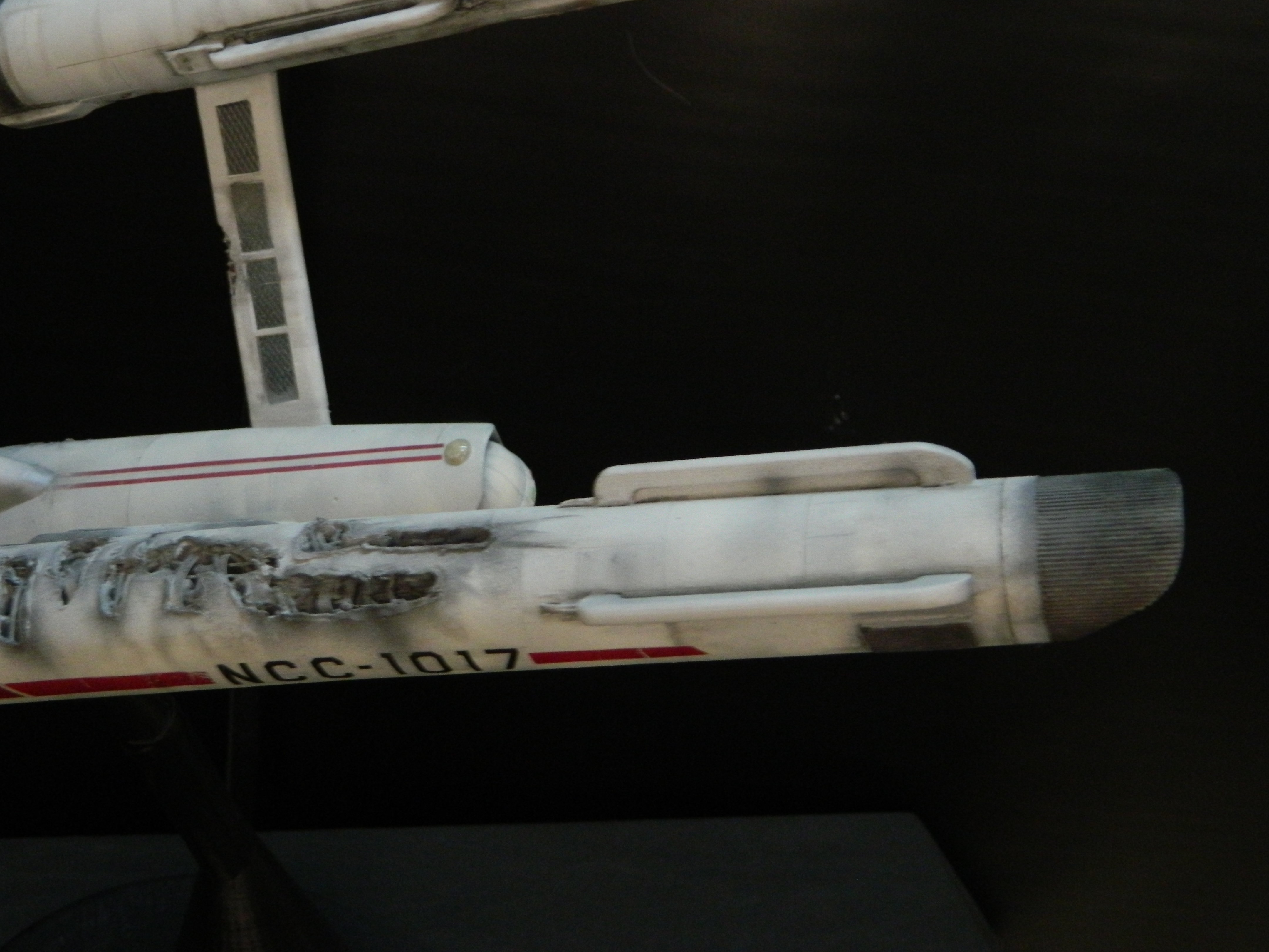 The USS Constellation has always stuck in my mind. The Planet Killer nearly destroyer her, and was eventually destroyed by her. The wreckage we saw in the original series was a simple AMT Model kit. When the HD version came out, the digital model makers for that series really upped what we viewed of this Starship. The twisted metal girders, and sparks… along with open voids of saucer section that leave a chill on my skin ever time I view it. Artist Paul Craggs captured those HD moments greatly in his own 3D printed work of art you see here, along with Paul’s wife in the photos for scale… (or the second model in the photos… heh heh). 😉 The Starship is even sitting on a tilt… as it should be. Beautifully completed.
