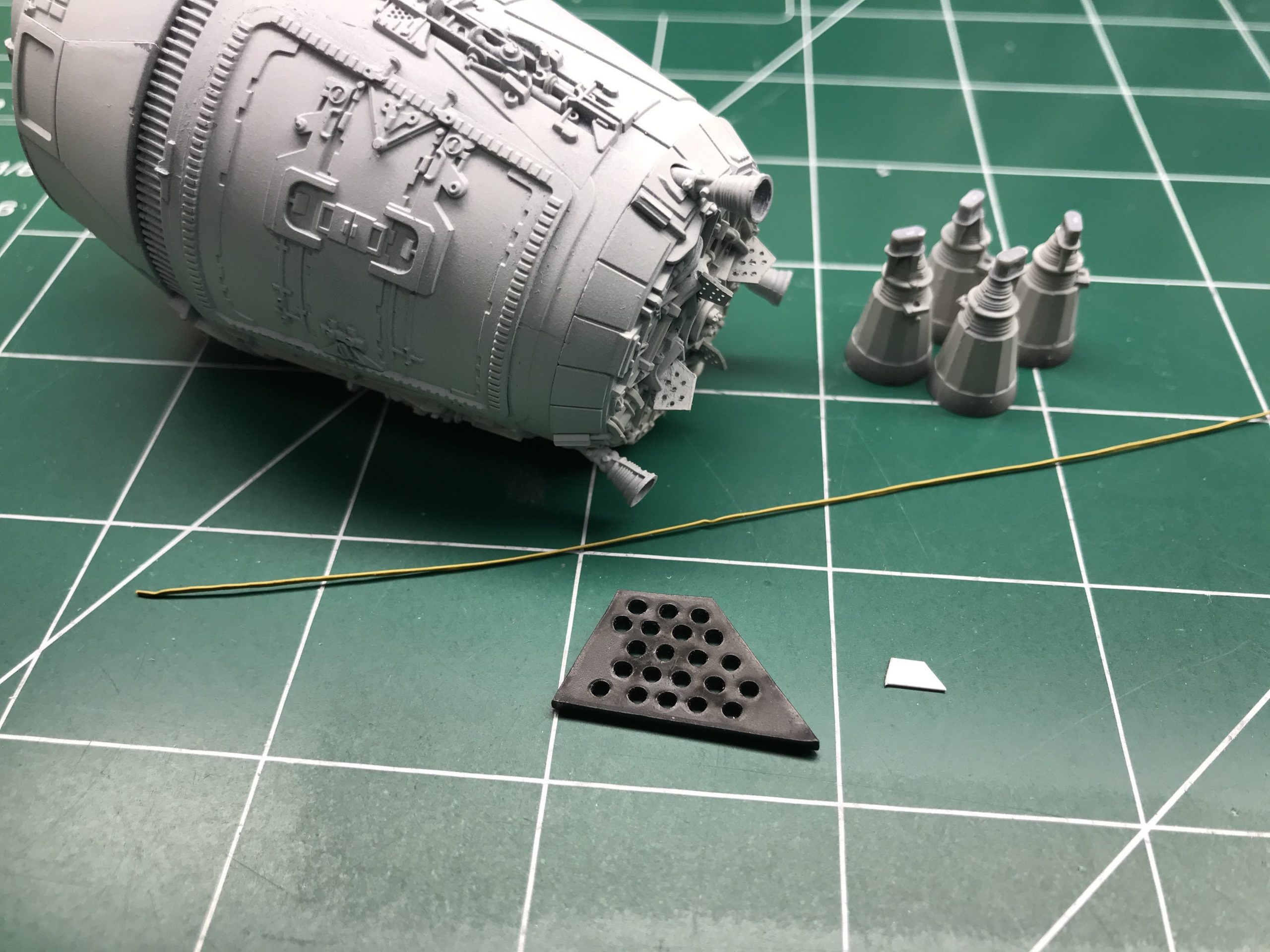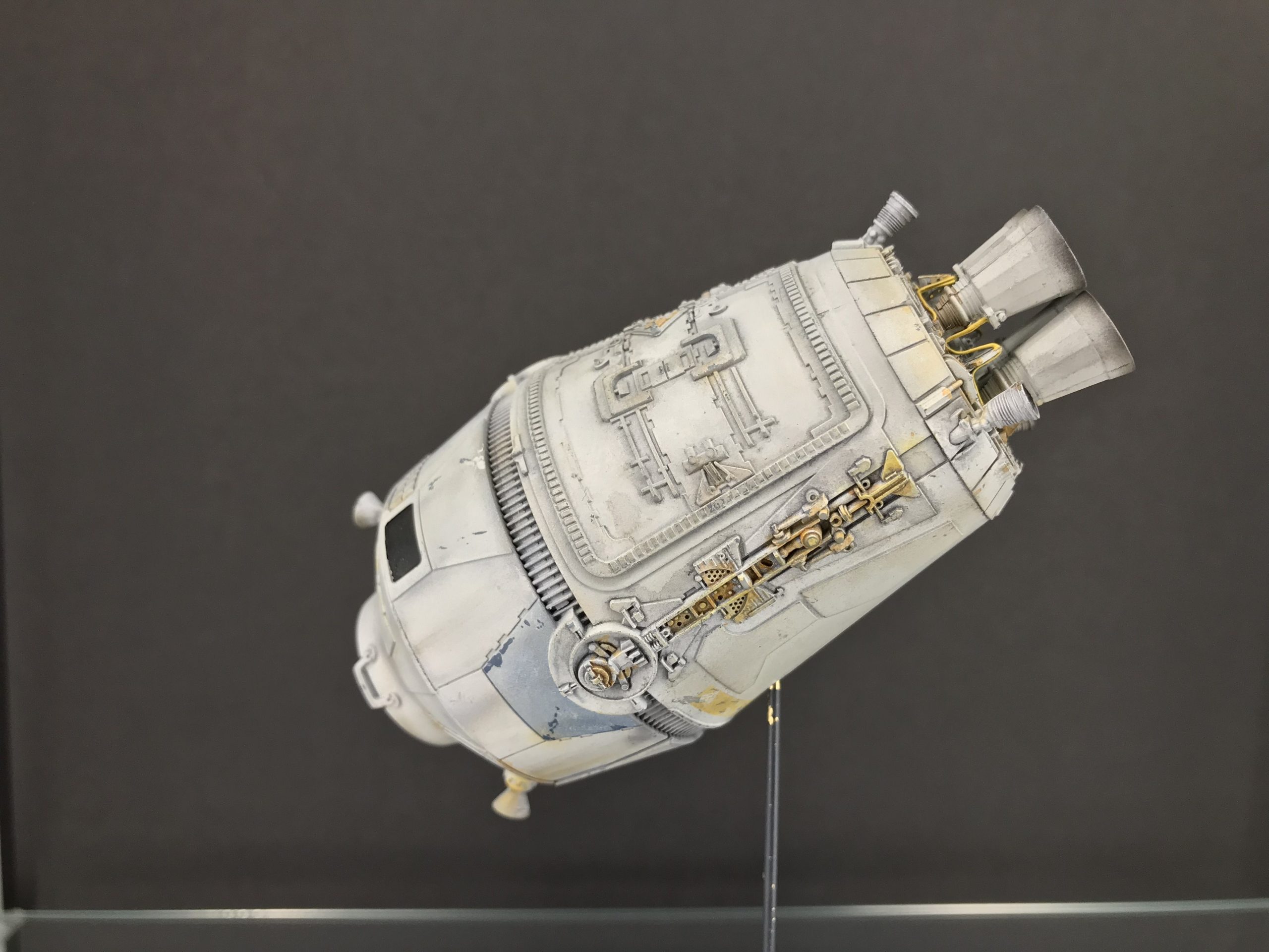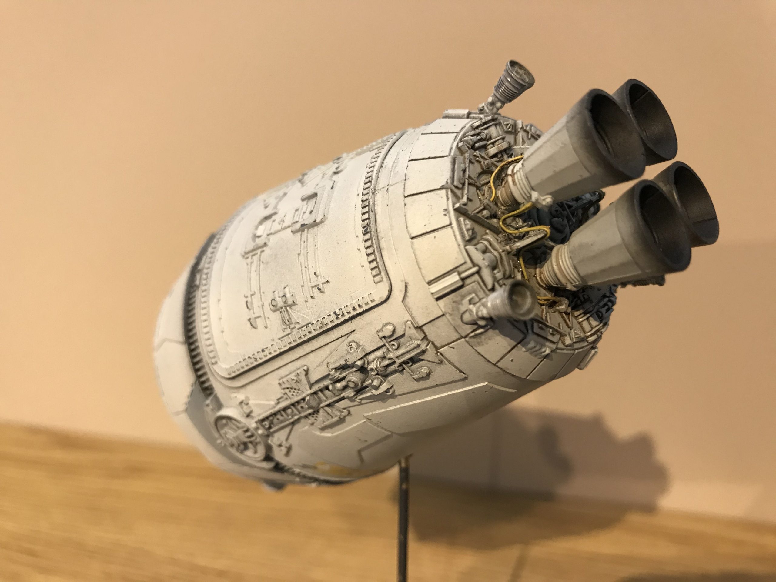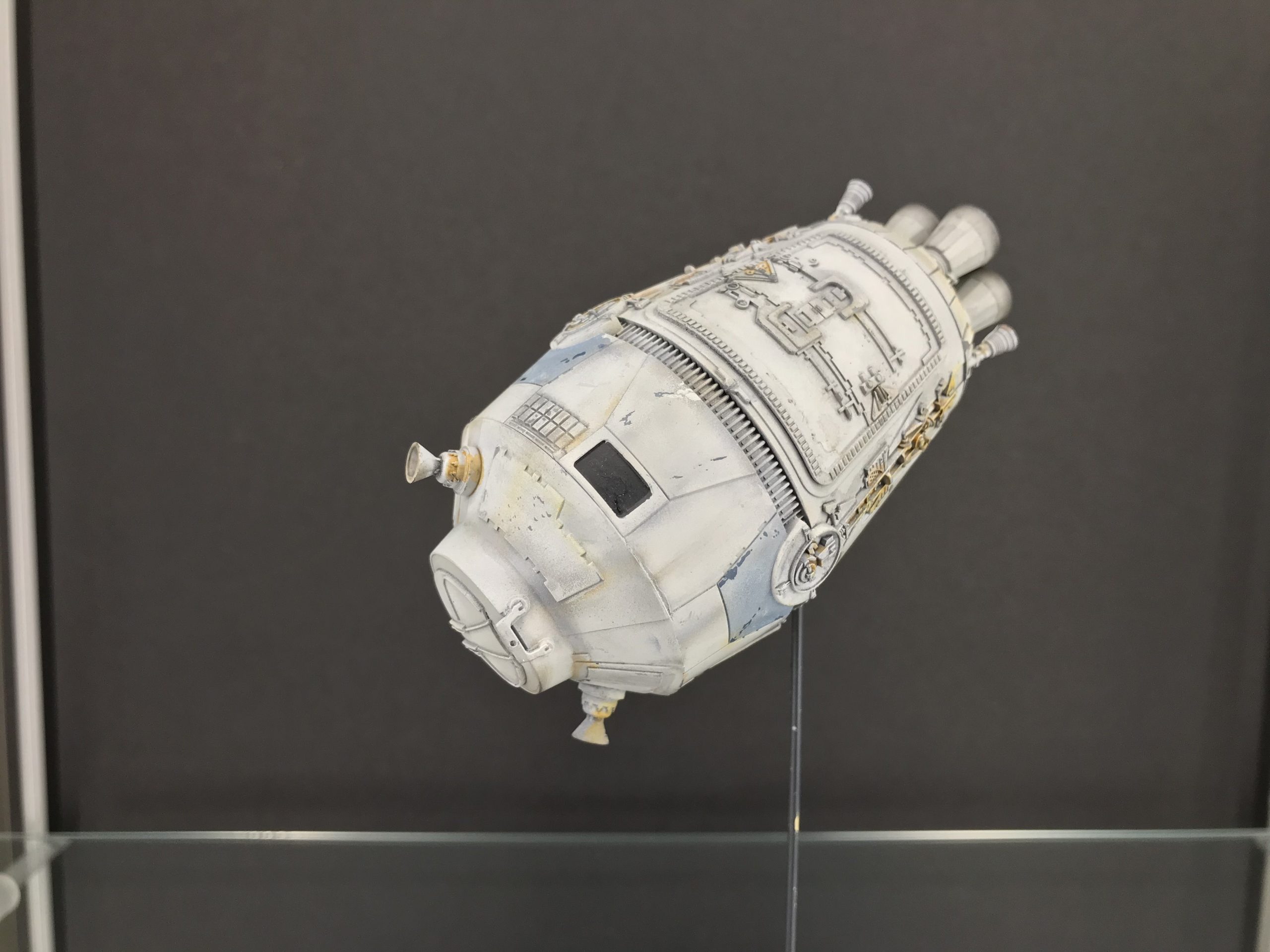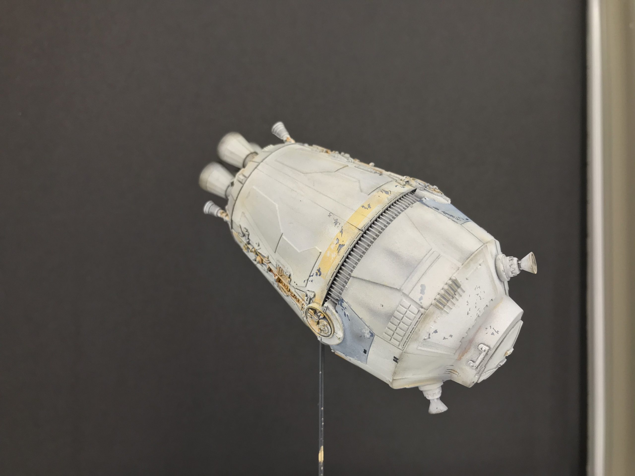 I did a little small Escape Pod build that was fun and quick. It’s from the Star Wars Legion game which I don’t play but my buddy next door does and he bought one. so I bought one to see what I could do with it! To my surprise it’s filled with detail and not bad for being only 5 inches long (tiny I know), but with a good paint job and some special mods it came out looking pretty cool. I added the triangular heat sink things between the engine bells, and cut out the molded wire/cables that were attached to the engine pan/ bells (they looked awful), then cut some magnet wire, painted and glued them to the bells, and wrapped the over the heat sink thingy. Even though it’s not perfect you can do magic with a little ingenuity and styrene. I hope you enjoy it. Given the paint job and it’s size it looks big.