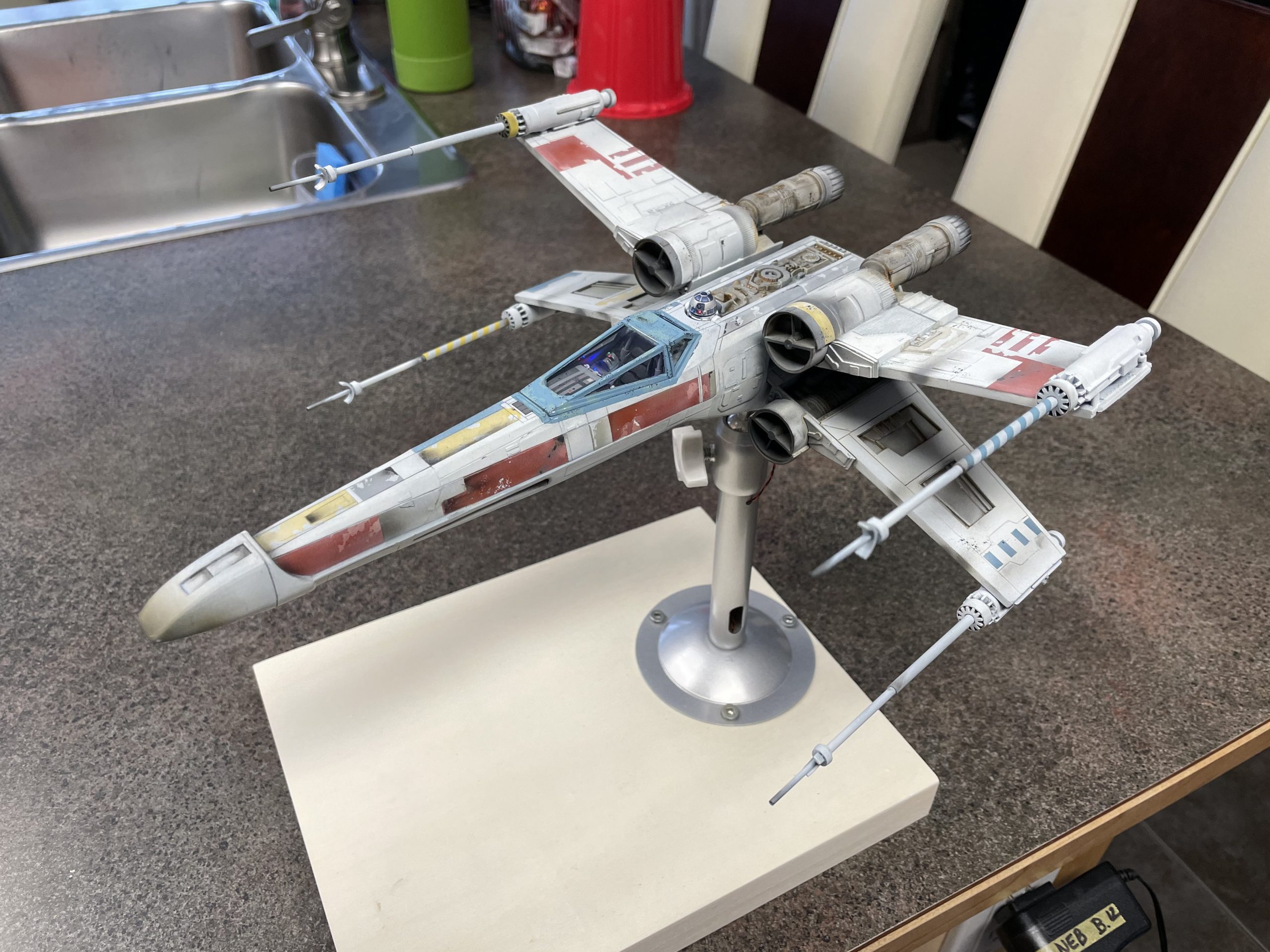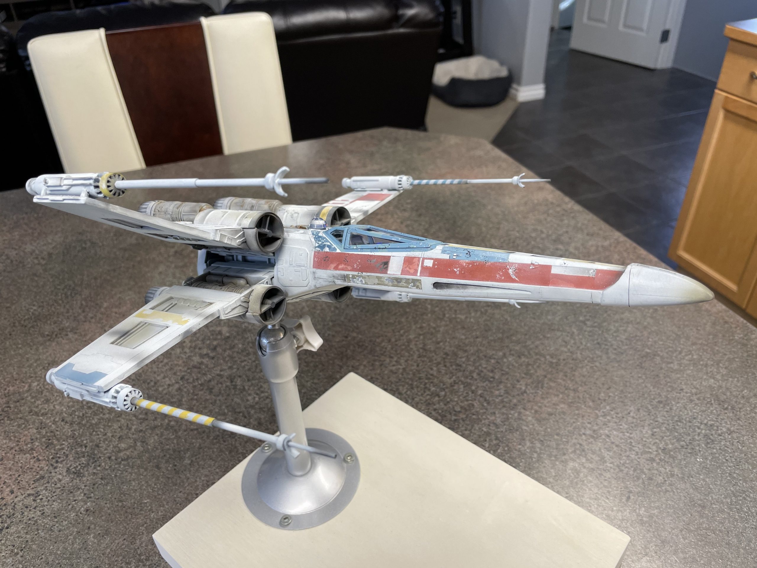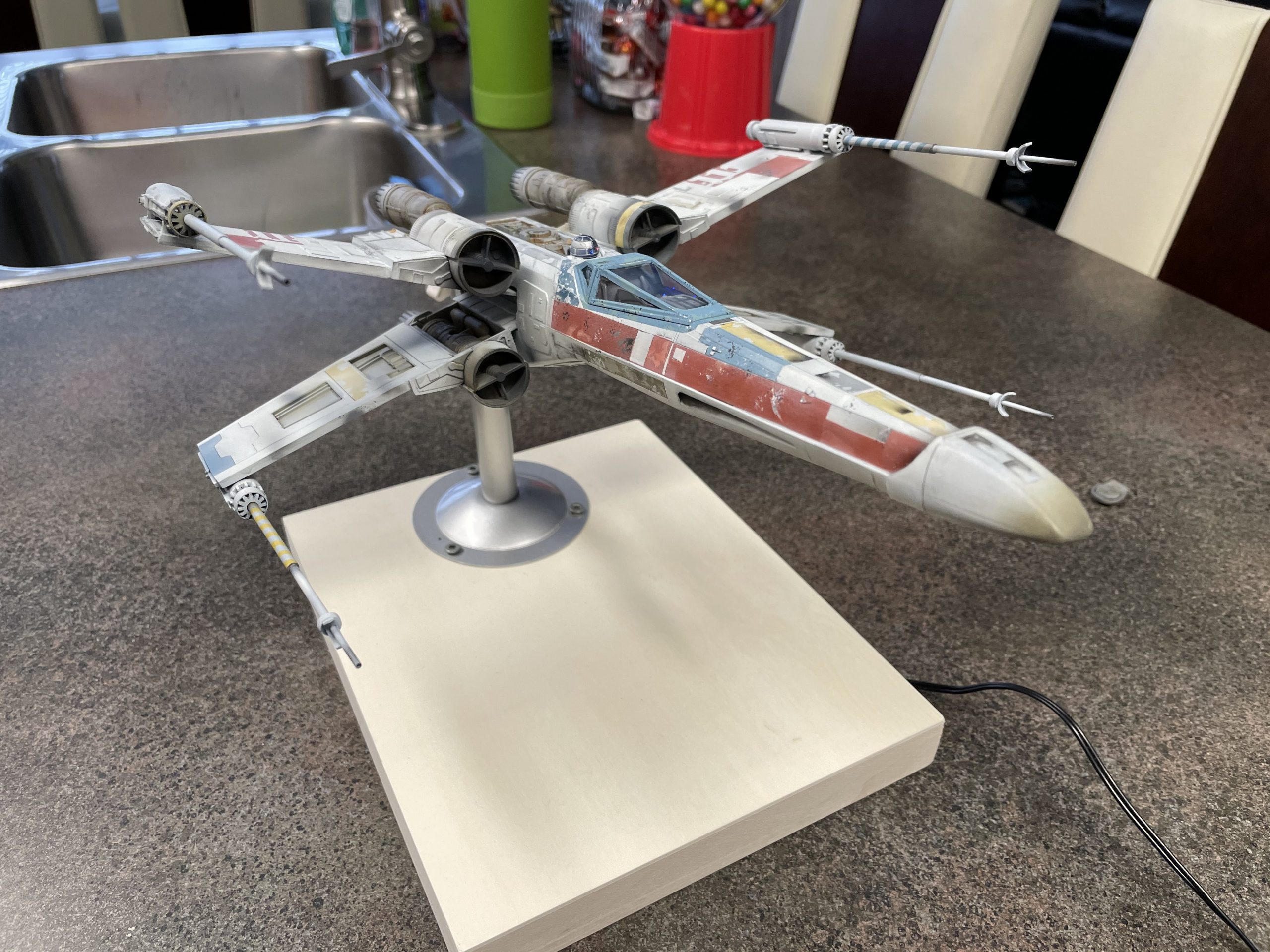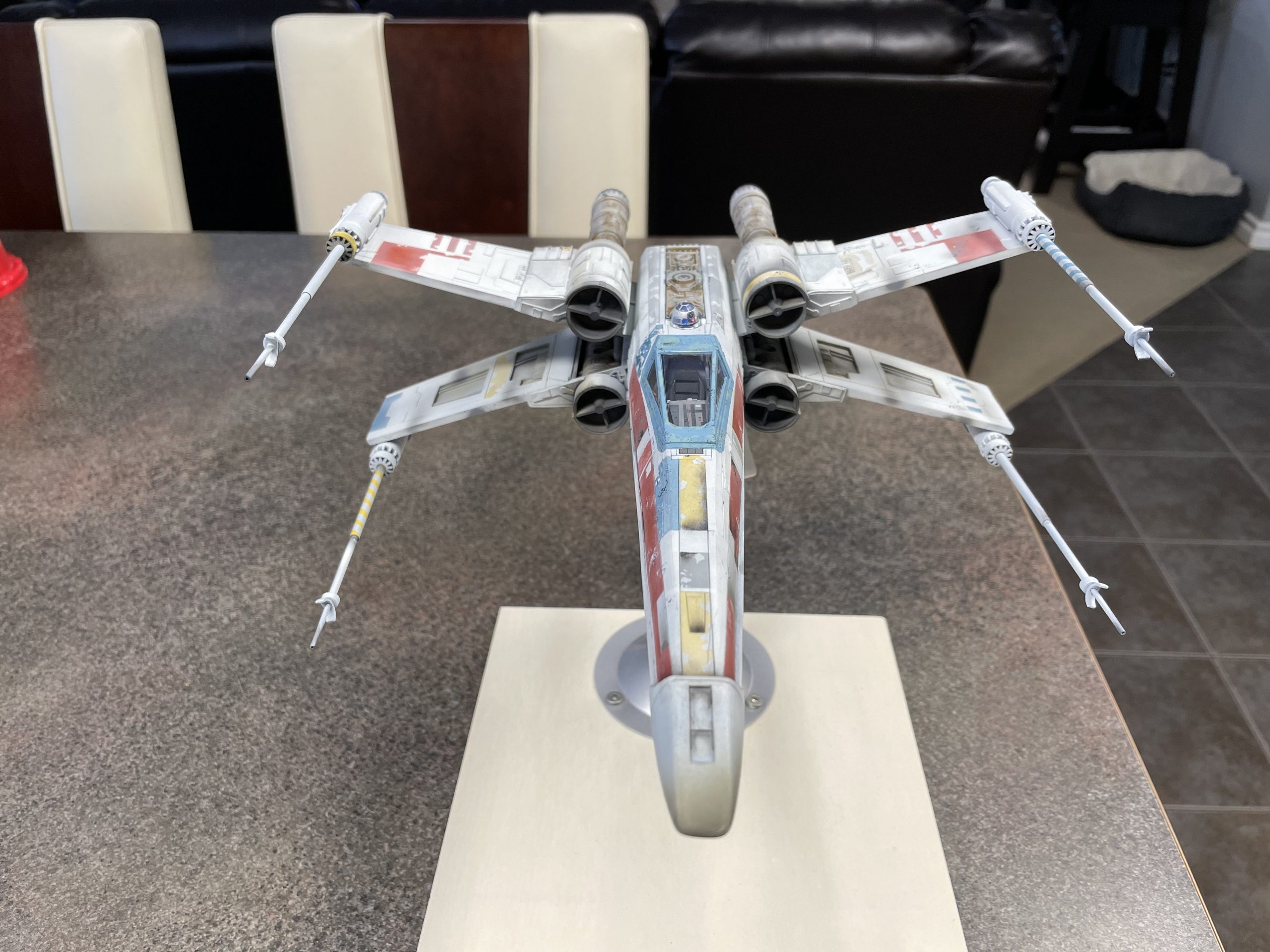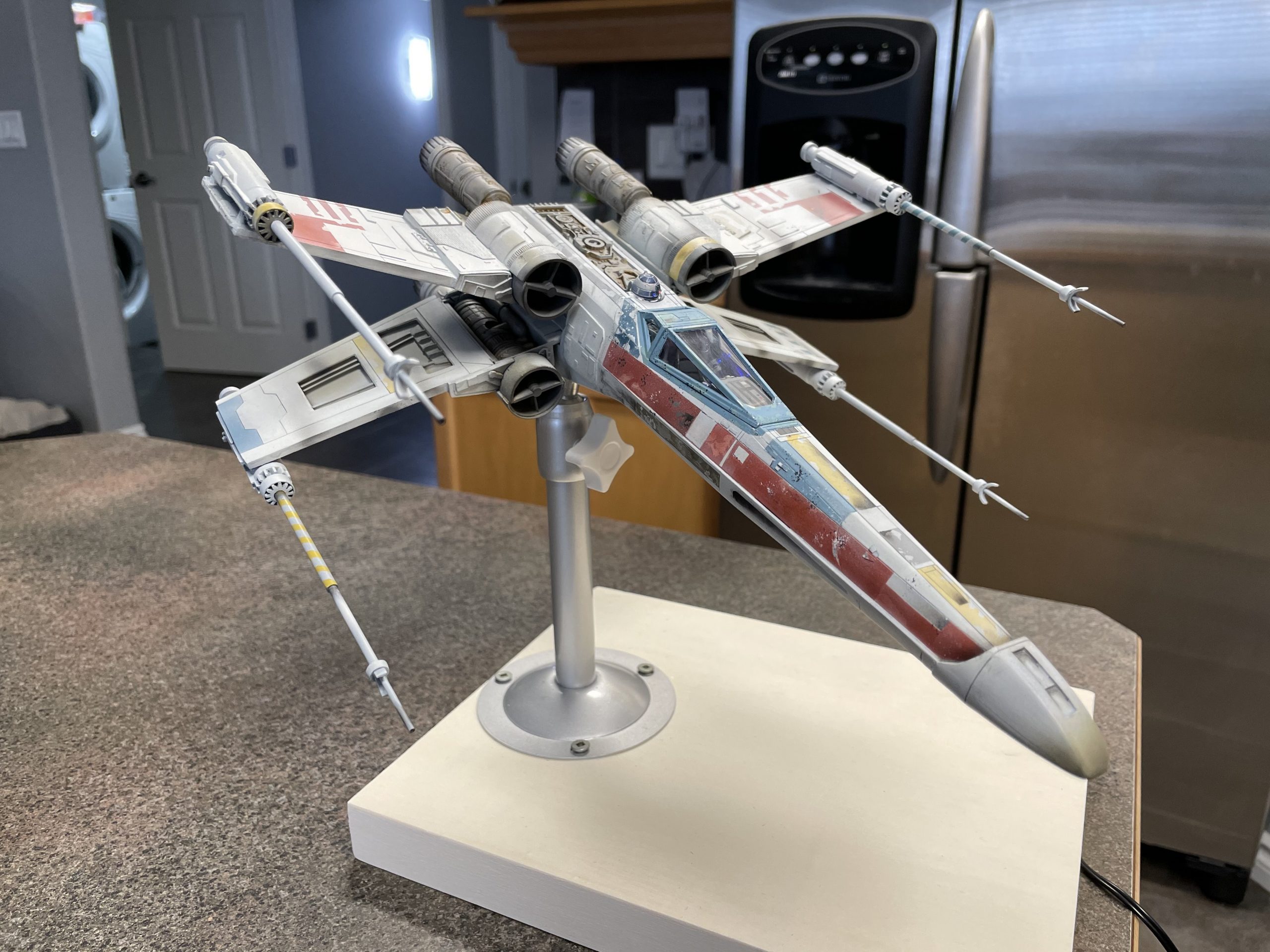 I pulled out my really old MPC X-Wing kit to build, and I kind of got carried away with it. What started as a simple out of the box build became a little more. I threw out the cannons and replaced them with brass rods, spruced up the cockpit a bit (as the kit one was pathetic), then I added two mounting points (one on the bottom with a plug and one in the rear with a plug). I cut out the round area in the rear area and glued in a magnet on the back. I then added detail to the interior wings and cut off those two damned nubs, and filling the holes on the wings. I lit up the engines with four red flickering LED’s, with The cockpit and R2 unit using Fiber Optics, and placing styrene bits here and there. For those of you who have built this kit, and many there are, you will notice the additions. I wanted to cut the windows out of the canopy, but being over 40 years old it was very brittle so it’s not glued on. I’m hoping to find someone to 3D print me a new canopy and maybe a pilot as well. It is a bit heavy on the weathering, and in no way is this depicting any sort of RED # X-Wing that we know of. I just had fun with it and enjoyed every second of bringing it to life. This is definitely a far cry from my first time building this when I was 11 years old! Like I stated, this was a FUN Build!