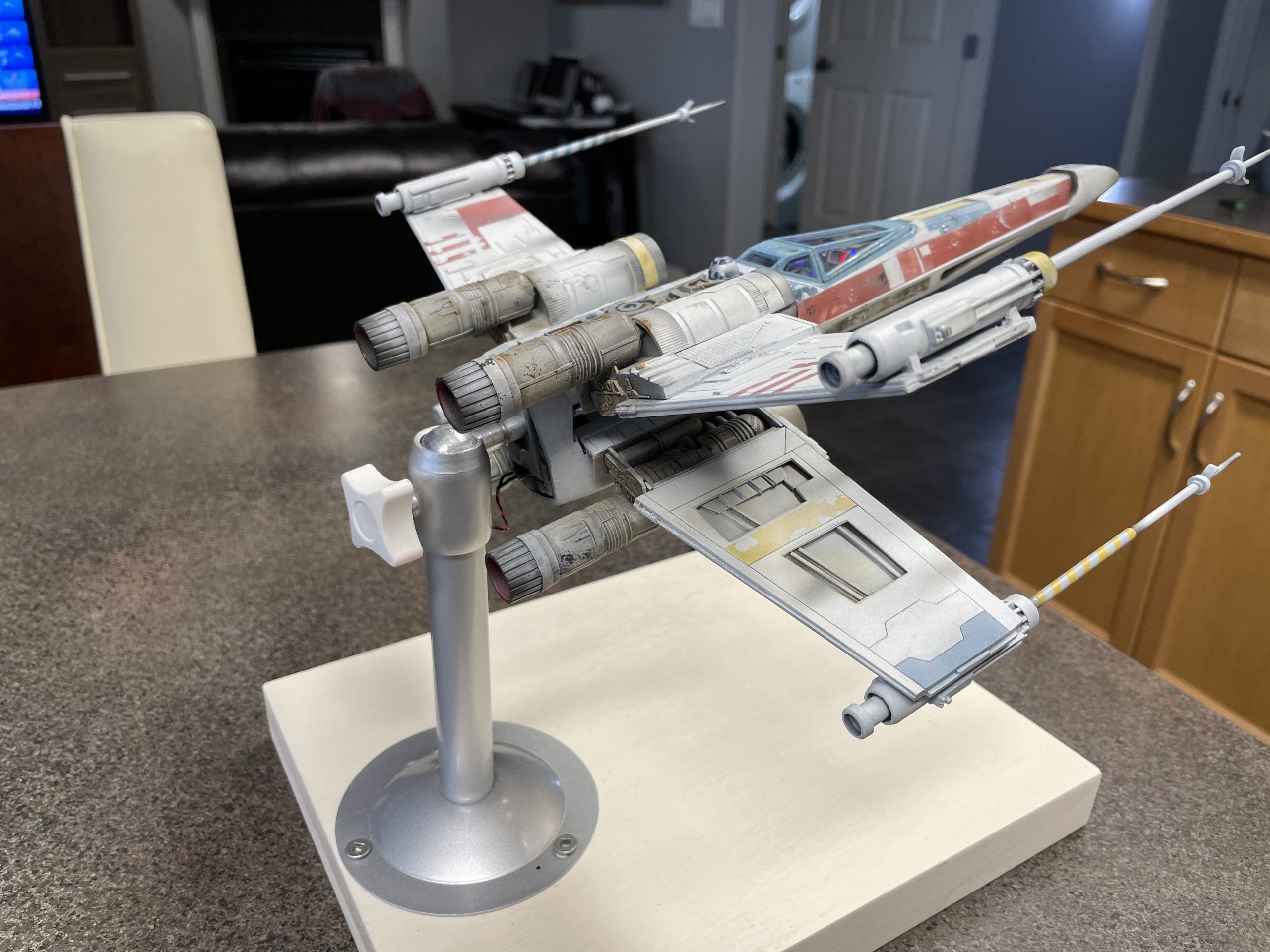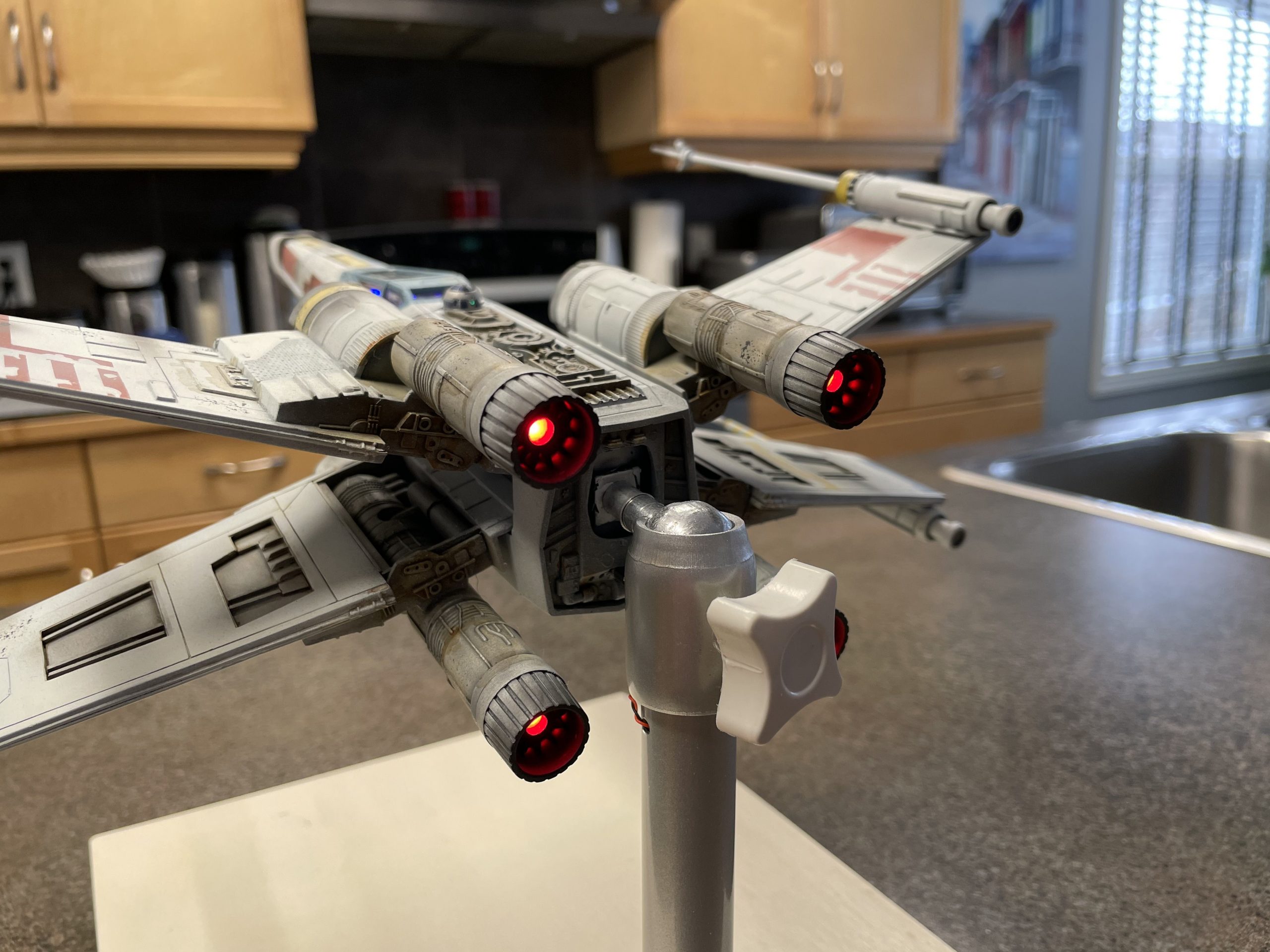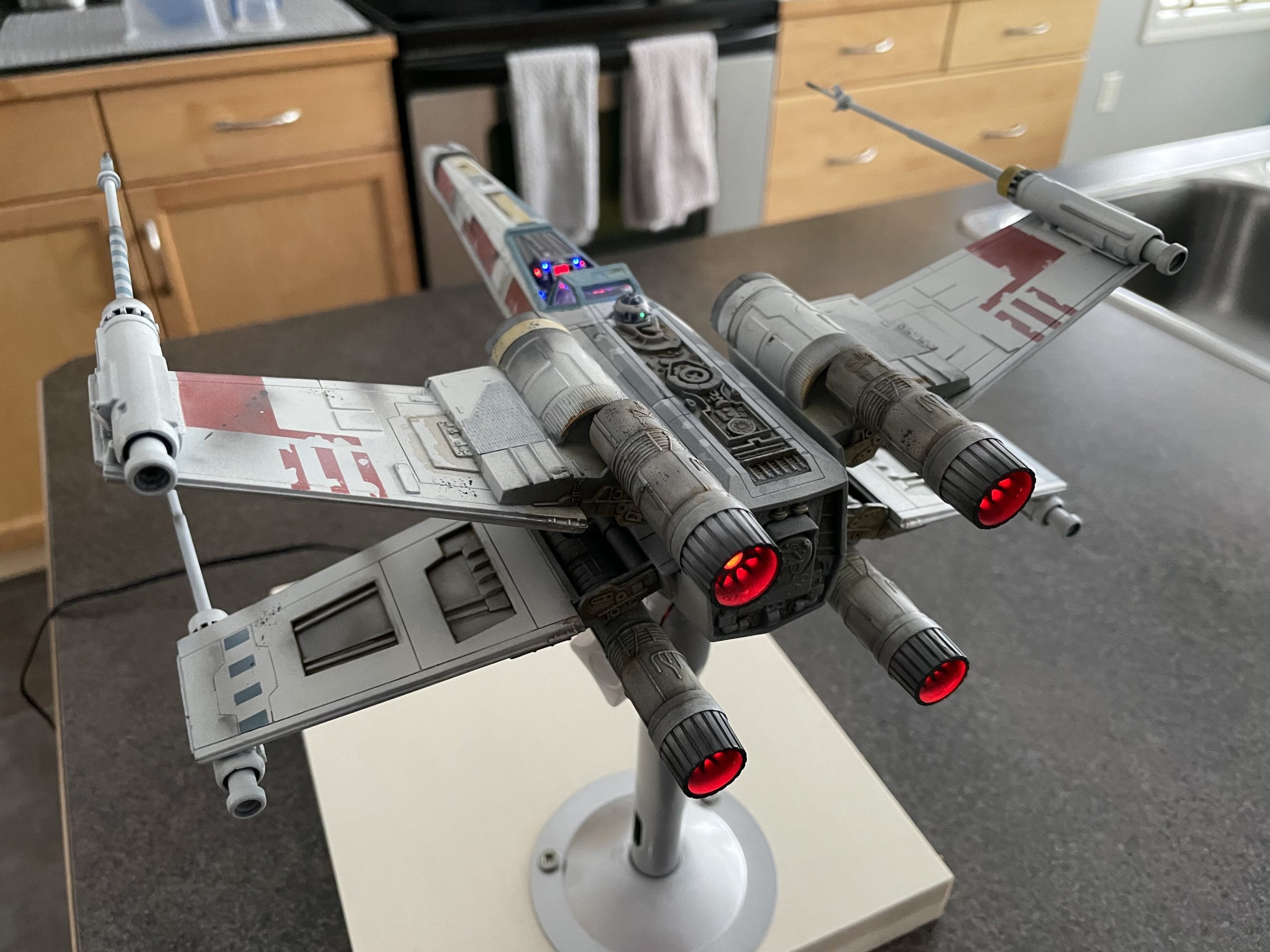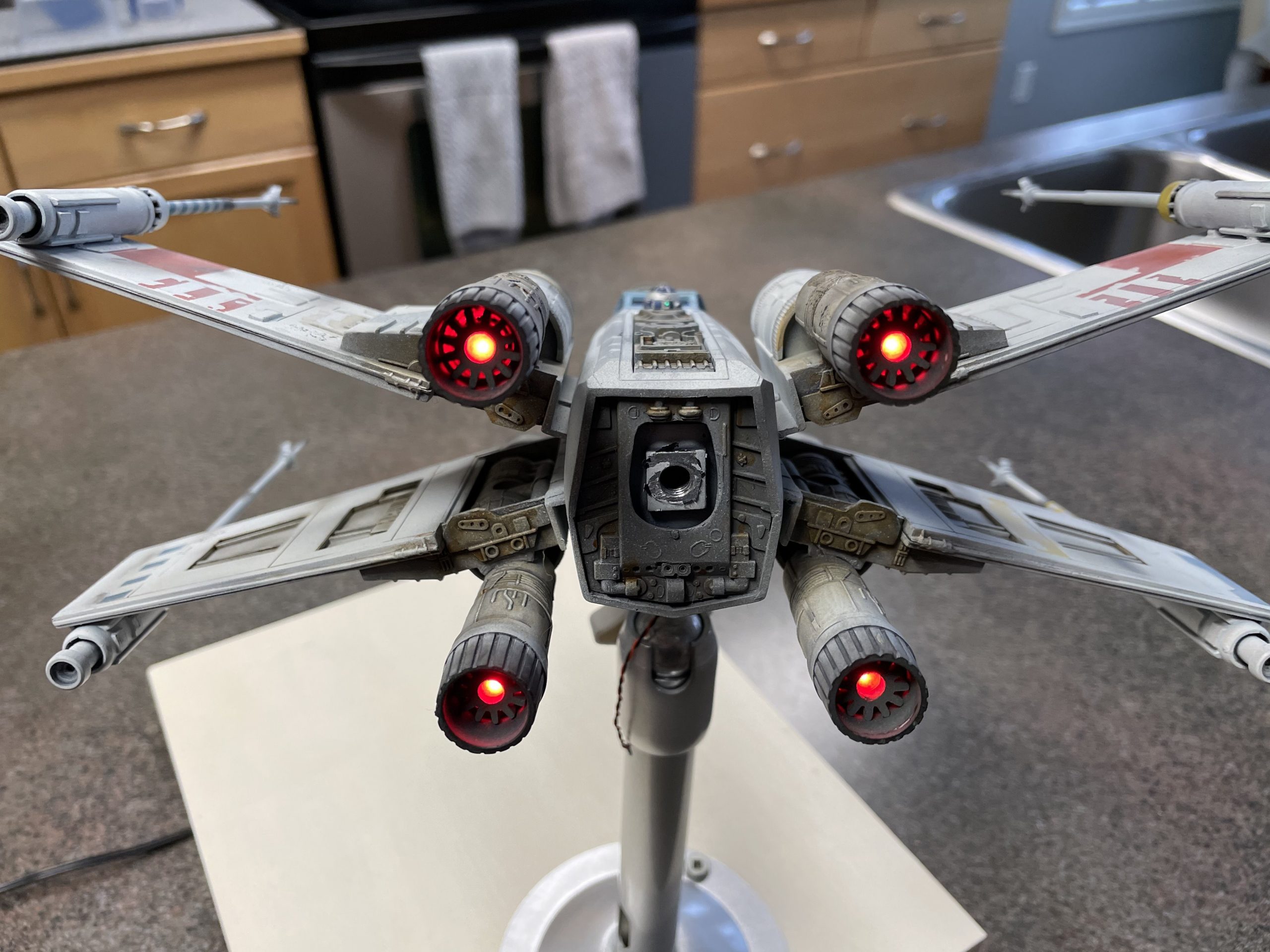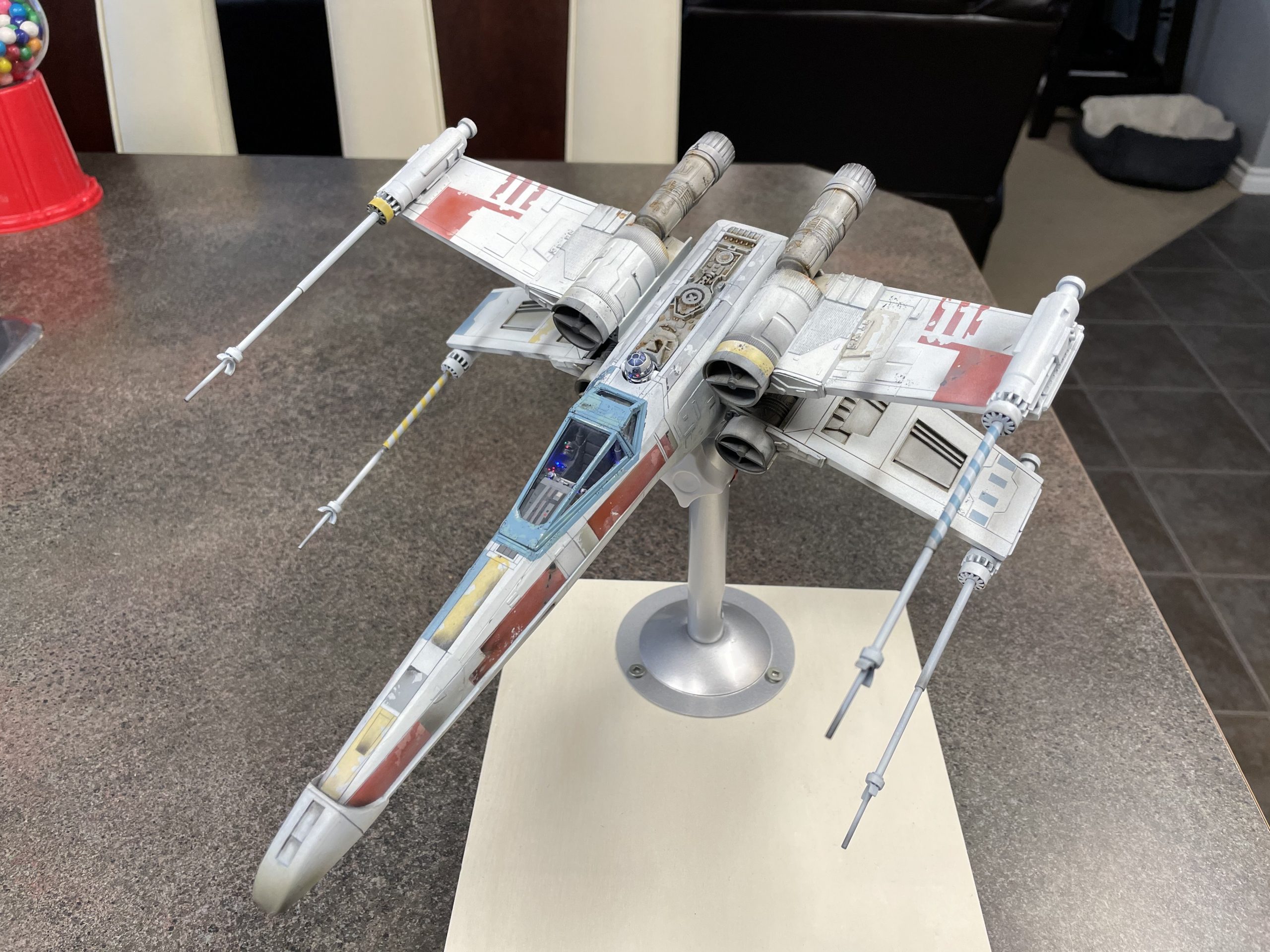 I pulled out my really old MPC X-Wing kit to build, and I kind of got carried away with it. What started as a simple out of the box build became a little more. I threw out the cannons and replaced them with brass rods, spruced up the cockpit a bit (as the kit one was pathetic), then I added two mounting points (one on the bottom with a plug and one in the rear with a plug). I cut out the round area in the rear area and glued in a magnet on the back. I then added detail to the interior wings and cut off those two damned nubs, and filling the holes on the wings. I lit up the engines with four red flickering LED’s, with The cockpit and R2 unit using Fiber Optics, and placing styrene bits here and there. For those of you who have built this kit, and many there are, you will notice the additions. I wanted to cut the windows out of the canopy, but being over 40 years old it was very brittle so it’s not glued on. I’m hoping to find someone to 3D print me a new canopy and maybe a pilot as well. It is a bit heavy on the weathering, and in no way is this depicting any sort of RED # X-Wing that we know of. I just had fun with it and enjoyed every second of bringing it to life. This is definitely a far cry from my first time building this when I was 11 years old! Like I stated, this was a FUN Build!