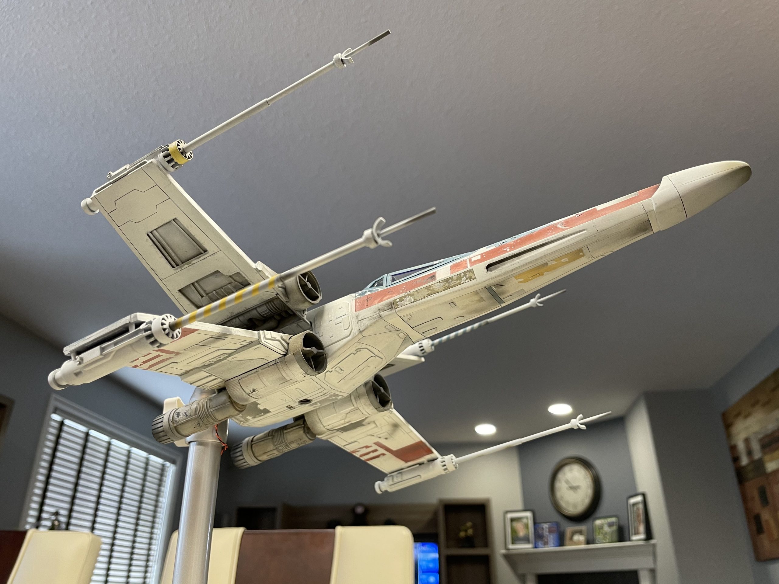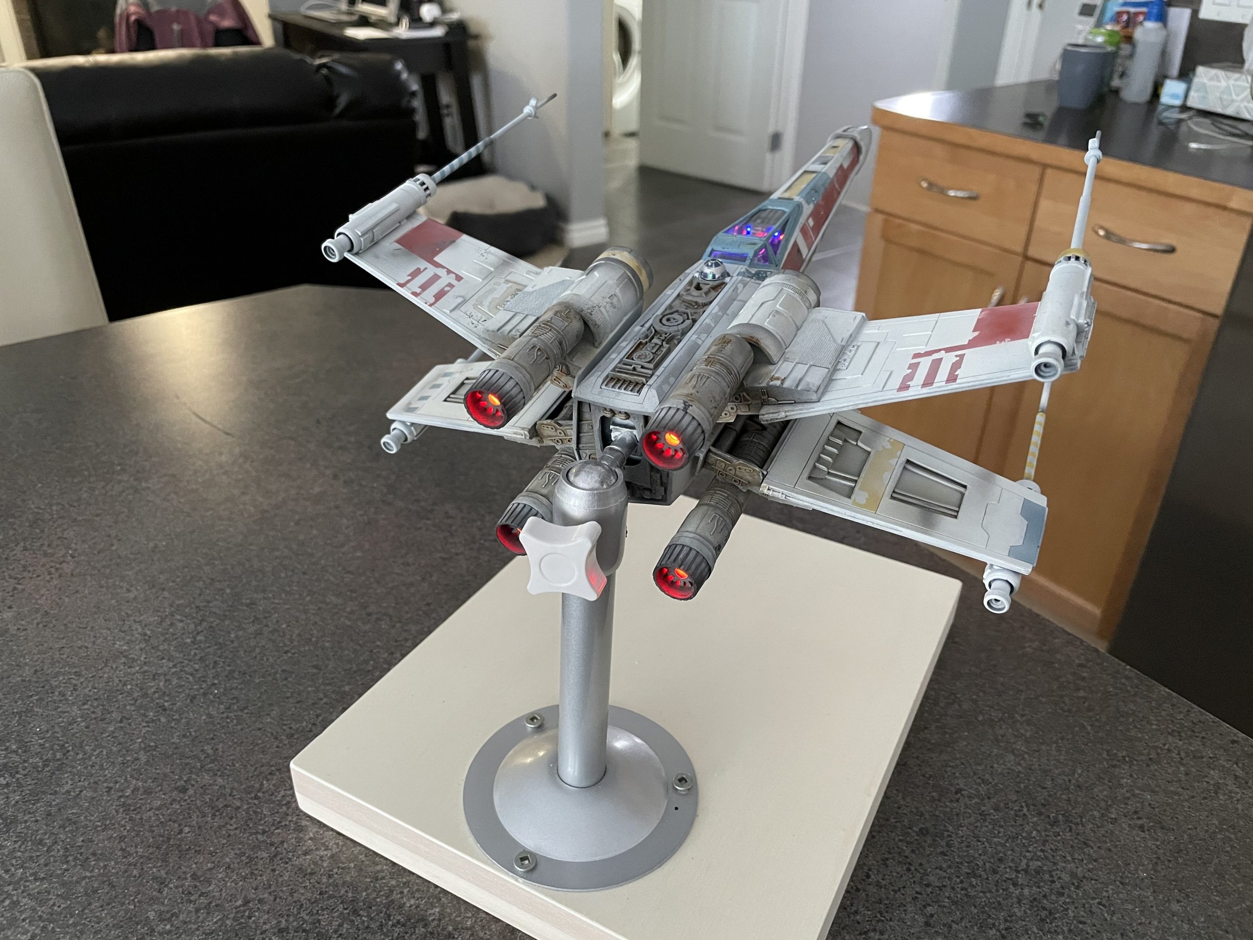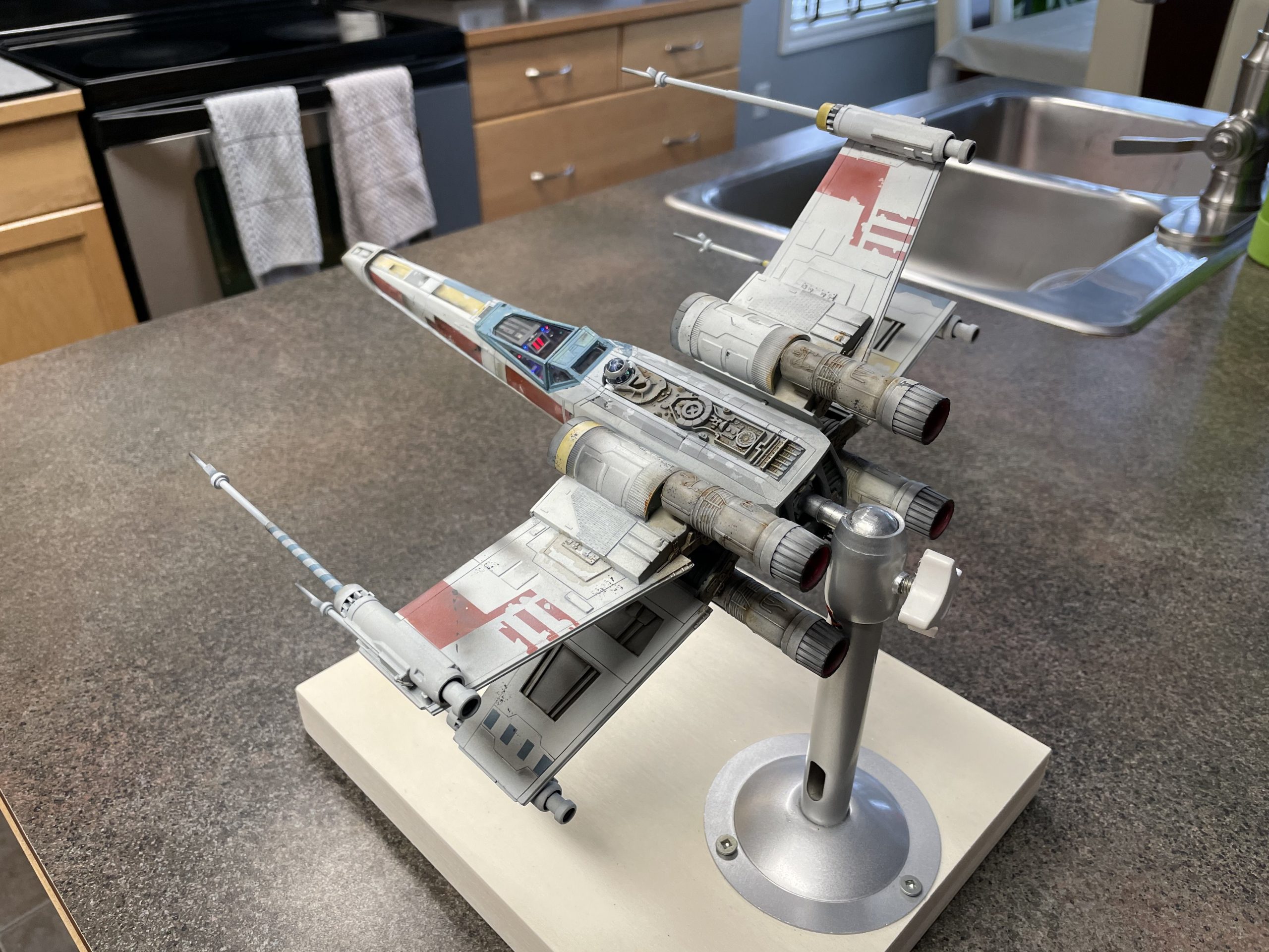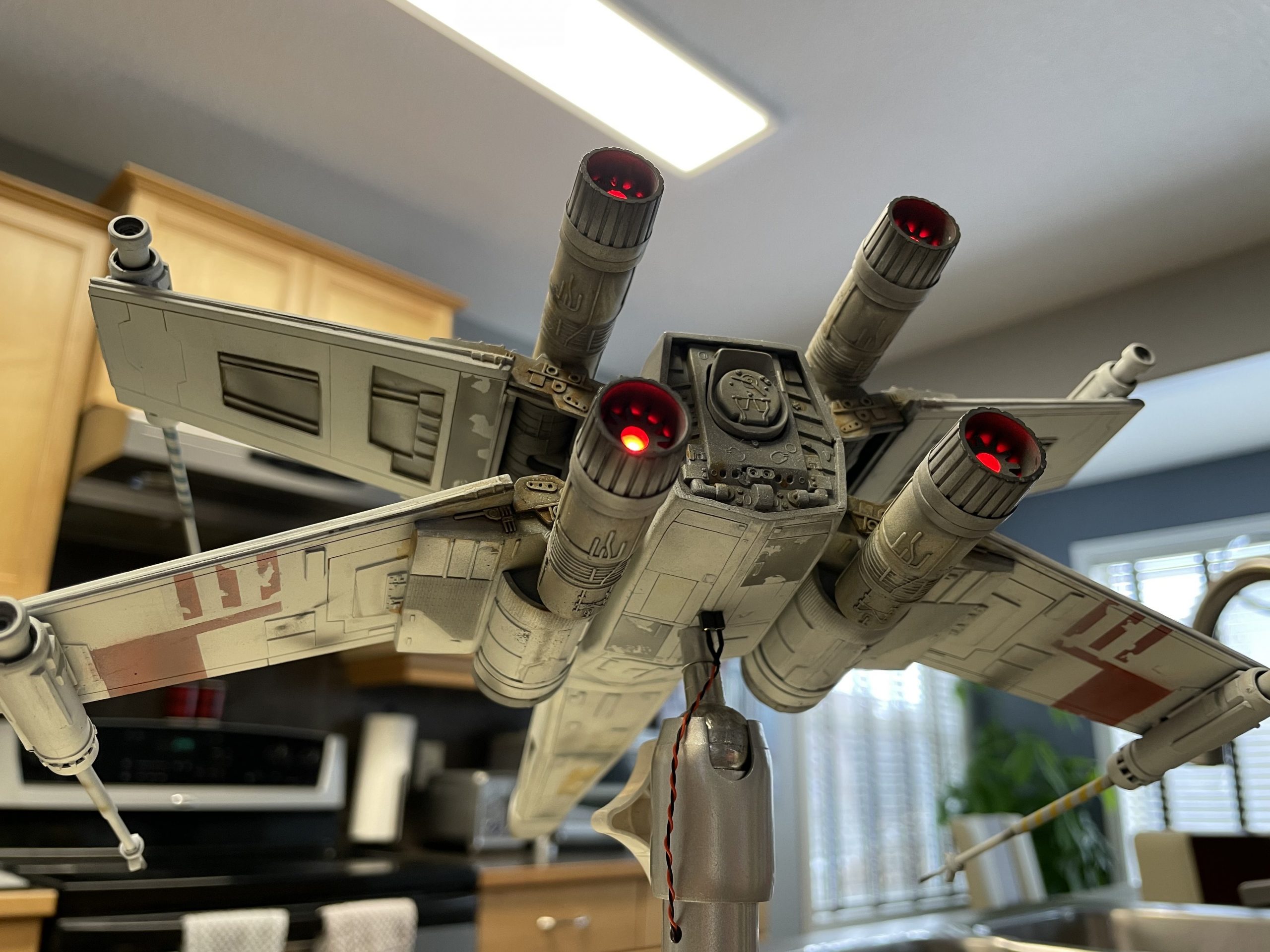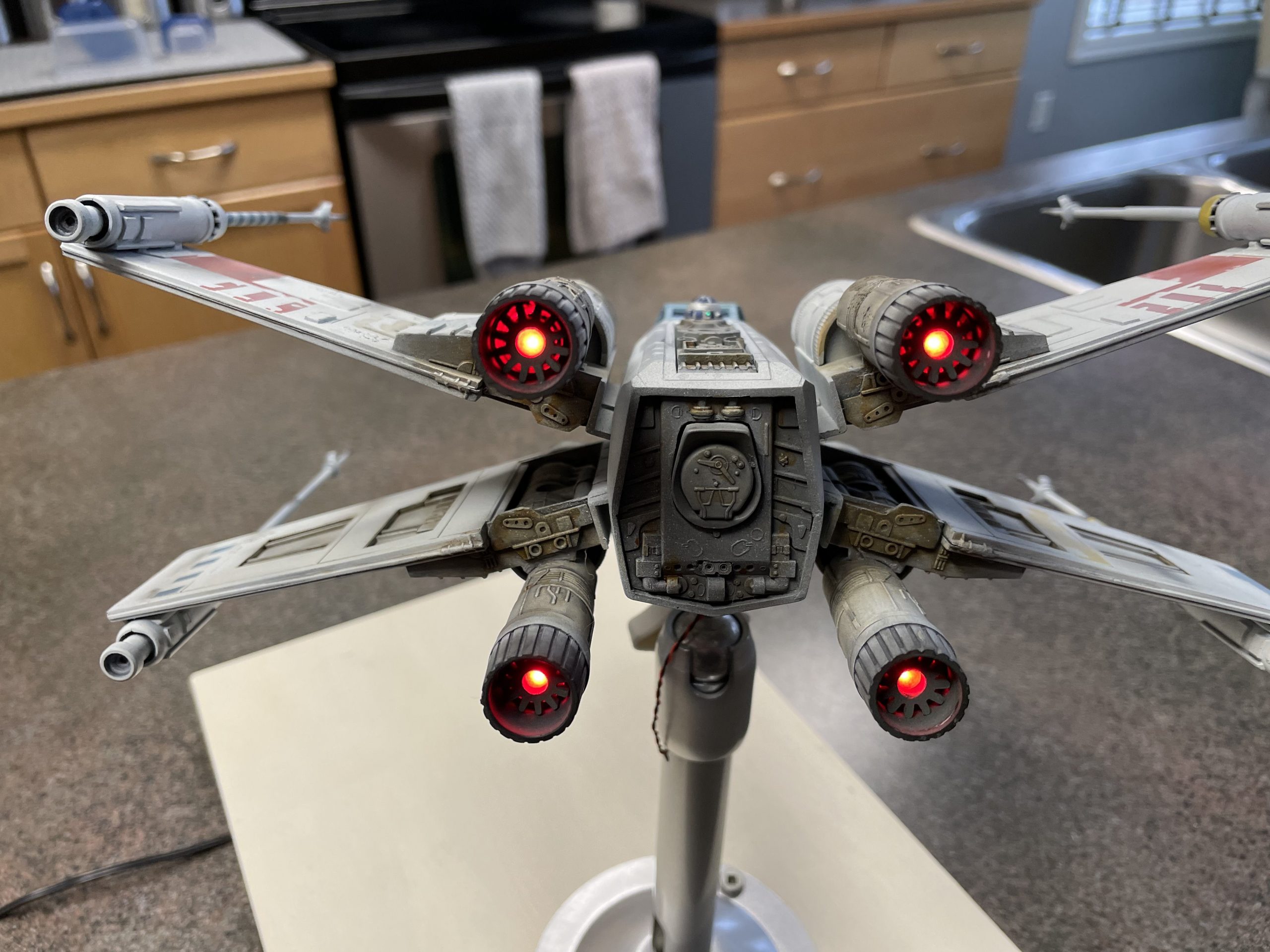 I pulled out my really old MPC X-Wing kit to build, and I kind of got carried away with it. What started as a simple out of the box build became a little more. I threw out the cannons and replaced them with brass rods, spruced up the cockpit a bit (as the kit one was pathetic), then I added two mounting points (one on the bottom with a plug and one in the rear with a plug). I cut out the round area in the rear area and glued in a magnet on the back. I then added detail to the interior wings and cut off those two damned nubs, and filling the holes on the wings. I lit up the engines with four red flickering LED’s, with The cockpit and R2 unit using Fiber Optics, and placing styrene bits here and there. For those of you who have built this kit, and many there are, you will notice the additions. I wanted to cut the windows out of the canopy, but being over 40 years old it was very brittle so it’s not glued on. I’m hoping to find someone to 3D print me a new canopy and maybe a pilot as well. It is a bit heavy on the weathering, and in no way is this depicting any sort of RED # X-Wing that we know of. I just had fun with it and enjoyed every second of bringing it to life. This is definitely a far cry from my first time building this when I was 11 years old! Like I stated, this was a FUN Build!
