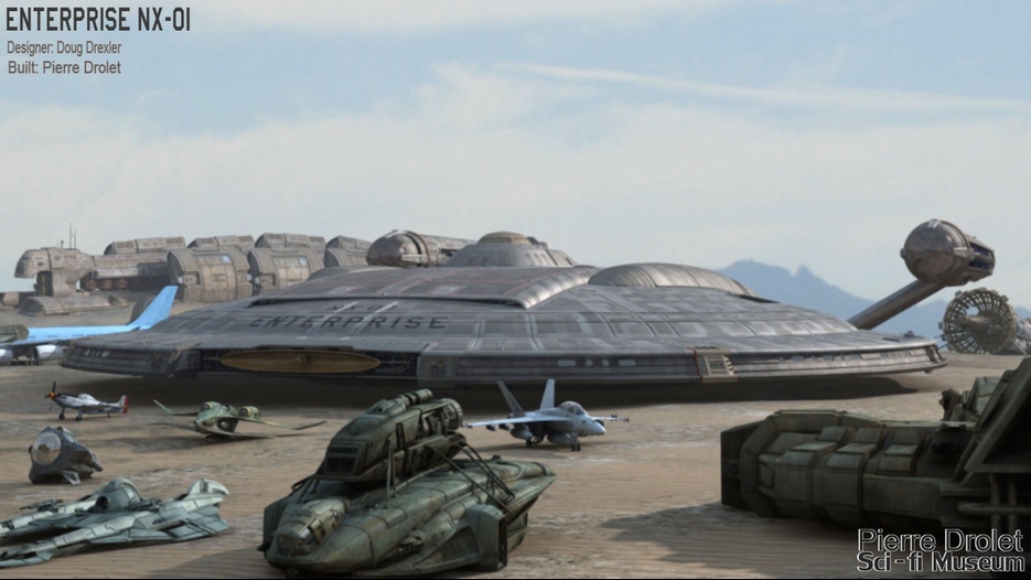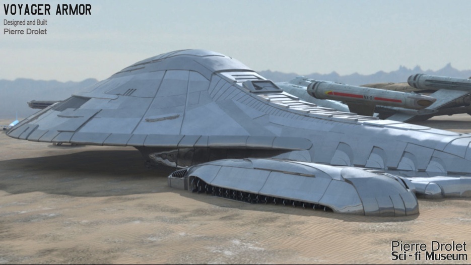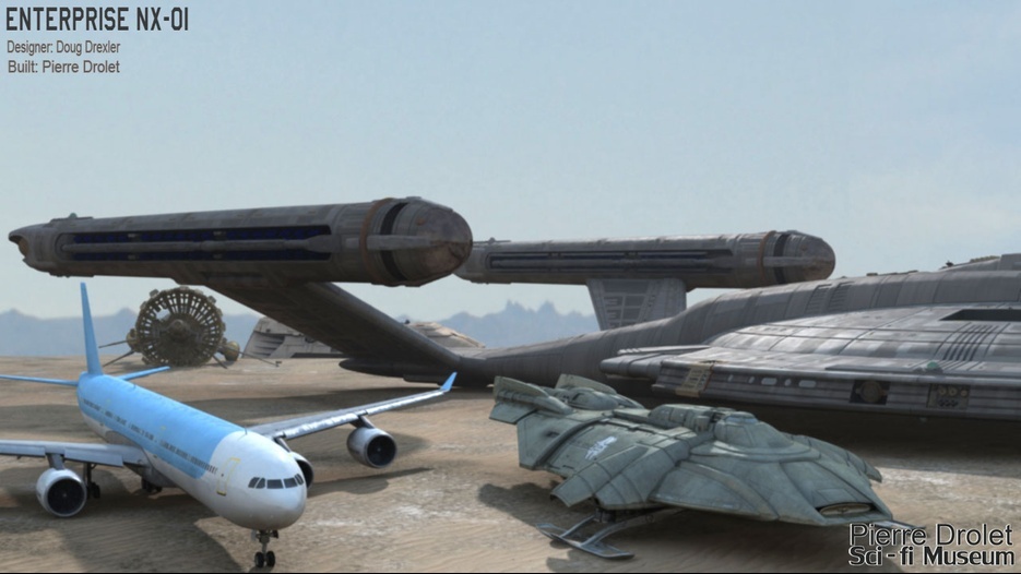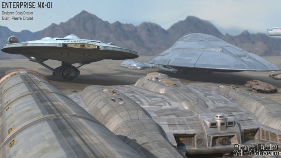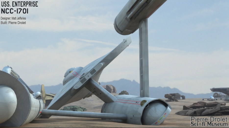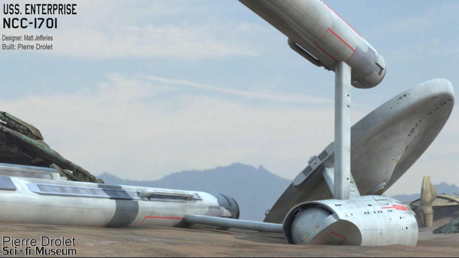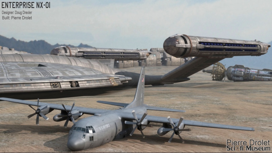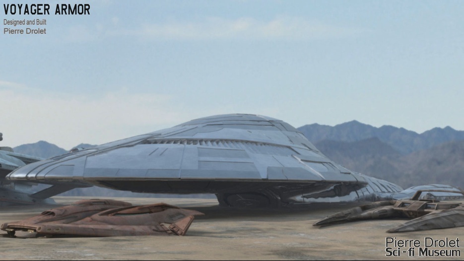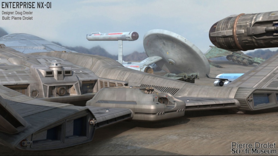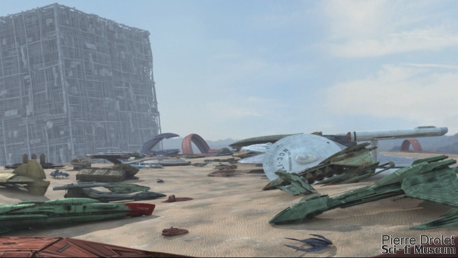 Pierre Drolet’s talents are well noted in both the industry and the art form. His choice to take all the fantastic CG builds of Starship designs and place them in a desert looking environment really gave me chills. It is completely reminiscent of today’s retired aircraft boneyards, but on the huge scale they are. I can’t even imagine being able to walk among something like this should they have been real! Absolutely fantastic! Plus, you will notice great designs from Doug Drexler, John Eaves, and even Matt Jeffries among these works of Pierre’s! OUTSTANDING!!