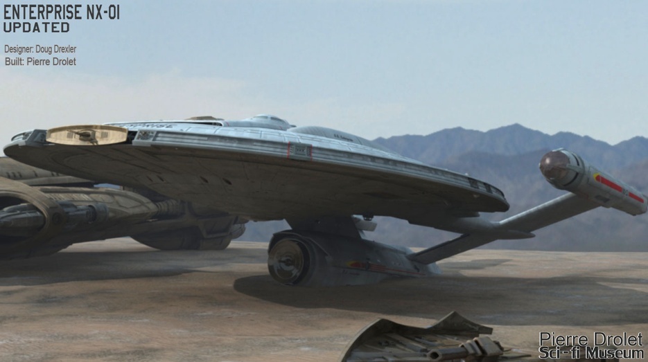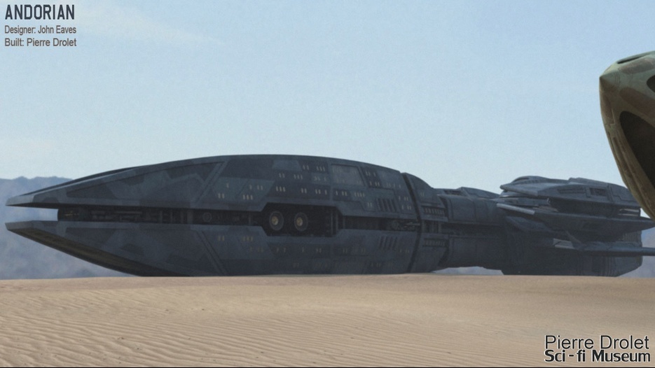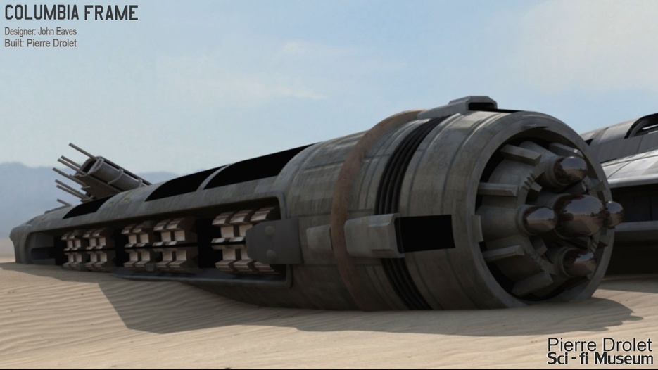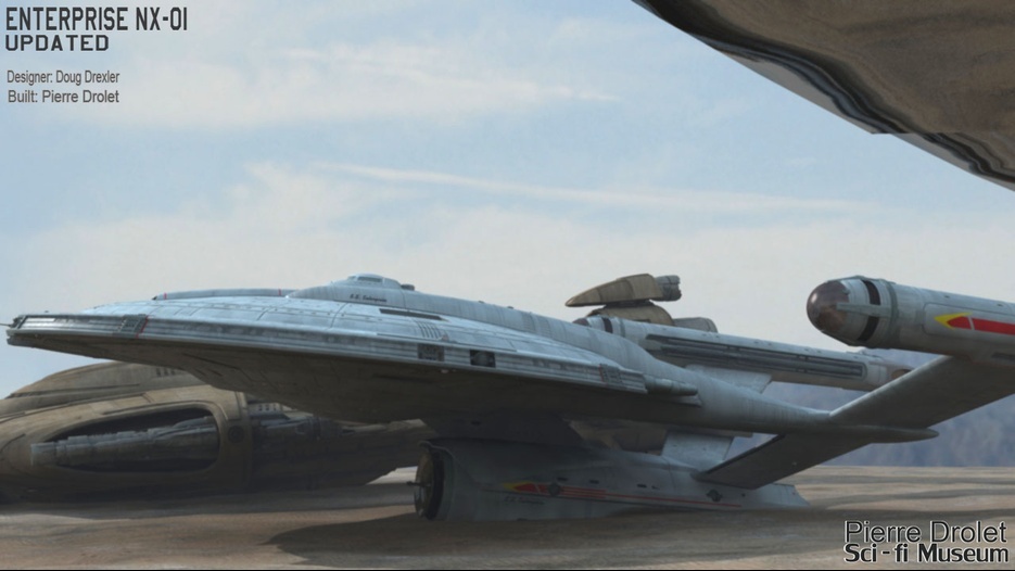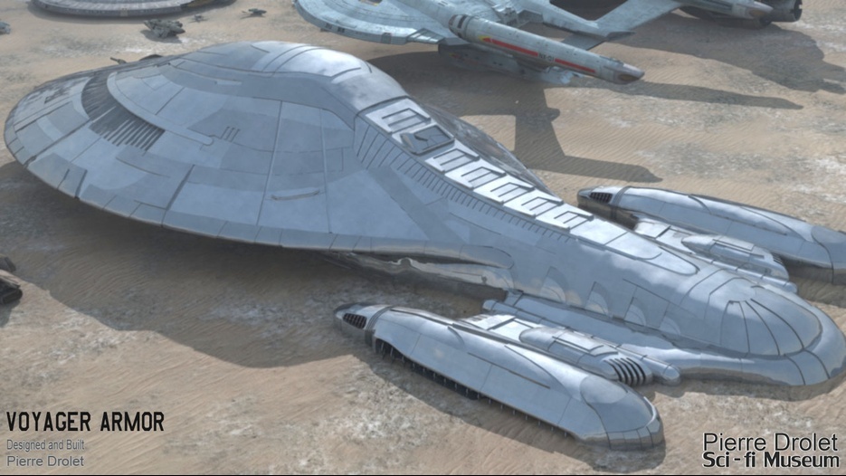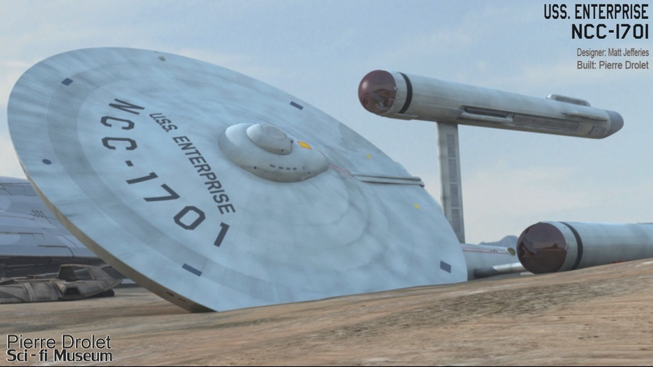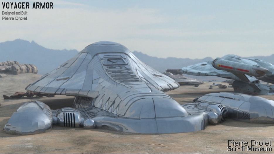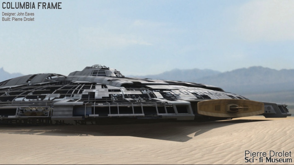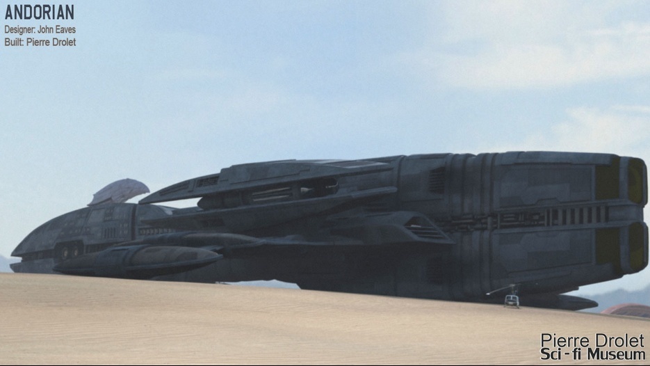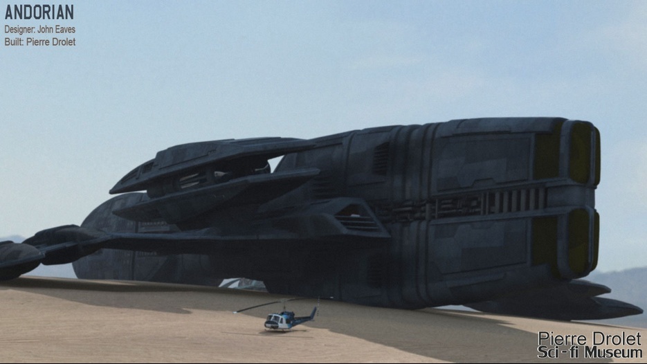 Pierre Drolet’s talents are well noted in both the industry and the art form. His choice to take all the fantastic CG builds of Starship designs and place them in a desert looking environment really gave me chills. It is completely reminiscent of today’s retired aircraft boneyards, but on the huge scale they are. I can’t even imagine being able to walk among something like this should they have been real! Absolutely fantastic! Plus, you will notice great designs from Doug Drexler, John Eaves, and even Matt Jeffries among these works of Pierre’s! OUTSTANDING!!