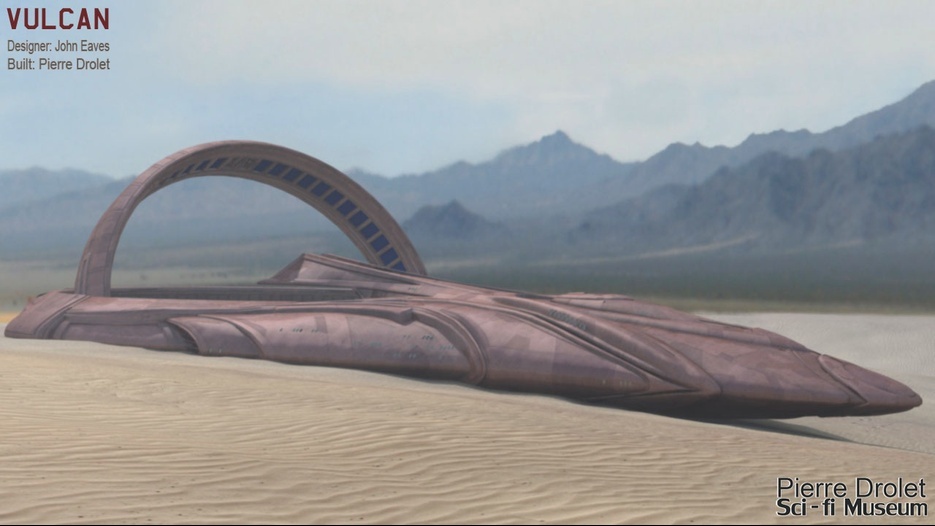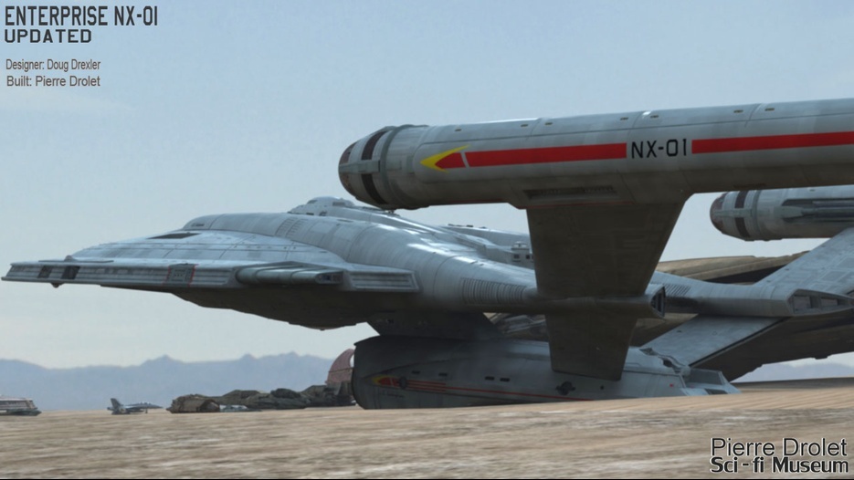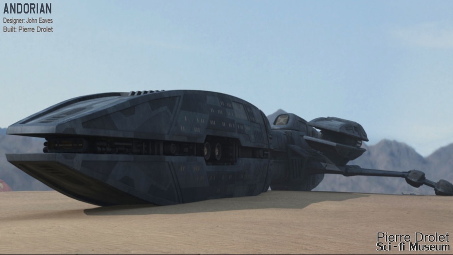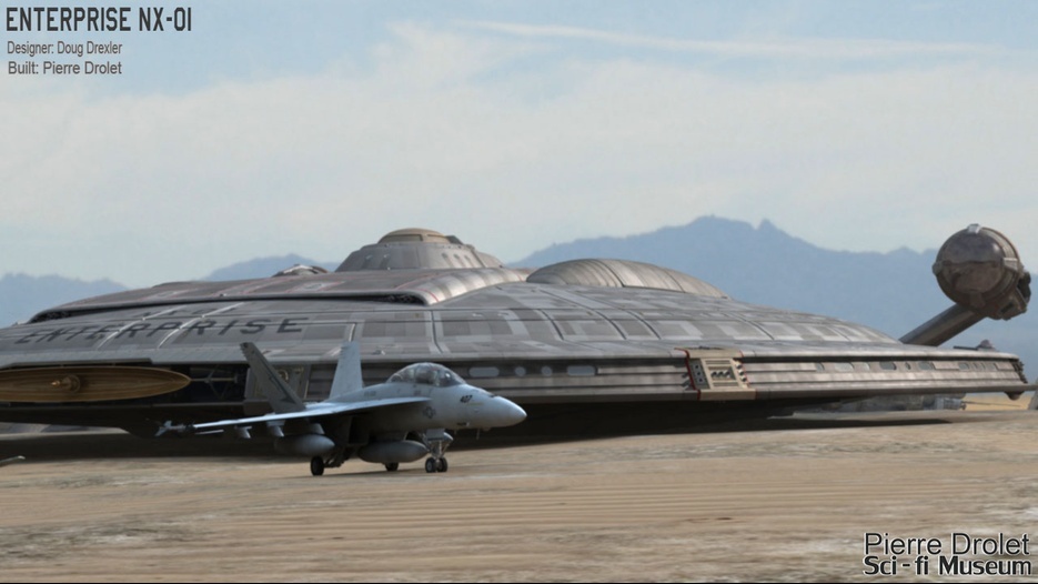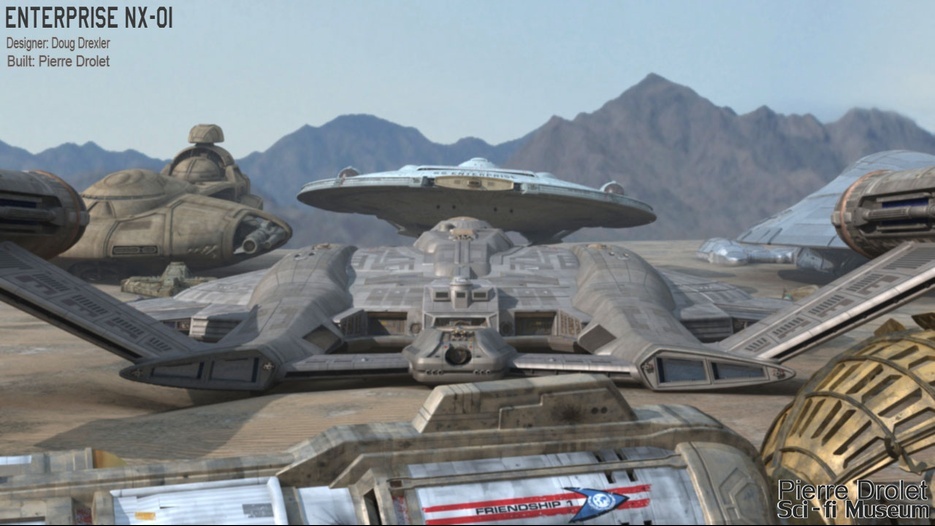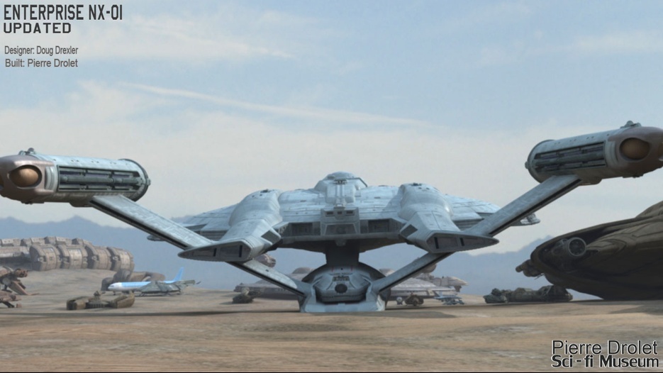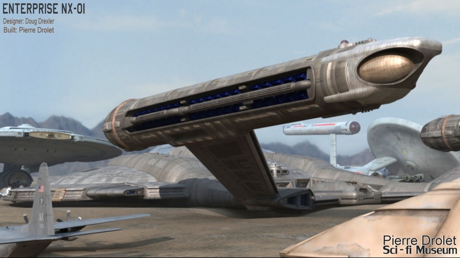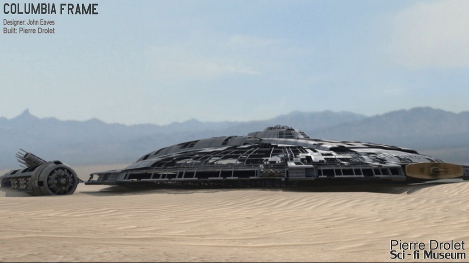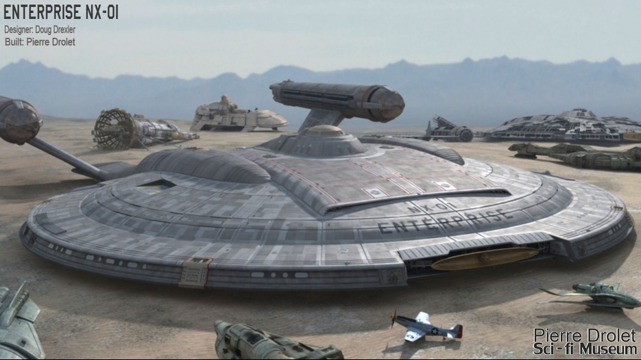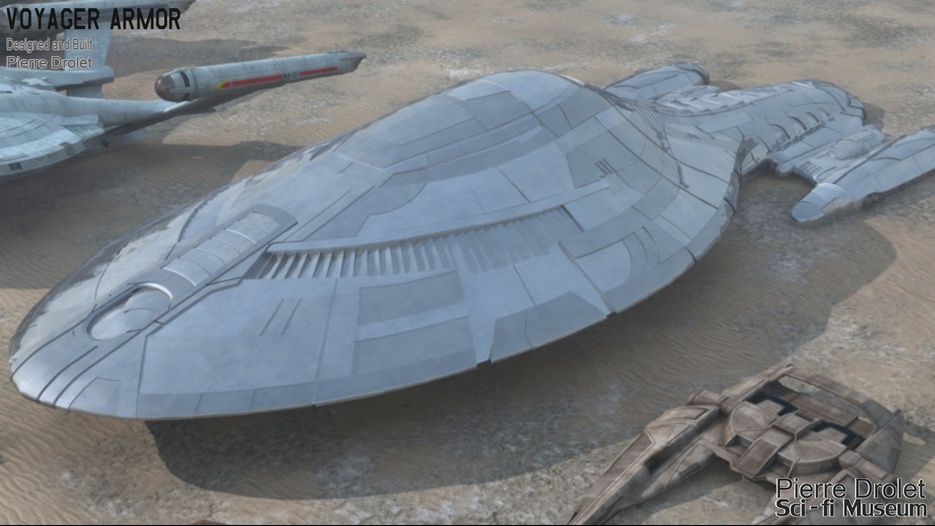 Pierre Drolet’s talents are well noted in both the industry and the art form. His choice to take all the fantastic CG builds of Starship designs and place them in a desert looking environment really gave me chills. It is completely reminiscent of today’s retired aircraft boneyards, but on the huge scale they are. I can’t even imagine being able to walk among something like this should they have been real! Absolutely fantastic! Plus, you will notice great designs from Doug Drexler, John Eaves, and even Matt Jeffries among these works of Pierre’s! OUTSTANDING!!