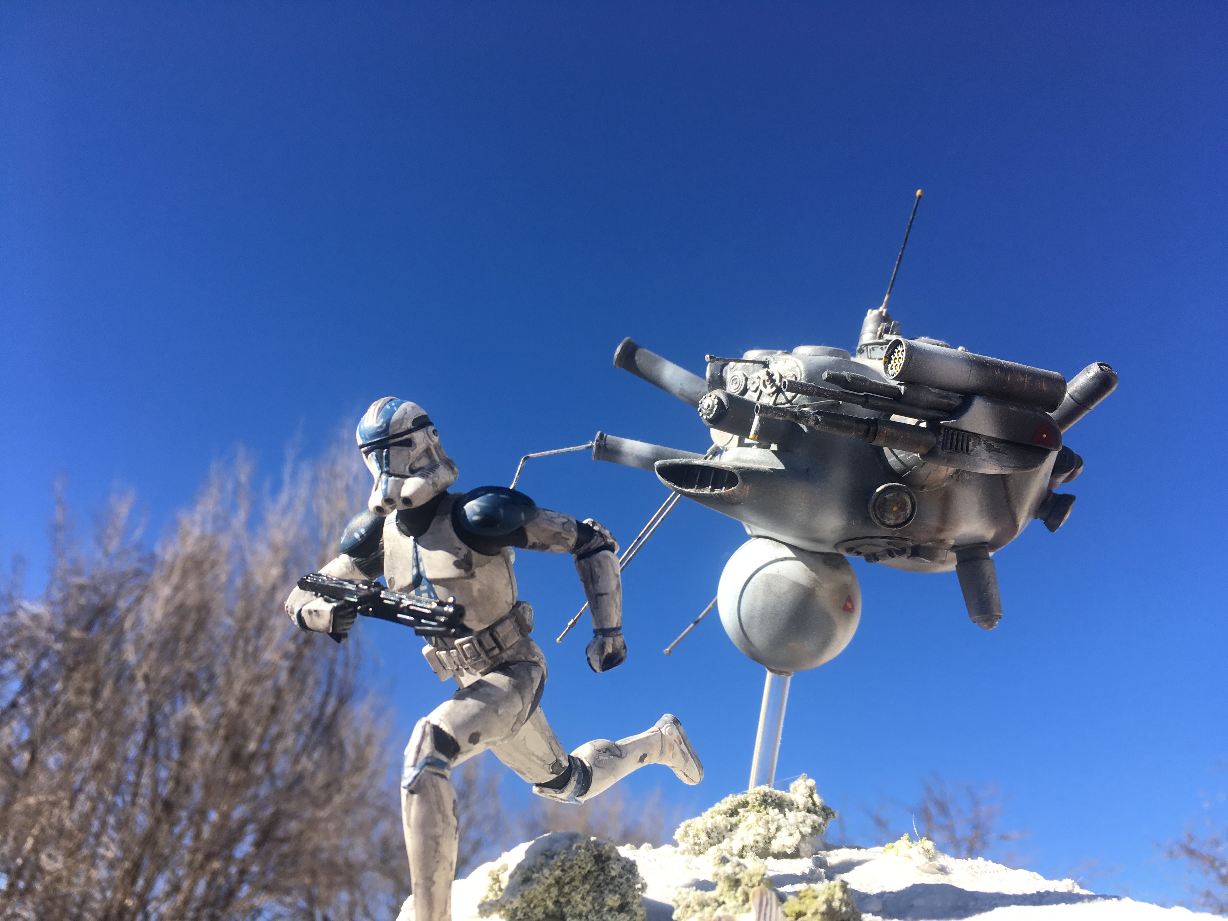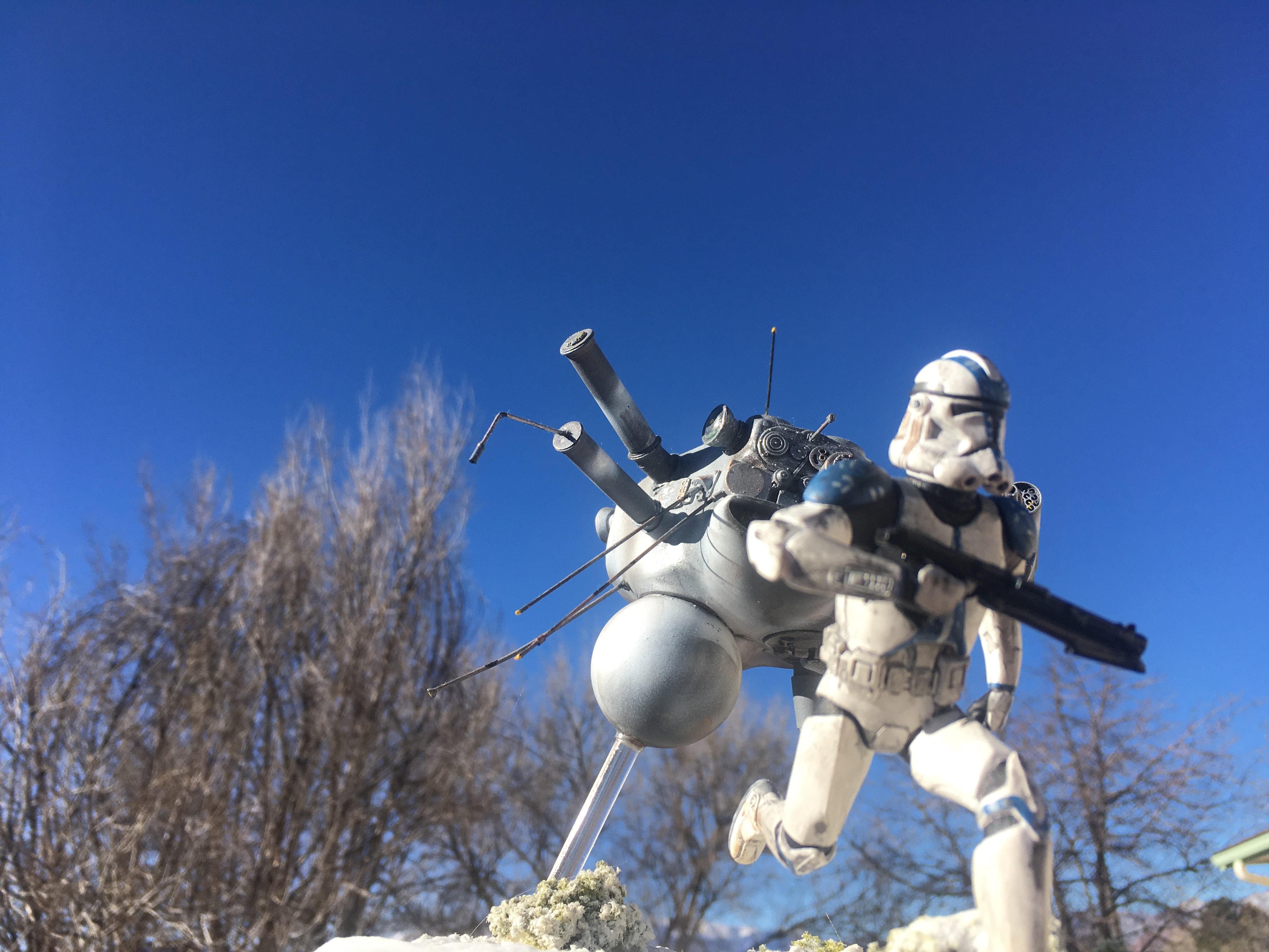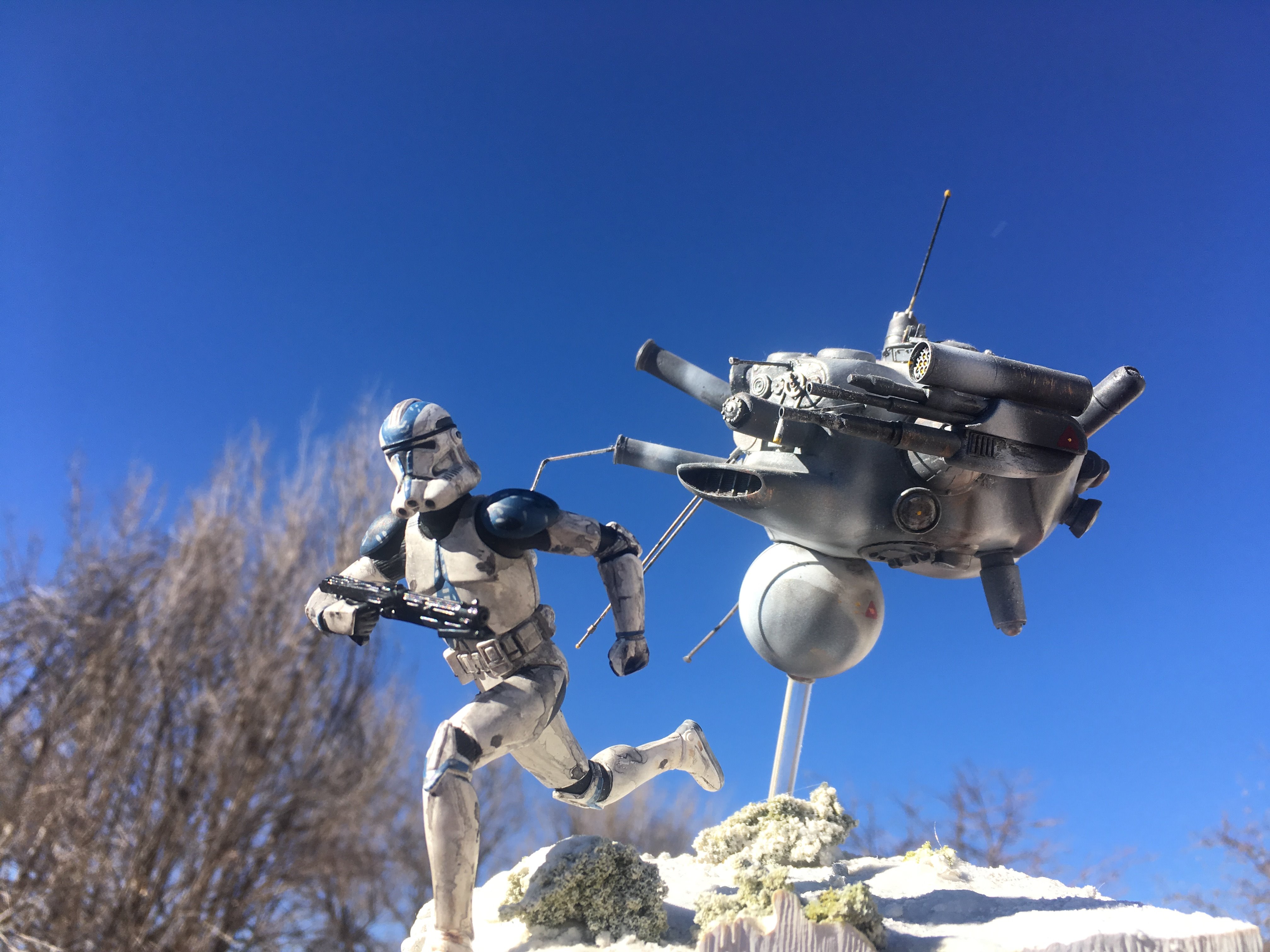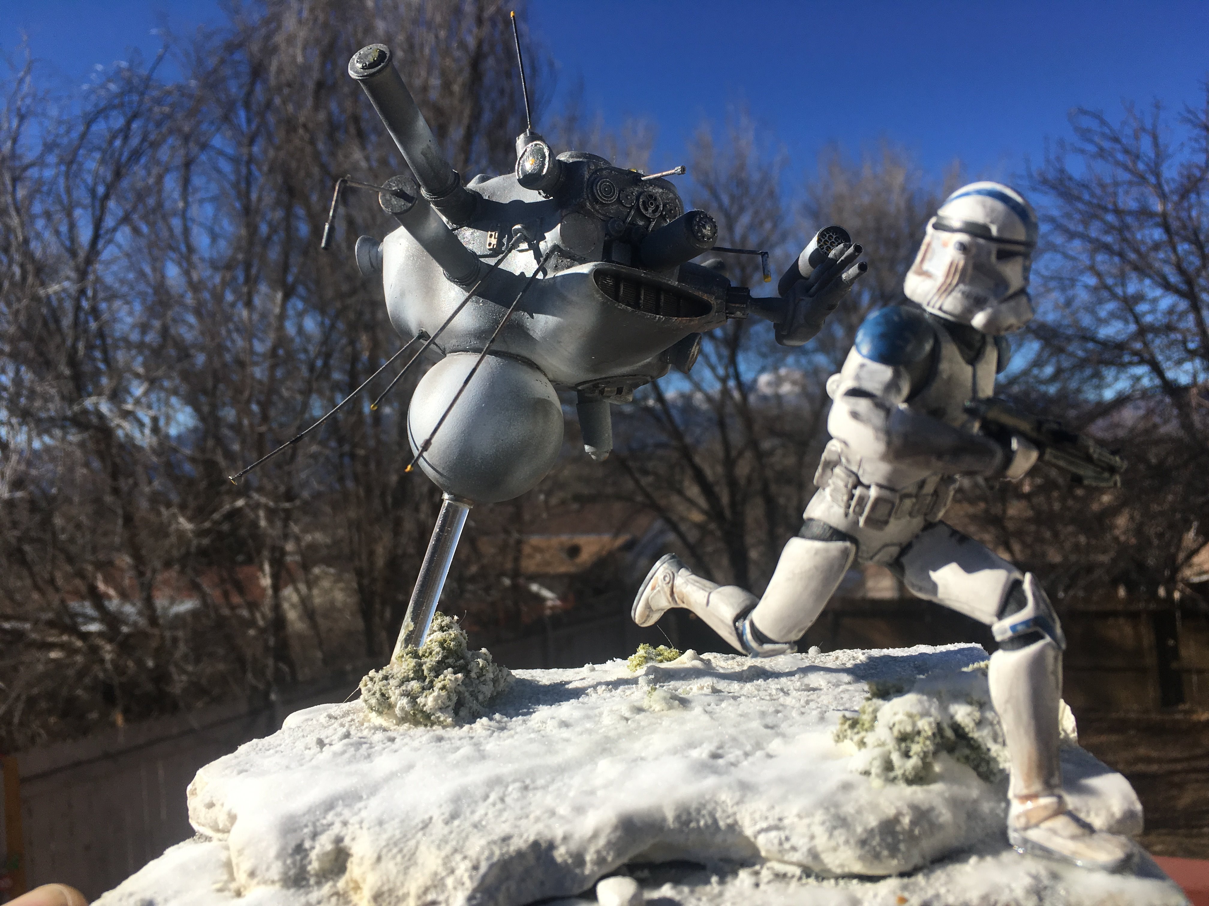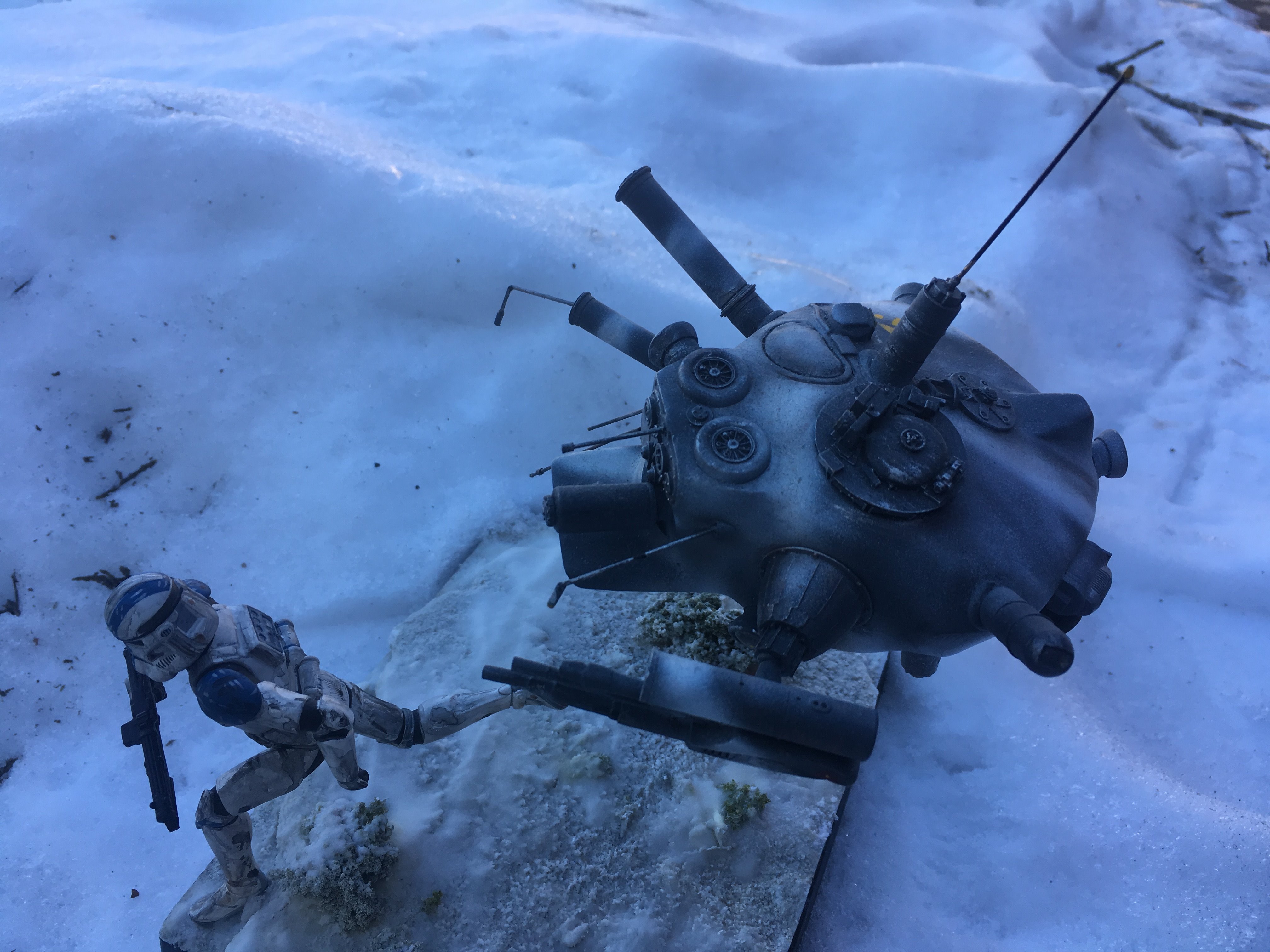 Here is my Porcupine Battle Probe Droid I just built from a resin kit. I had it for years sitting on the self. I added some guns and probes, and also I added a Hallmark Ornament Weathered Imperial Clone Trooper running from the droid. It’s kind of cool! I hope you like it!