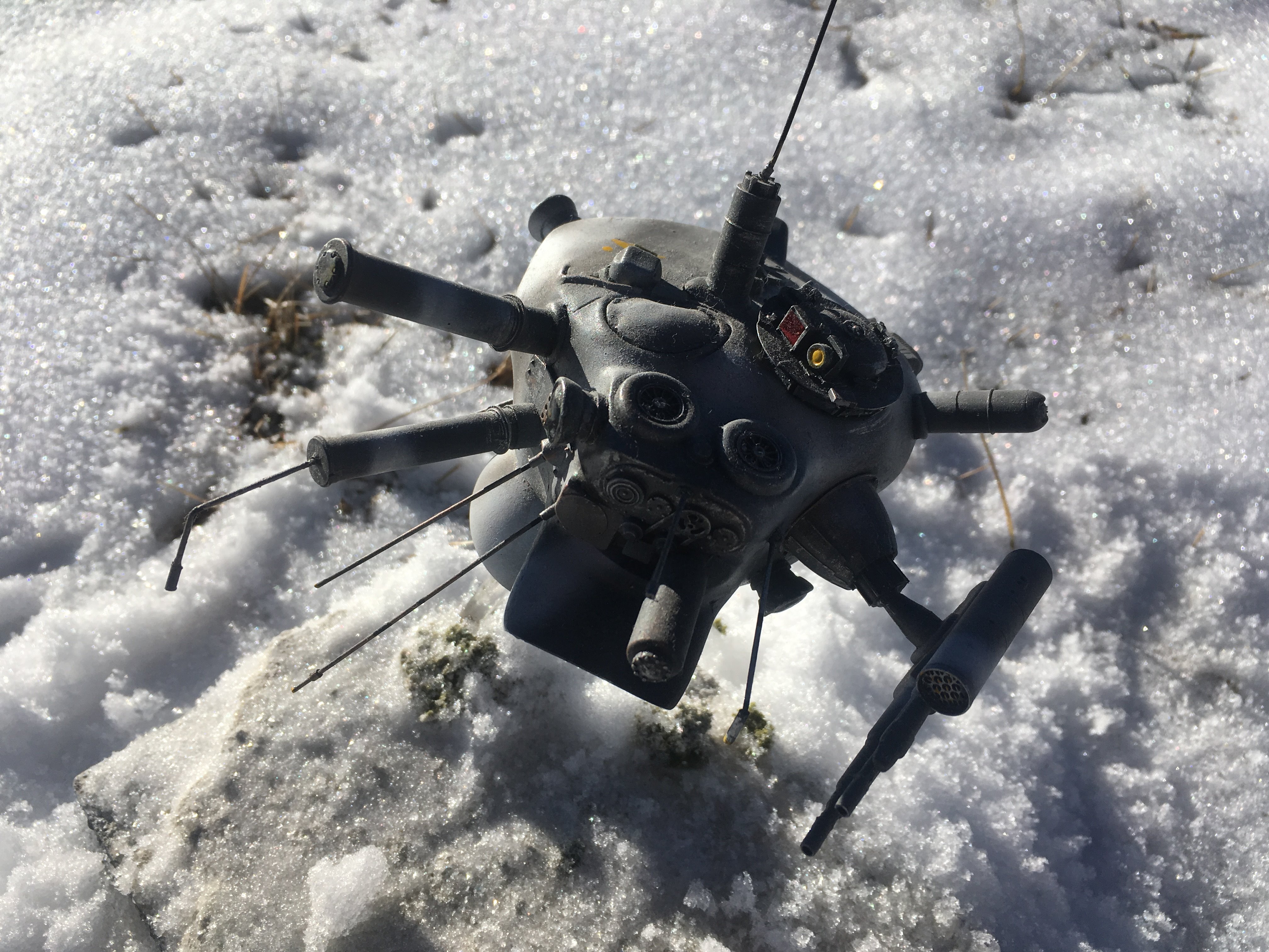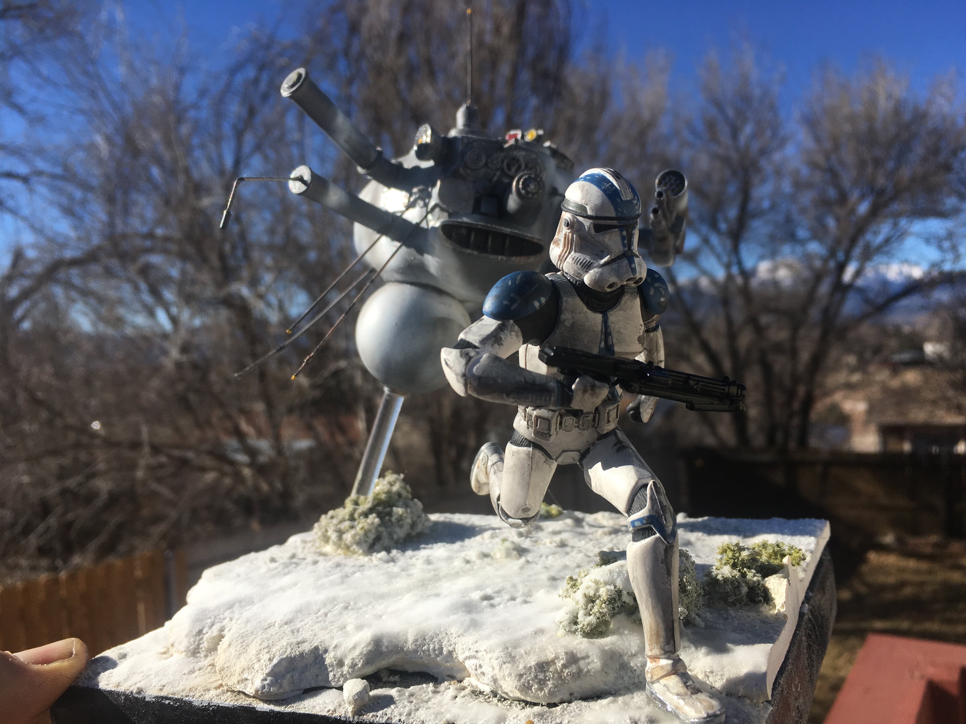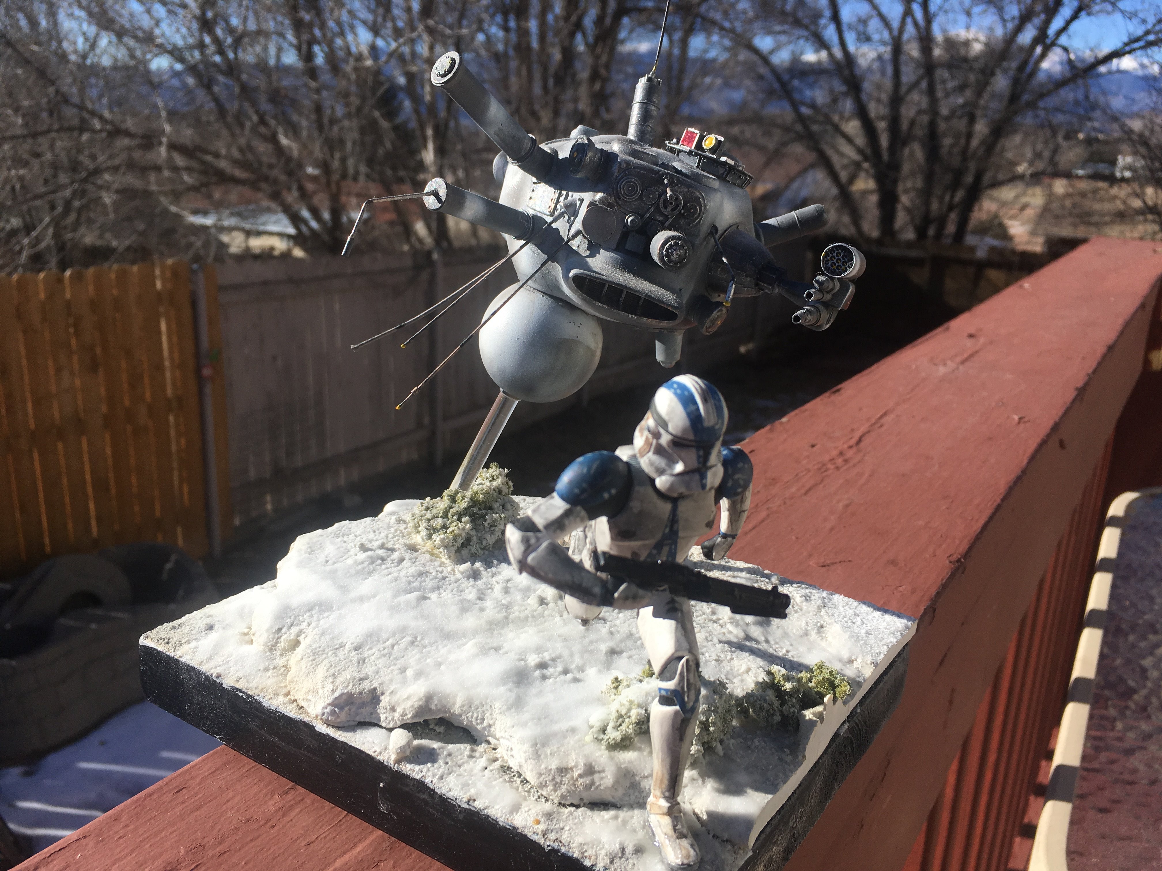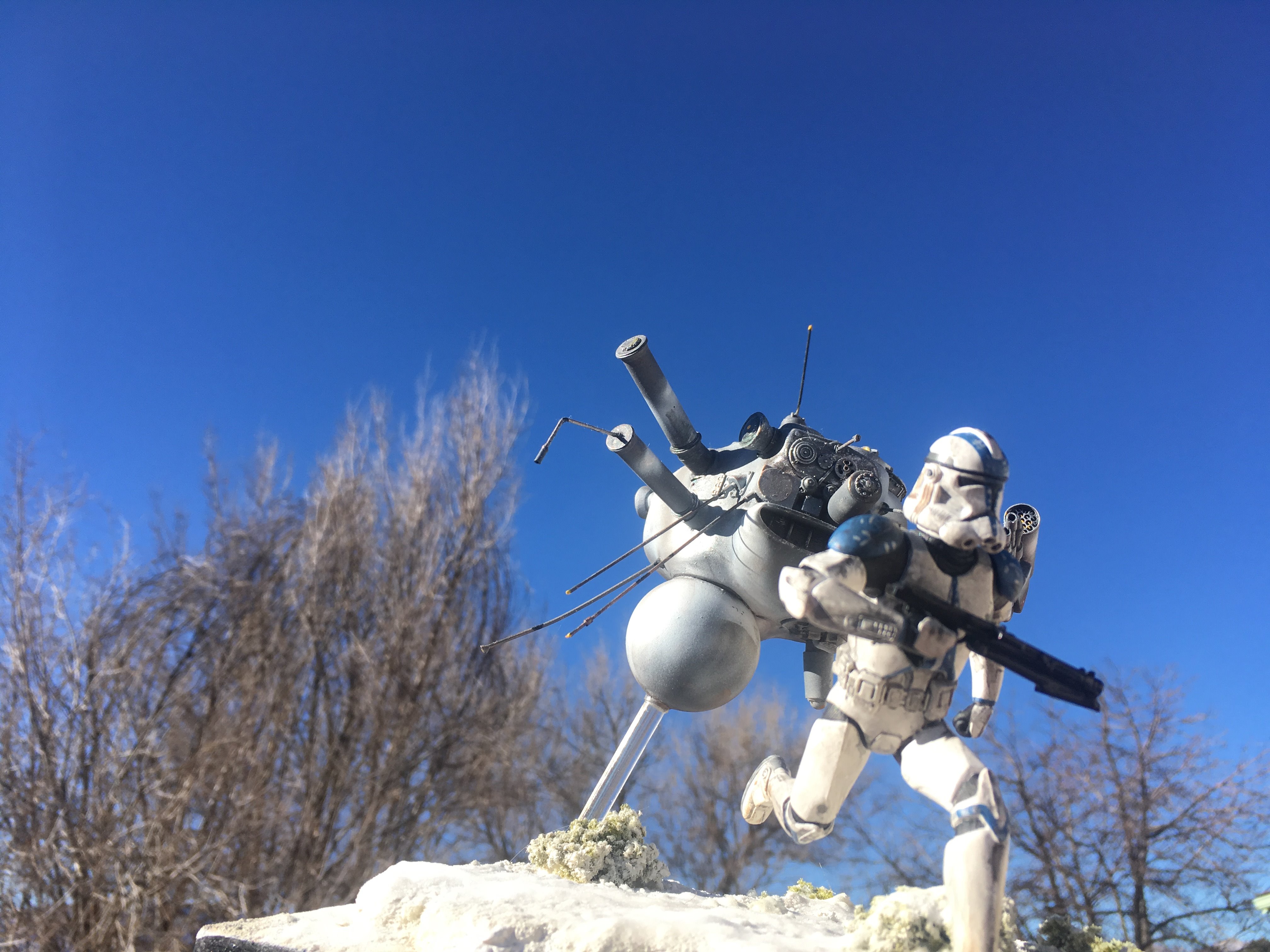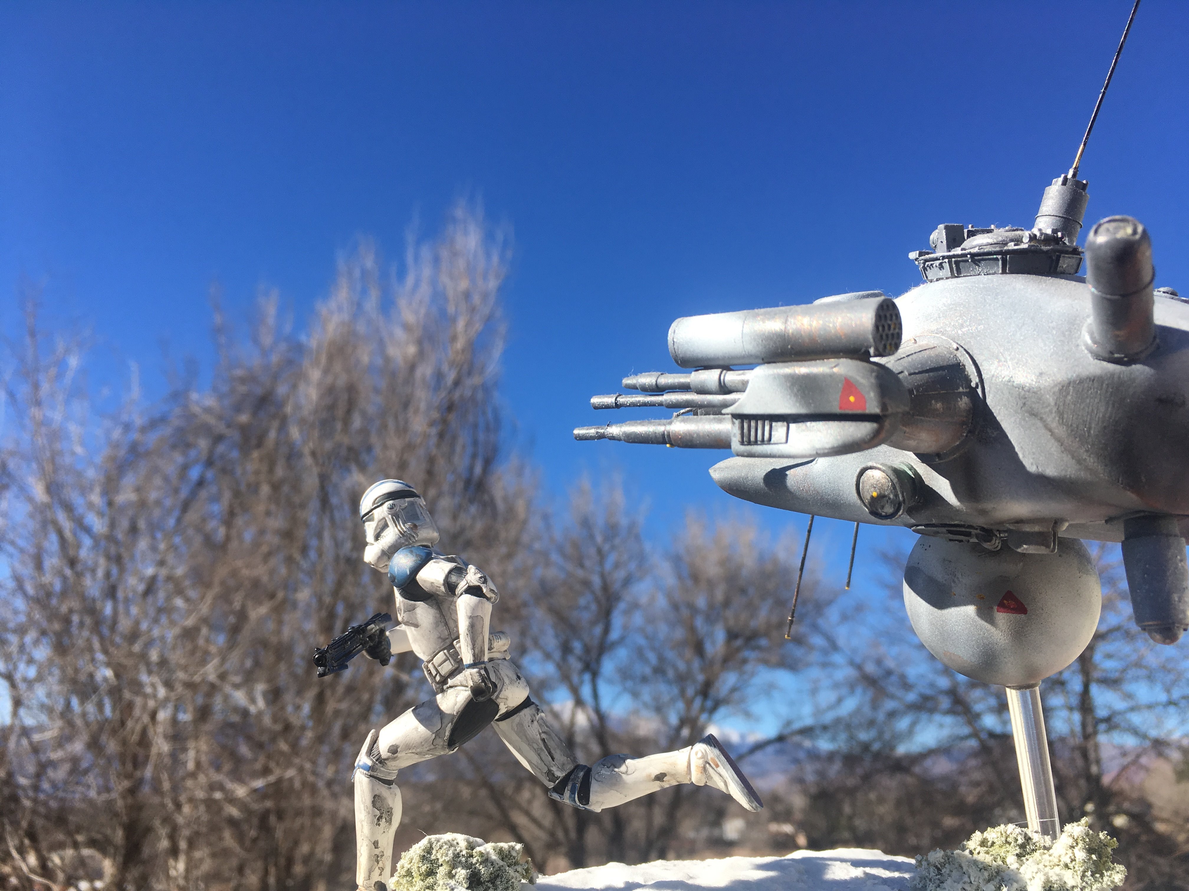 Here is my Porcupine Battle Probe Droid I just built from a resin kit. I had it for years sitting on the self. I added some guns and probes, and also I added a Hallmark Ornament Weathered Imperial Clone Trooper running from the droid. It’s kind of cool! I hope you like it!