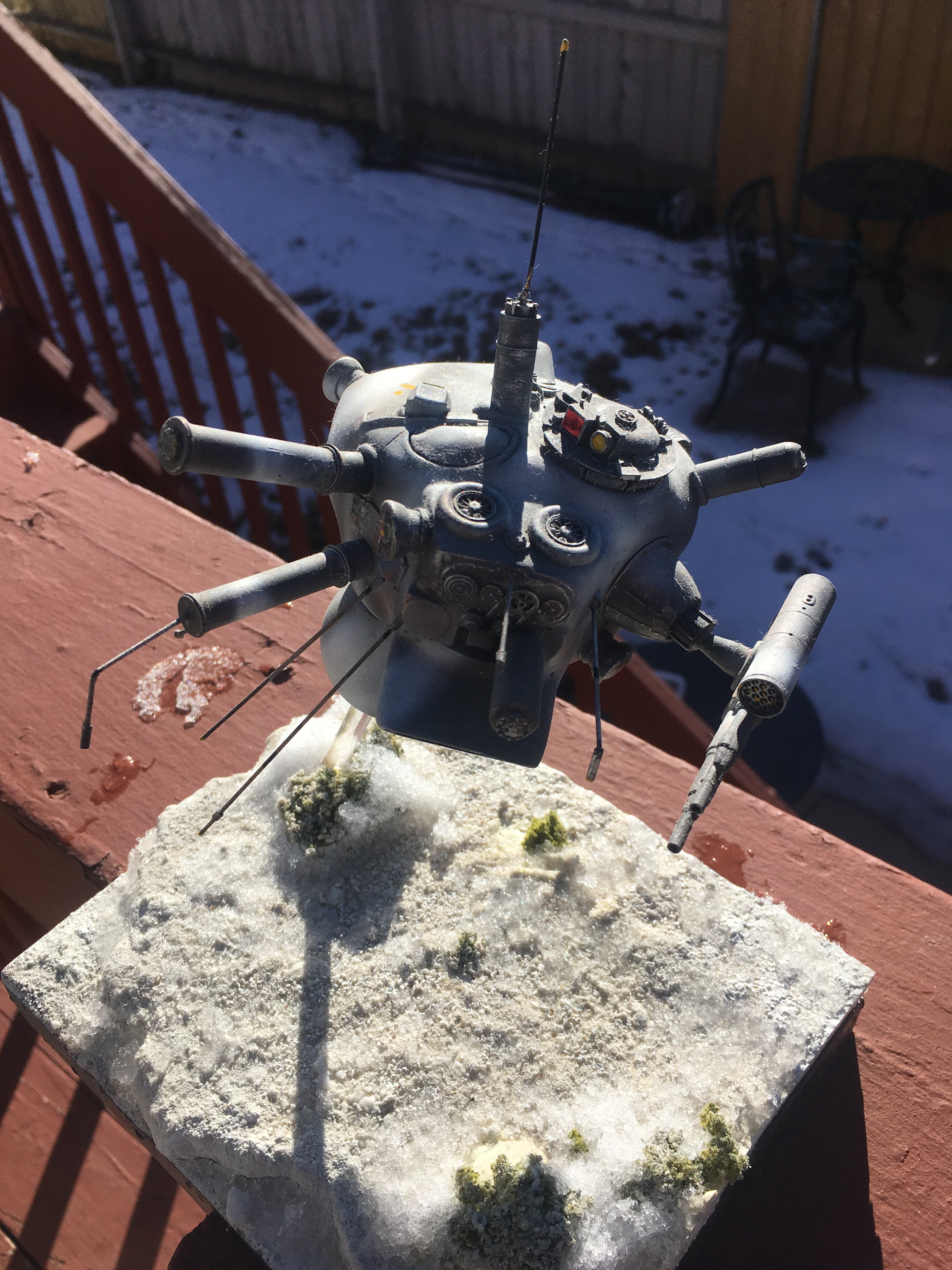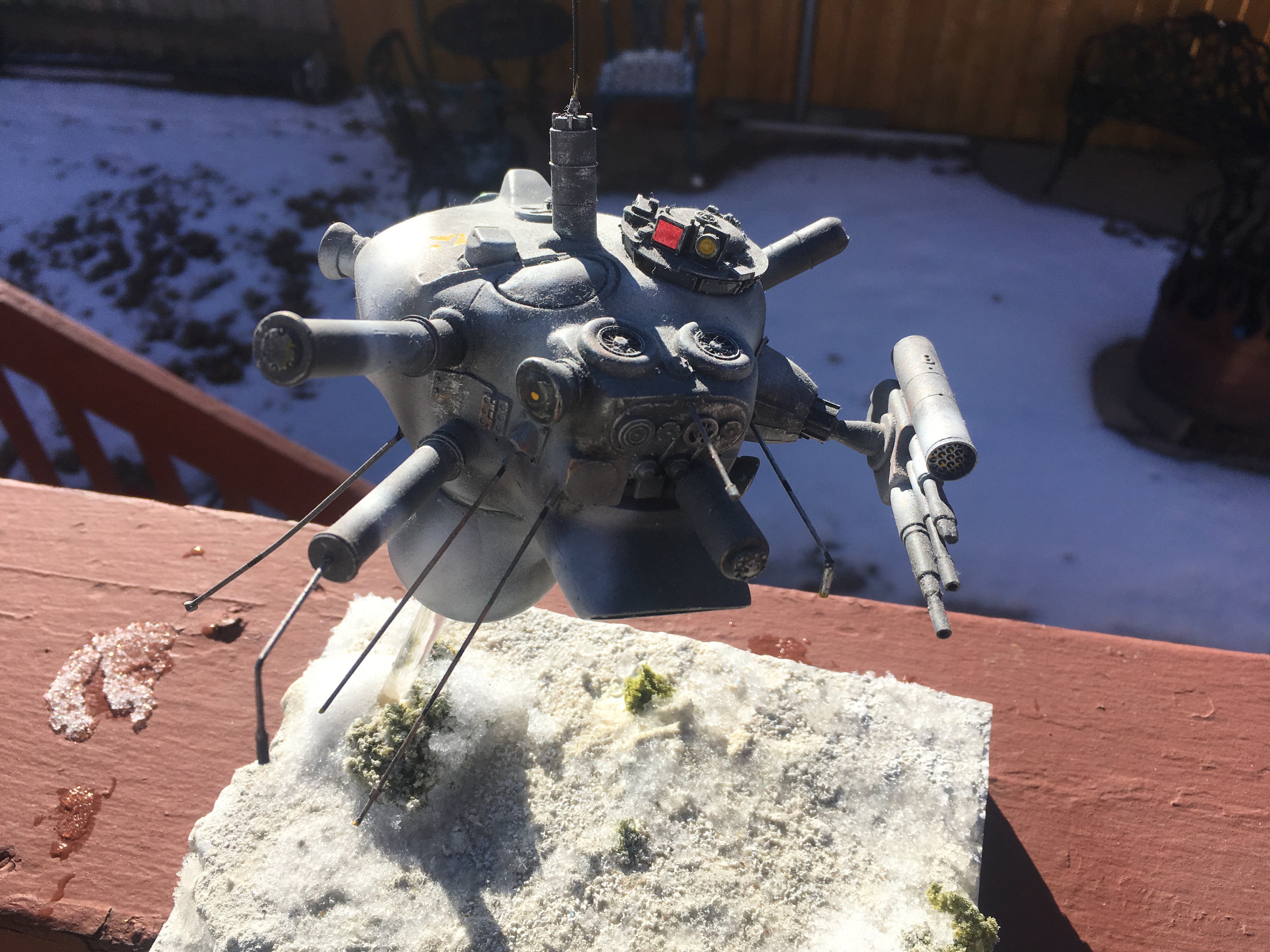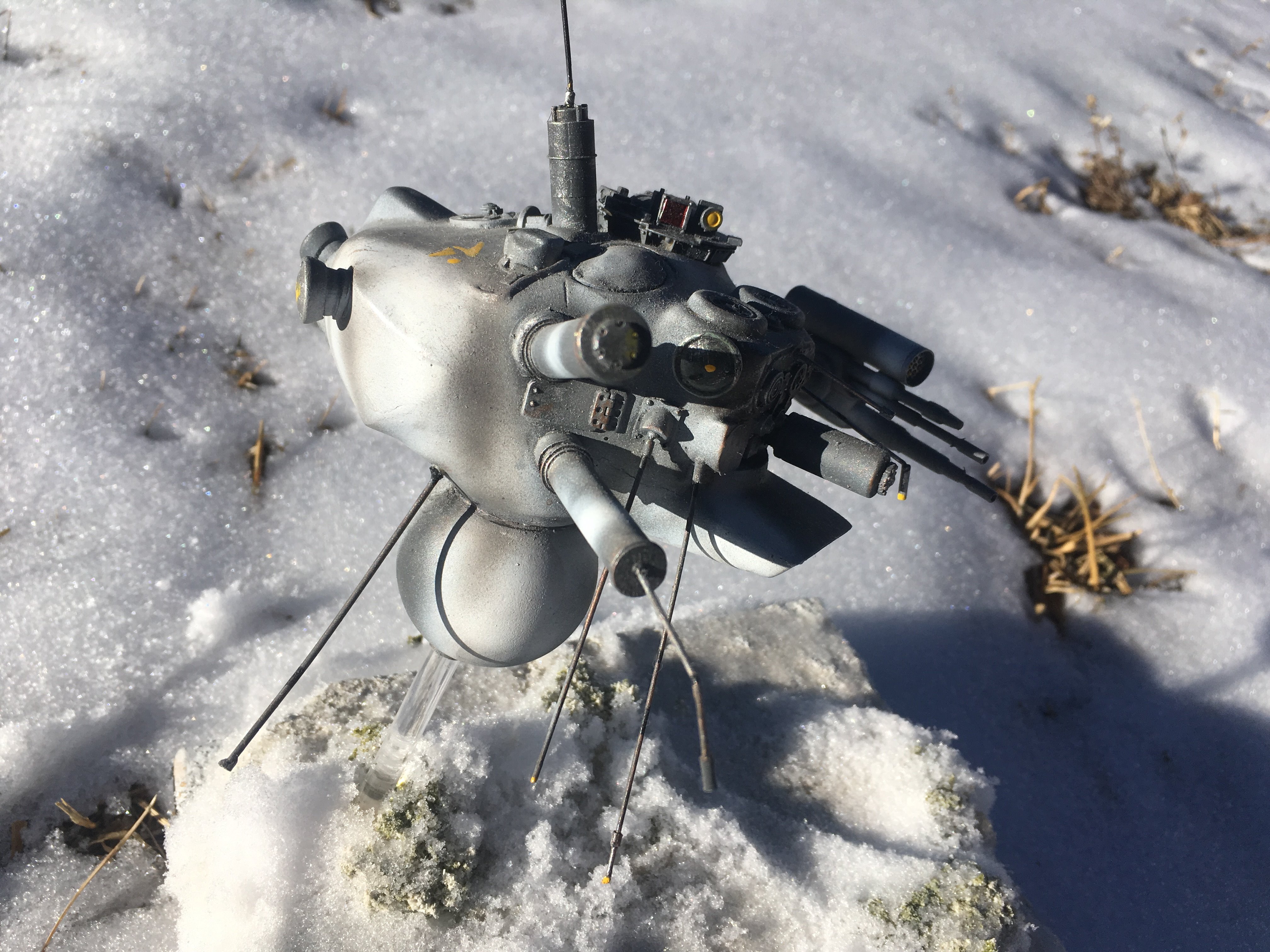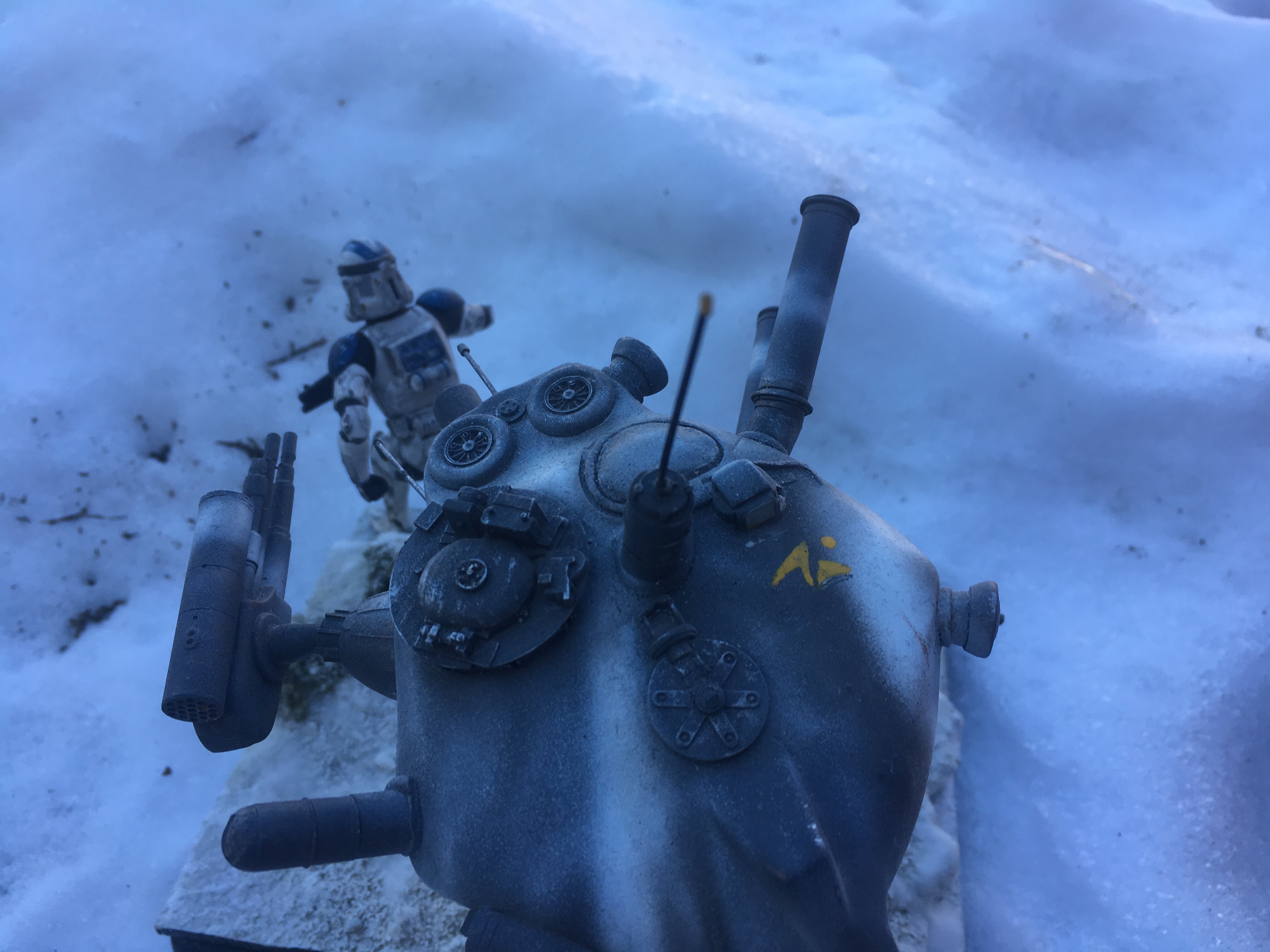 Here is my Porcupine Battle Probe Droid I just built from a resin kit. I had it for years sitting on the self. I added some guns and probes, and also I added a Hallmark Ornament Weathered Imperial Clone Trooper running from the droid. It’s kind of cool! I hope you like it!
