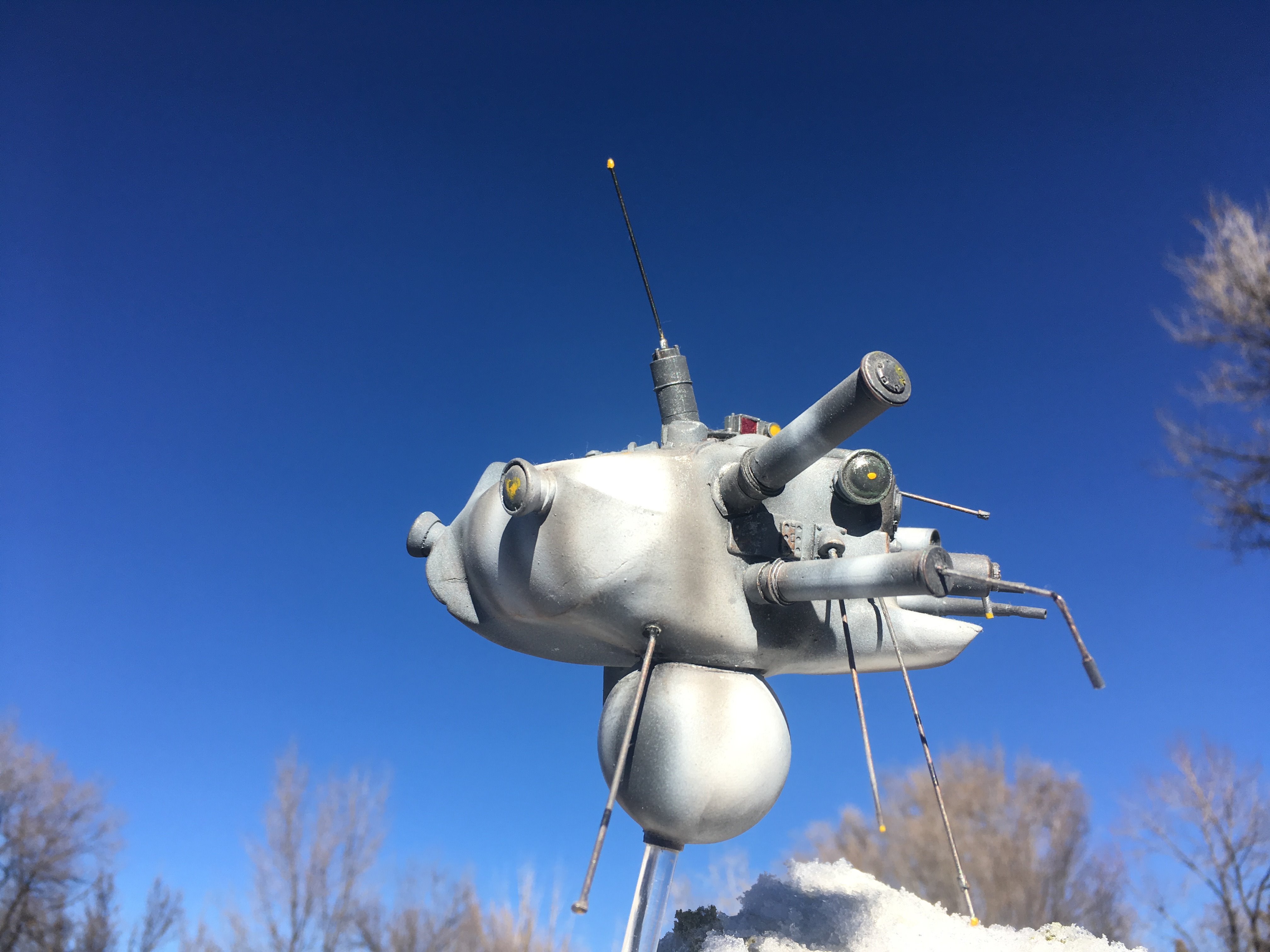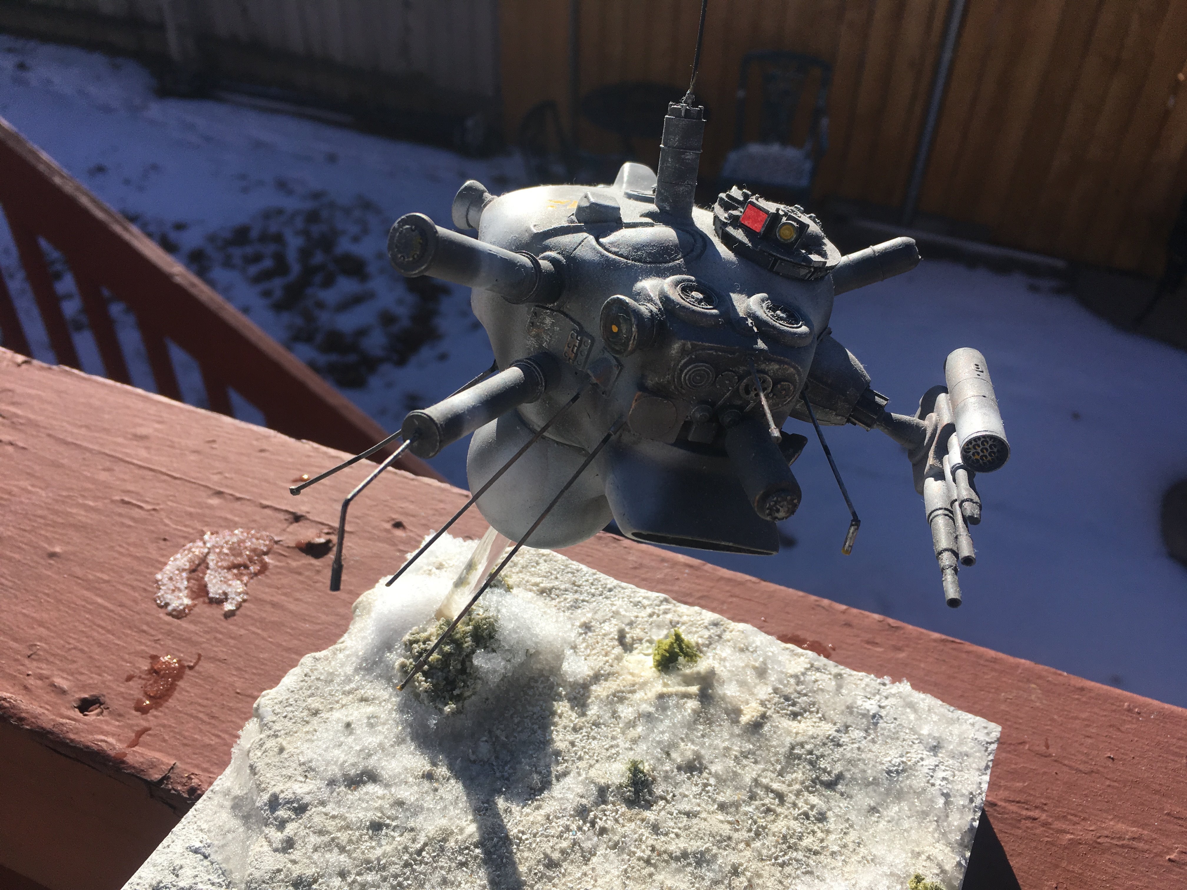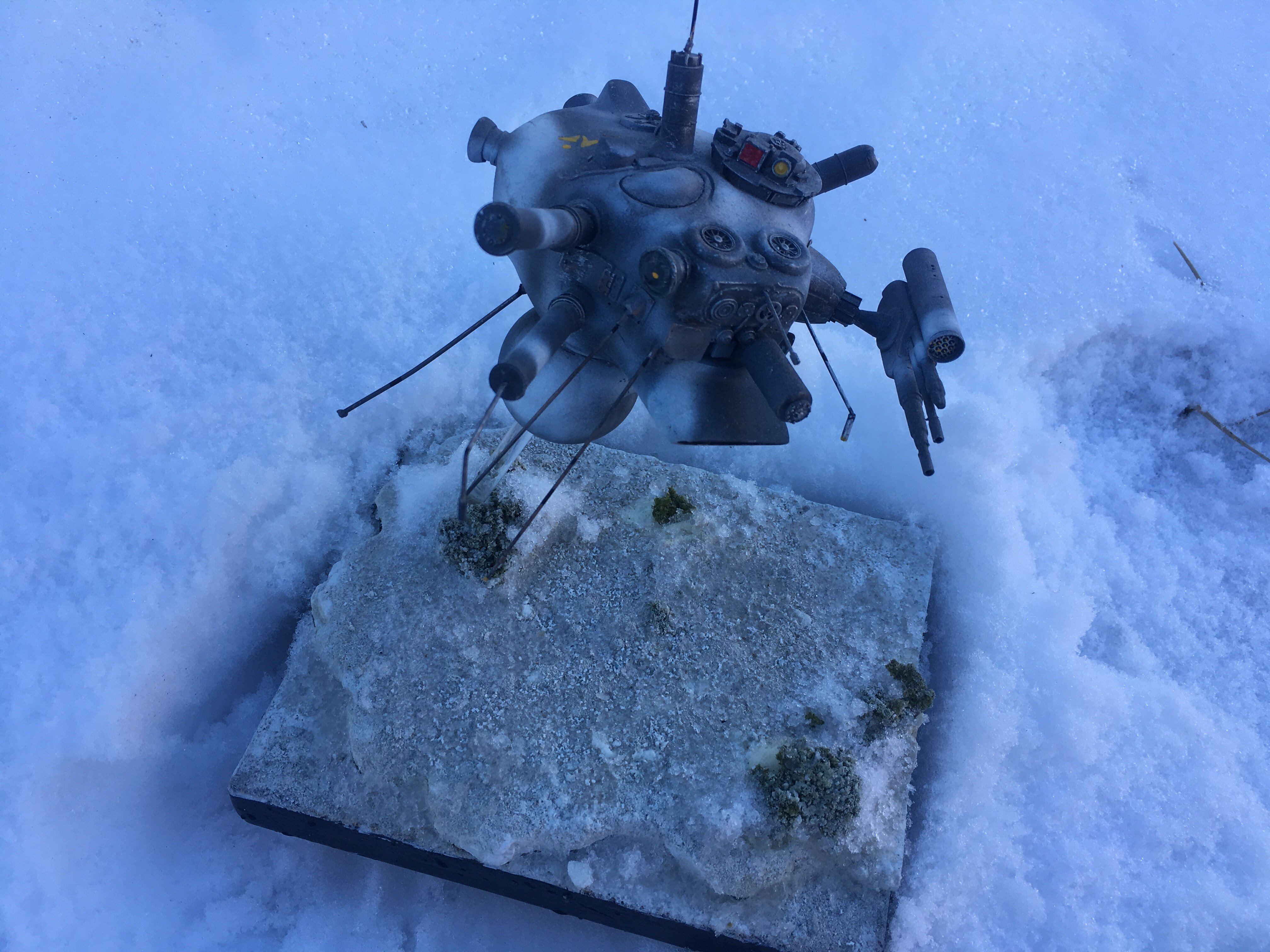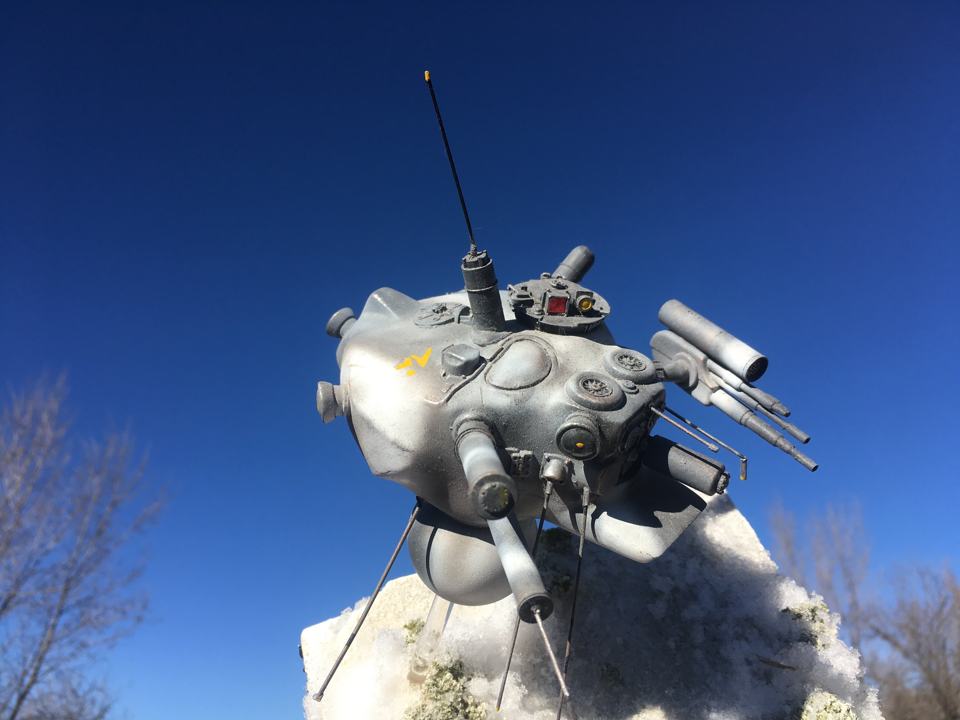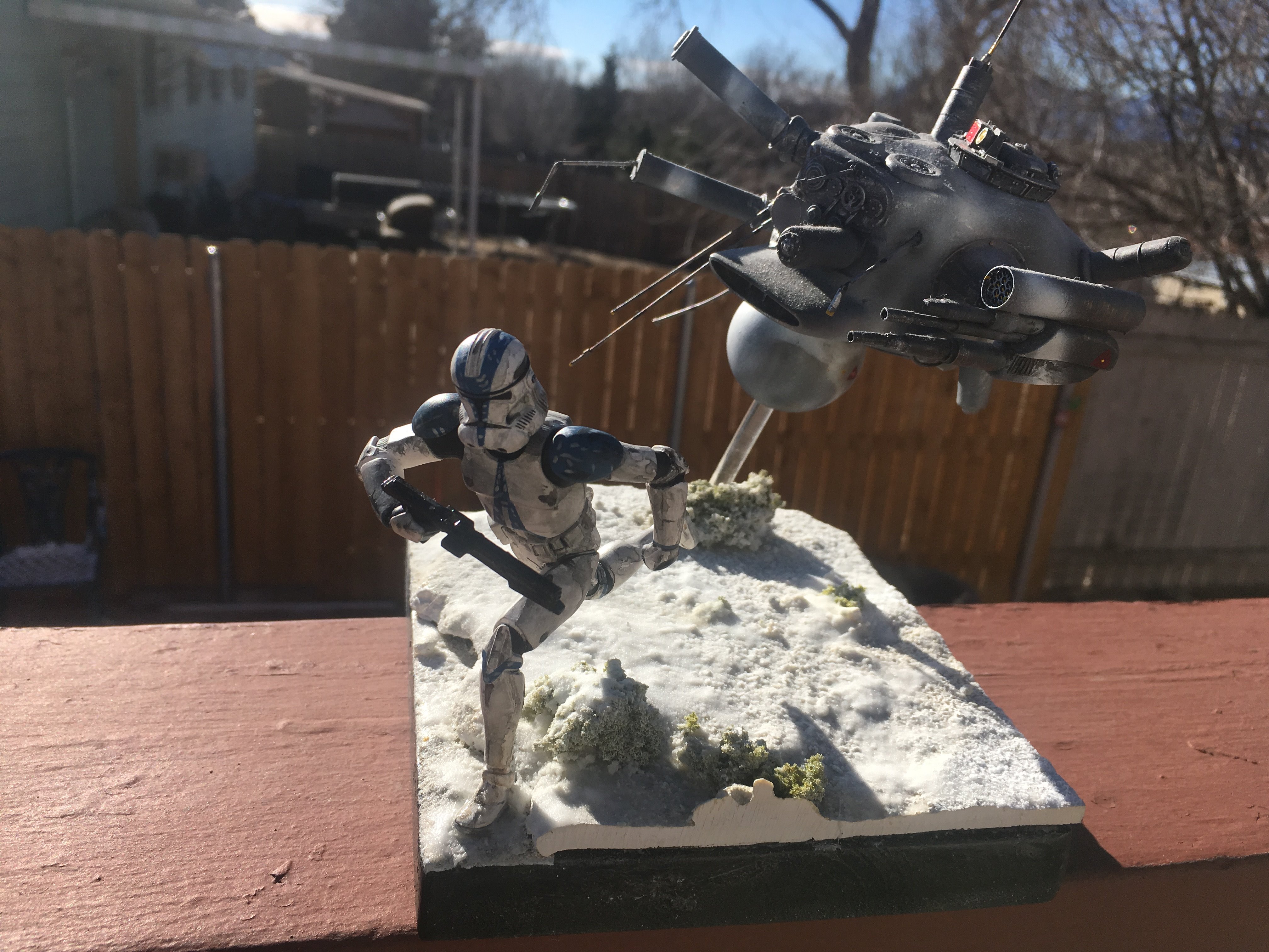 Here is my Porcupine Battle Probe Droid I just built from a resin kit. I had it for years sitting on the self. I added some guns and probes, and also I added a Hallmark Ornament Weathered Imperial Clone Trooper running from the droid. It’s kind of cool! I hope you like it!