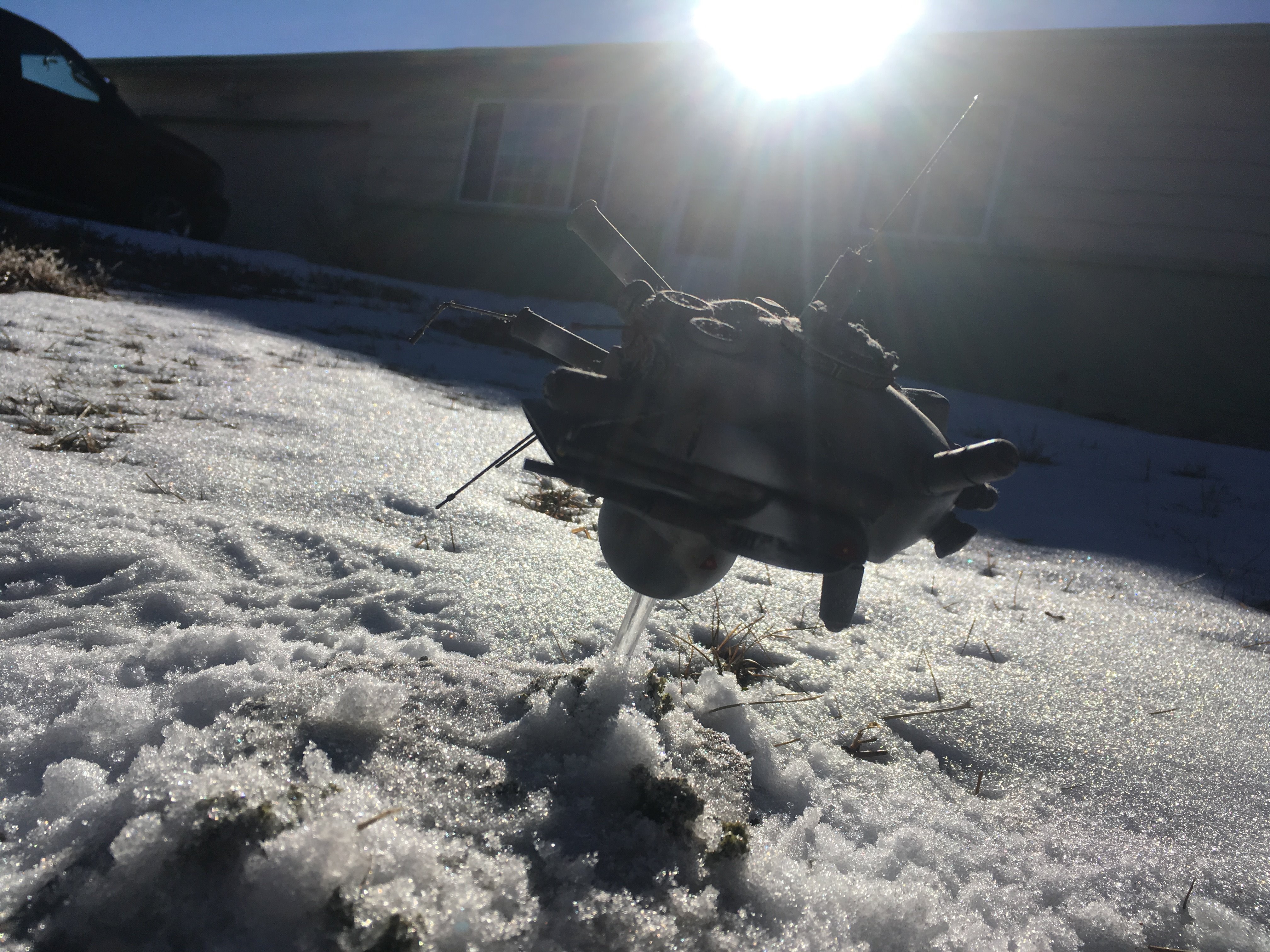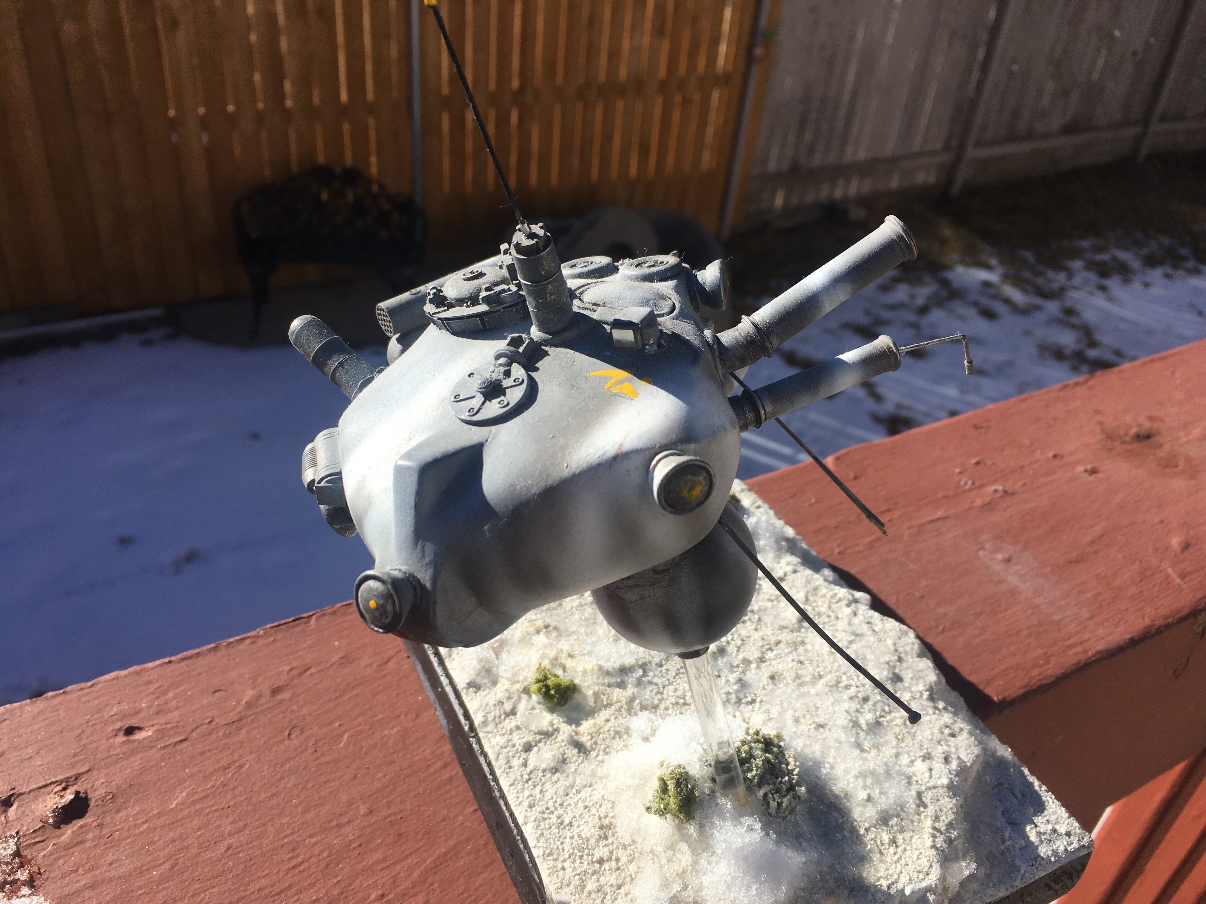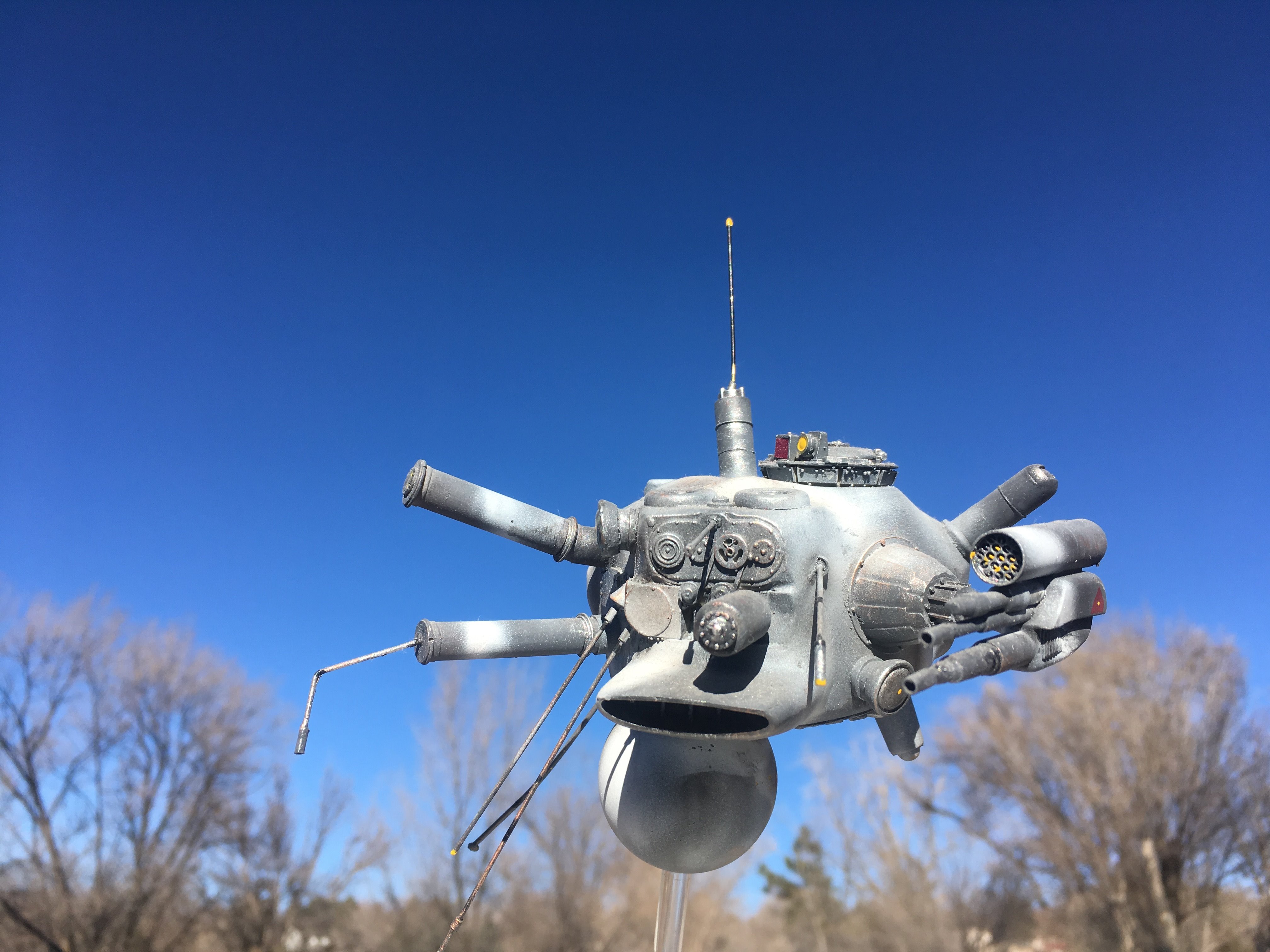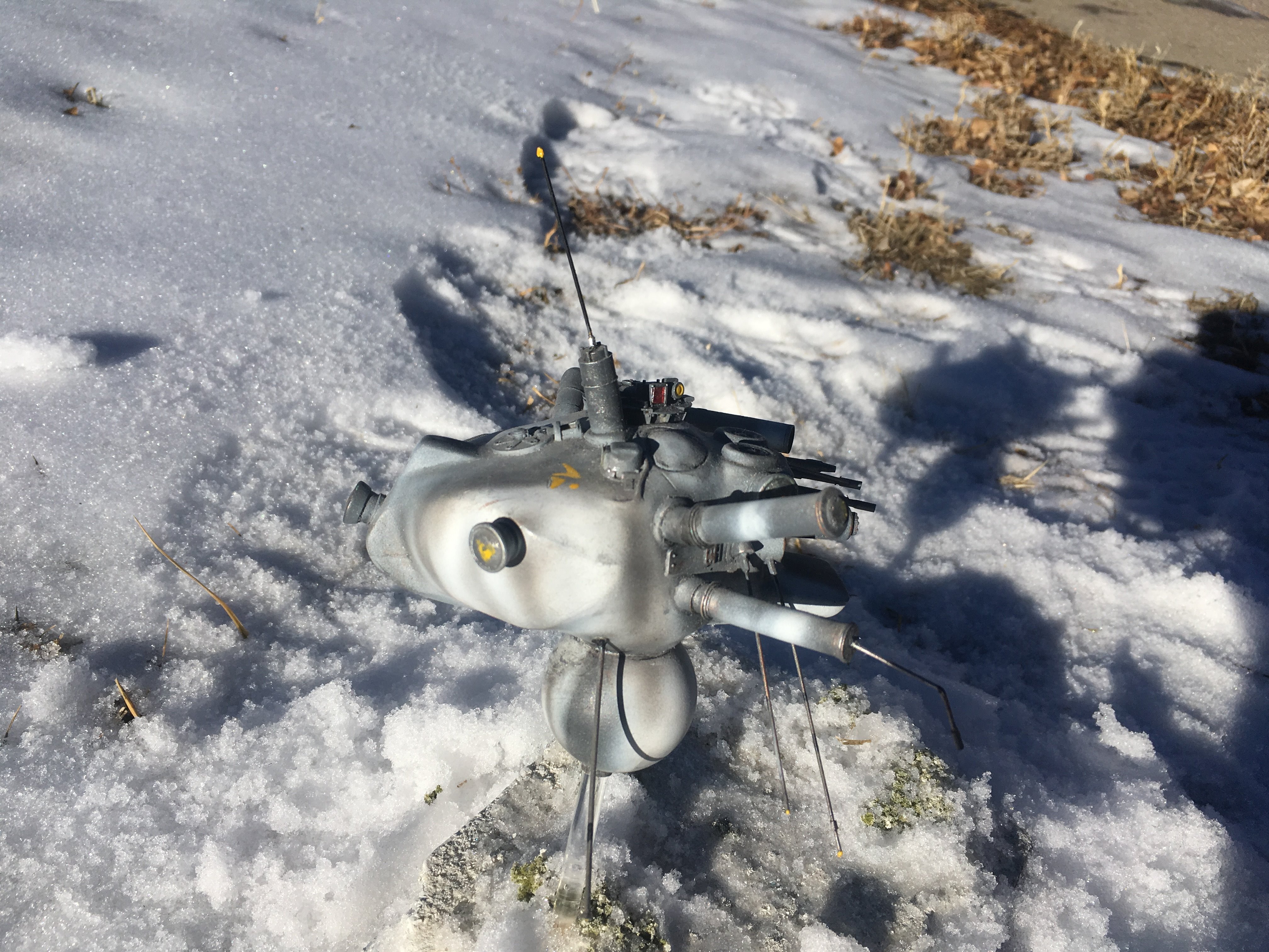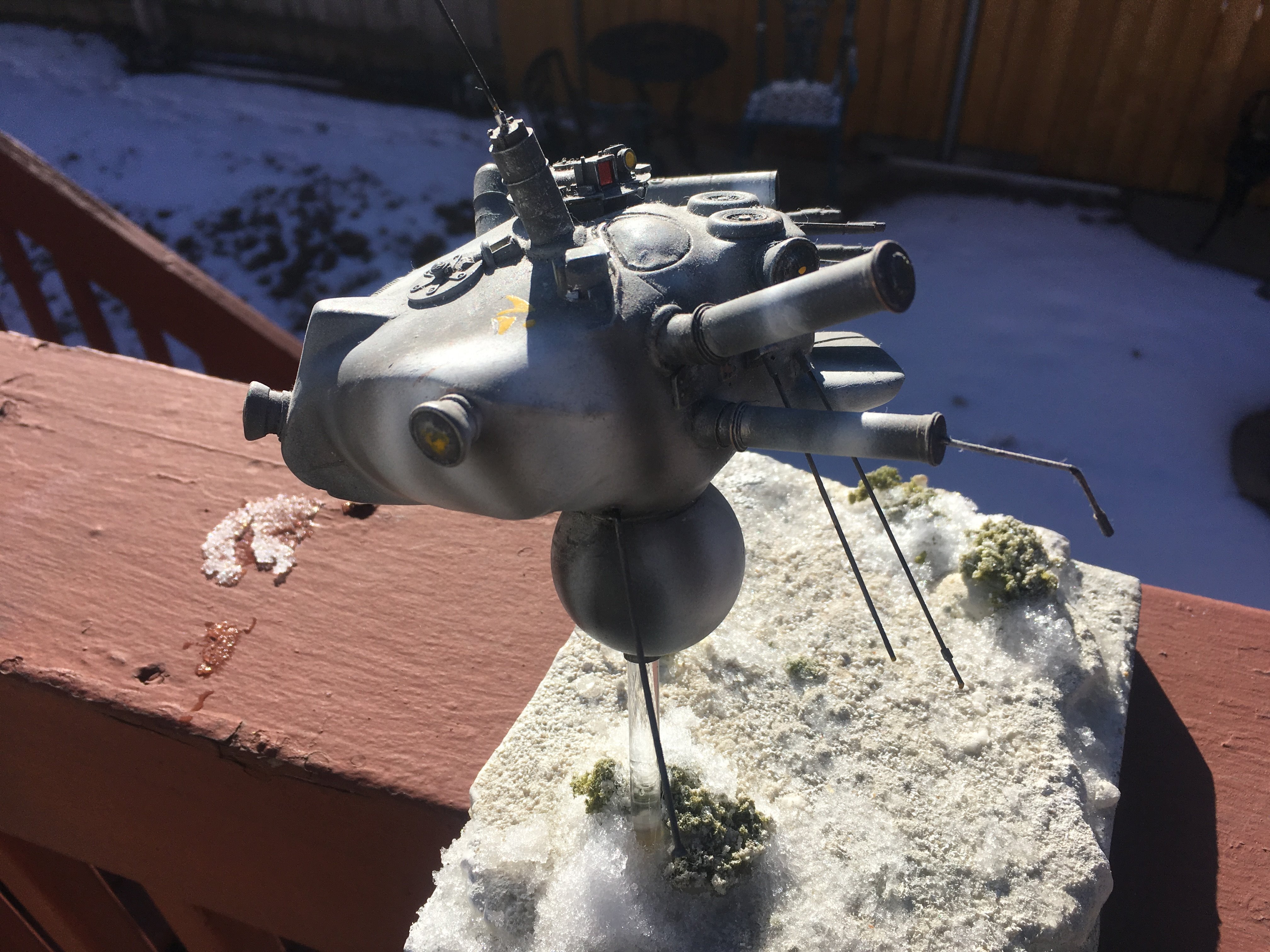 Here is my Porcupine Battle Probe Droid I just built from a resin kit. I had it for years sitting on the self. I added some guns and probes, and also I added a Hallmark Ornament Weathered Imperial Clone Trooper running from the droid. It’s kind of cool! I hope you like it!